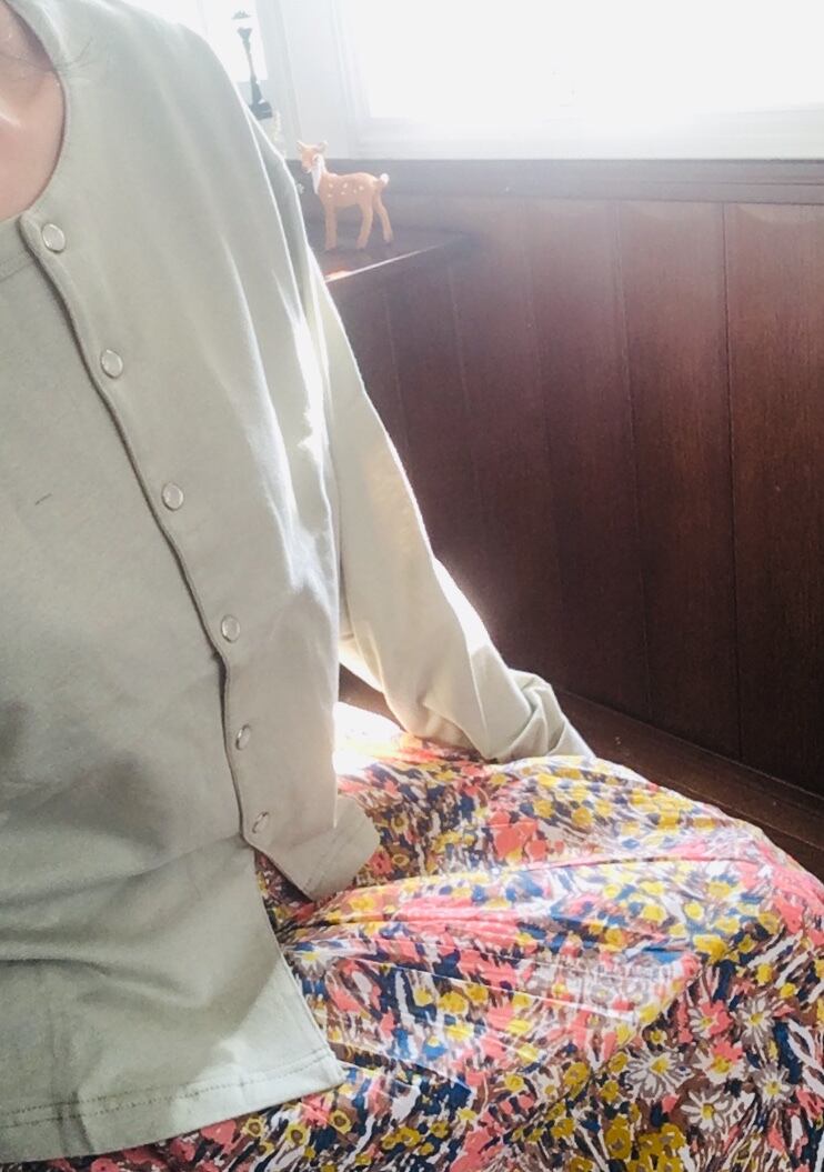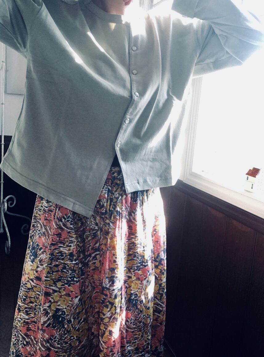アシンメトリーな裾が遊び心ある、スナップカーディガン。アシンメトリーがかえって、どんなボトムでも合わせやすくしてくれます。