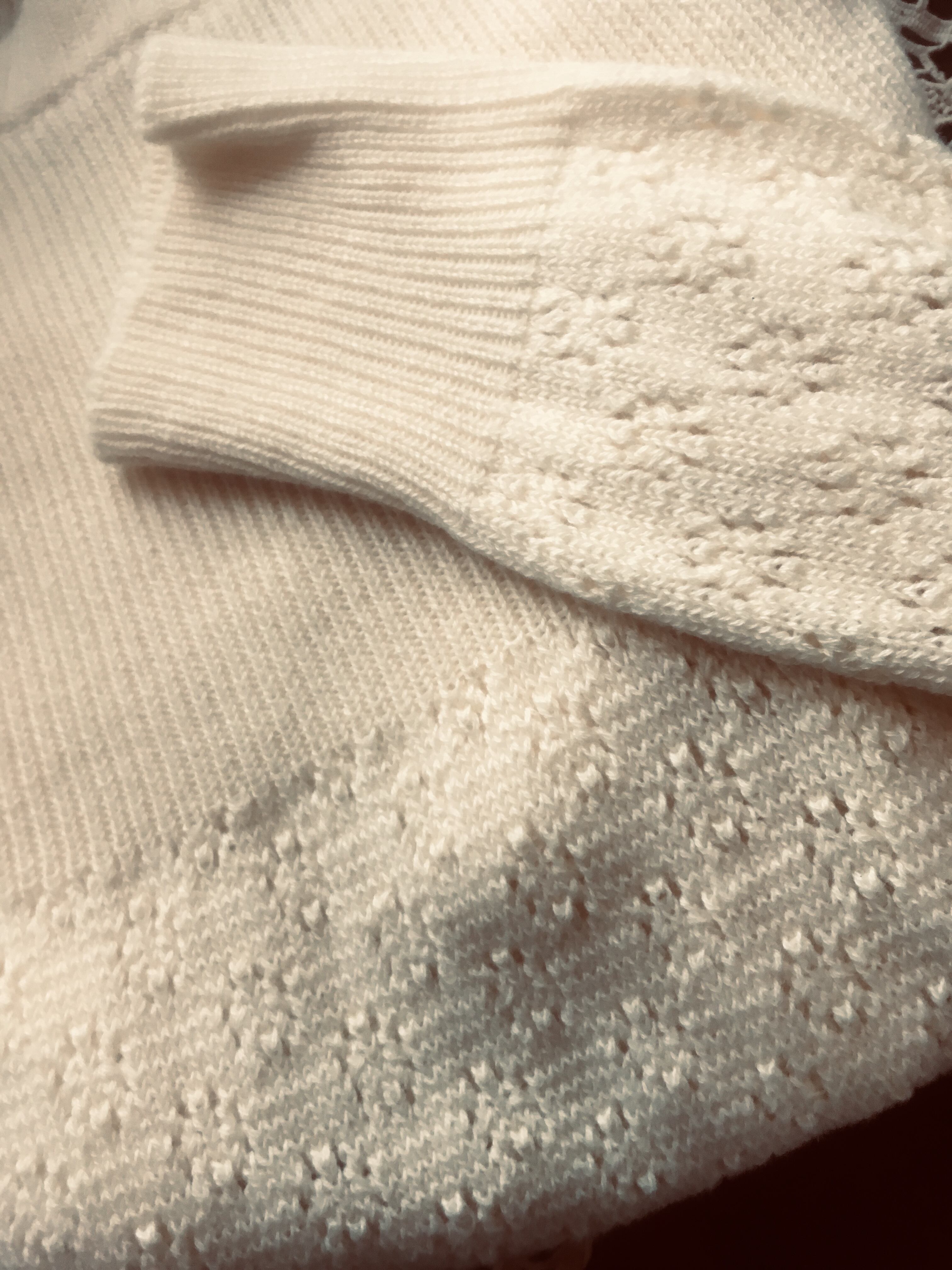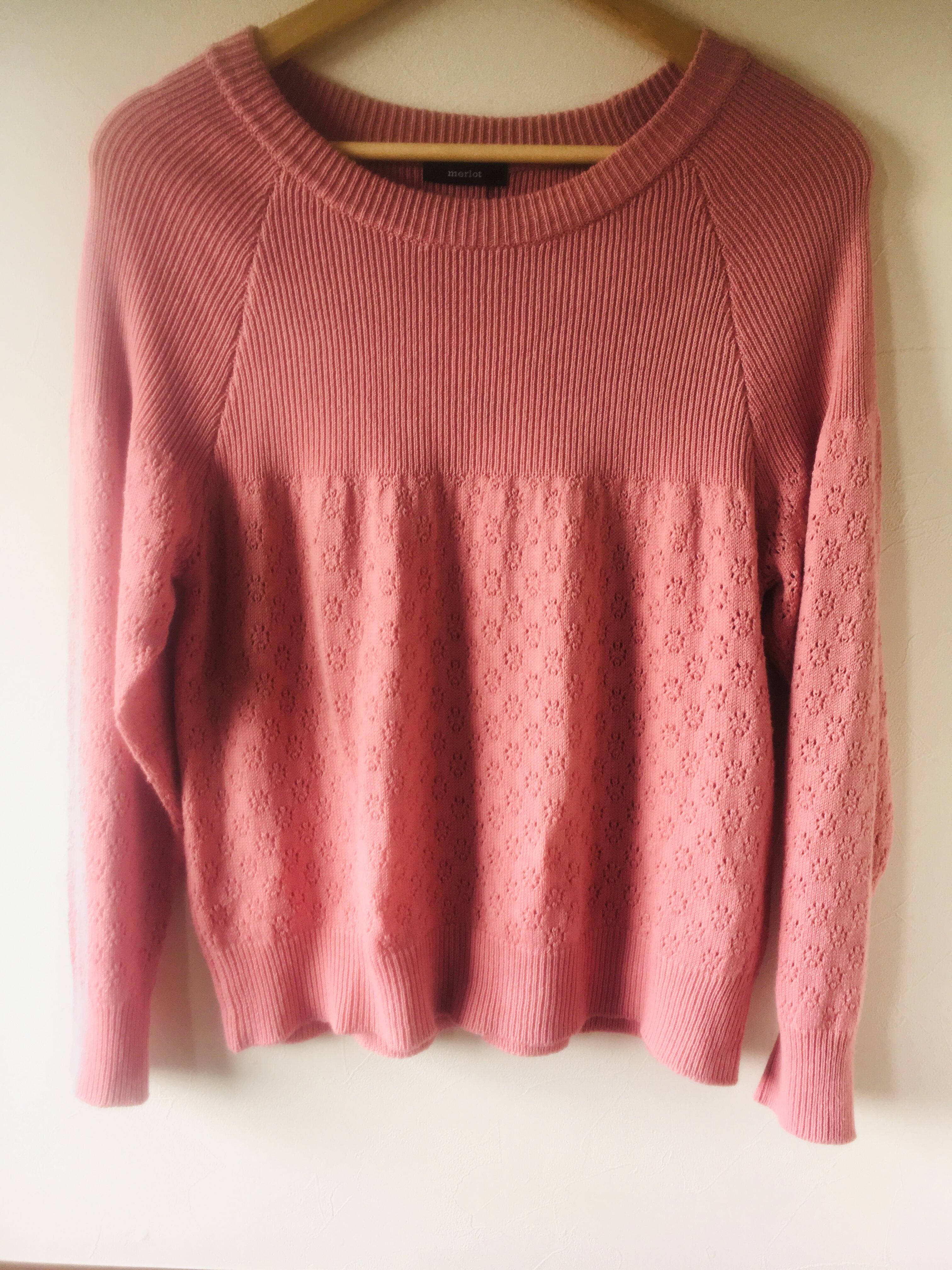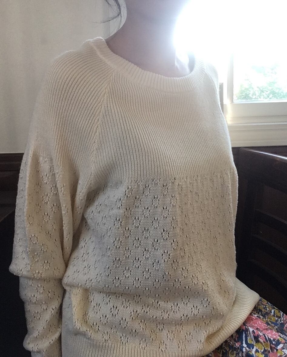 見頃と袖にほどこされた木漏れ日のような、透かし編みが優しげな印象のニットセーター。