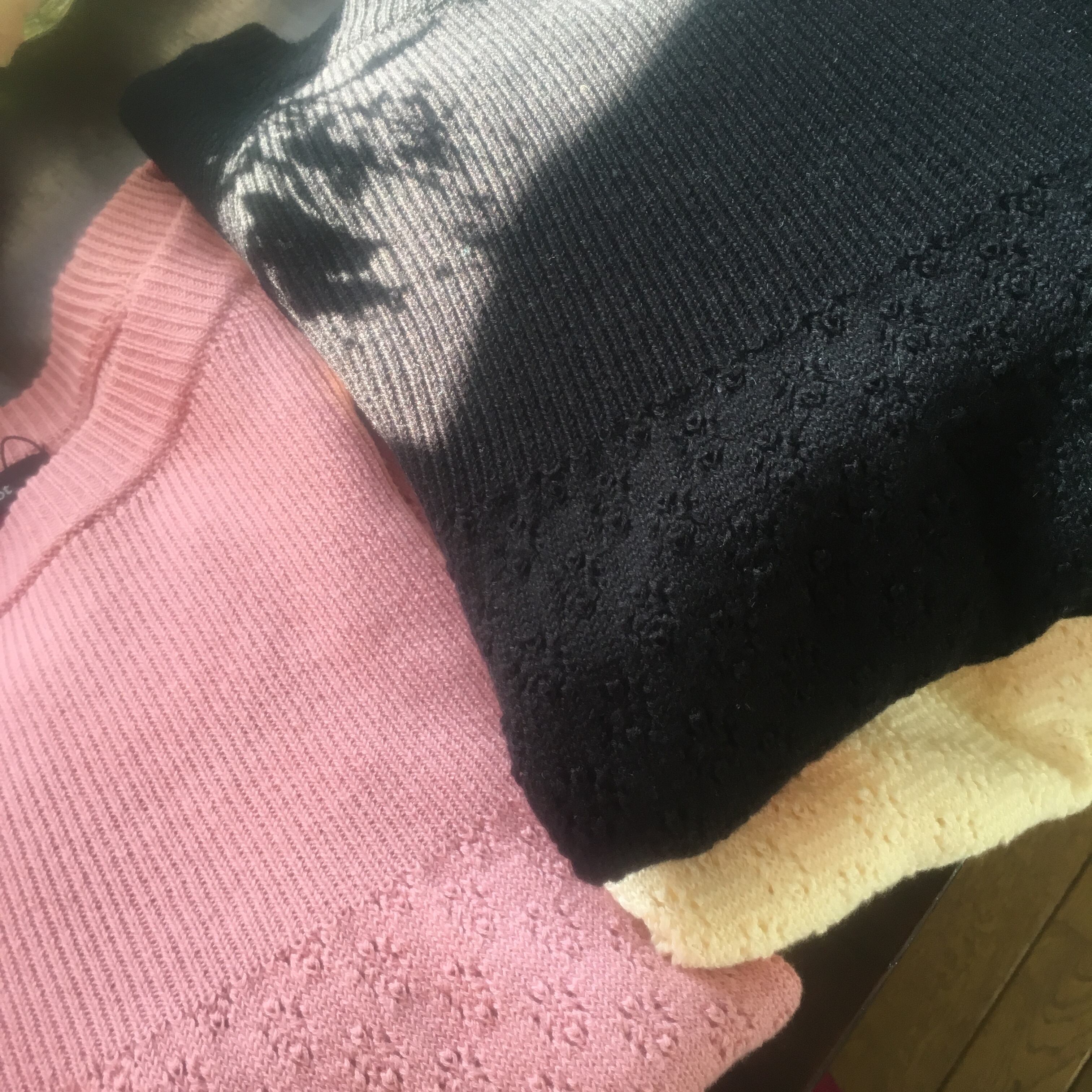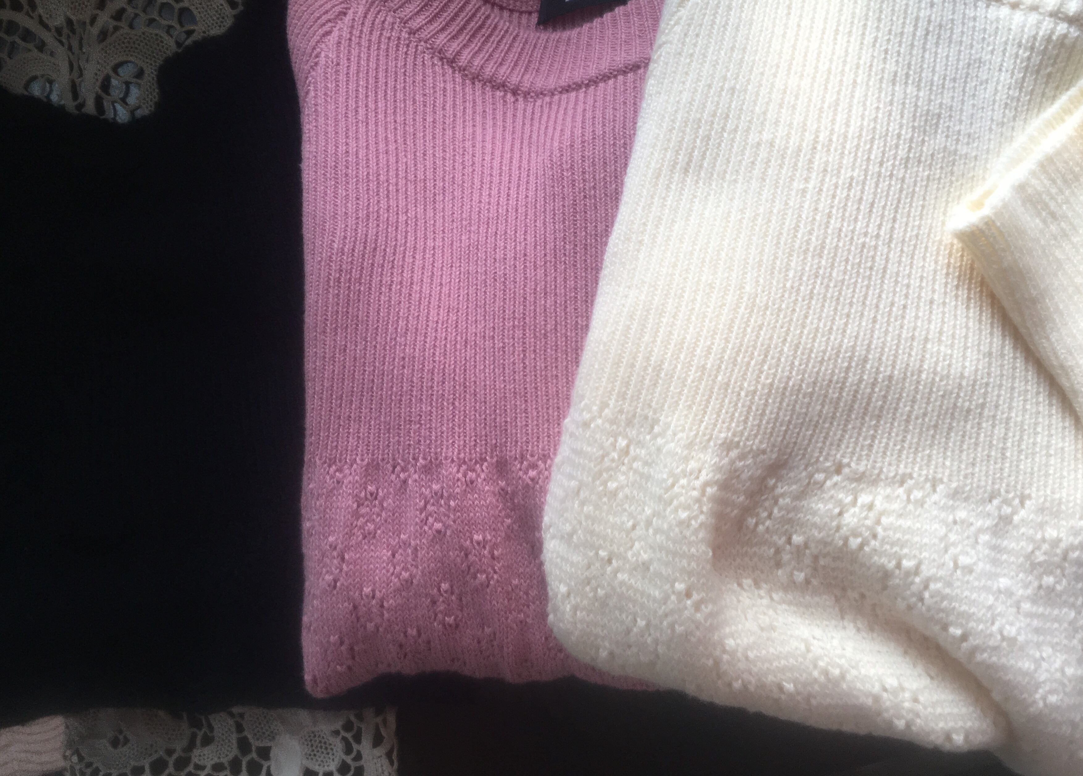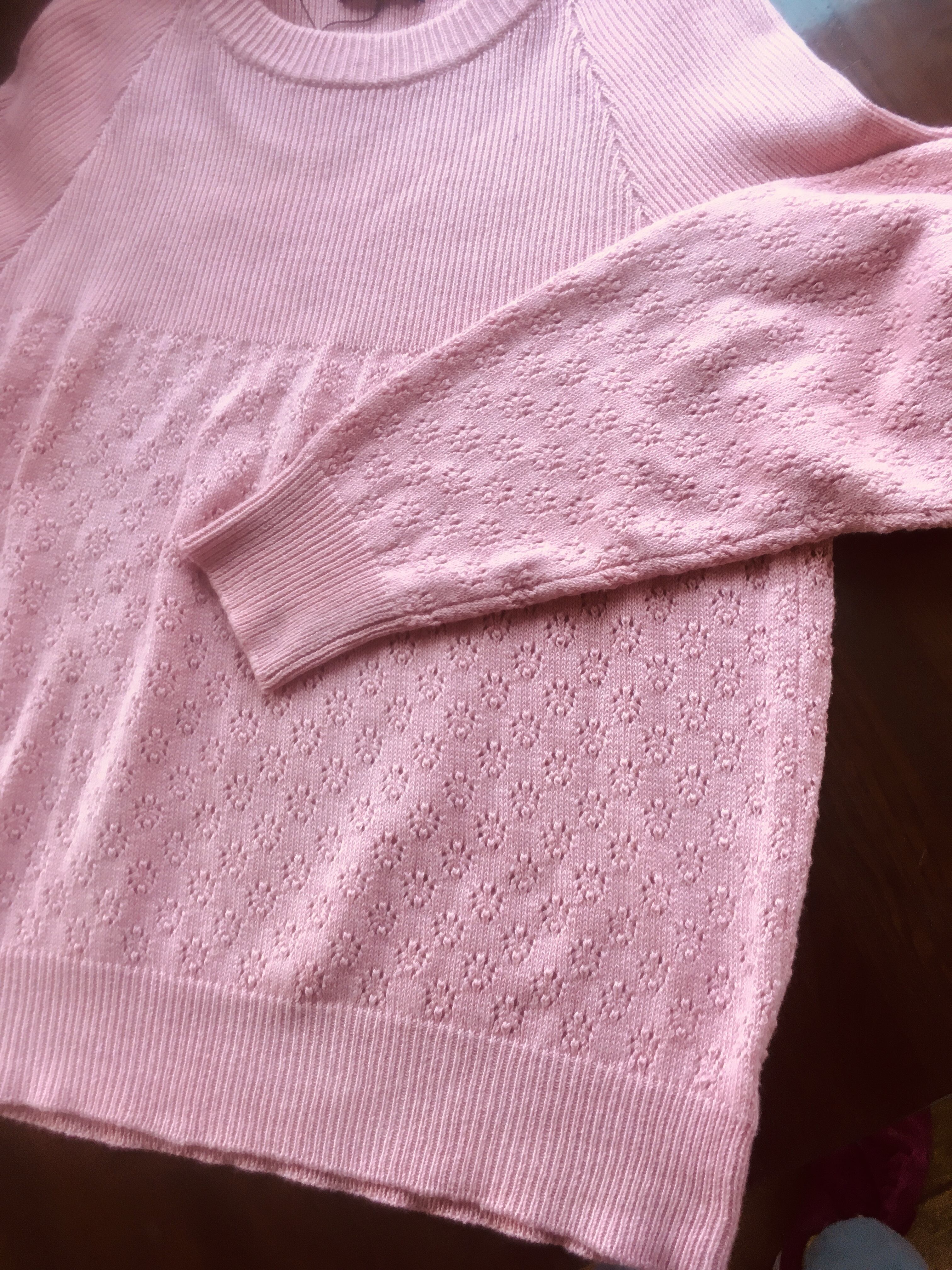 見頃と袖にほどこされた木漏れ日のような、透かし編みが優しげな印象のニットセーター。
