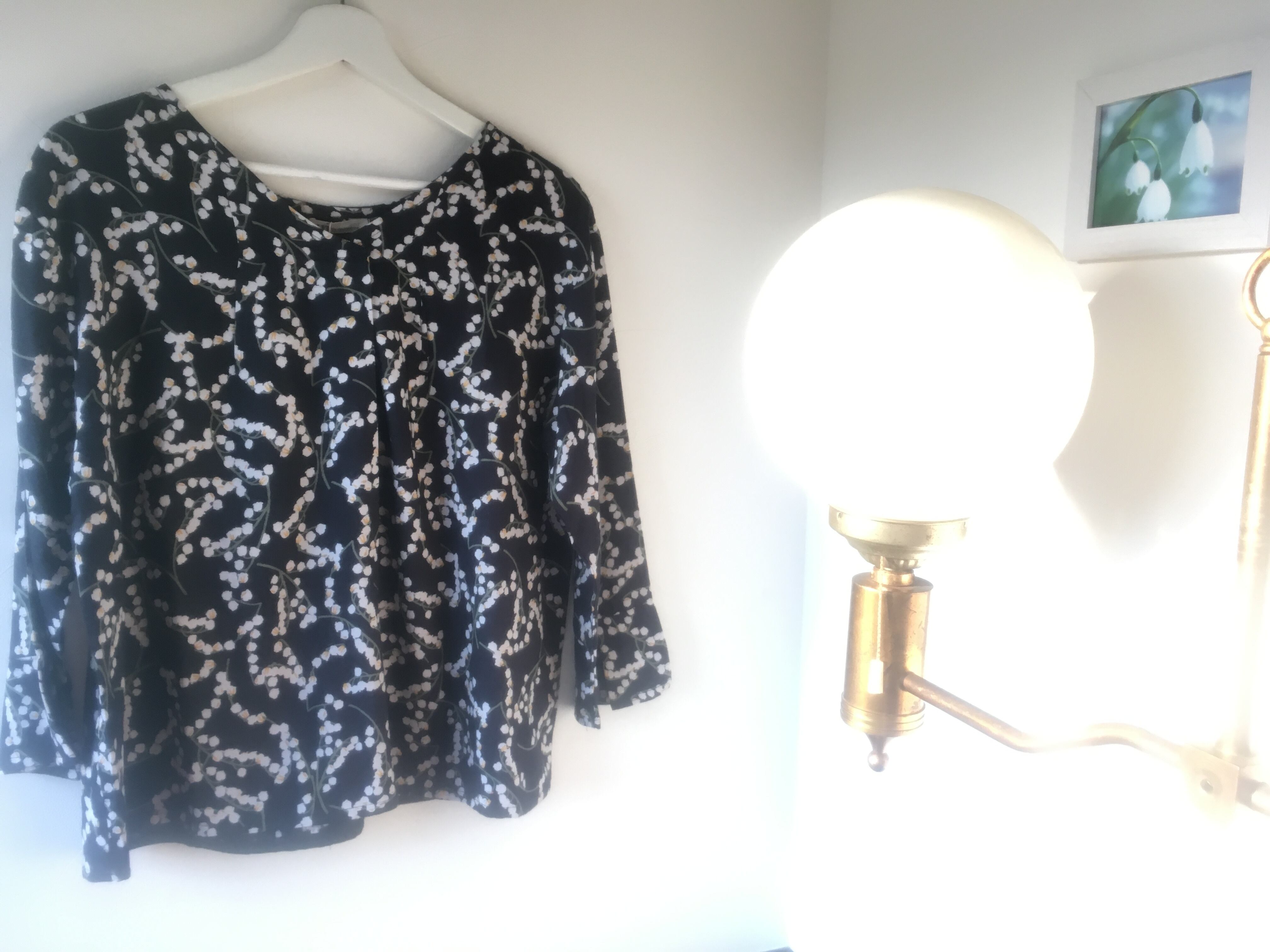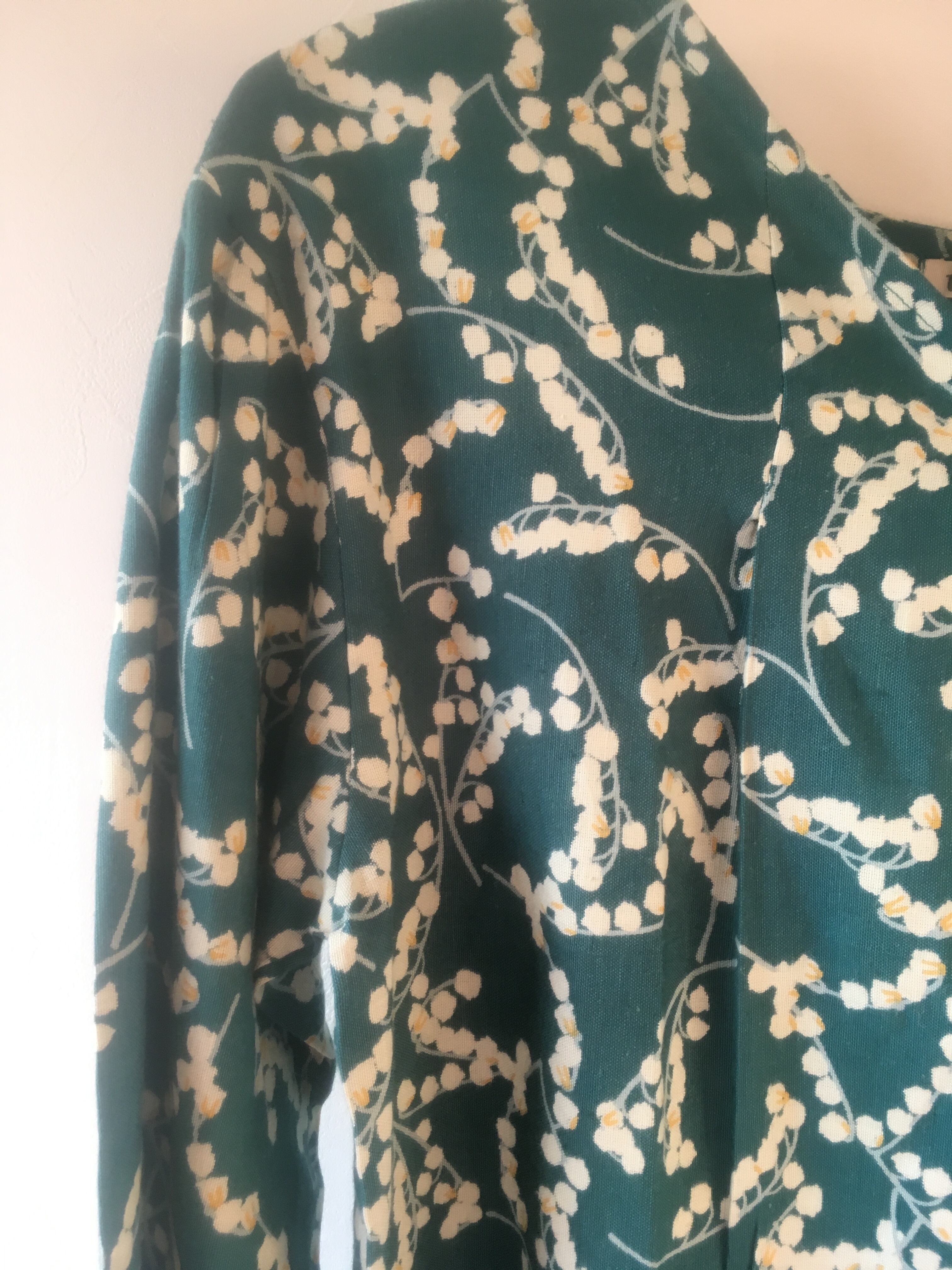 幸運の再来、癒しなどの花言葉を持つすずらんが一面に描かれたプルオーバー。