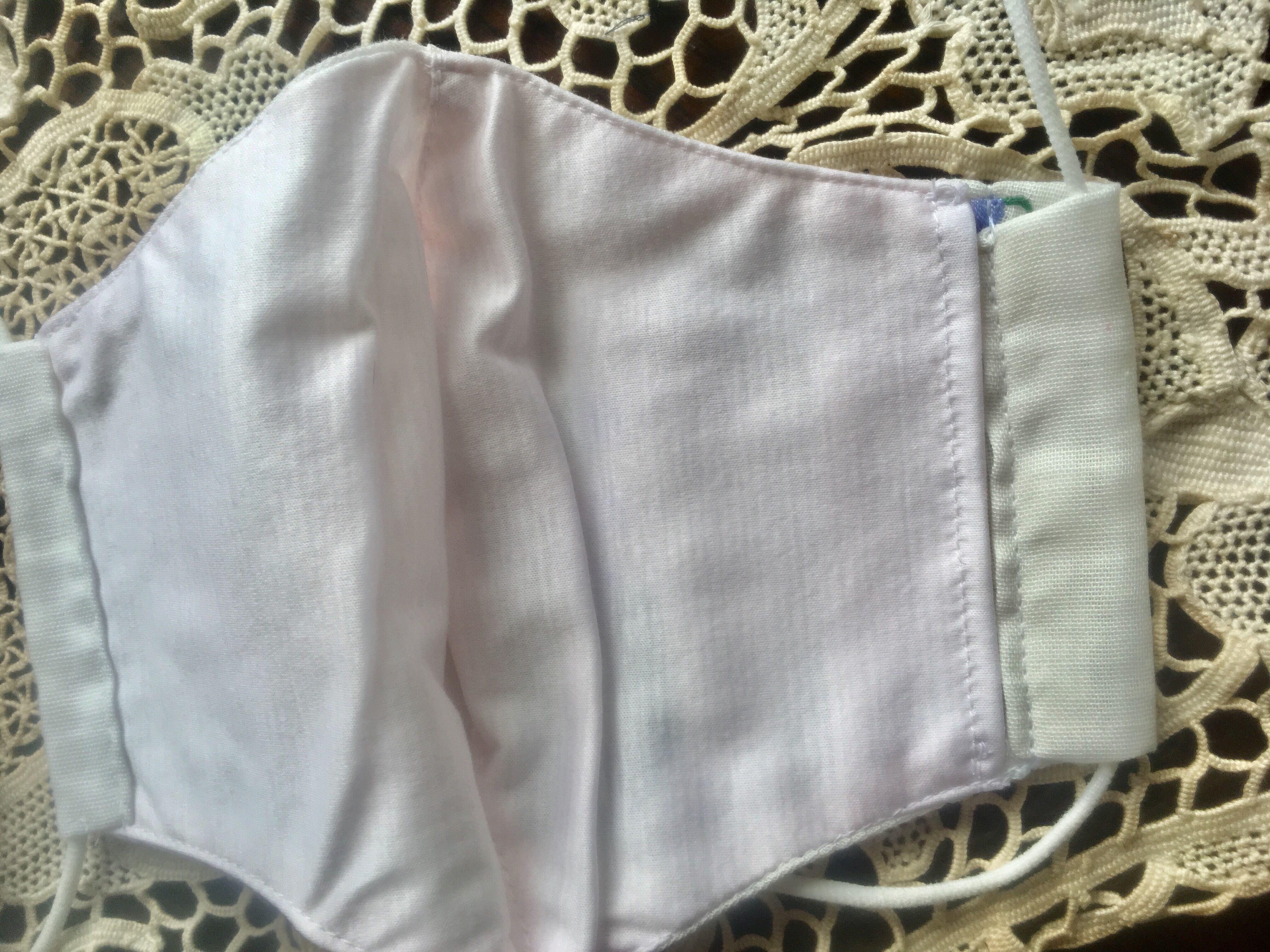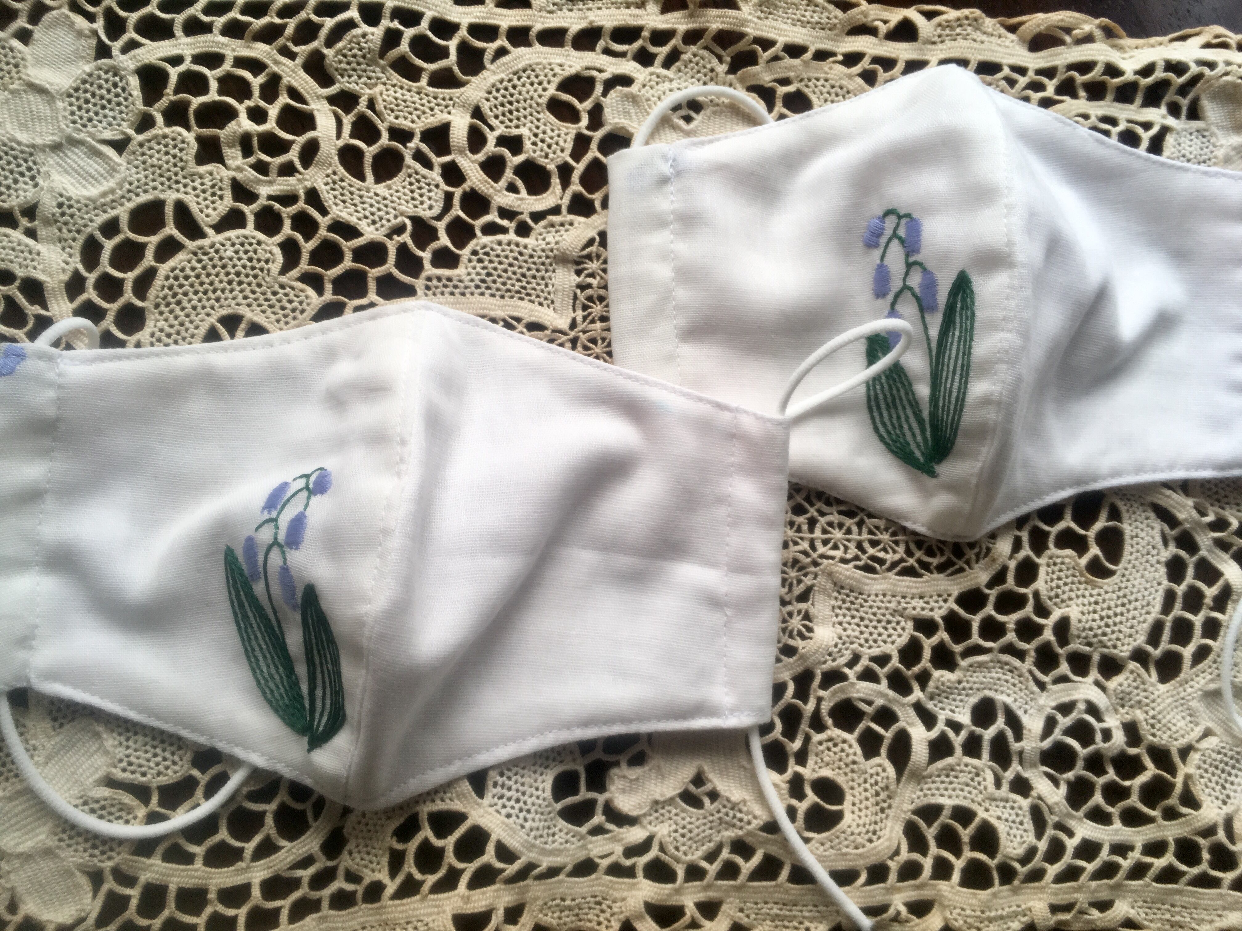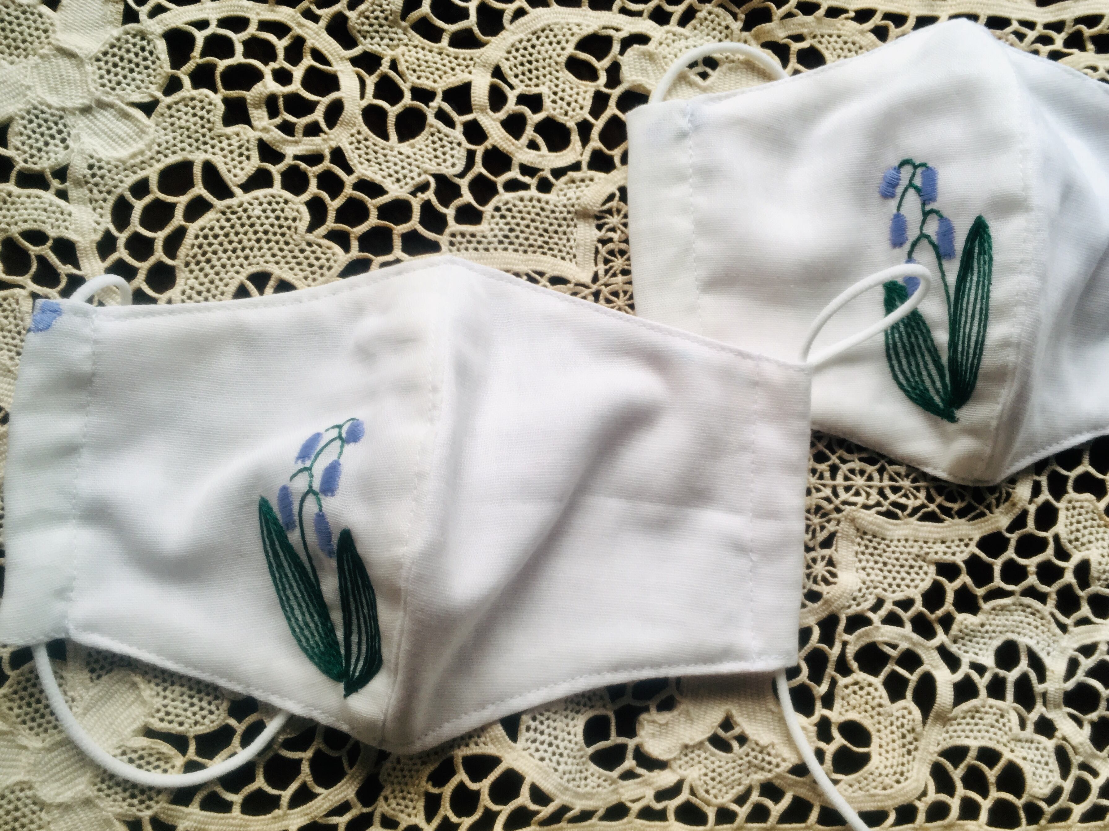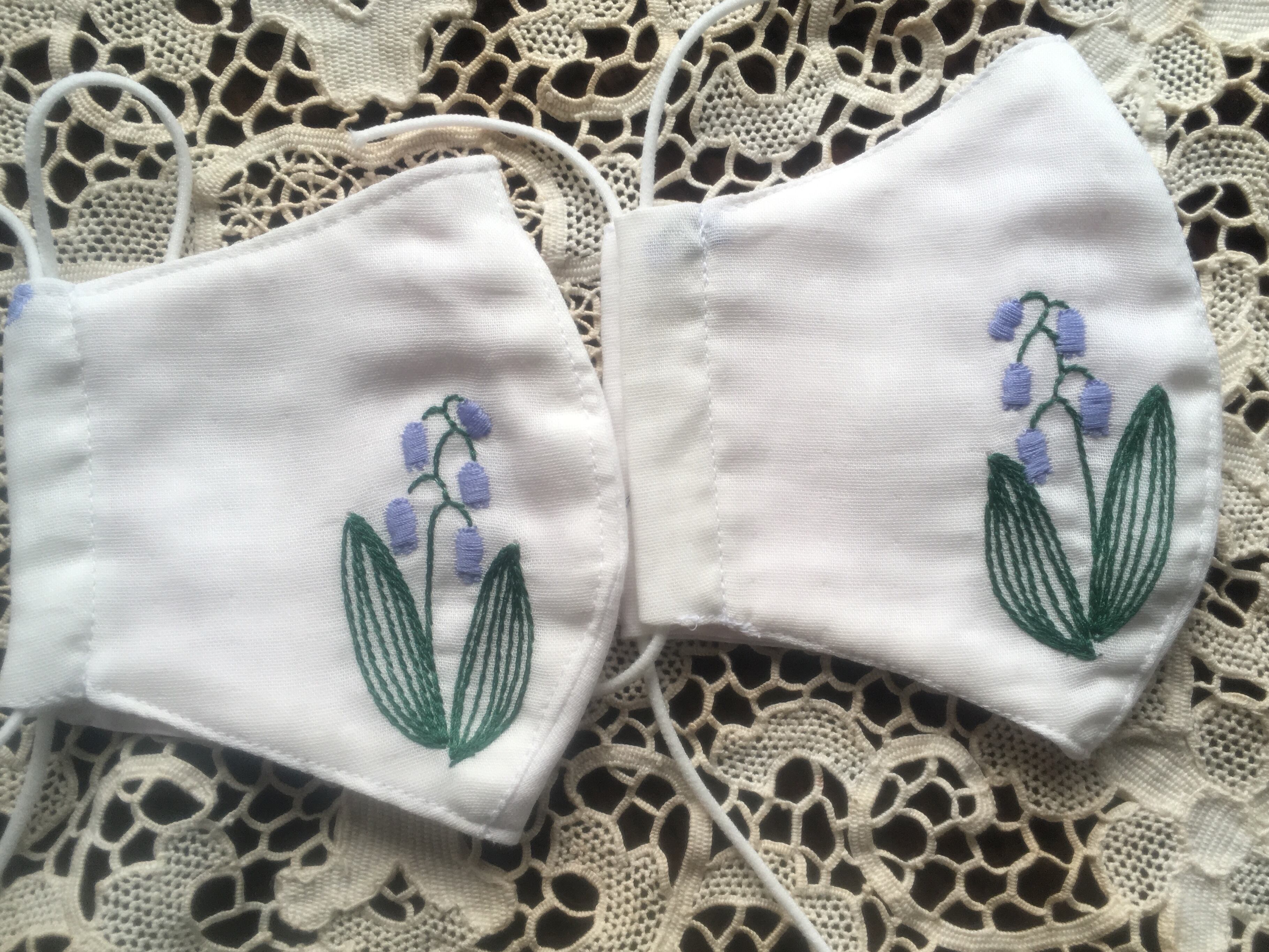 白地にすずらんの刺繍が、清楚で上品なハンドメイドのマスク。ガーゼ生地で肌ざわりも優しく呼吸もしやすいです。