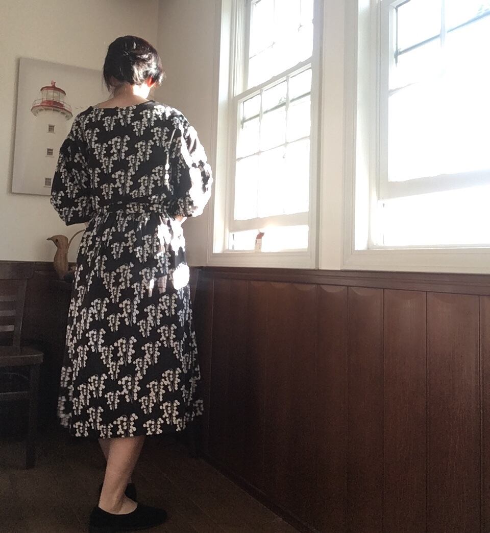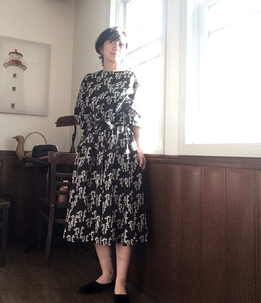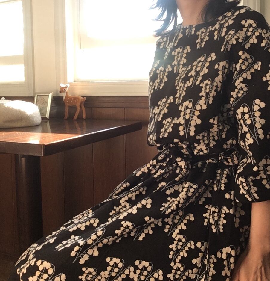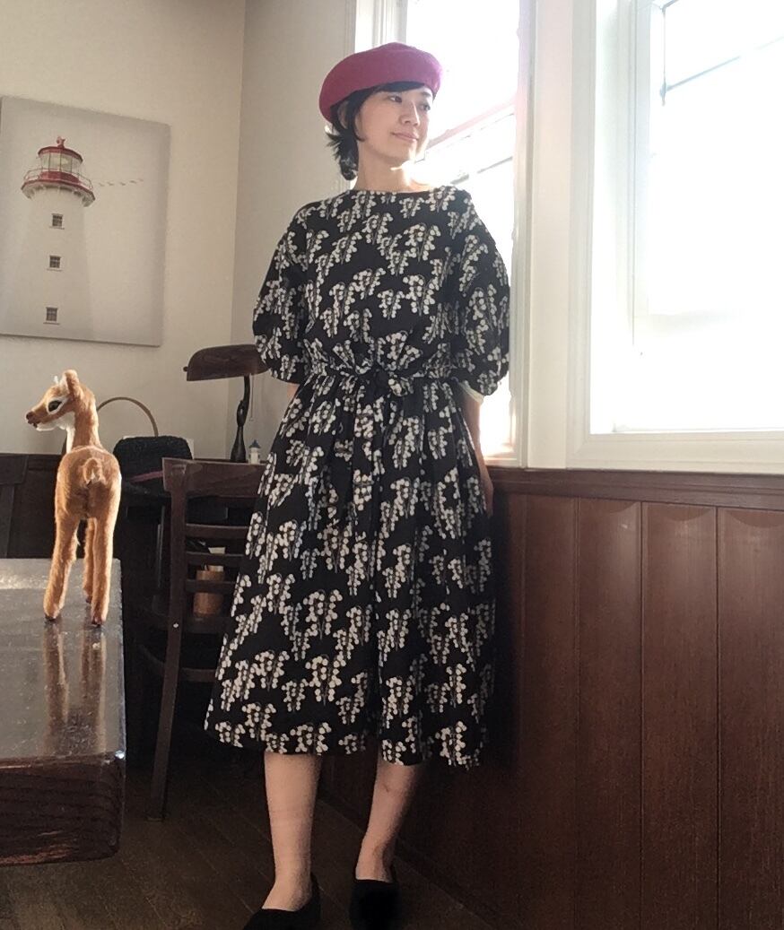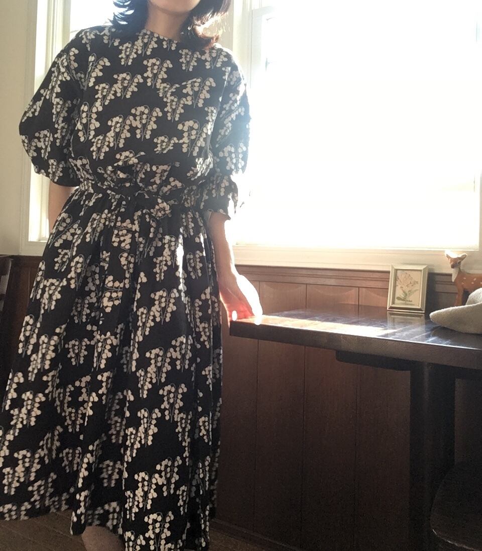 黒地に一面に広がるすずらんがプリントされたワンピース。シックな色合いとシンプルな形で大人っぽく上品な装い。