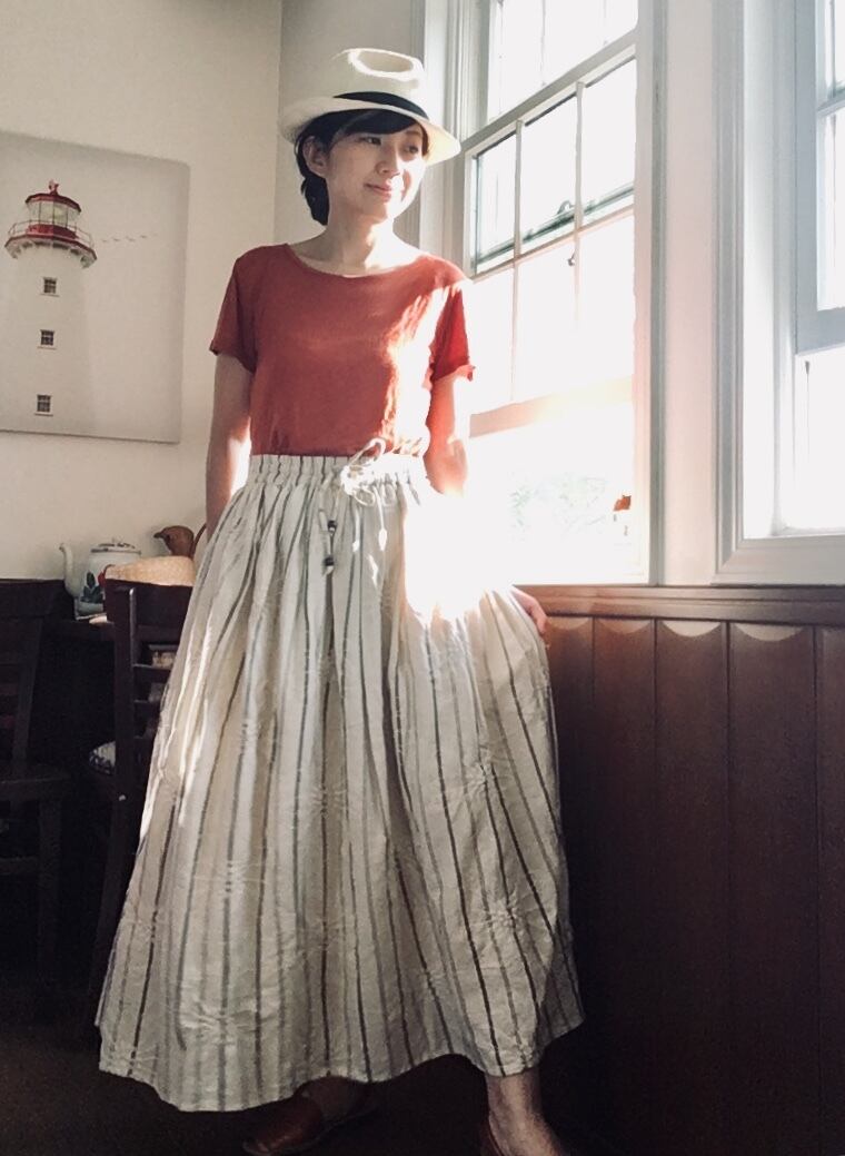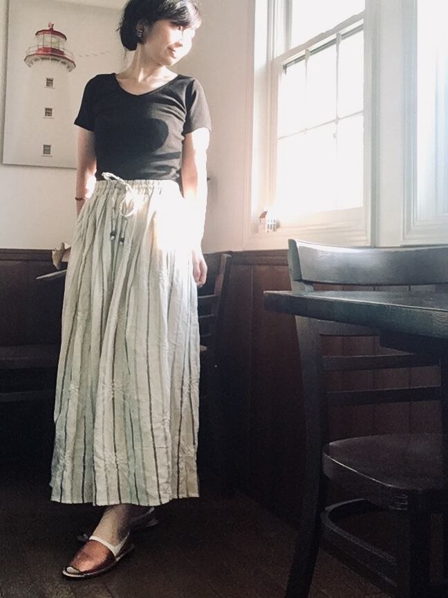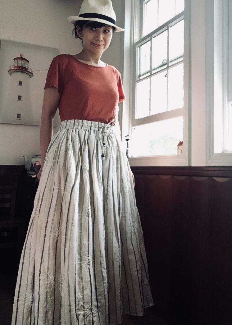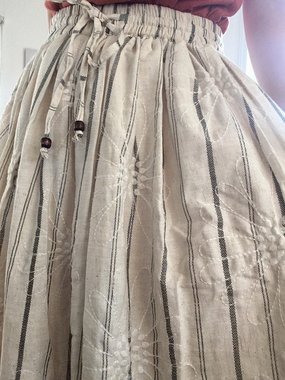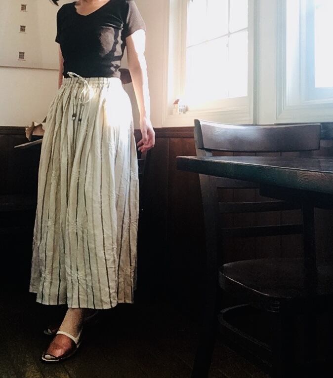 手描きのようなニュアンスあるストライプに、さりげなく施された大輪のお花の刺繍が刺し子のようで、素朴な中にも洗練されたコットンスカート。少し和のテイストも感じられ、ナチュラルだけど大人の雰囲気を漂わせます。