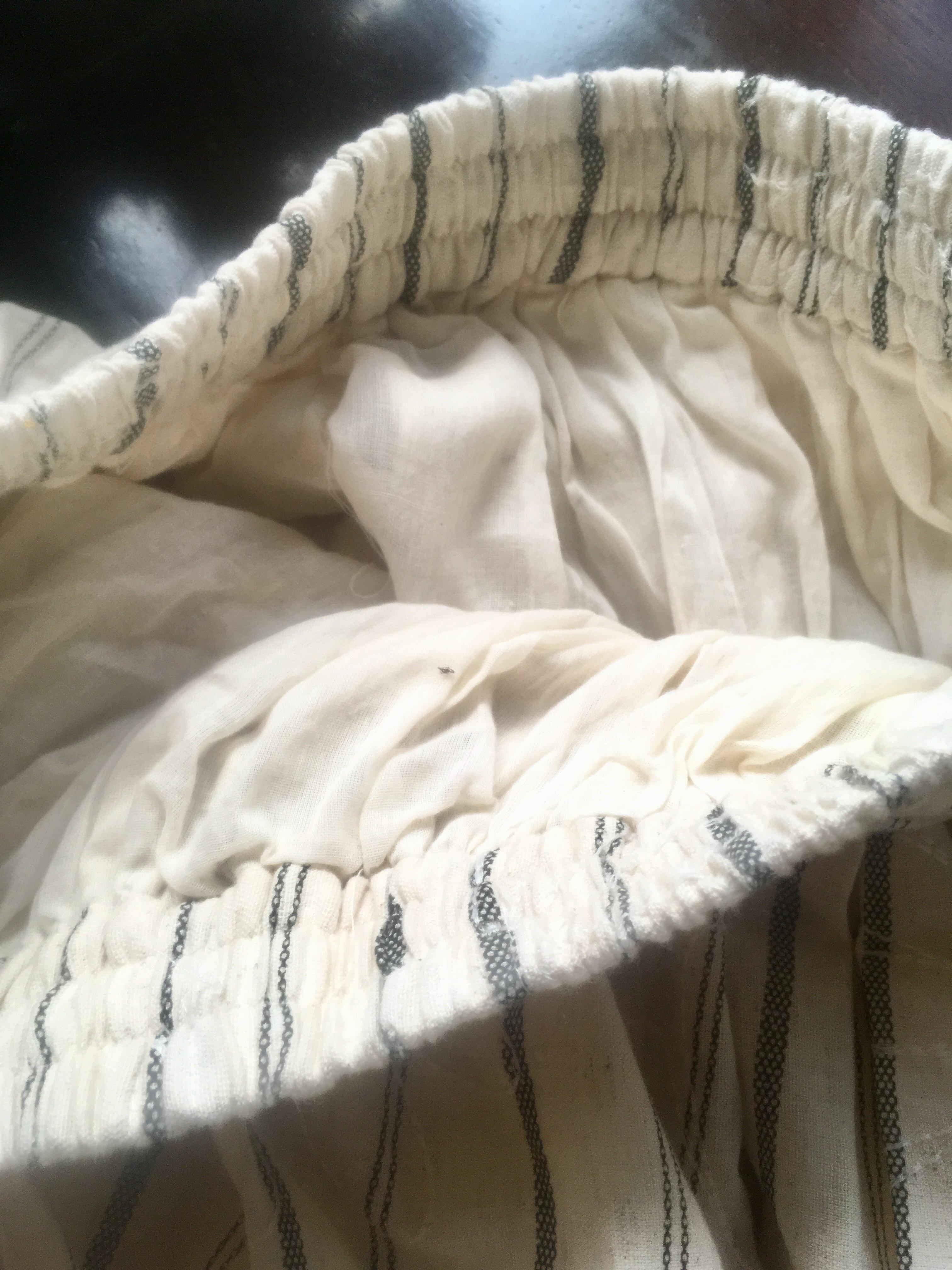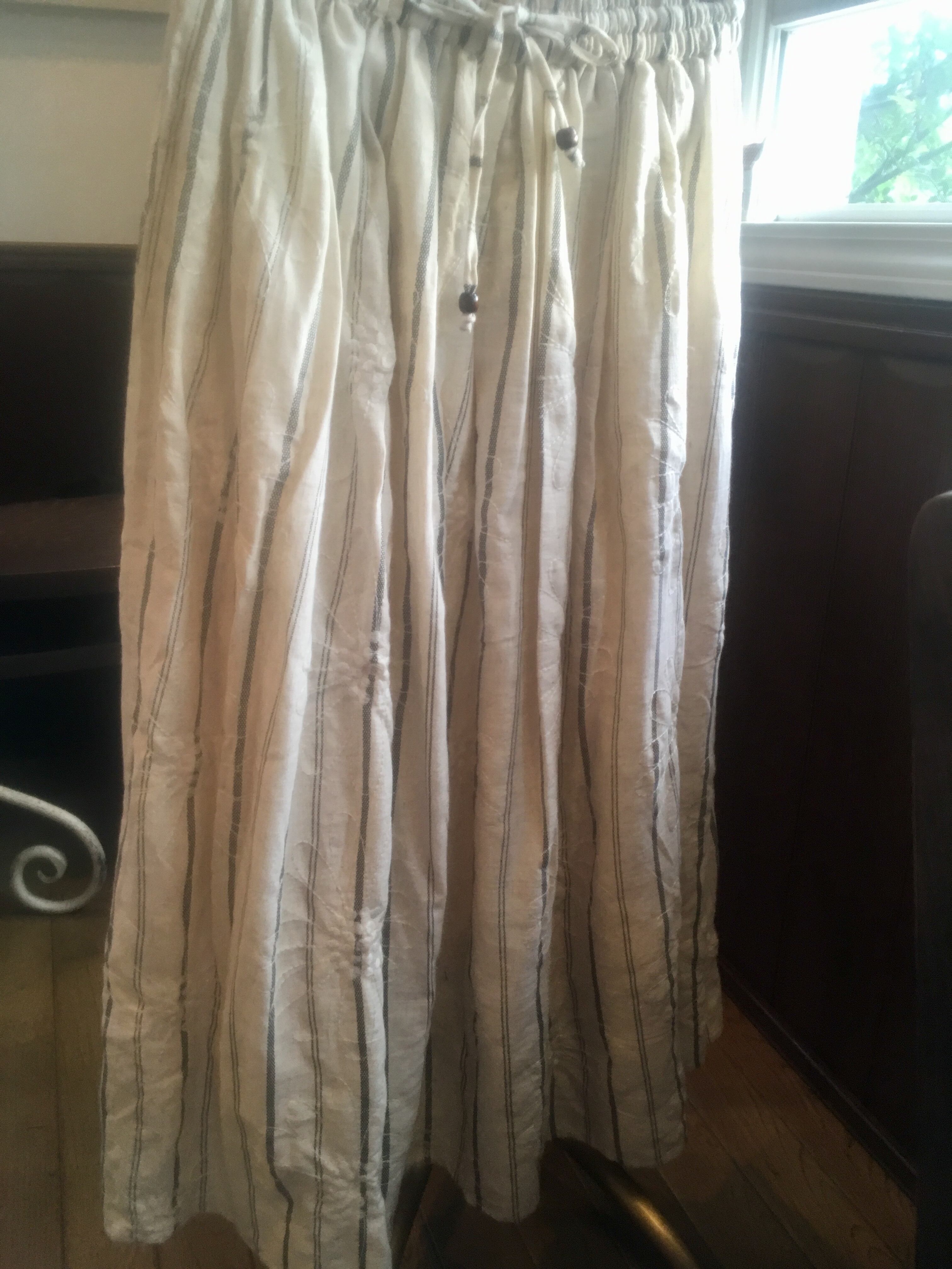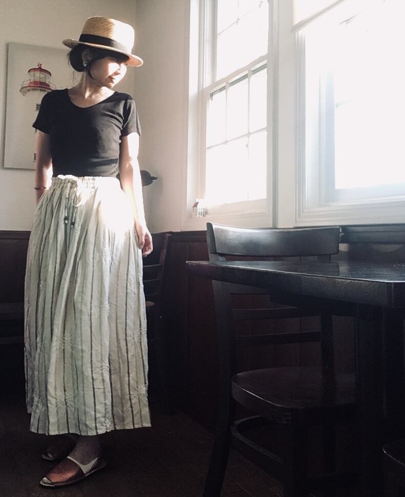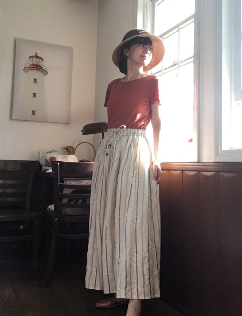 手描きのようなニュアンスあるストライプに、さりげなく施された大輪のお花の刺繍が刺し子のようで、素朴な中にも洗練されたコットンスカート。少し和のテイストも感じられ、ナチュラルだけど大人の雰囲気を漂わせます。