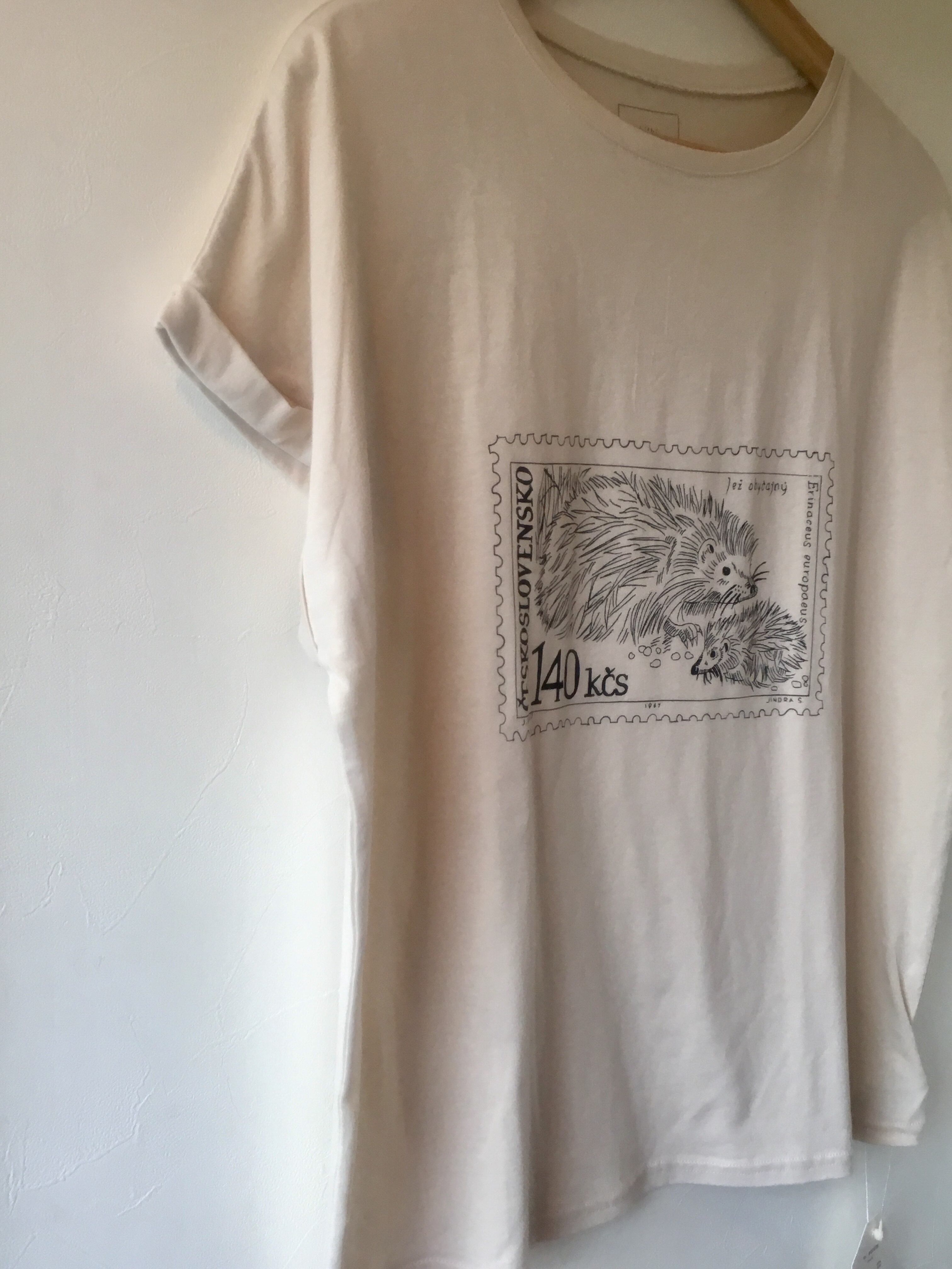 ハリネズミのイラストも可愛くて愛着が湧いてくる一着です。オーバーサイズが今っぽく、レーヨン混なのでしなやかに体に寄りそってくれ、だらしなくならないのも良いところ。またボトムにインしても綺麗なシルエットを作ってくれるので、いろんなボトムに合わせて楽しんでいただけます。