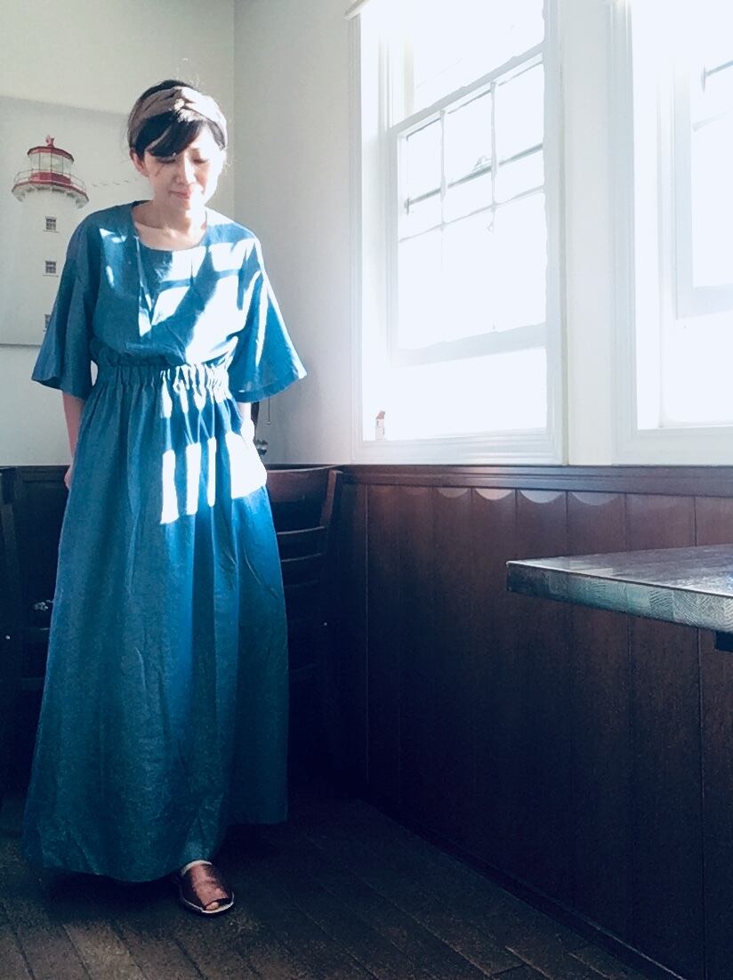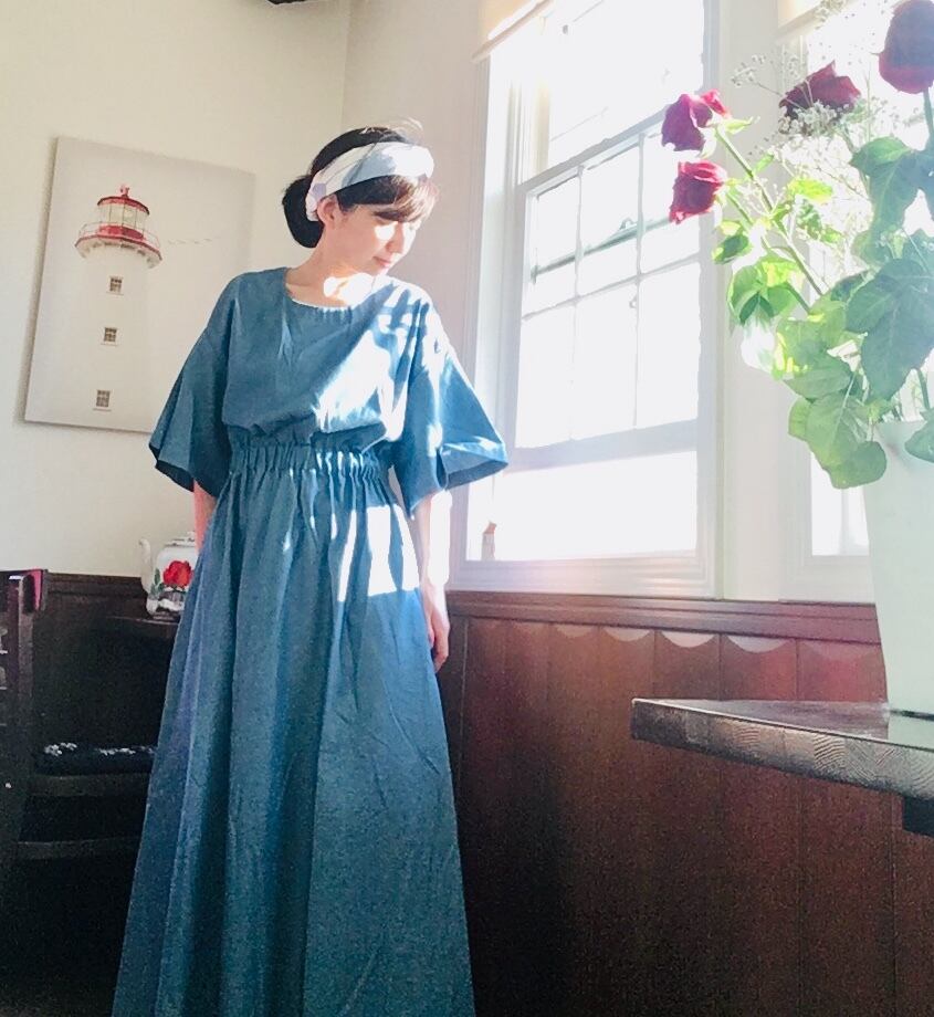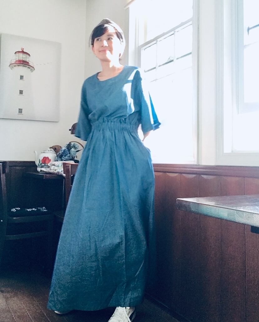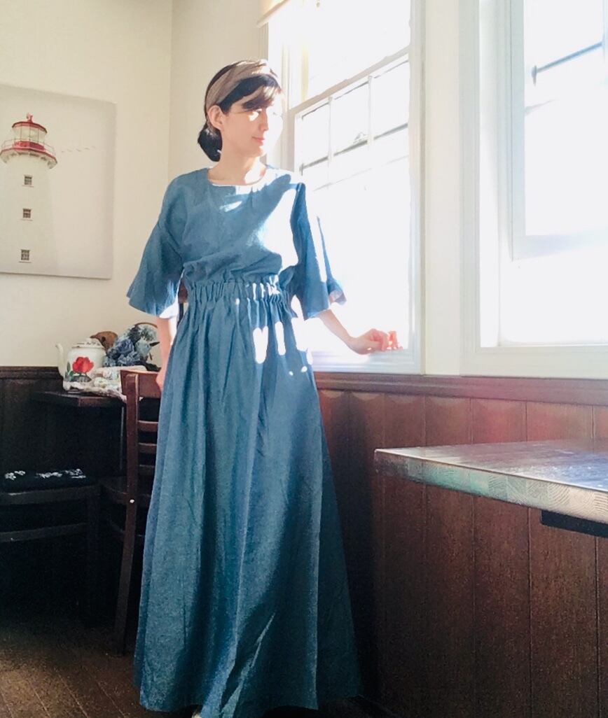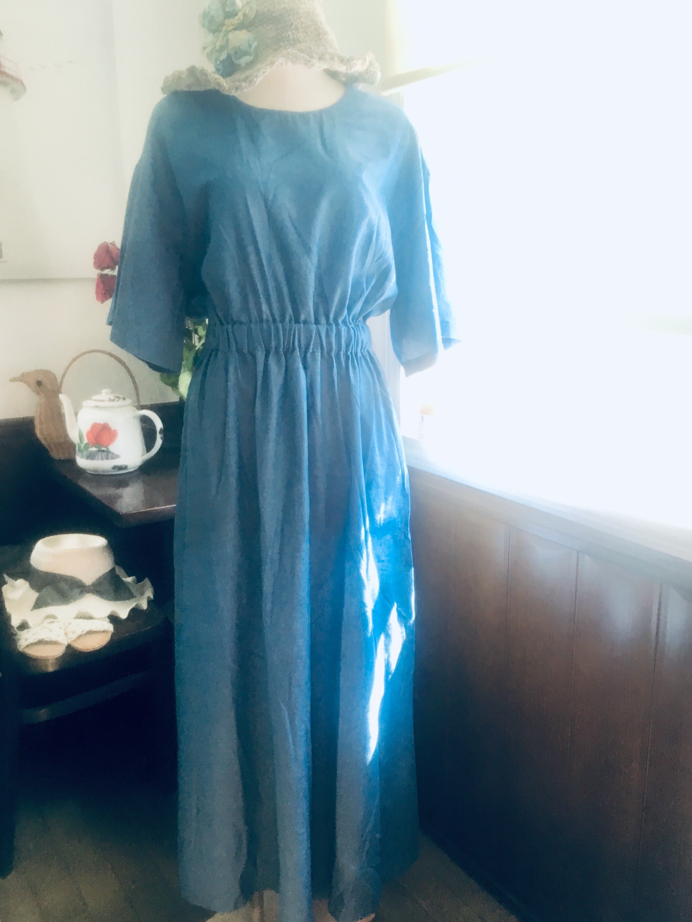 さわやかなブルー一色のシンプルさと女性らしいシルエットが魅力的。ボリュームのある袖とドロップショルダーでゆったりした上半身をウエストのゴムのブラウジングでスタイルアップ効果も抜群。背中のボタンもアクセントになっていてかわいいです。シンプルなので、飽きがこず、小物とのコーディネートで、ノスタルジックやカントリー、アーバンにと、さまざまな雰囲気で長く楽しめることでしょう。ポケット付き。