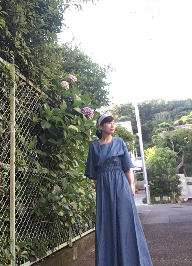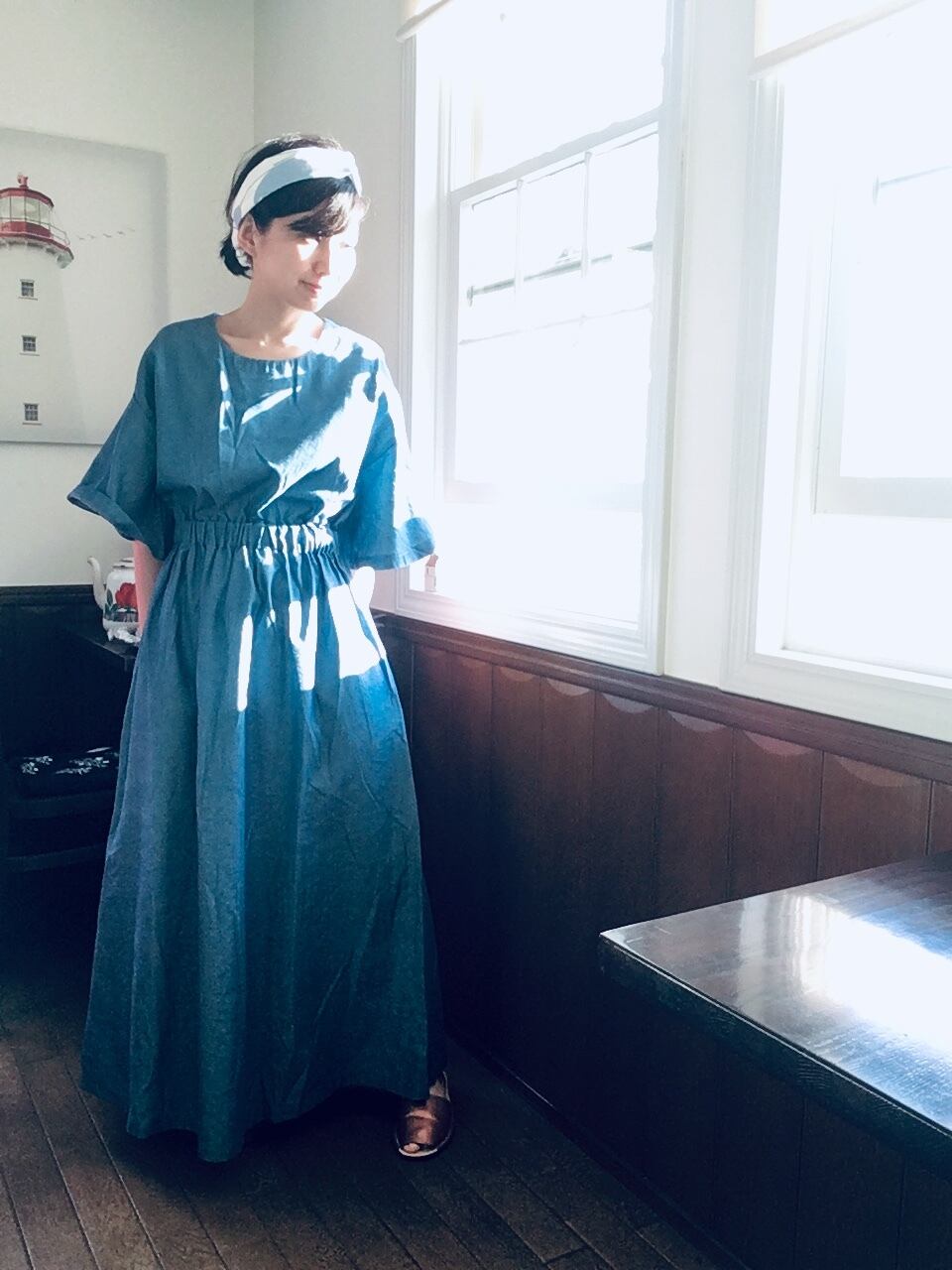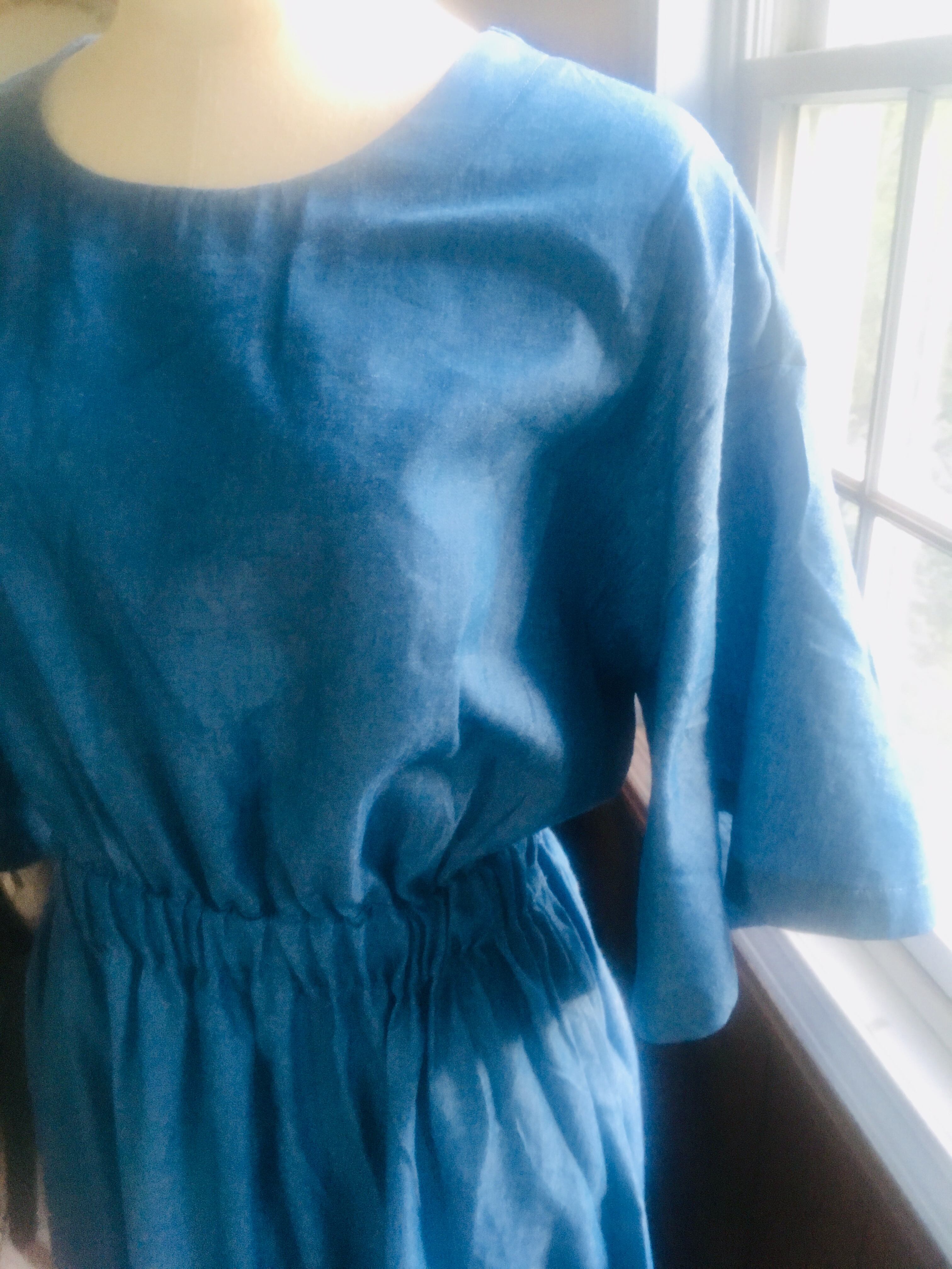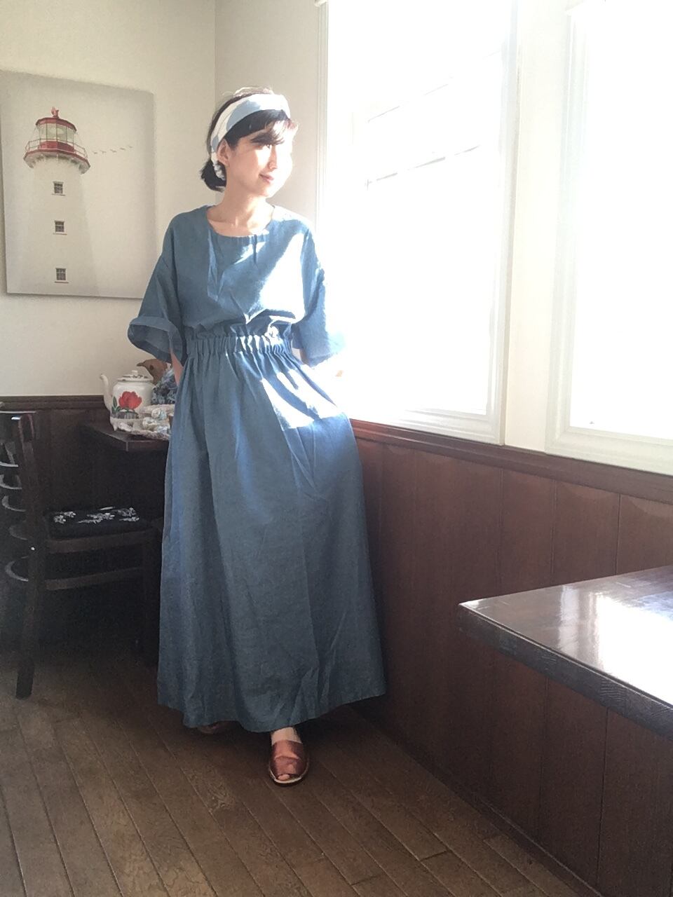 さわやかなブルー一色のシンプルさと女性らしいシルエットが魅力的。ボリュームのある袖とドロップショルダーでゆったりした上半身をウエストのゴムのブラウジングでスタイルアップ効果も抜群。背中のボタンもアクセントになっていてかわいいです。シンプルなので、飽きがこず、小物とのコーディネートで、ノスタルジックやカントリー、アーバンにと、さまざまな雰囲気で長く楽しめることでしょう。ポケット付き。