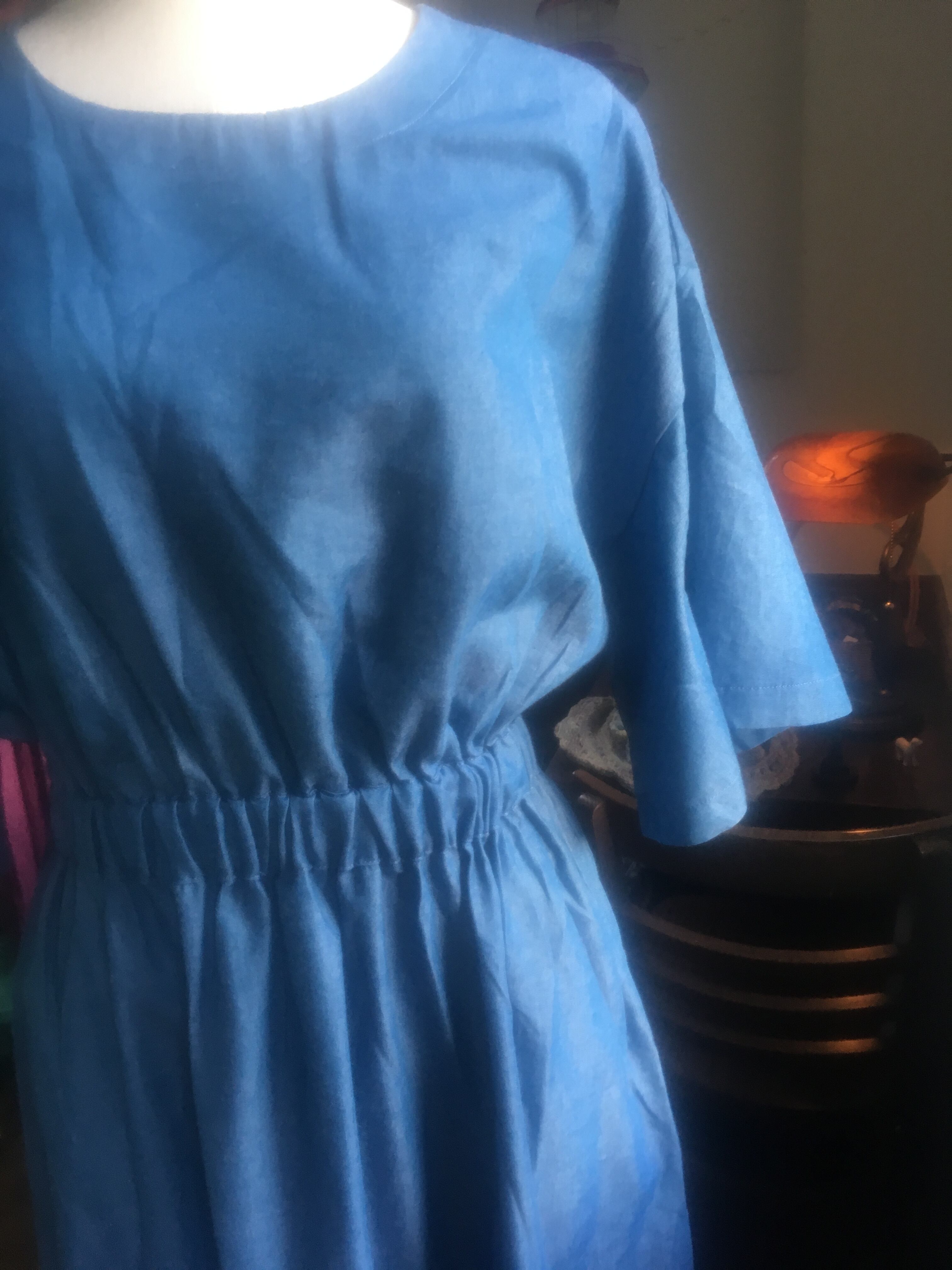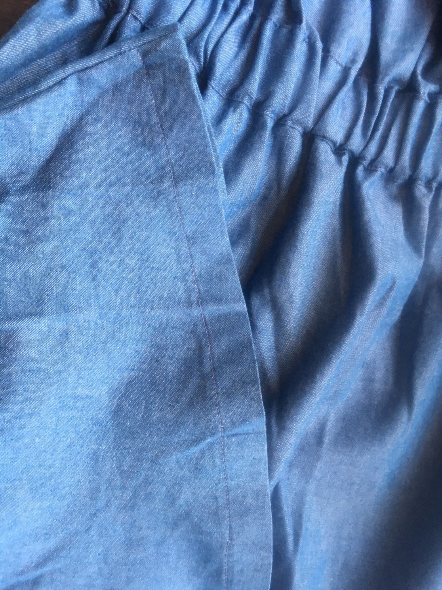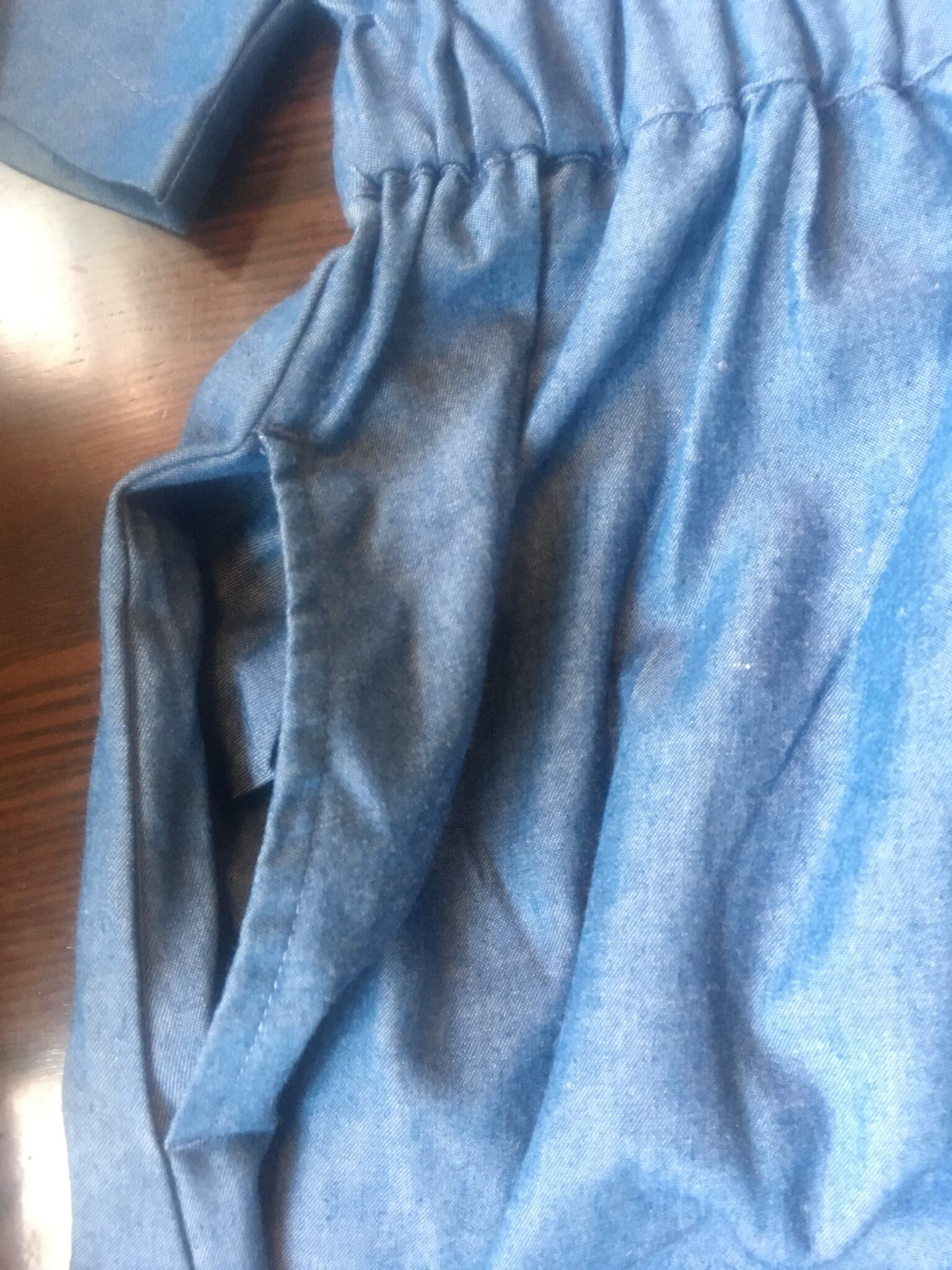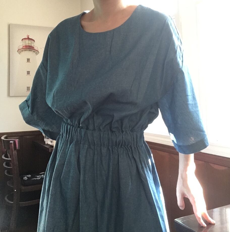 さわやかなブルー一色のシンプルさと女性らしいシルエットが魅力的。ボリュームのある袖とドロップショルダーでゆったりした上半身をウエストのゴムのブラウジングでスタイルアップ効果も抜群。背中のボタンもアクセントになっていてかわいいです。シンプルなので、飽きがこず、小物とのコーディネートで、ノスタルジックやカントリー、アーバンにと、さまざまな雰囲気で長く楽しめることでしょう。ポケット付き。