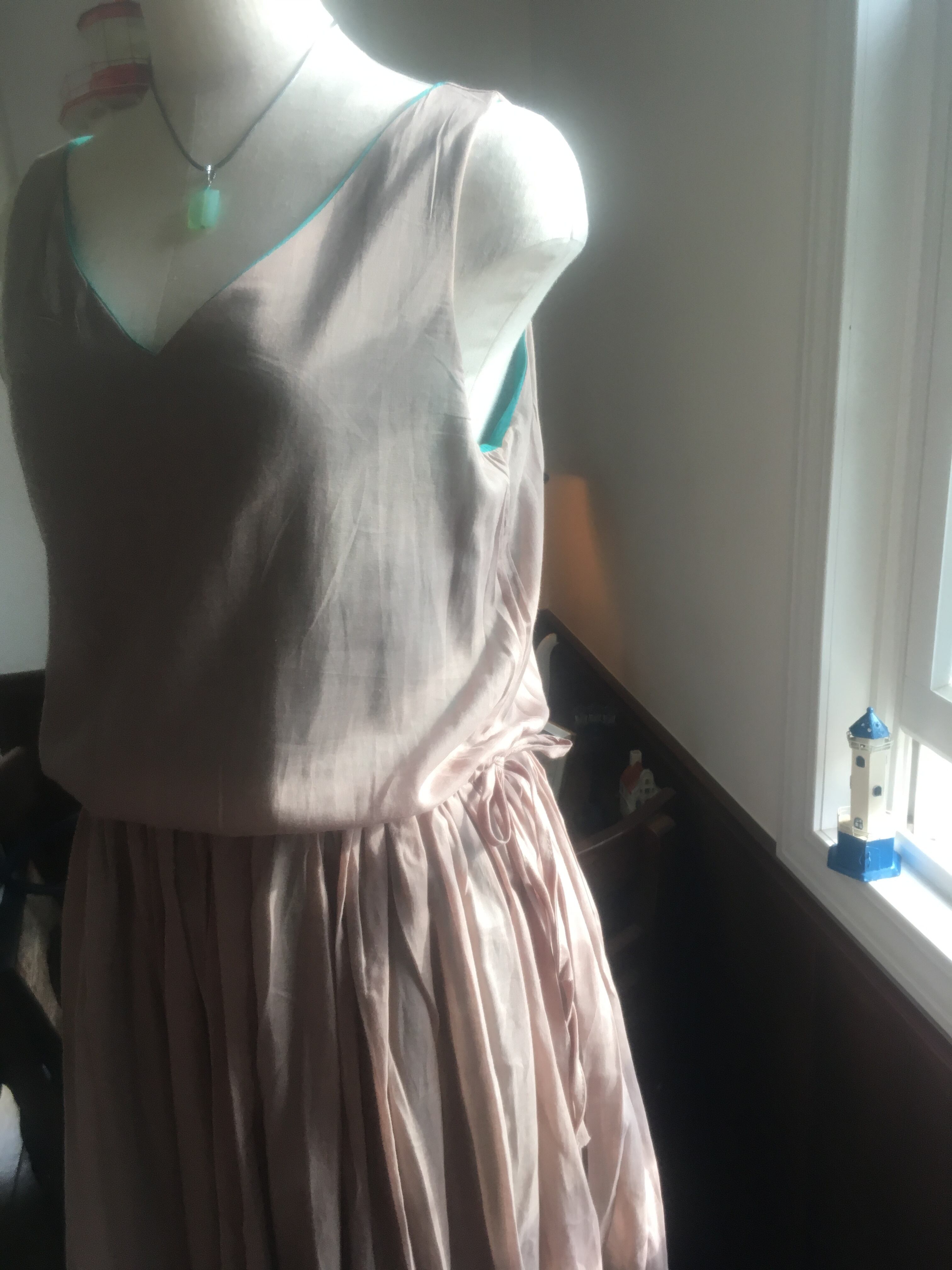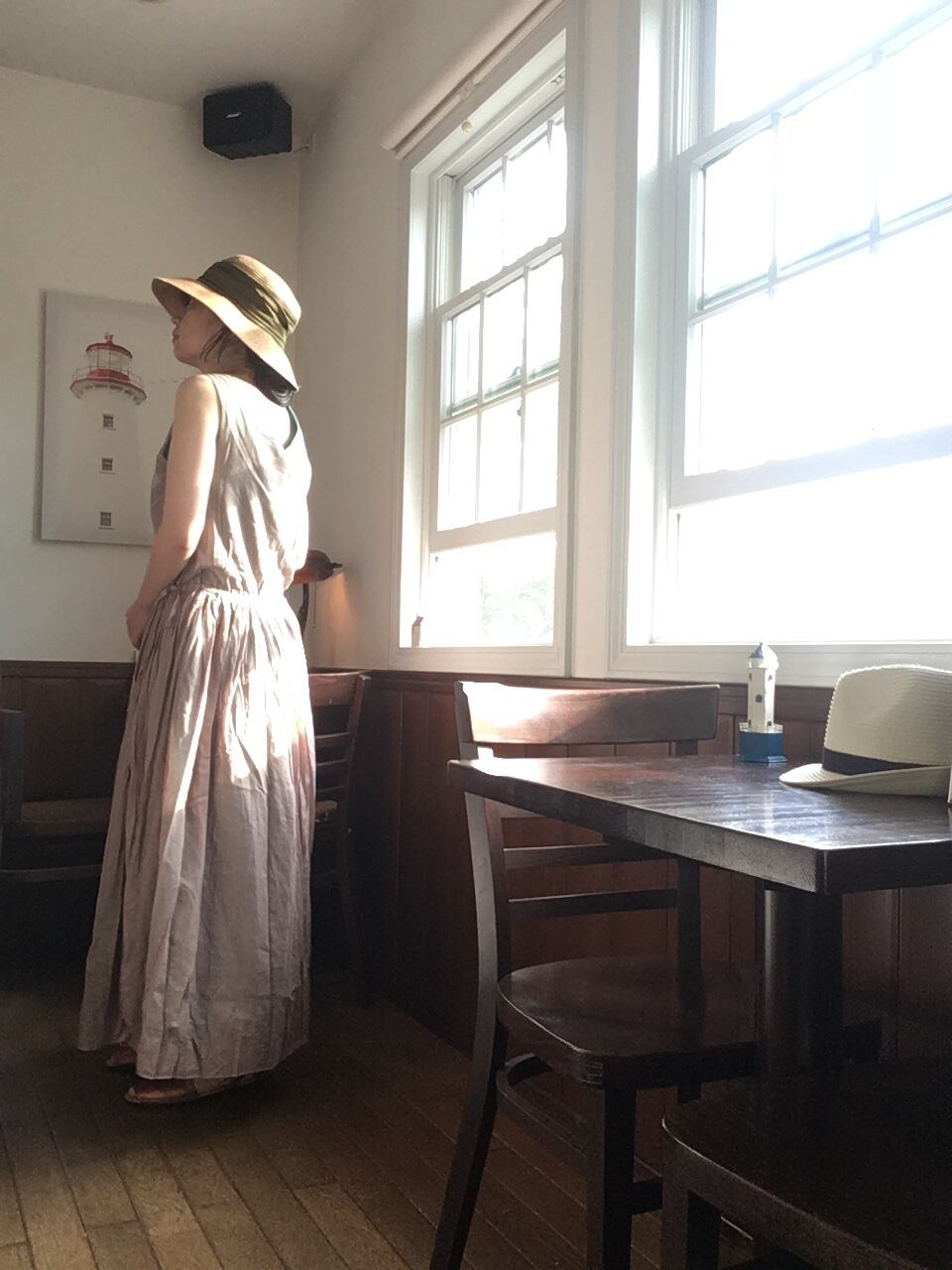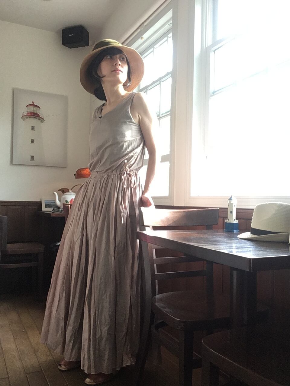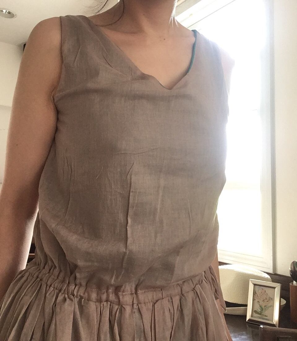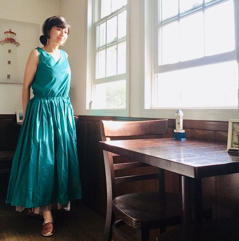 greenを表に着ると、裾にbeigeが少しレイヤードになって見えます。ゆるやかなVネックも胸元と背中を美しく見せてくれます。