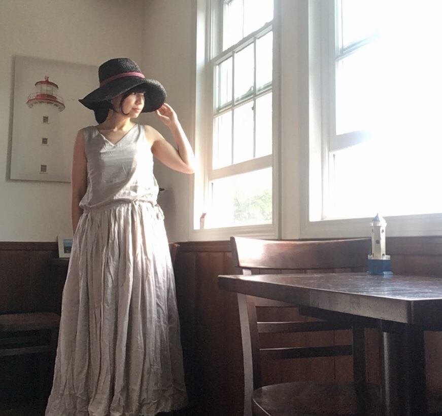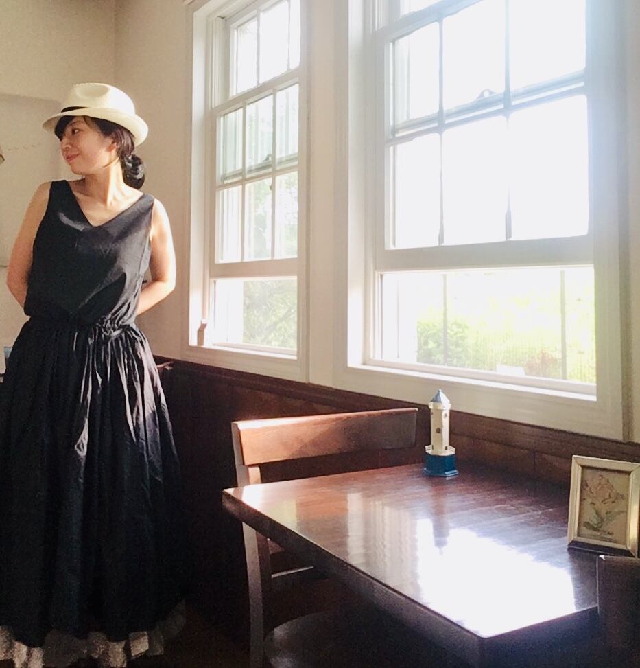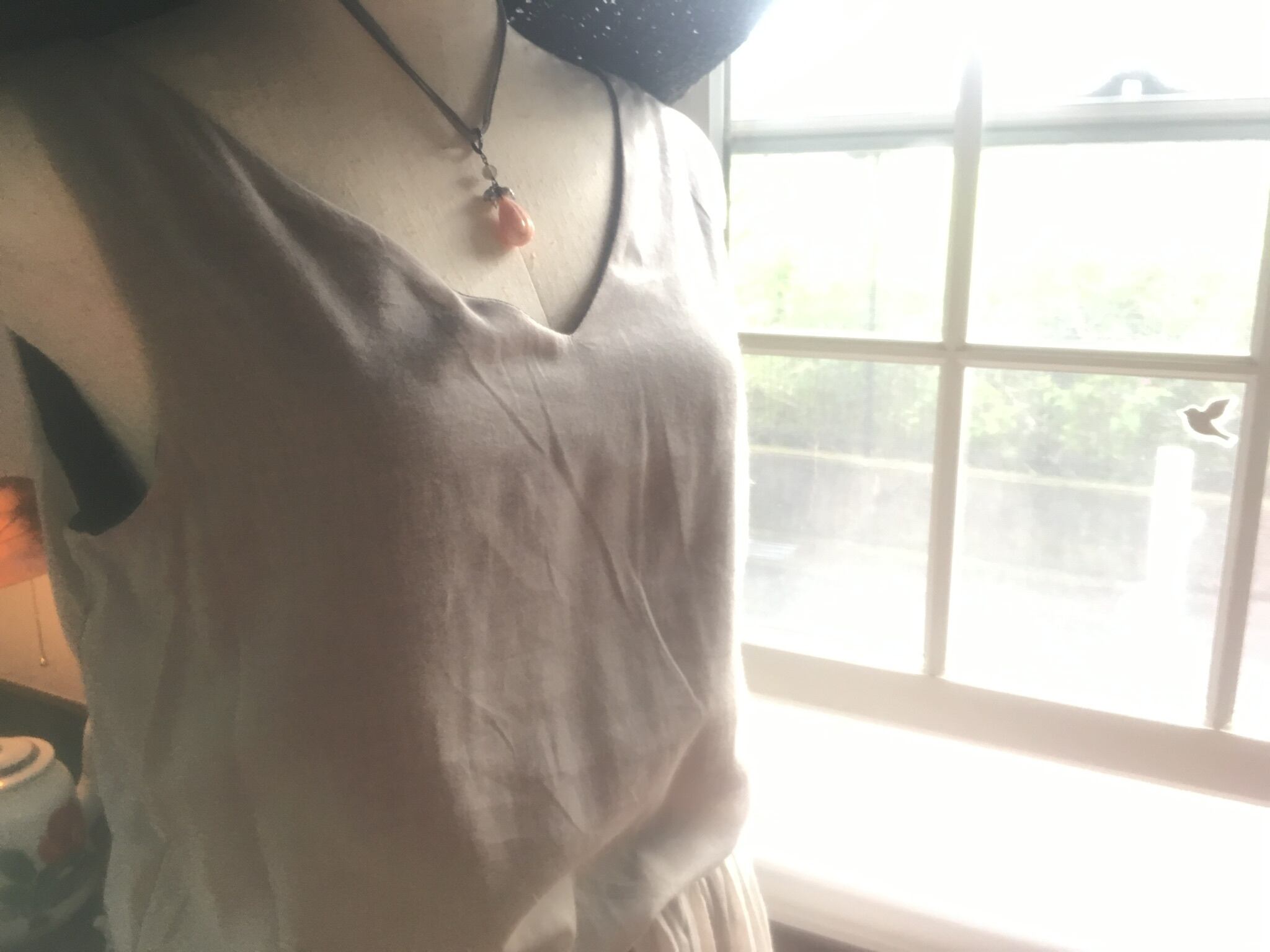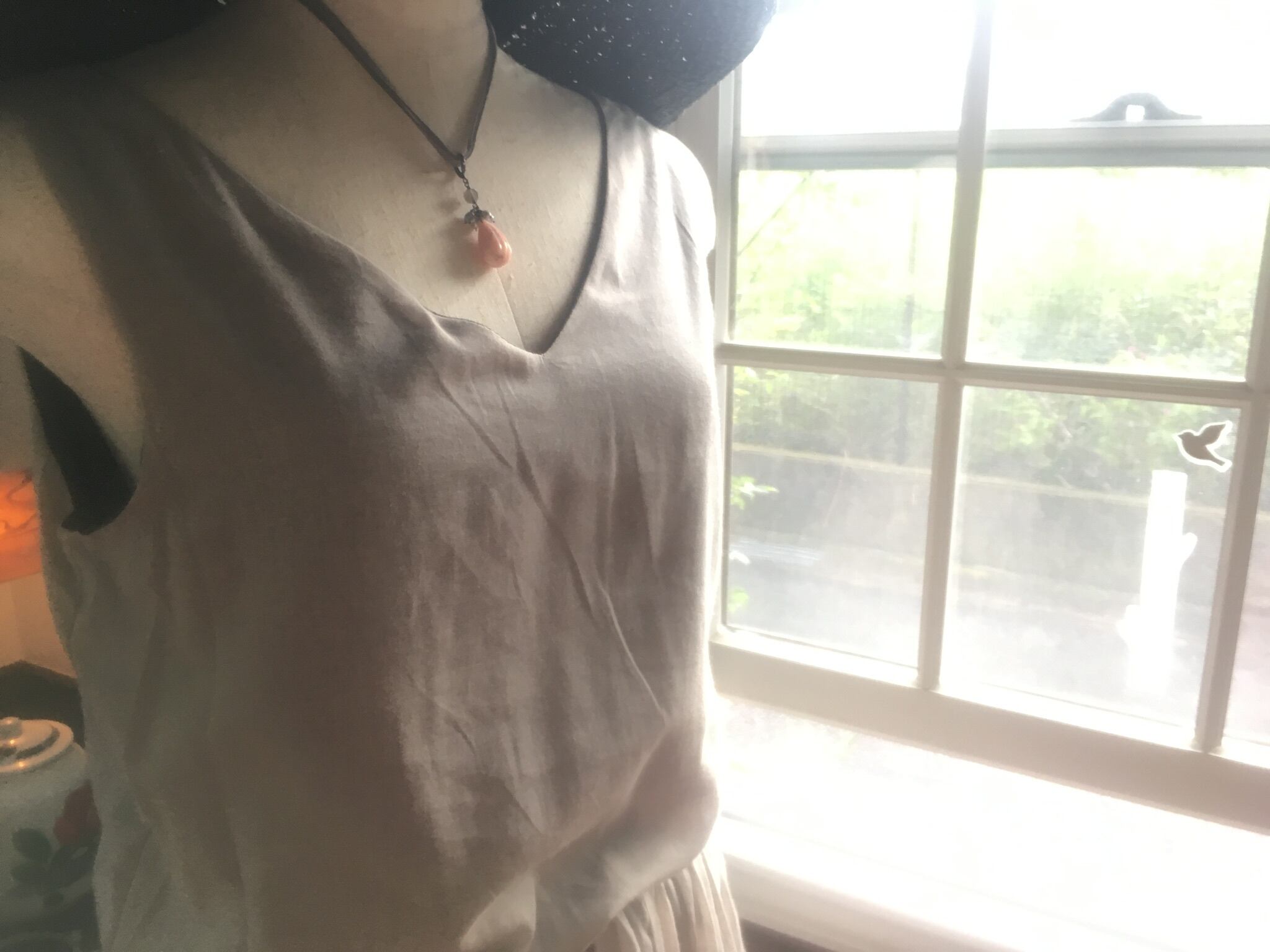 blackを表に着ると、裾にlight grayが少しレイヤードになって見えます。ゆるやかなVネックも胸元と背中を美しく見せてくれます。