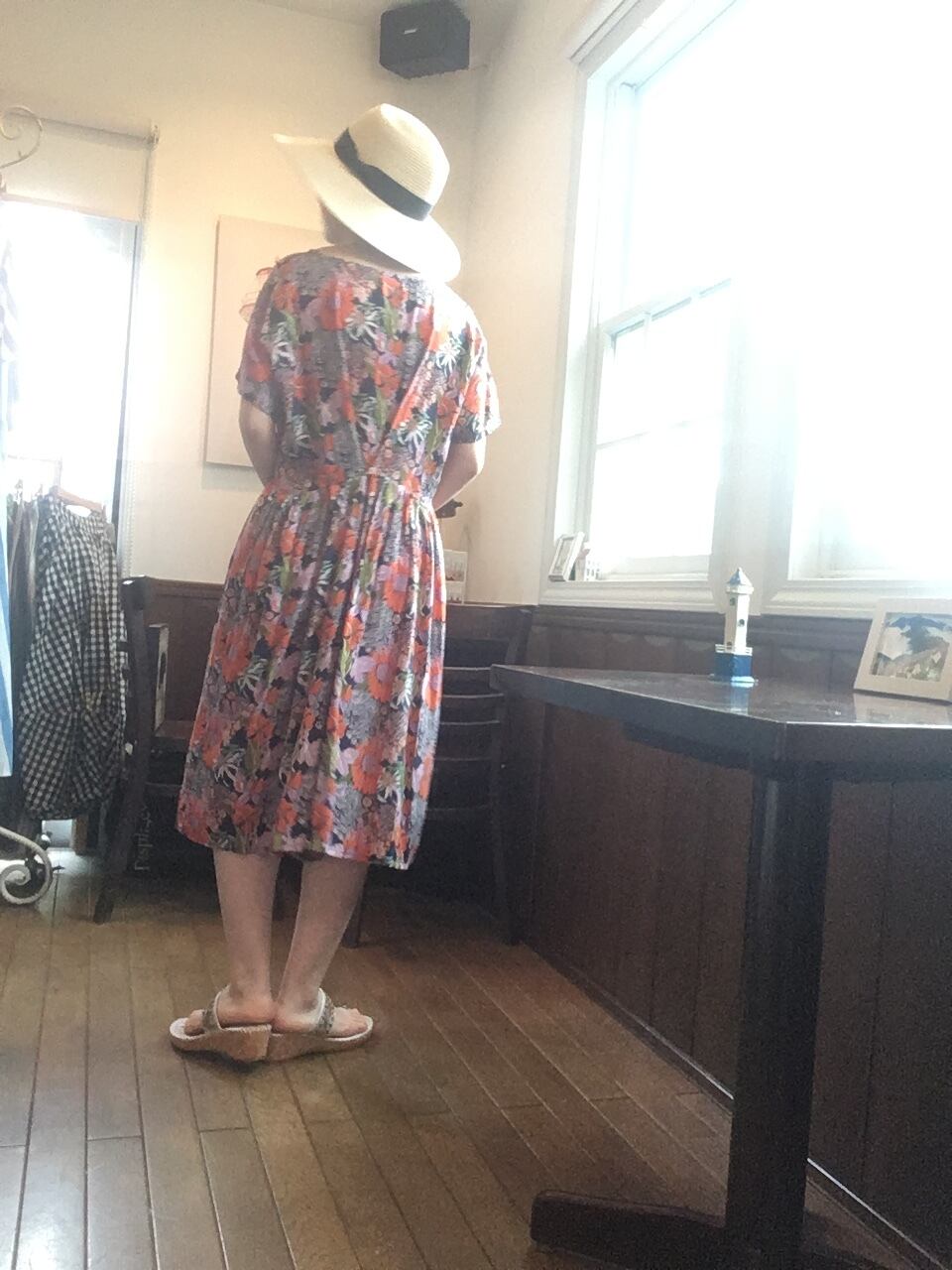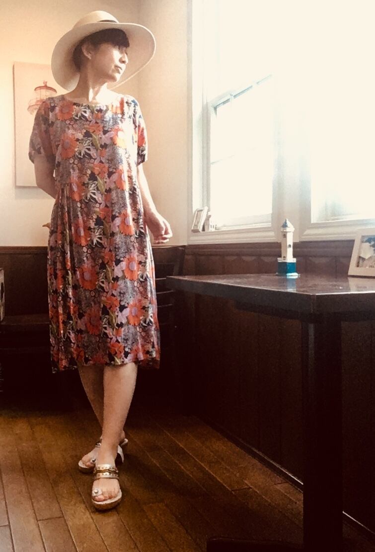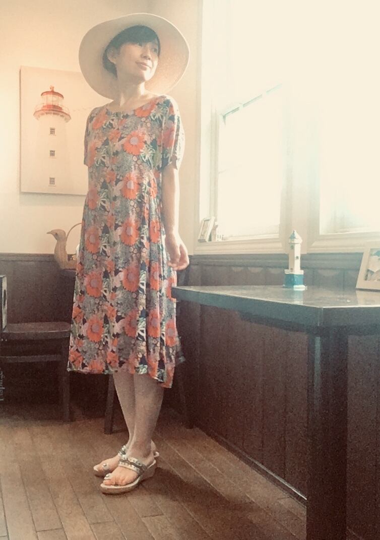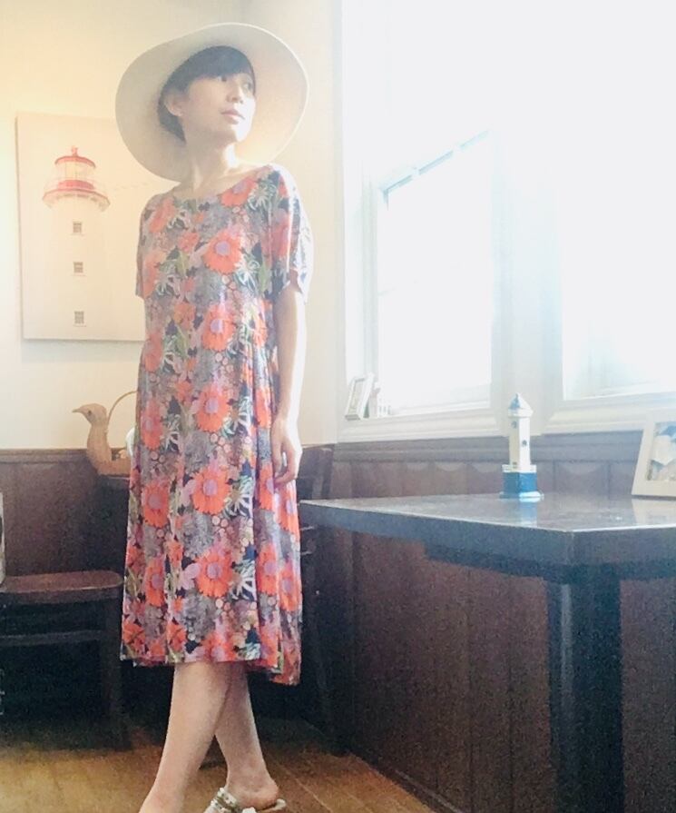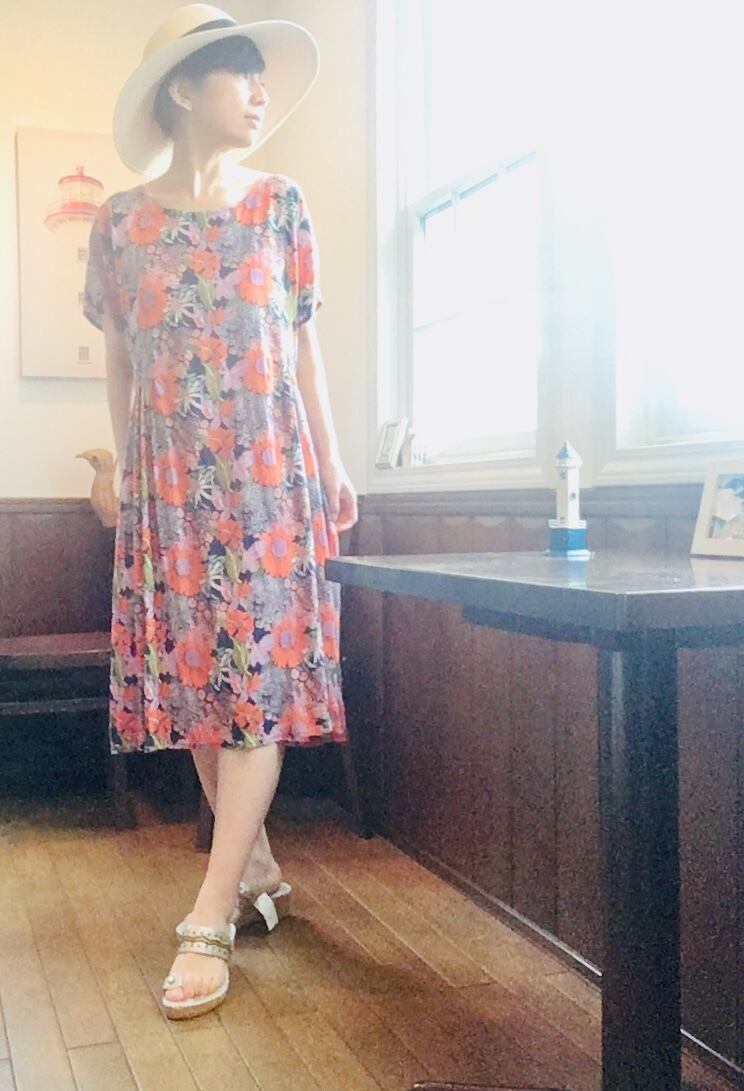 遠い夏の日おばあちゃんが着ていたような、どこか懐かしくも 外国のビンテージのような雰囲気もあるワンピース。紺地にオレンジ色の大きな花柄が独特なレトロ感を醸し出しています。少し翳りのある表情が晩夏の陽射しにも似合いそうです。浴衣の気分でも着れそうです。