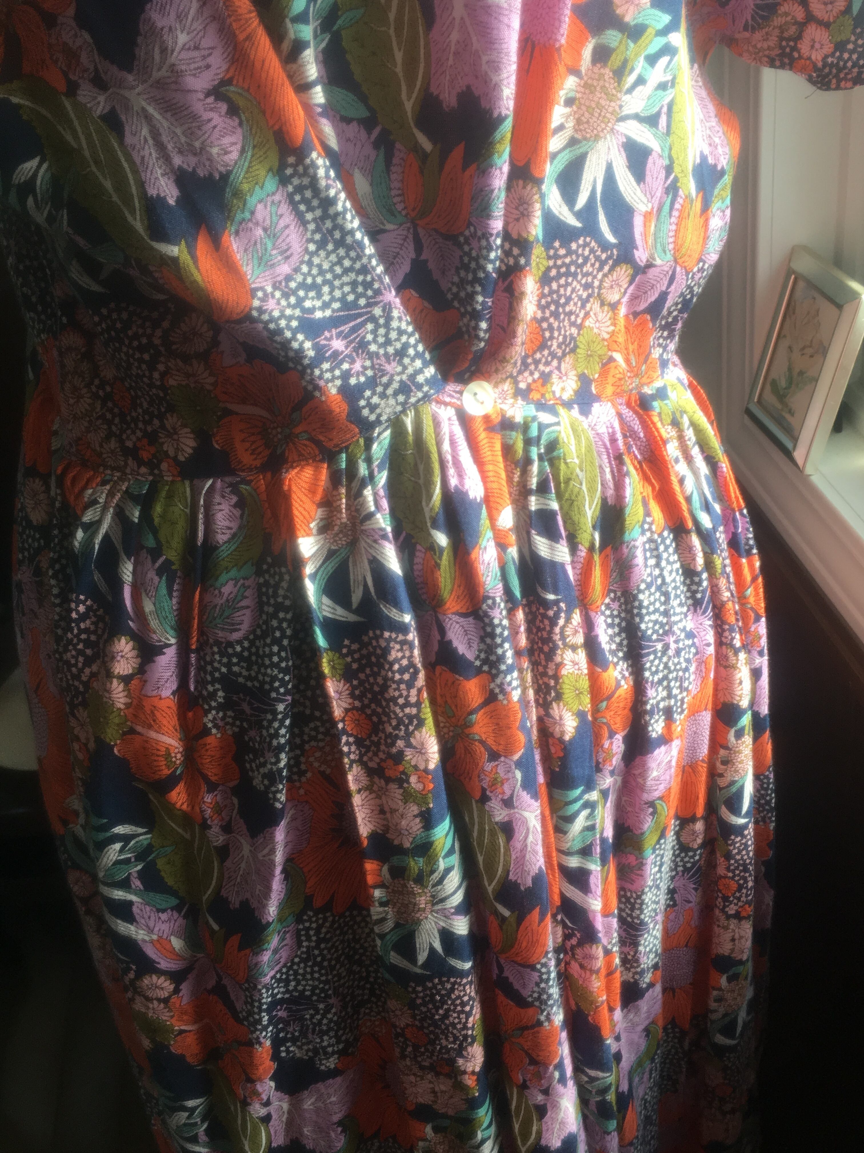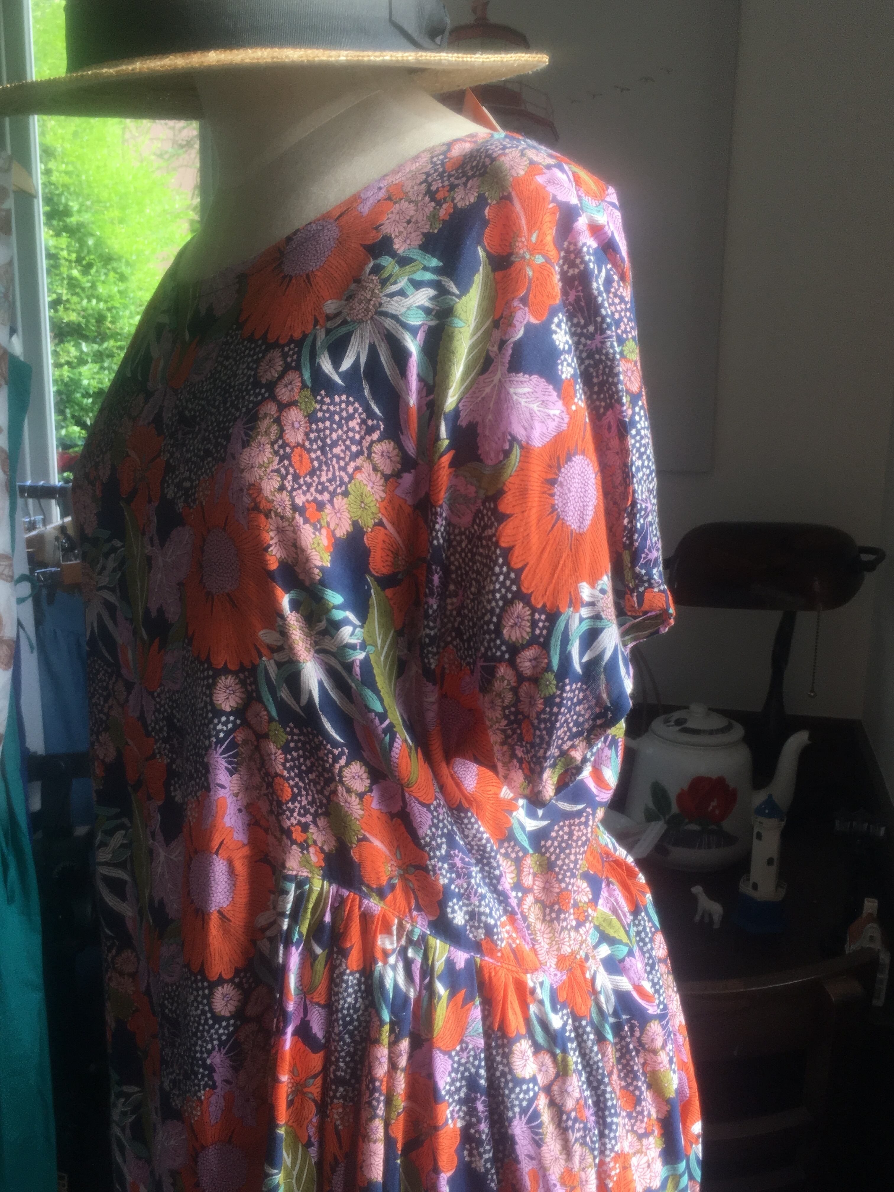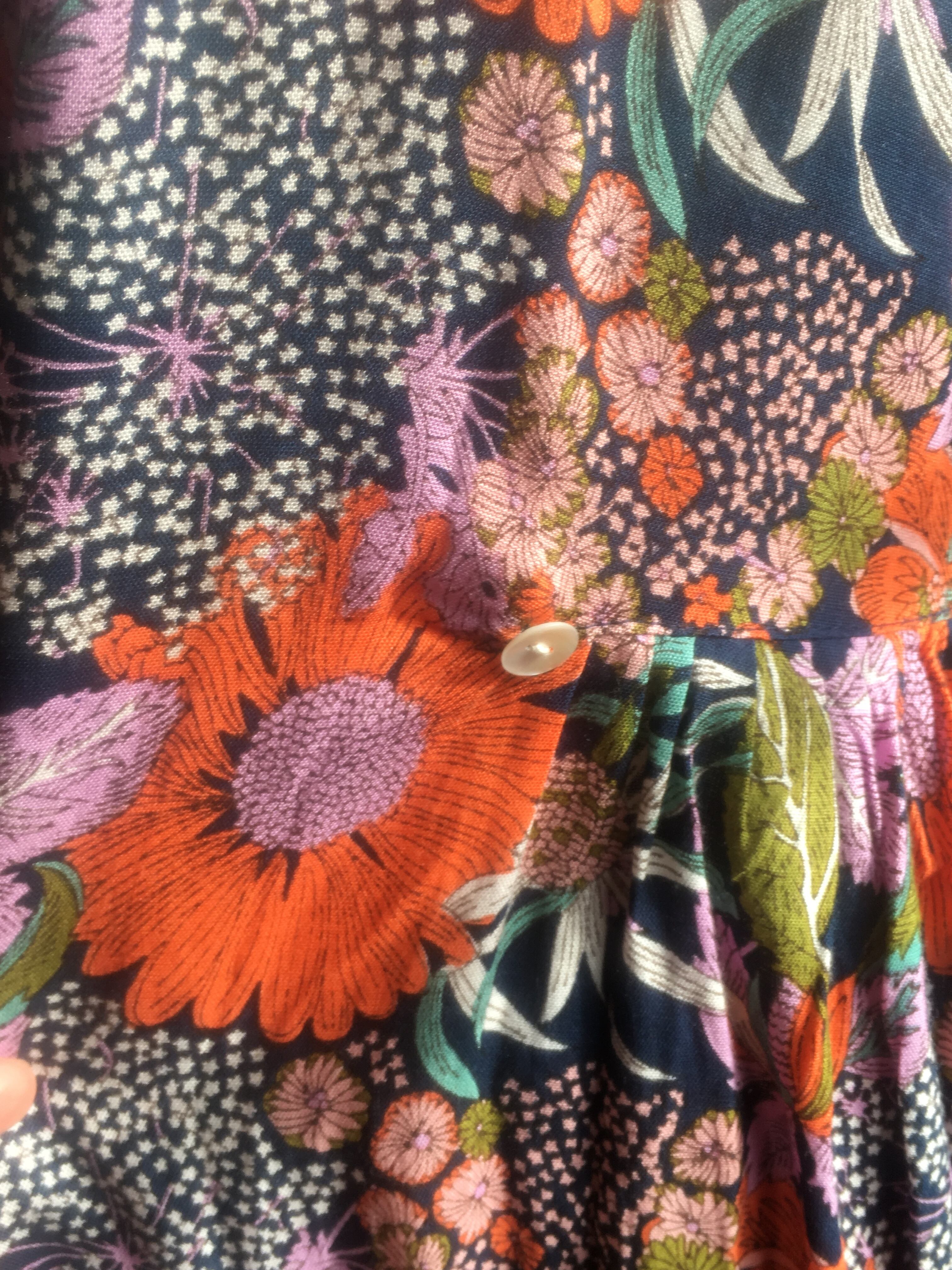 遠い夏の日おばあちゃんが着ていたような、どこか懐かしくも 外国のビンテージのような雰囲気もあるワンピース。紺地にオレンジ色の大きな花柄が独特なレトロ感を醸し出しています。少し翳りのある表情が晩夏の陽射しにも似合いそうです。浴衣の気分でも着れそうです。
