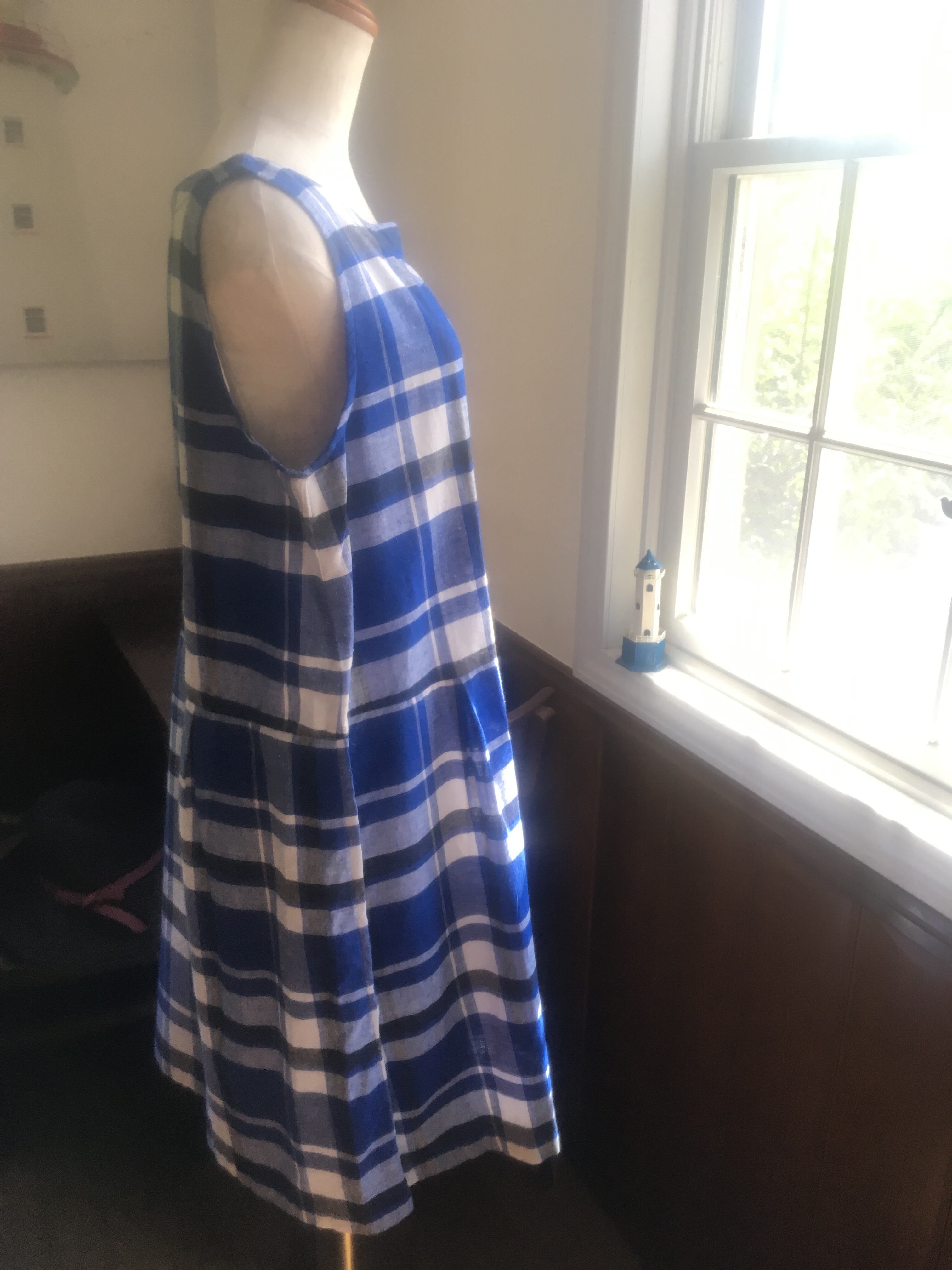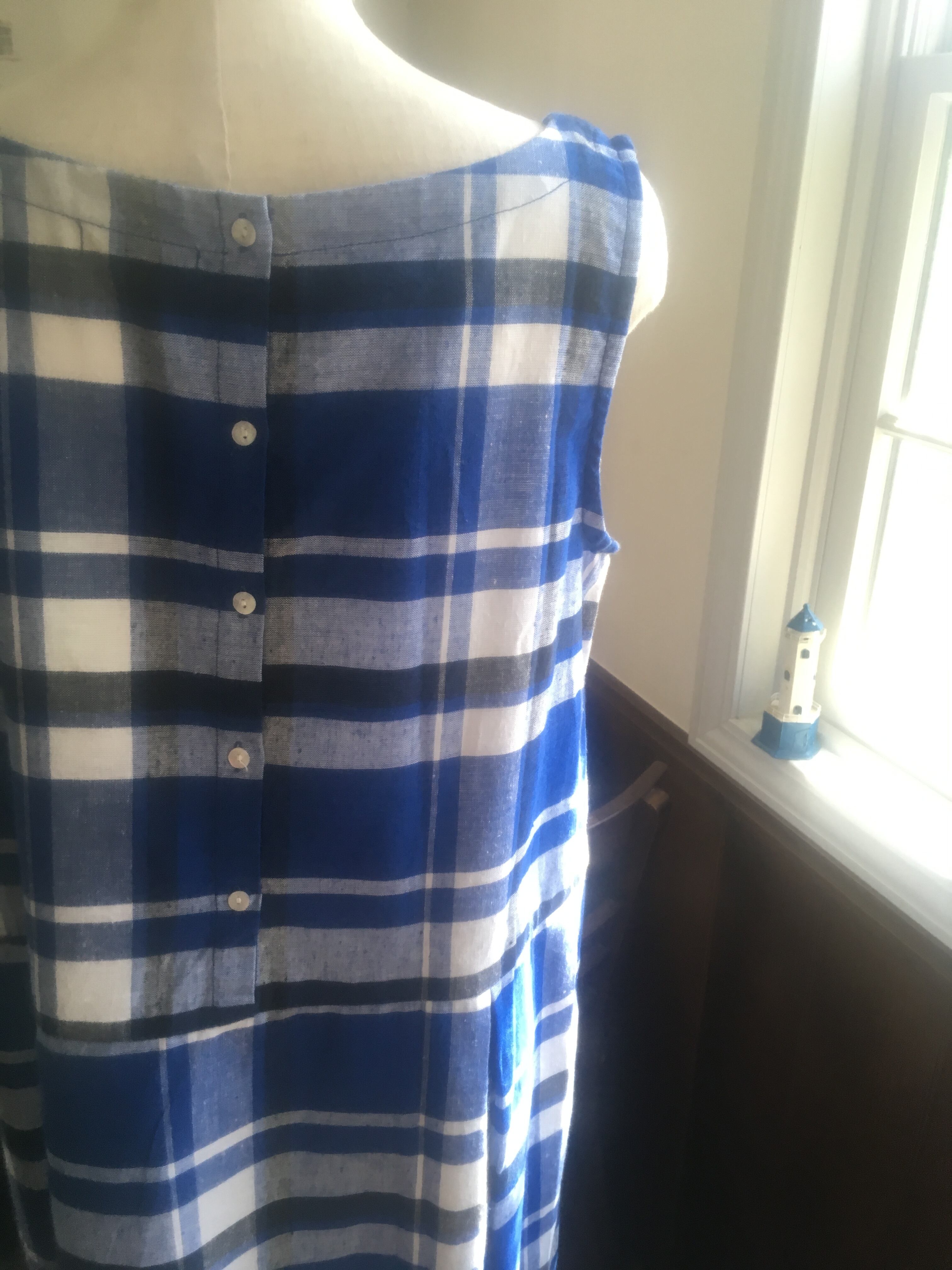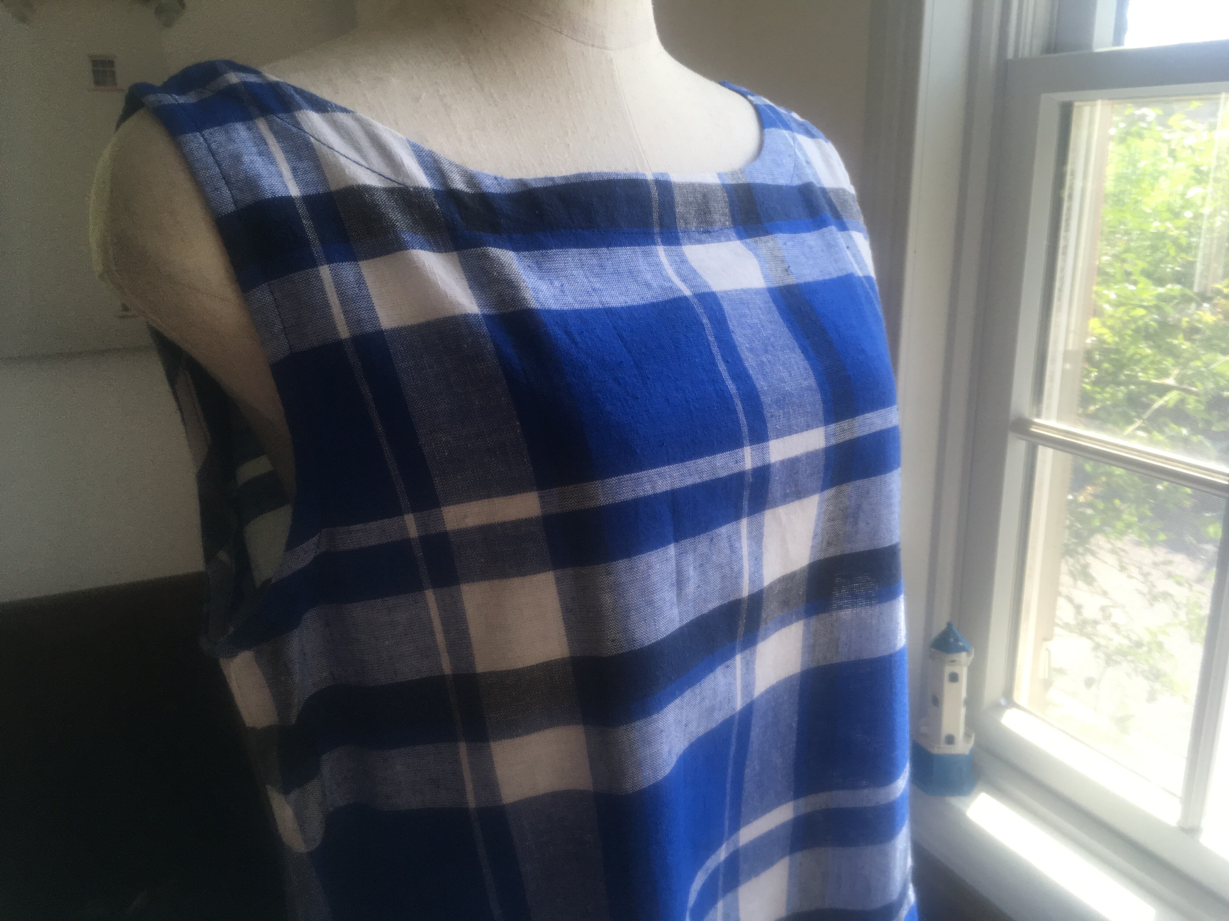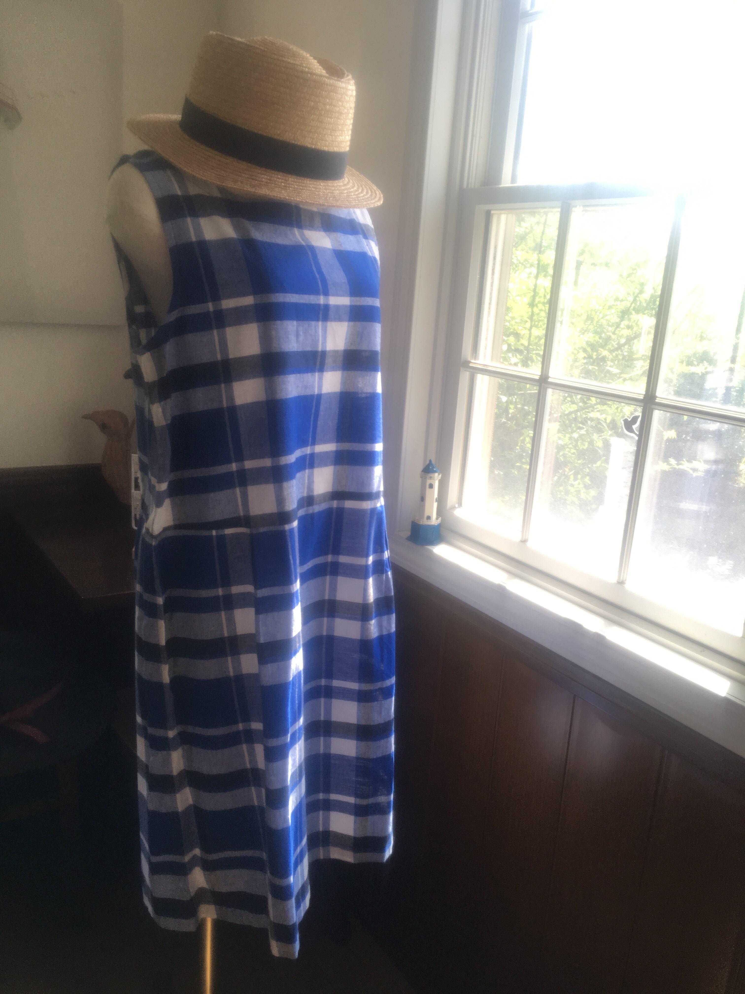 ブルー系のグラデーションとホワイトのコントラストがすっきり清々しいノースリーブワンピース。コットンに少し麻の混ざった生地は、ほどよくハリがあってキチンと感も兼ね備えています。