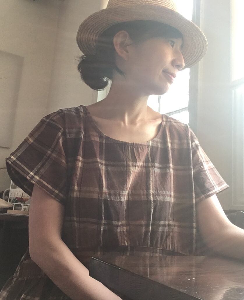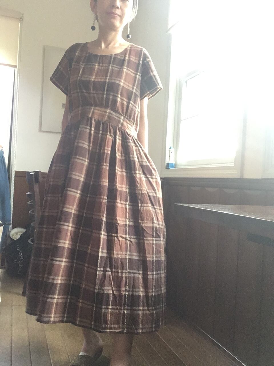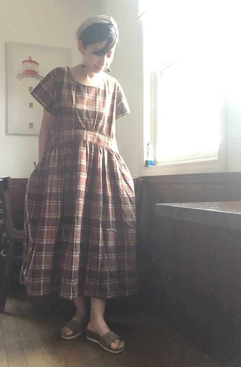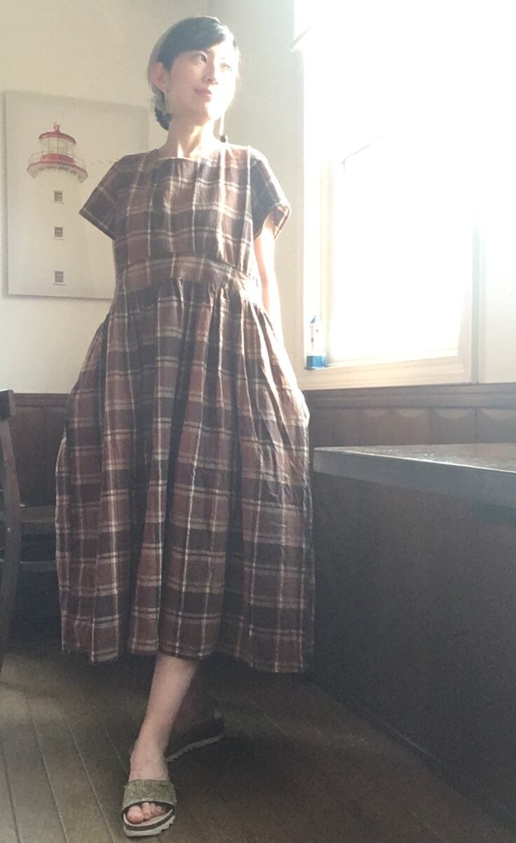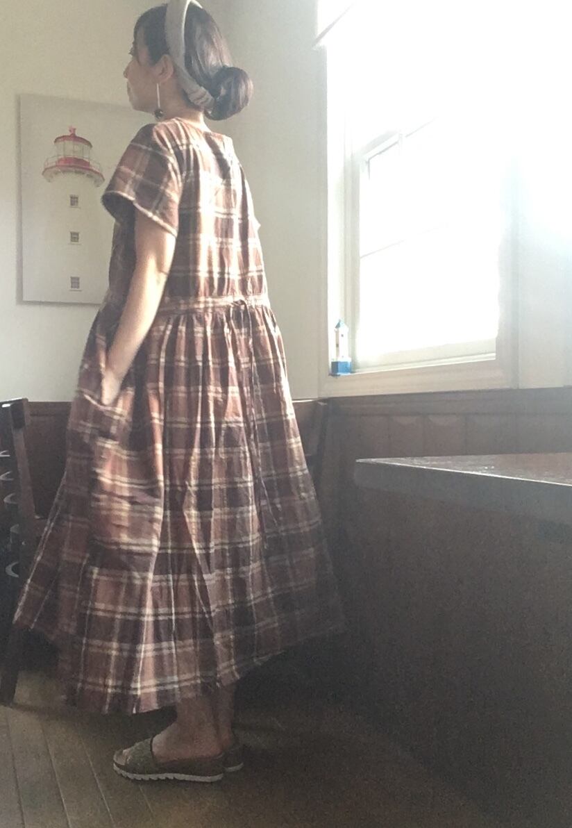 セピア色のチェック柄が、ノスタルジーな少女時代にタイムスリップしそうなワンピース。落ち着いた色合いと、洗いざらしたようなナチュラルな風合いのコットン素材が肌触りよく、長い季節着ていただけます。ウエストは絞って、バックでリボンを結ぶことができるので、サイズ調節ができます。ゆったりリラックスな感じもよし、ギャザーを作ってタイトめにクラシカルな雰囲気にするのもよし。