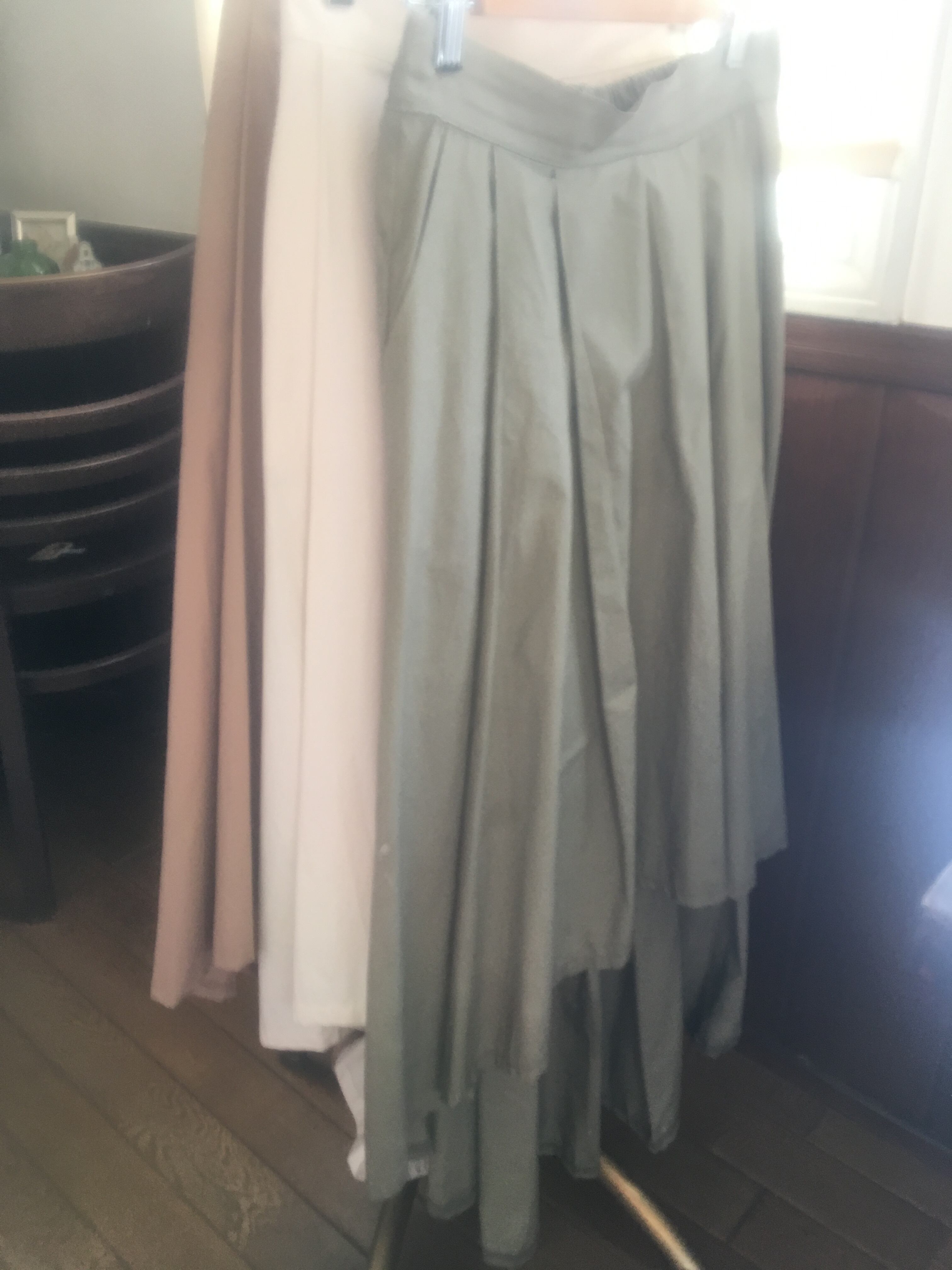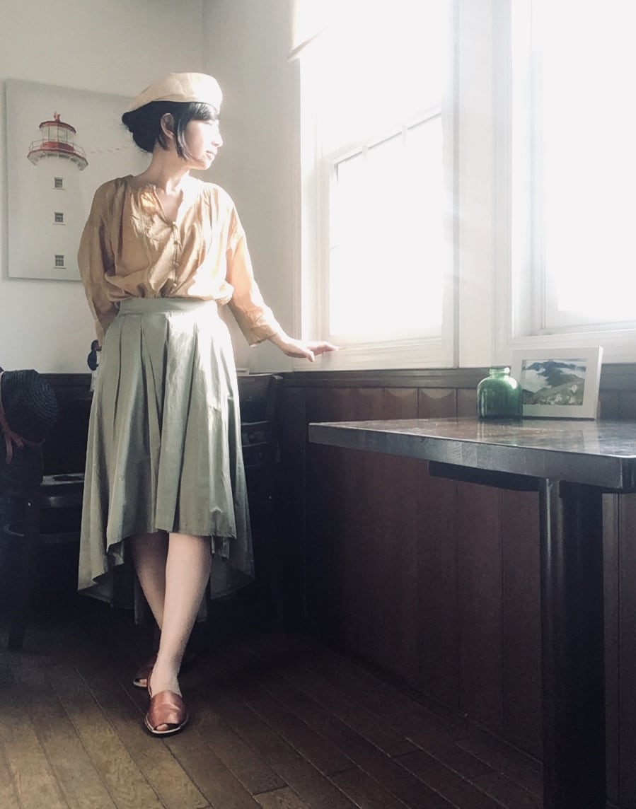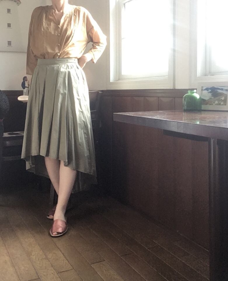 前よりも後ろ側の丈が長い、魚の尾のようなシルエットが印象的なフィッシュテイルスカート。アシンメトリーなシルエットが綺麗で、横から見た脚のラインも美しく見せてくれます。上品でフェミニンな雰囲気ですが、ハリのある素材感と甘くない色合いが、凛としたレディライクを演出します。ウエストの後ろはゴム仕様なので、ラクなのにスマートにウエストマークします。
