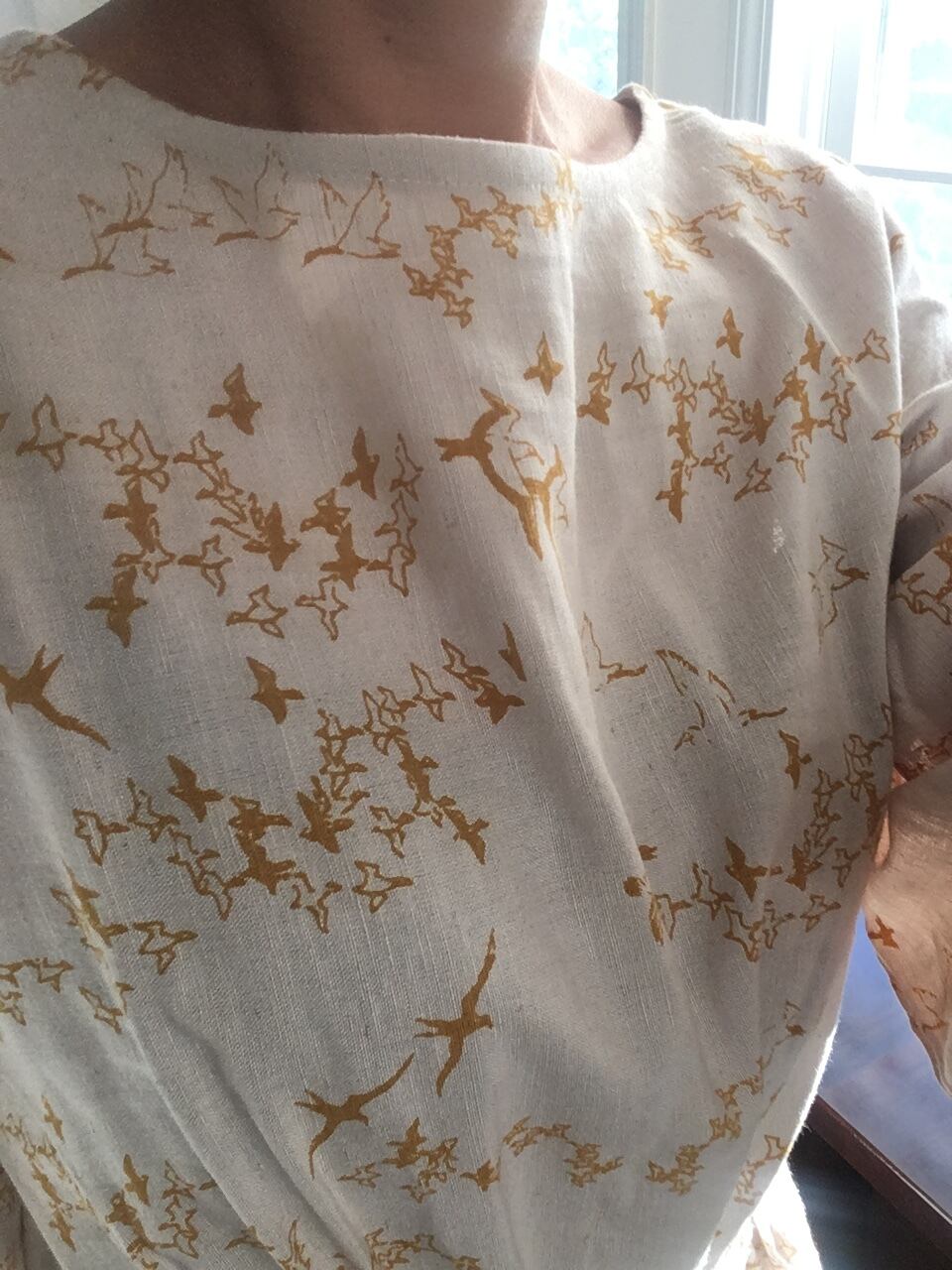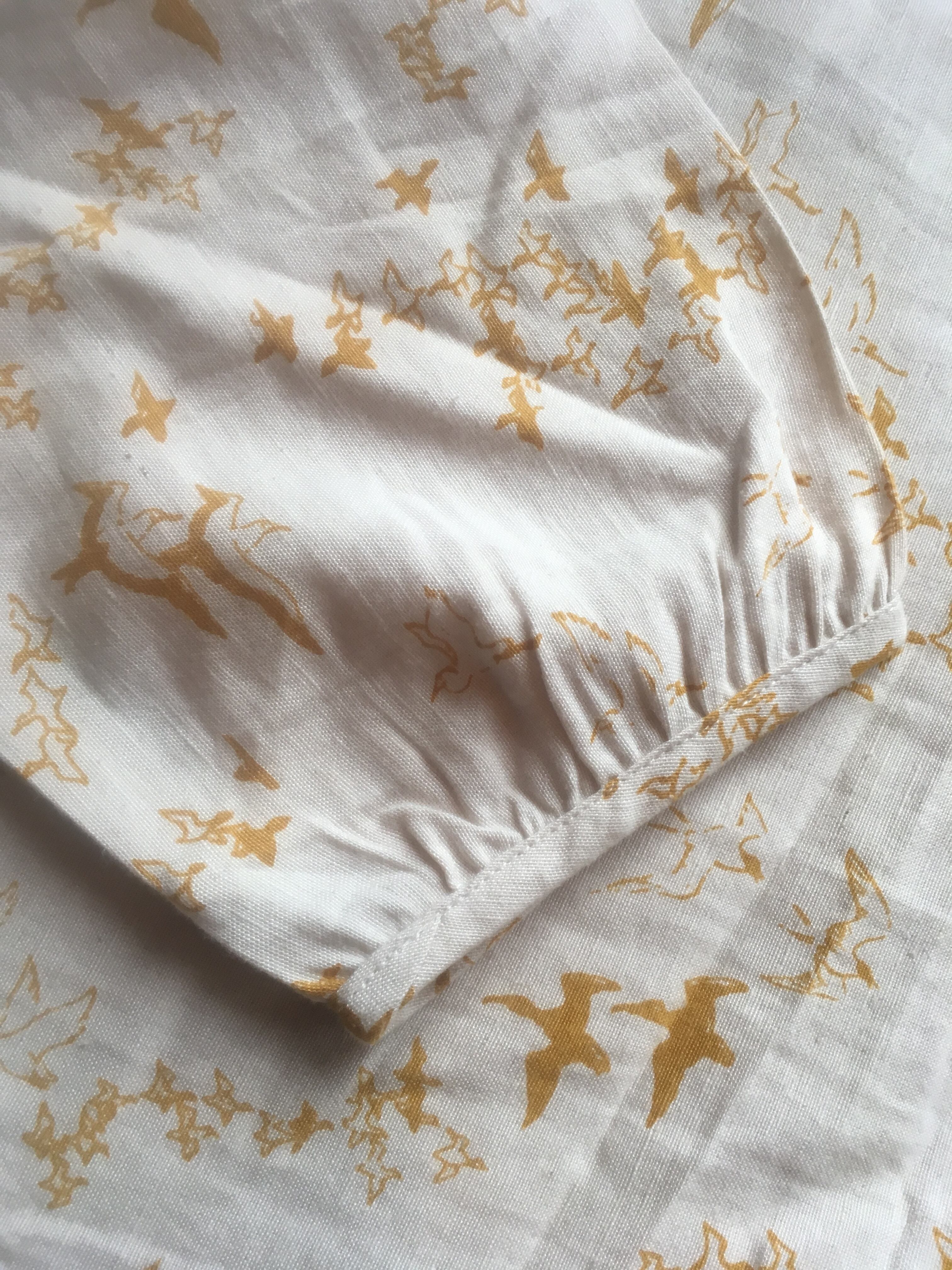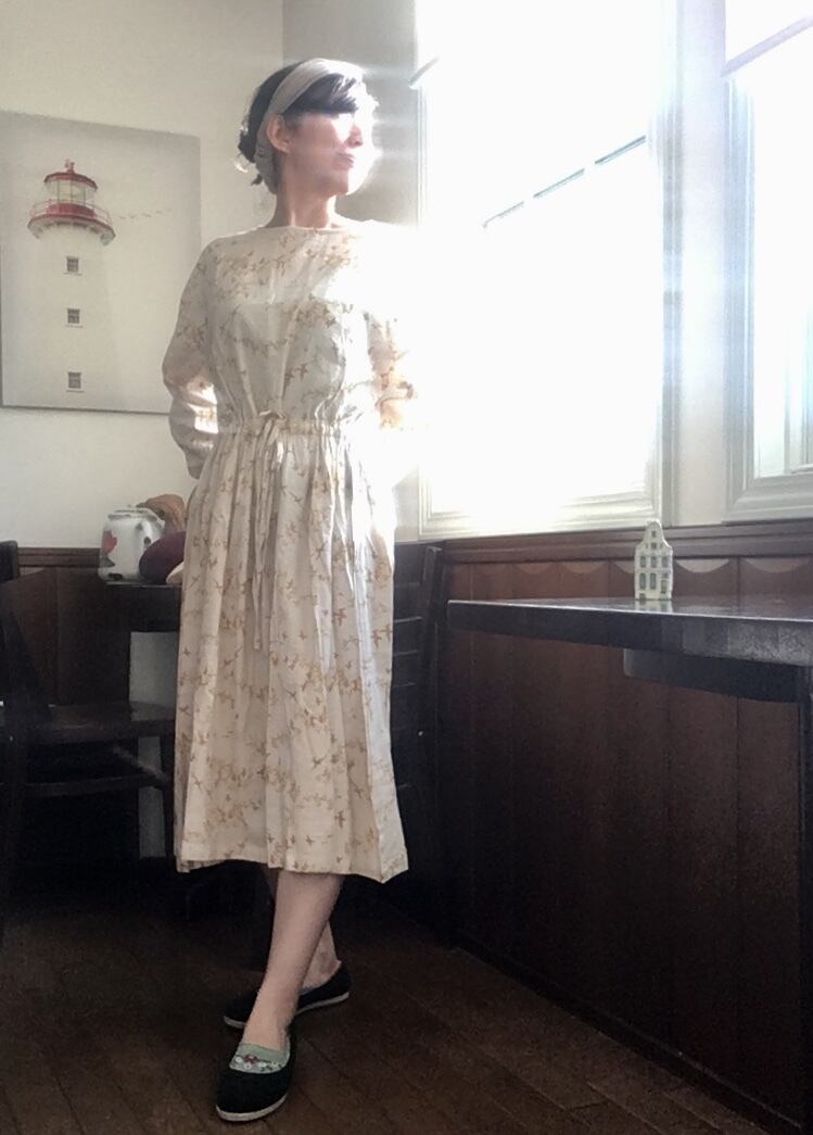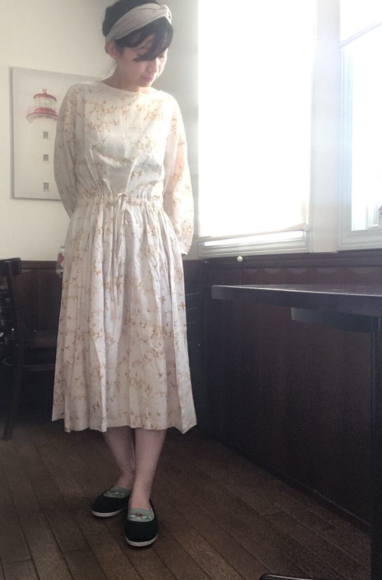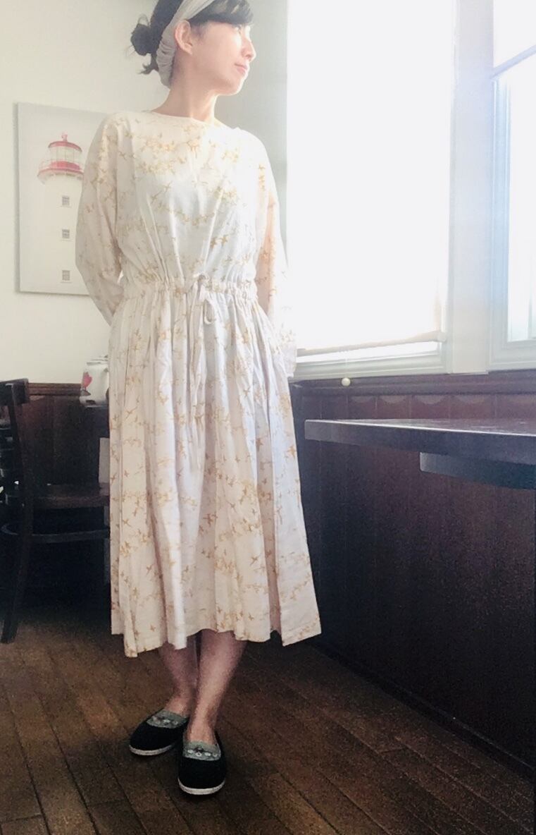 空を羽ばたく鳥の群れが前面に描かれたワンピース。生成色の地にマスタードの鳥のシルエットのプリントがさりげなく、鳥好きさんはもちろん、そうでない方にもおすすめです。