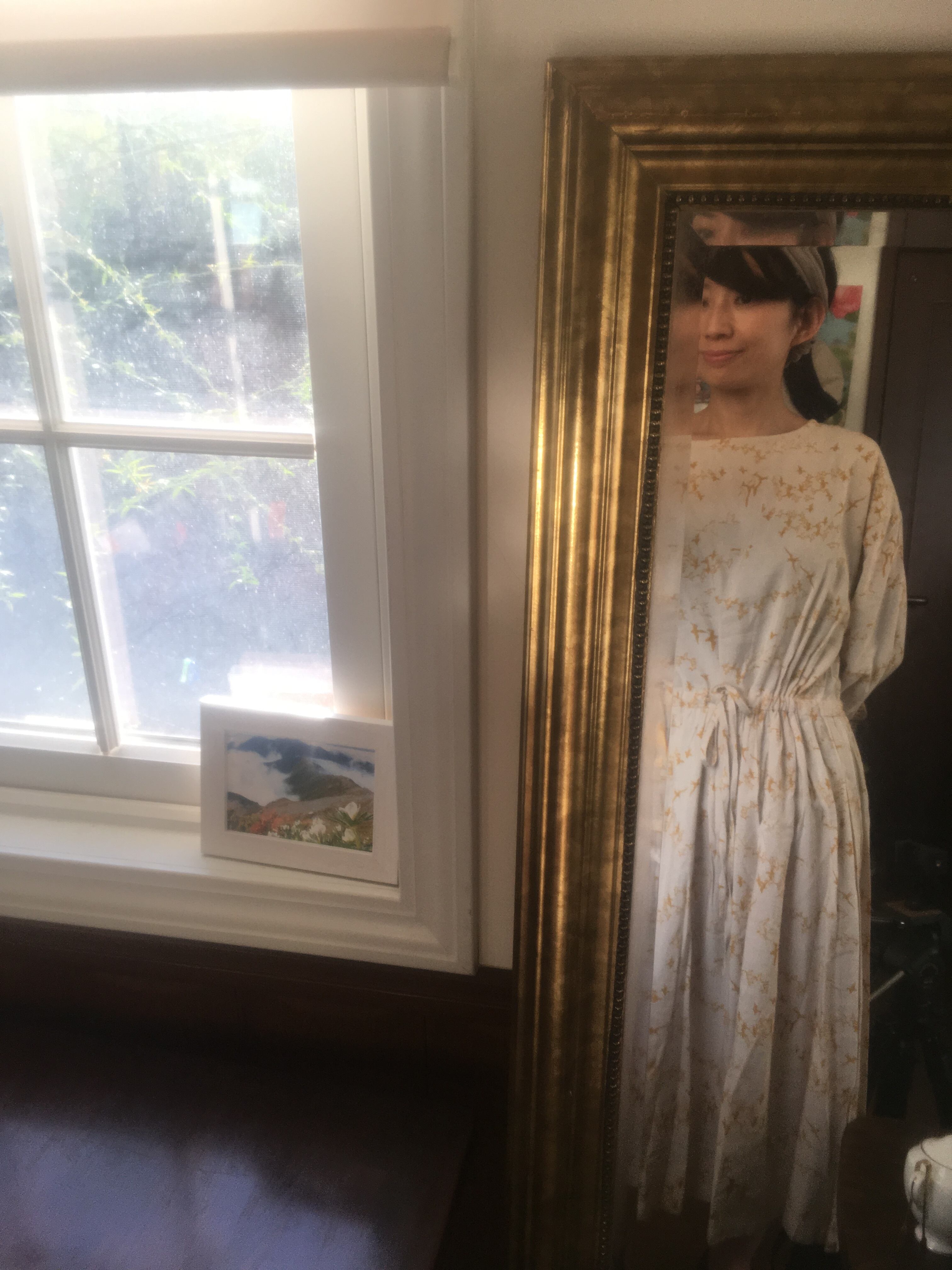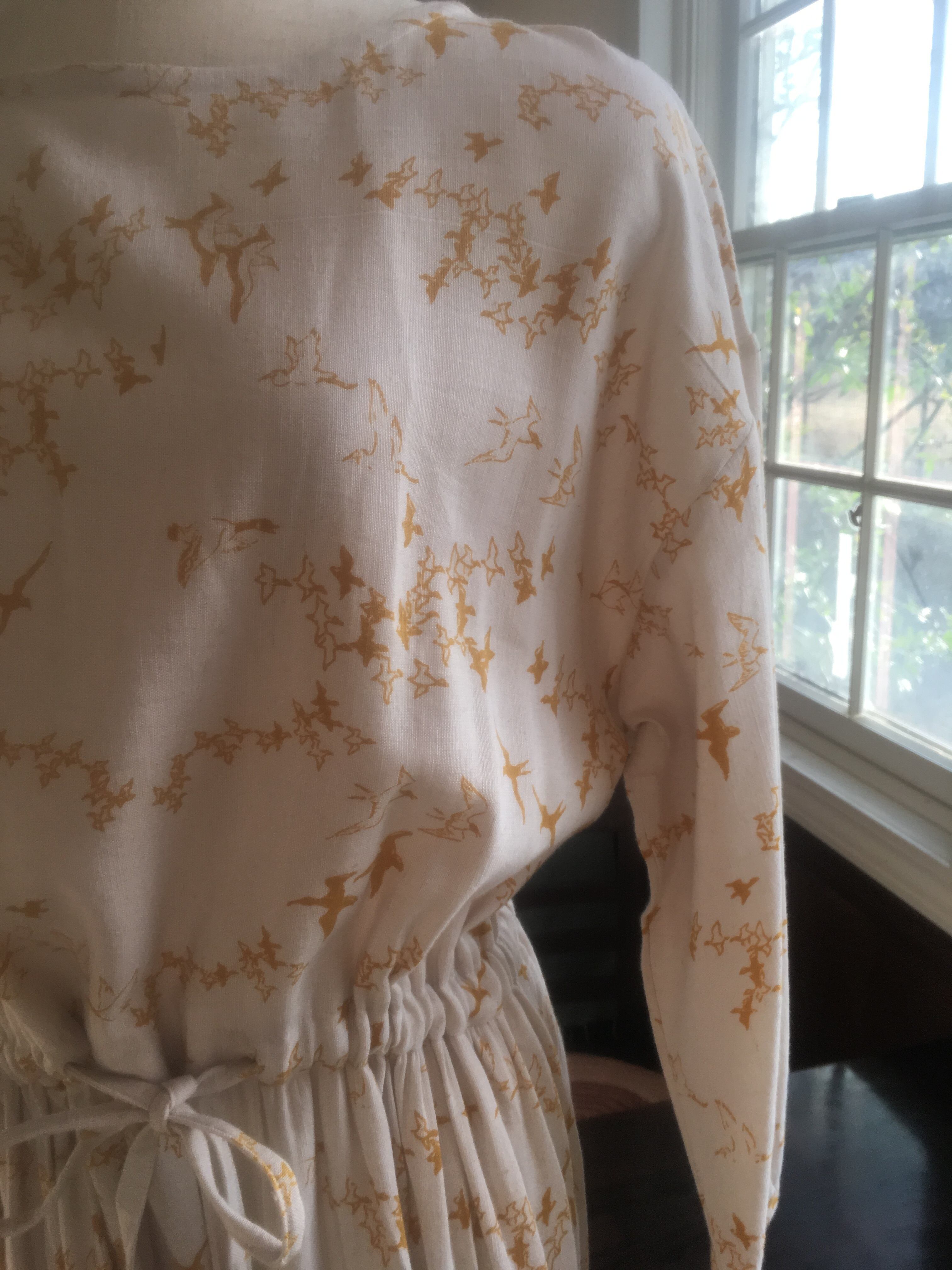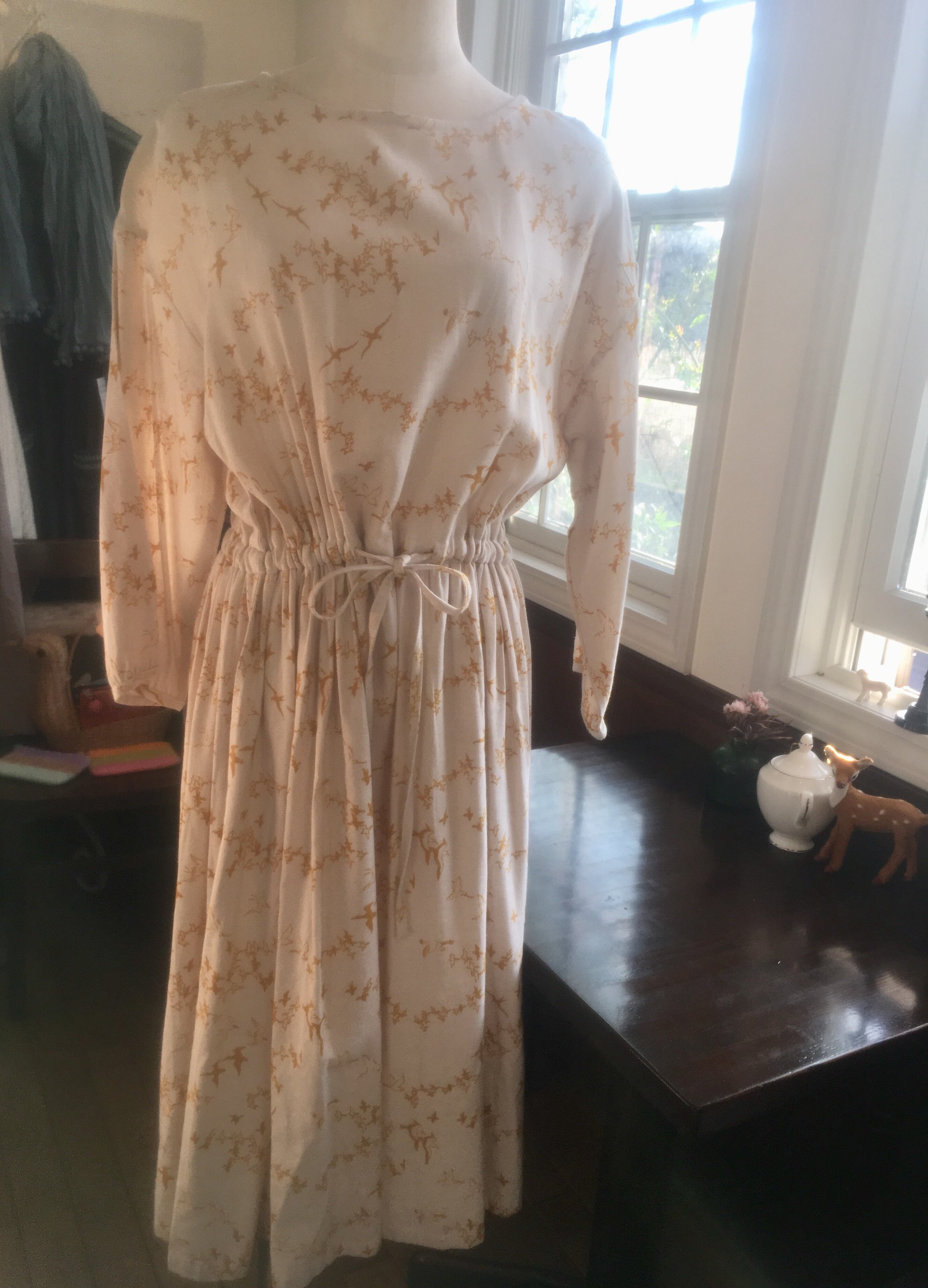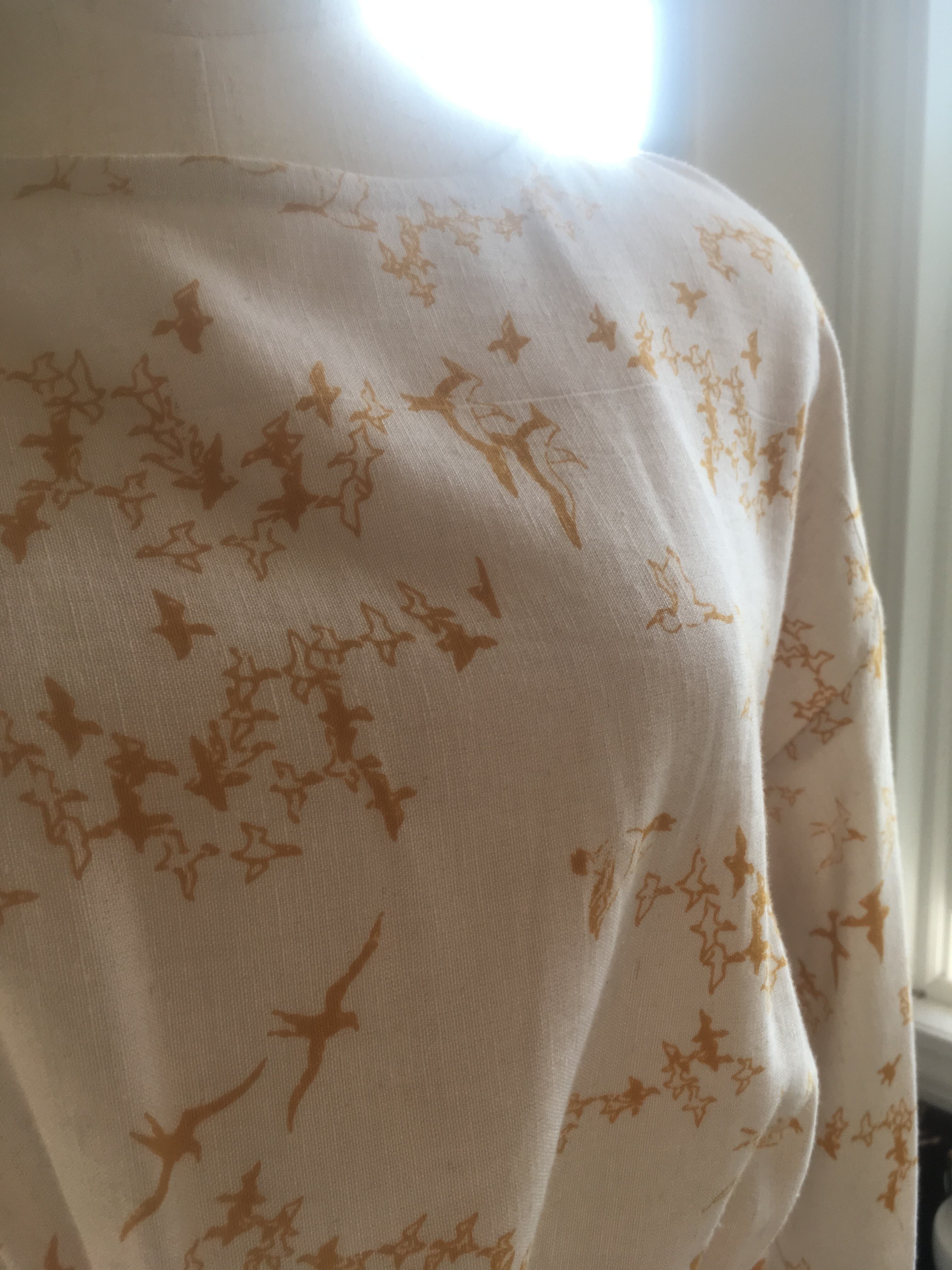 空を羽ばたく鳥の群れが前面に描かれたワンピース。生成色の地にマスタードの鳥のシルエットのプリントがさりげなく、鳥好きさんはもちろん、そうでない方にもおすすめです。