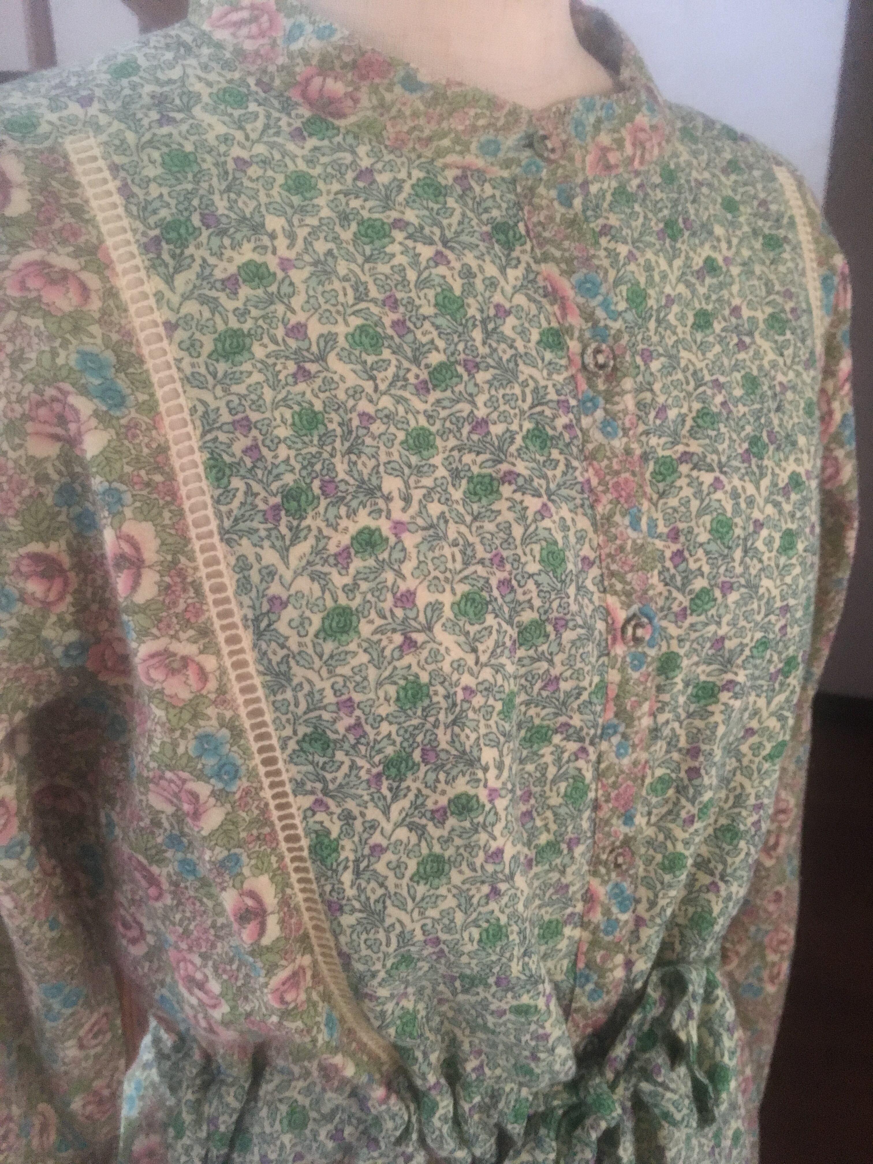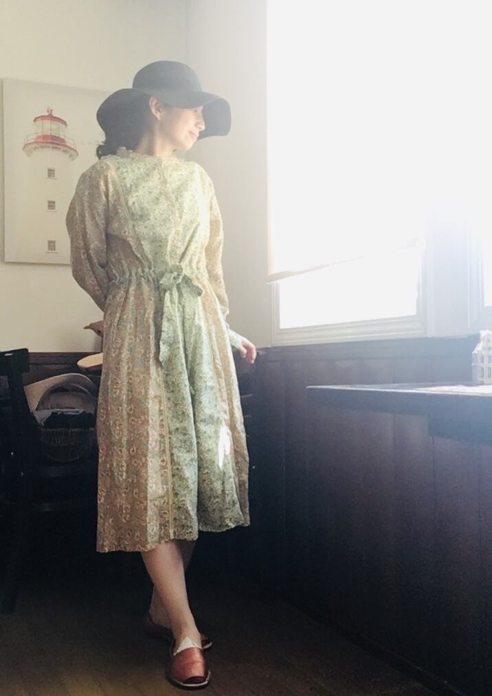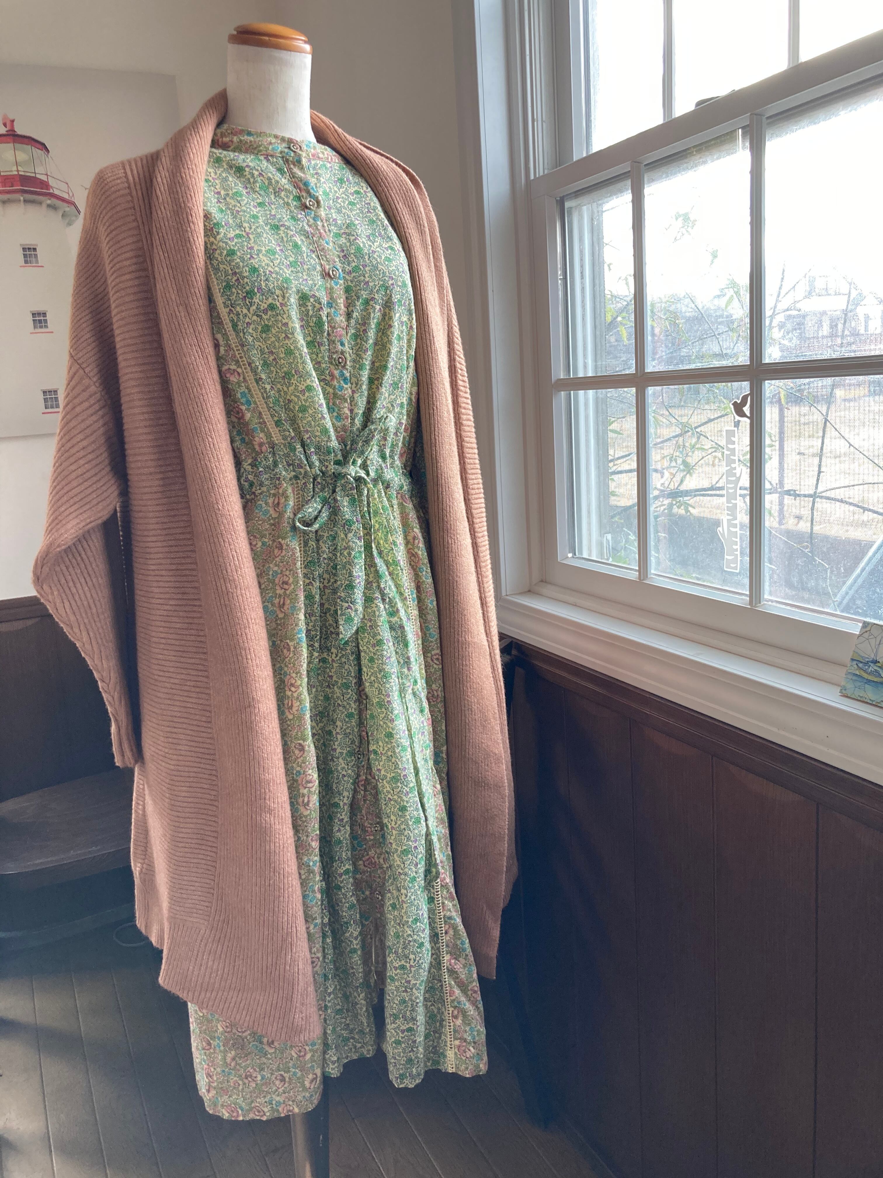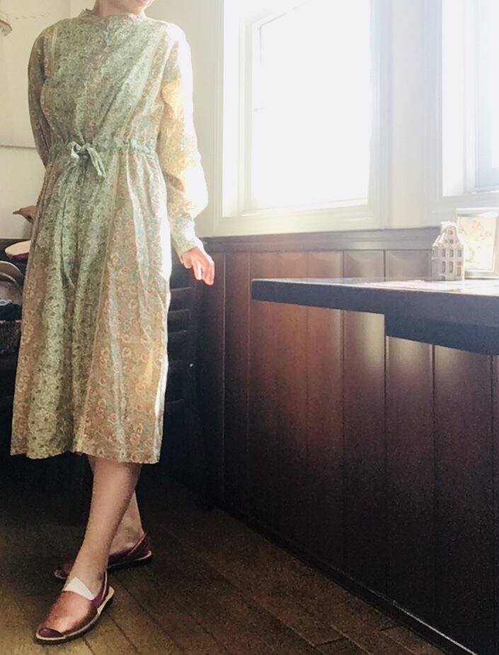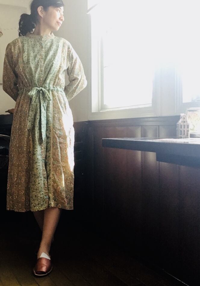 外国の物語に出てきそうな、ノスタルジックなワンピース。一面の小花もくすんだ色味が甘さ控えめで、品が漂います。バンドカラーの襟元も凛とした印象を引き立て、背筋を伸ばして着たくなります。ウエストはひもで調節可能。くるみボタンやはしごレースなど、ディテールにも細やかな工夫が見られます。