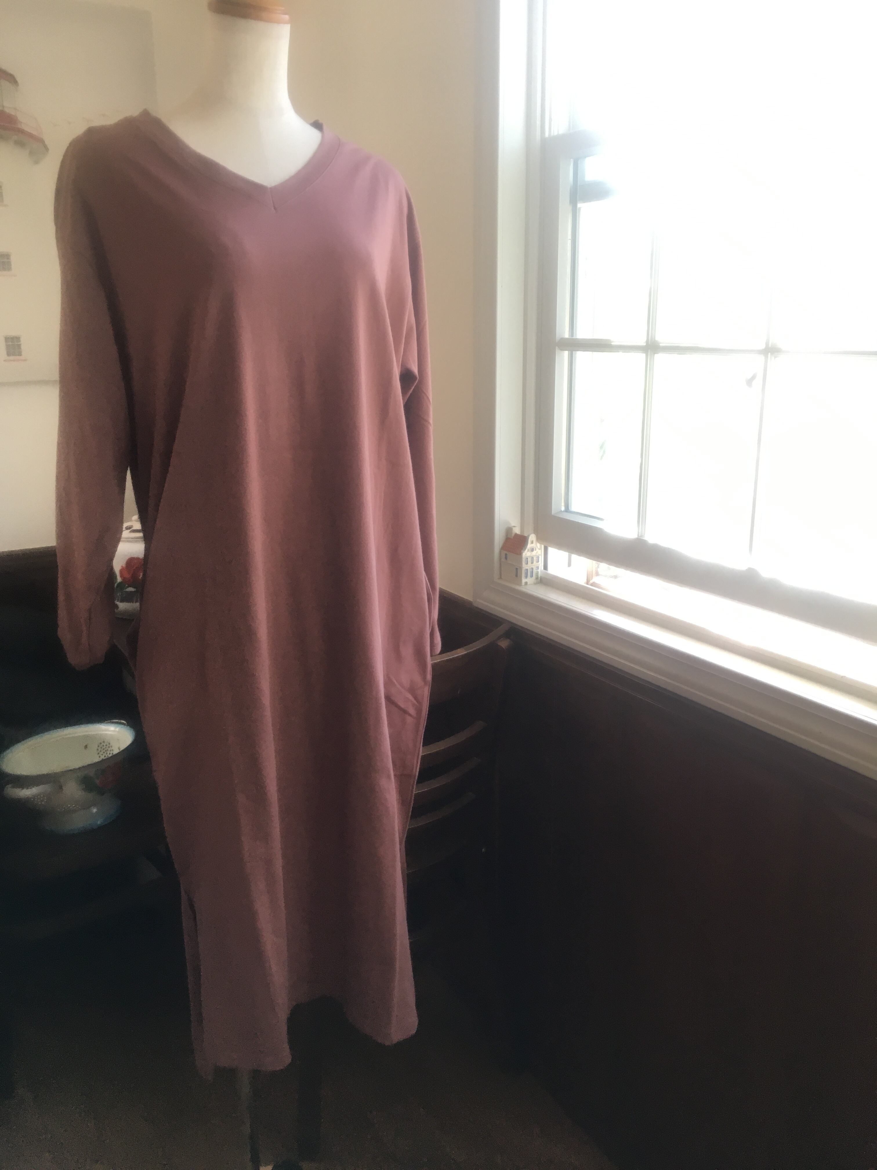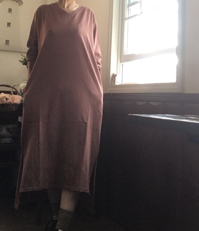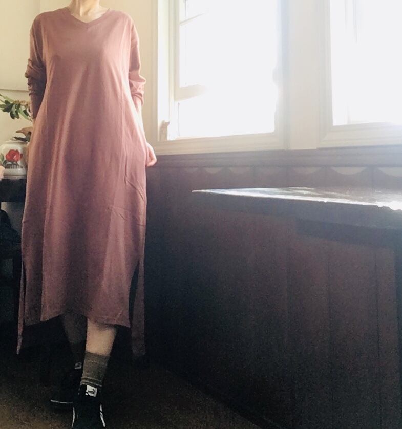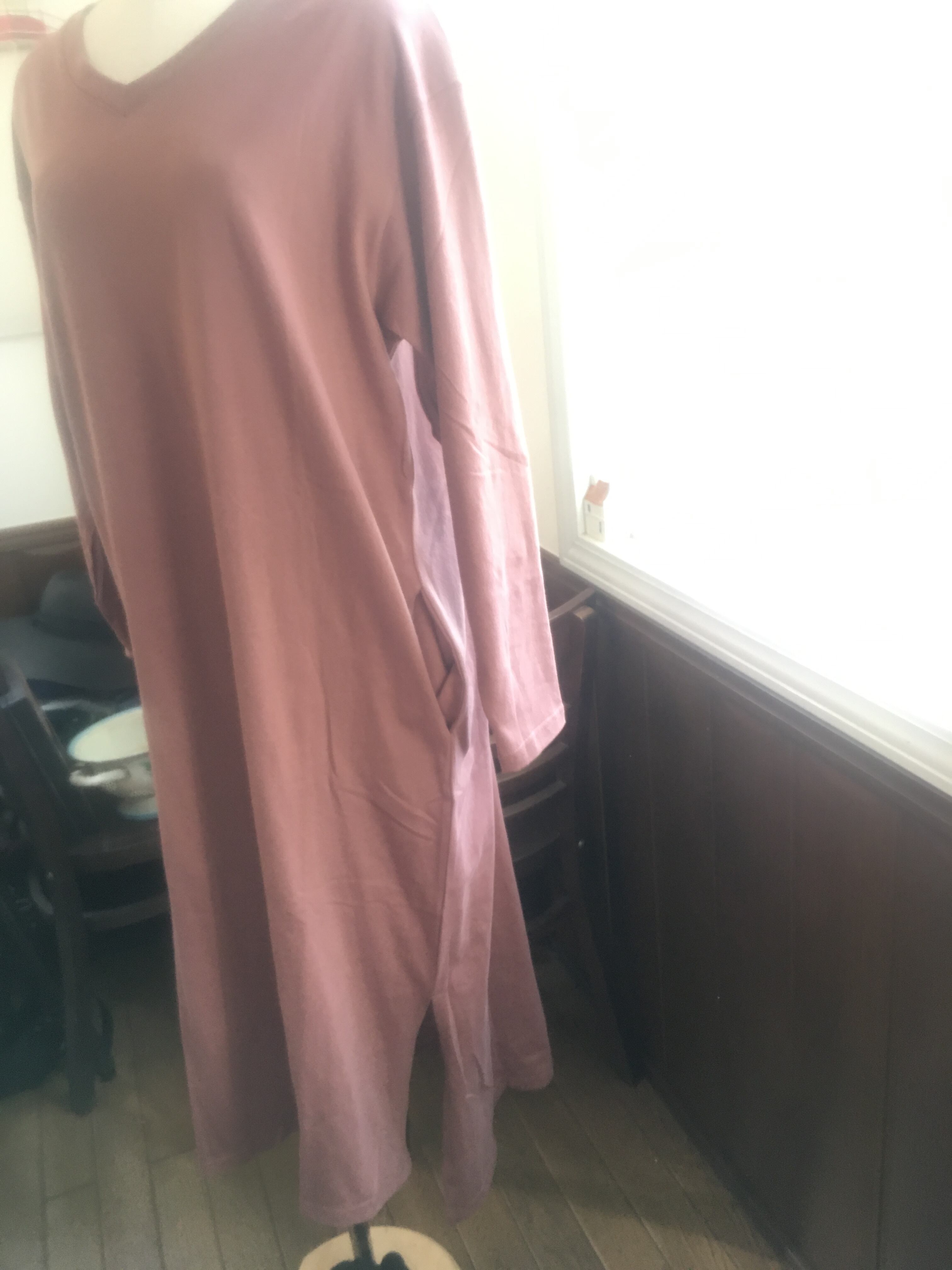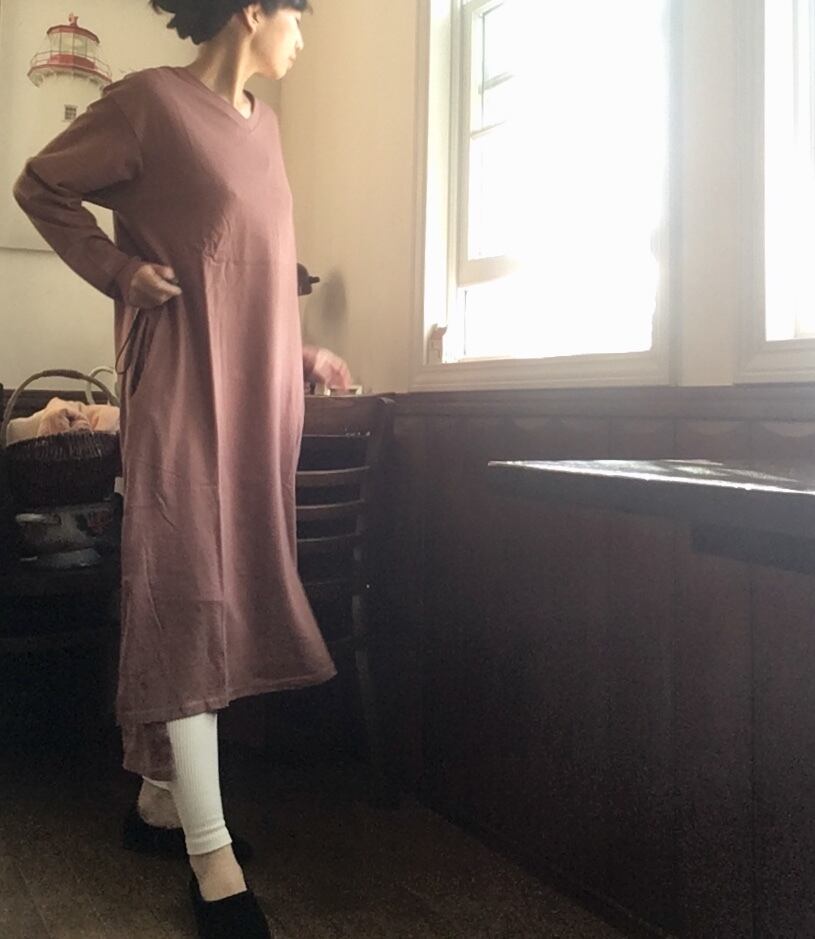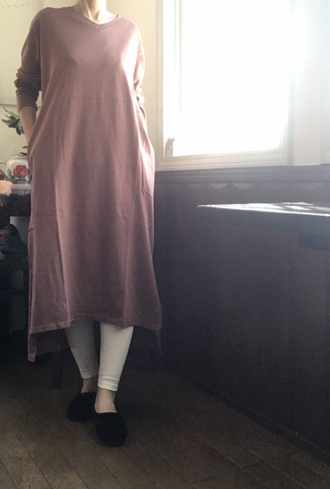 裾とスリットが動きをもたせてくれるので、一枚で着ても女性らしさもありつつ、かっこよくきまります。レギンスやパンツ、ロングスカートともコーディネートしやすく、サイドのポケット付きで大活躍してくれそうなワンピースです。