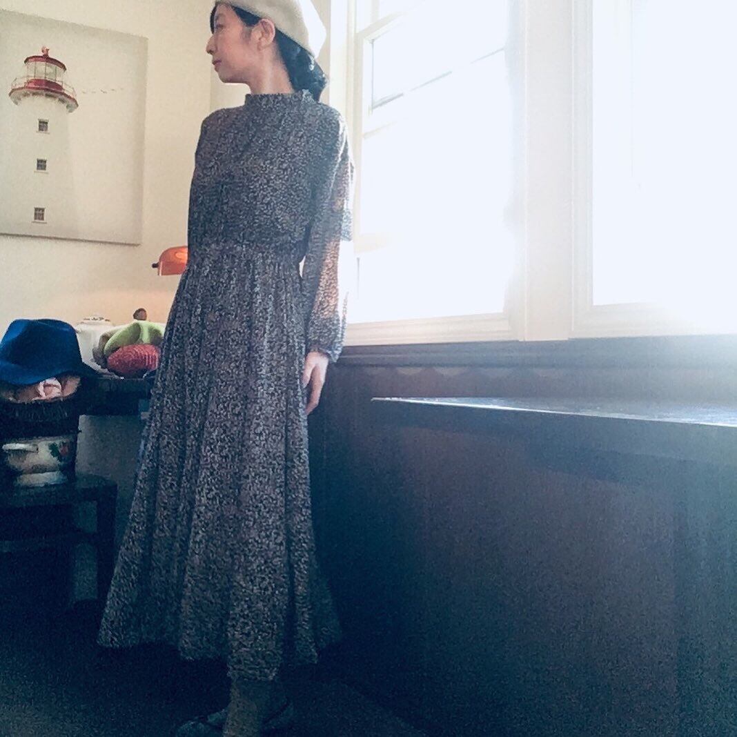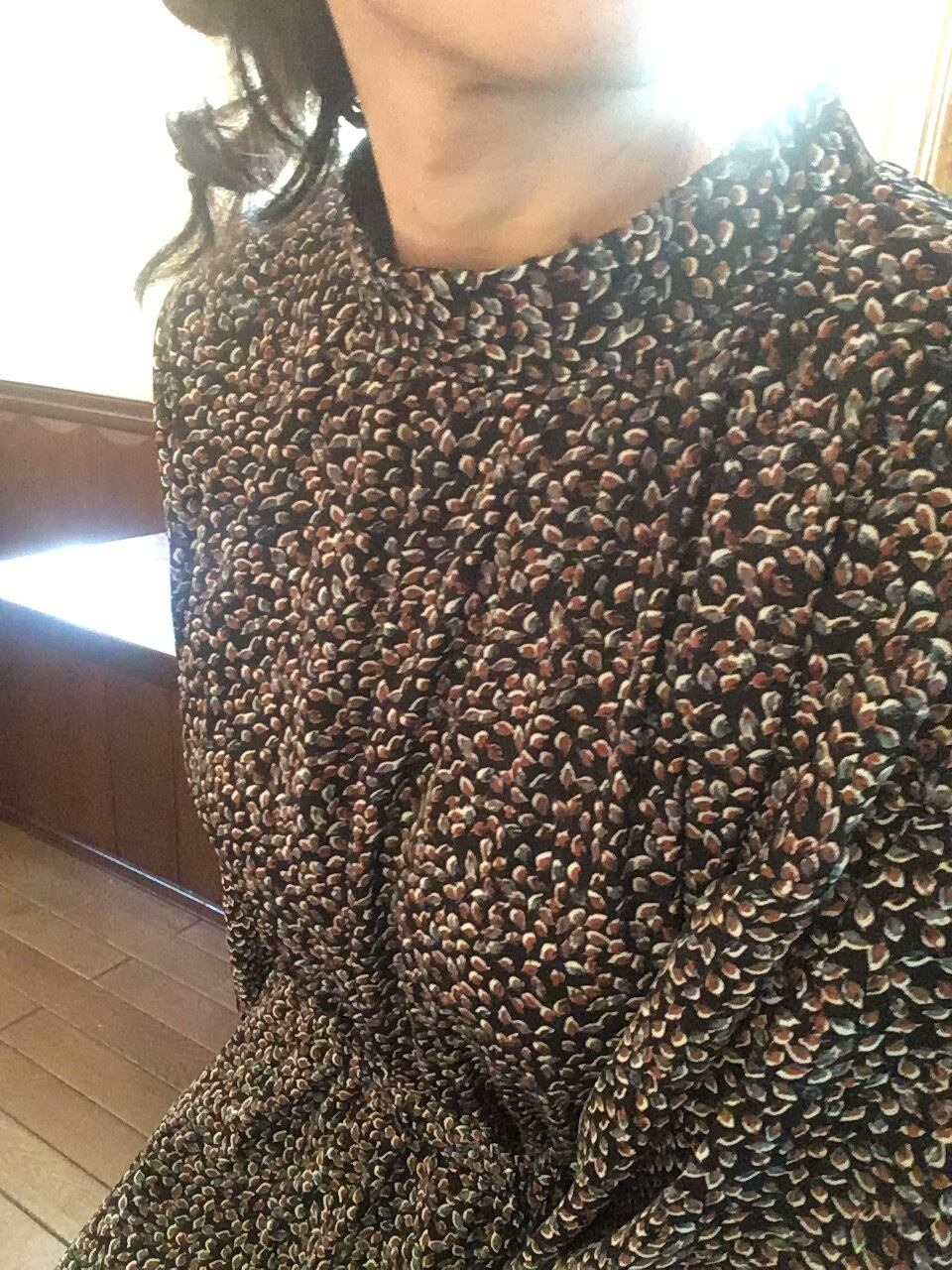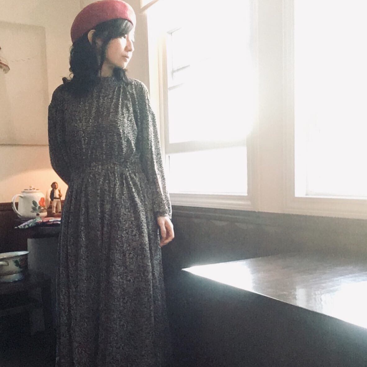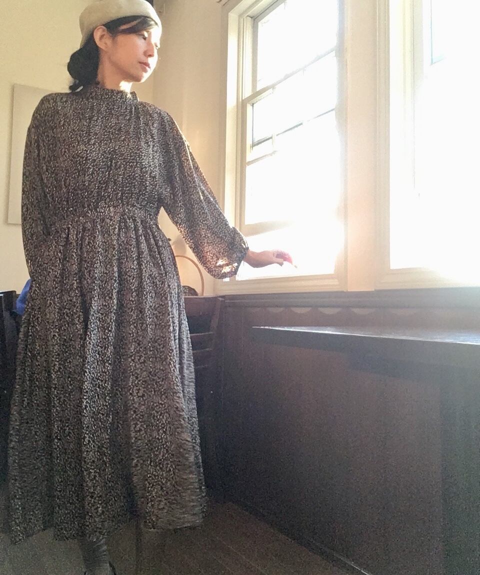 ヴィンテージ感漂うレトロなシルエットがレディライクなワンピース。枯葉のような落ち葉のような、渋い色あいの木の葉模様のプリントは、離れて見るとドットのようで、レオパードのようにも見え、表情豊か。