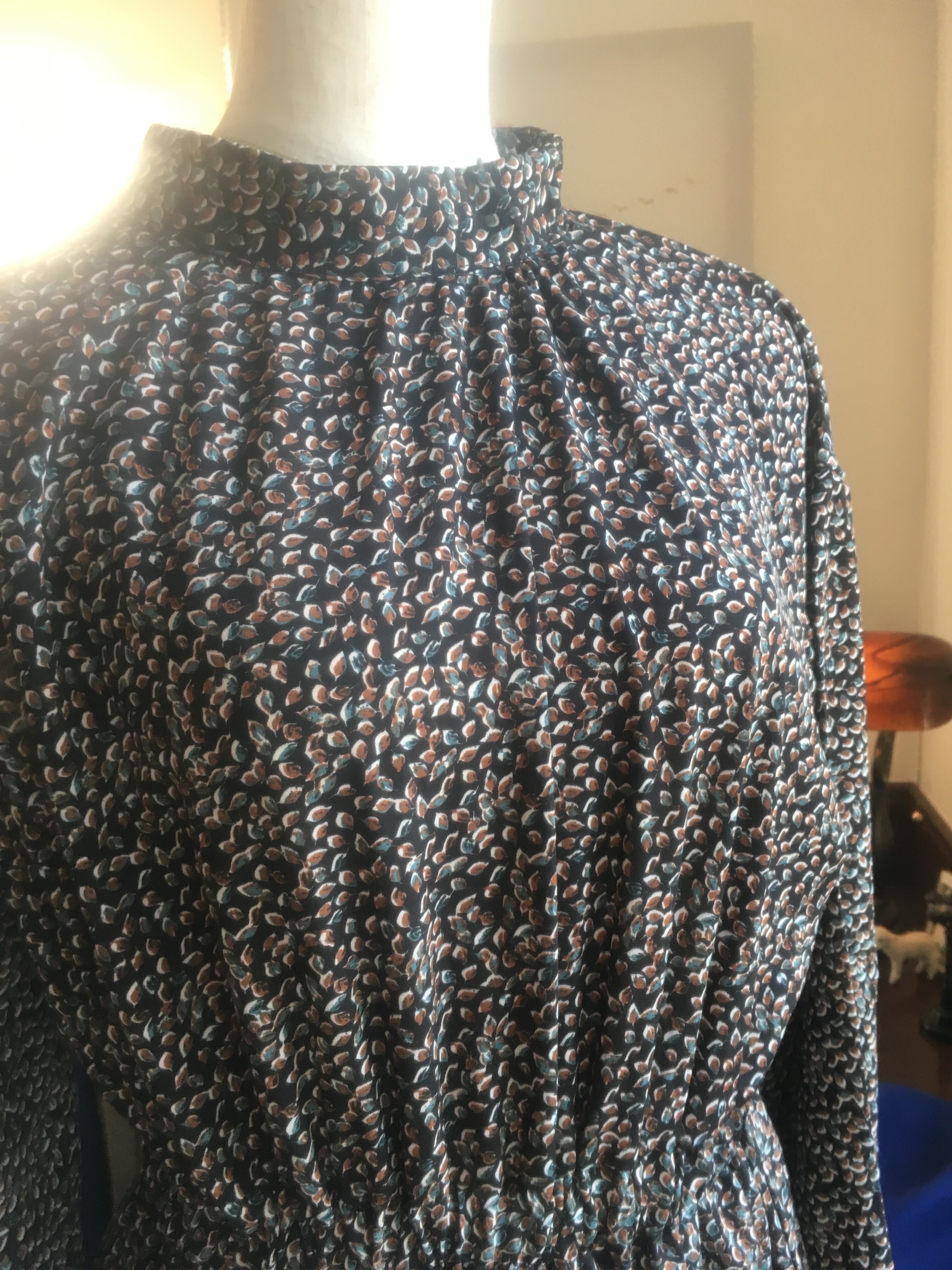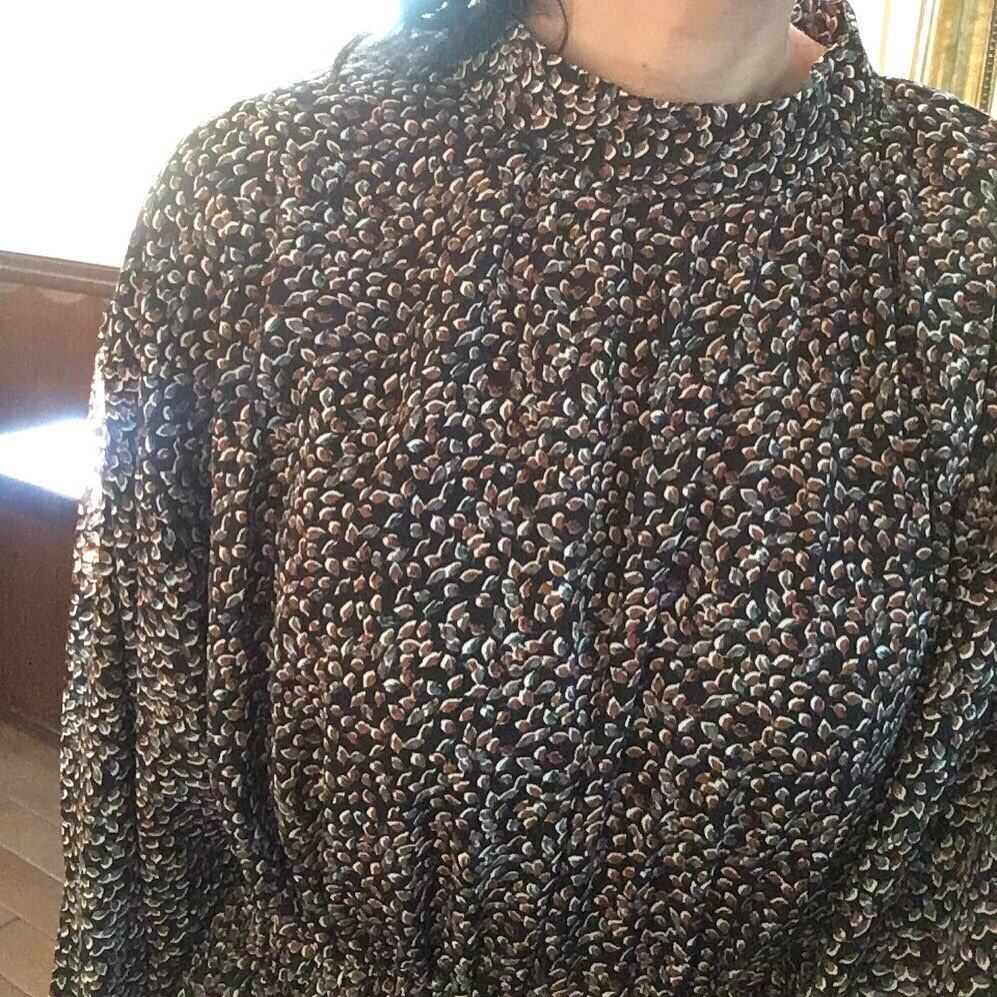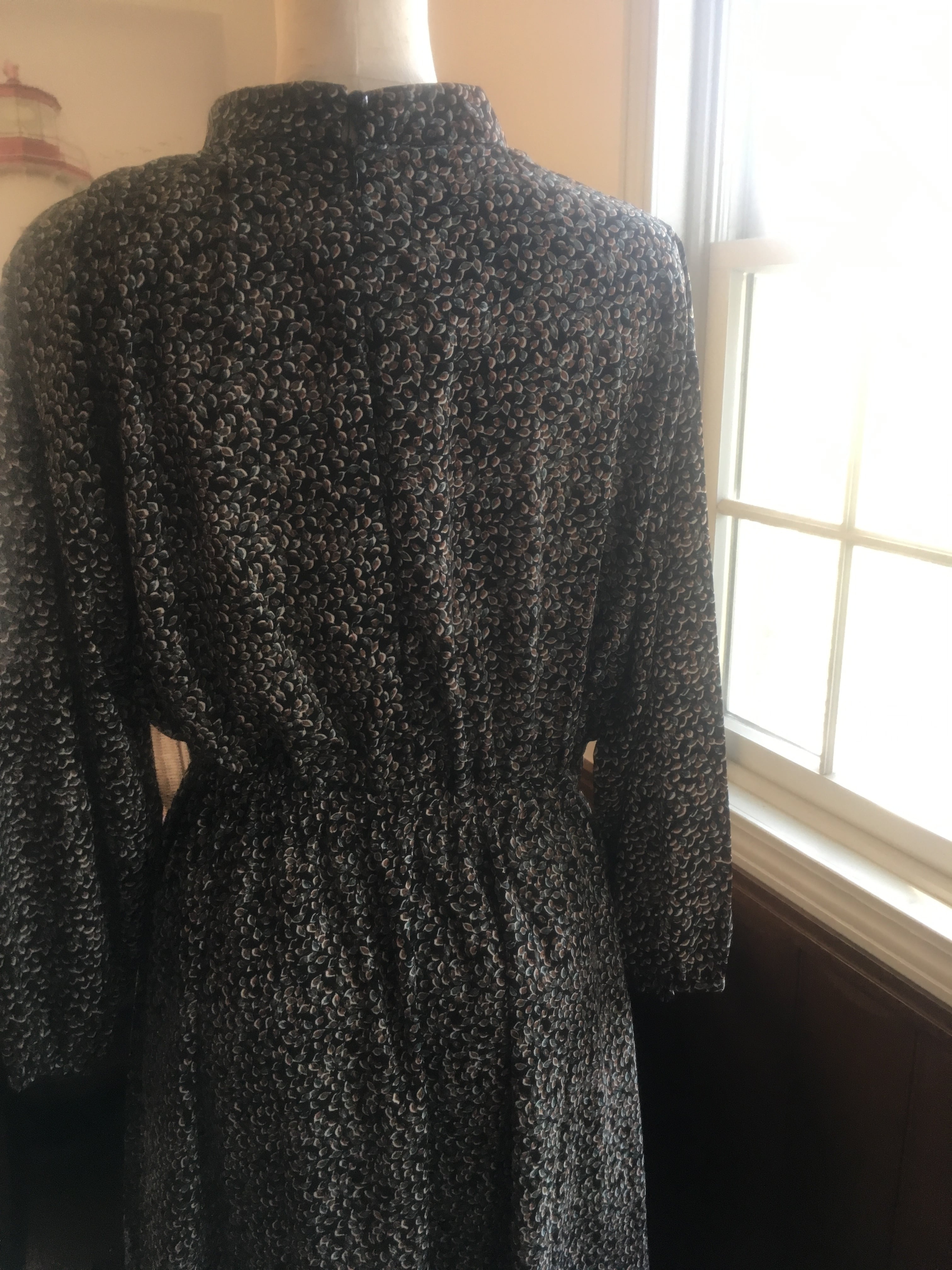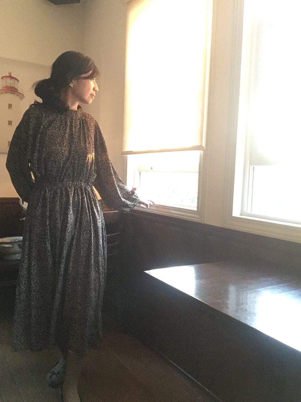 ヴィンテージ感漂うレトロなシルエットがレディライクなワンピース。枯葉のような落ち葉のような、渋い色あいの木の葉模様のプリントは、離れて見るとドットのようで、レオパードのようにも見え、表情豊か。