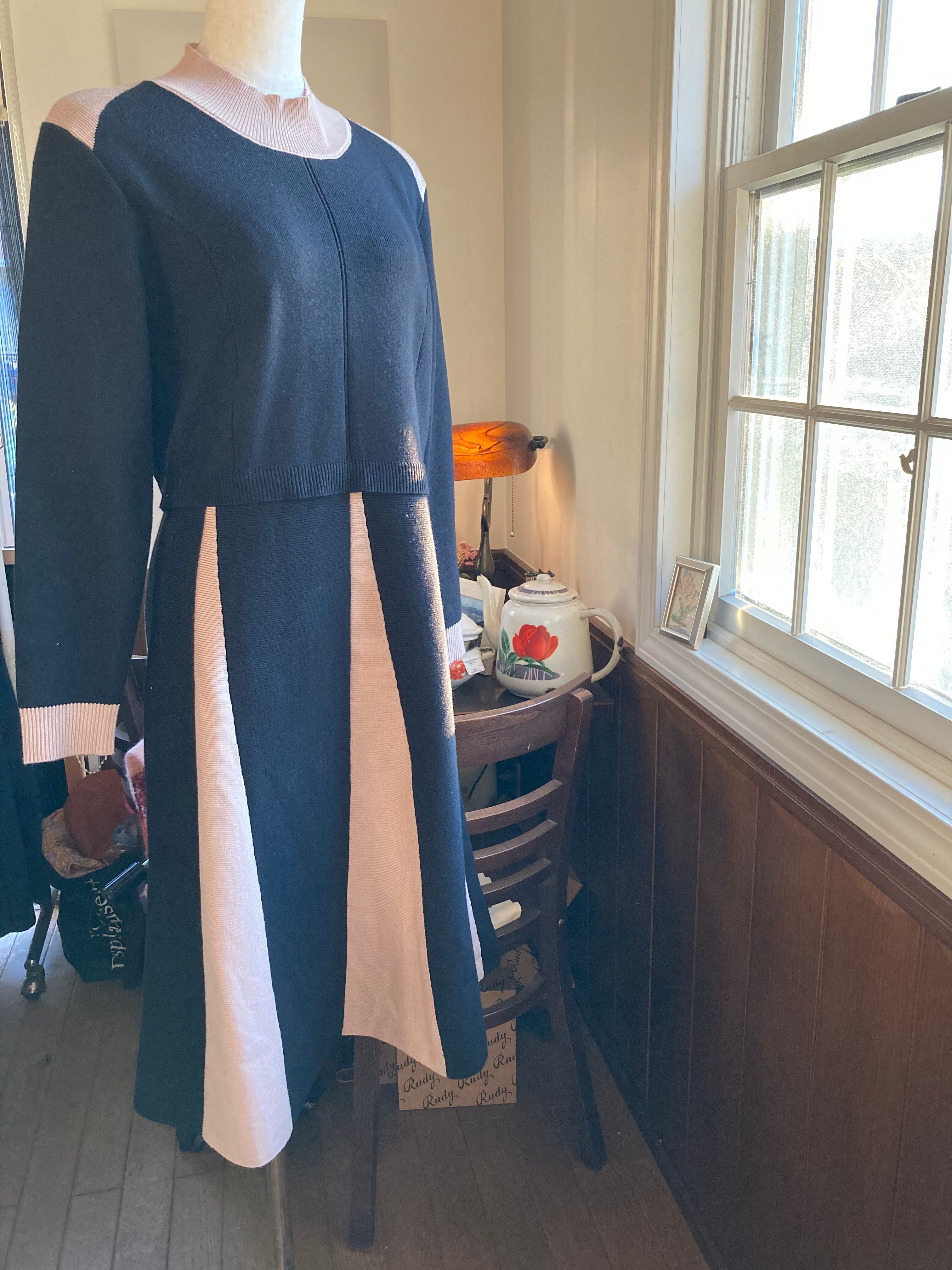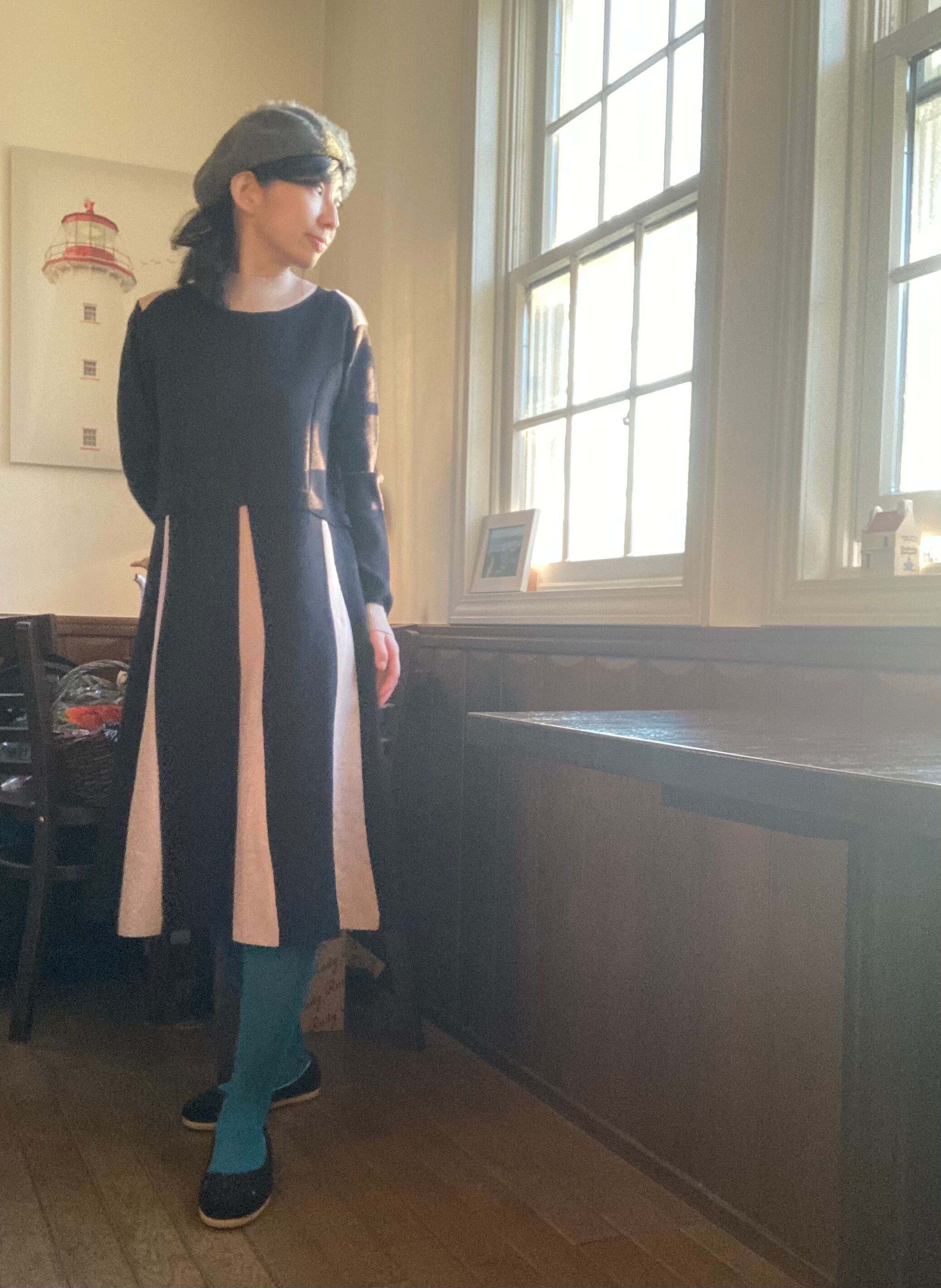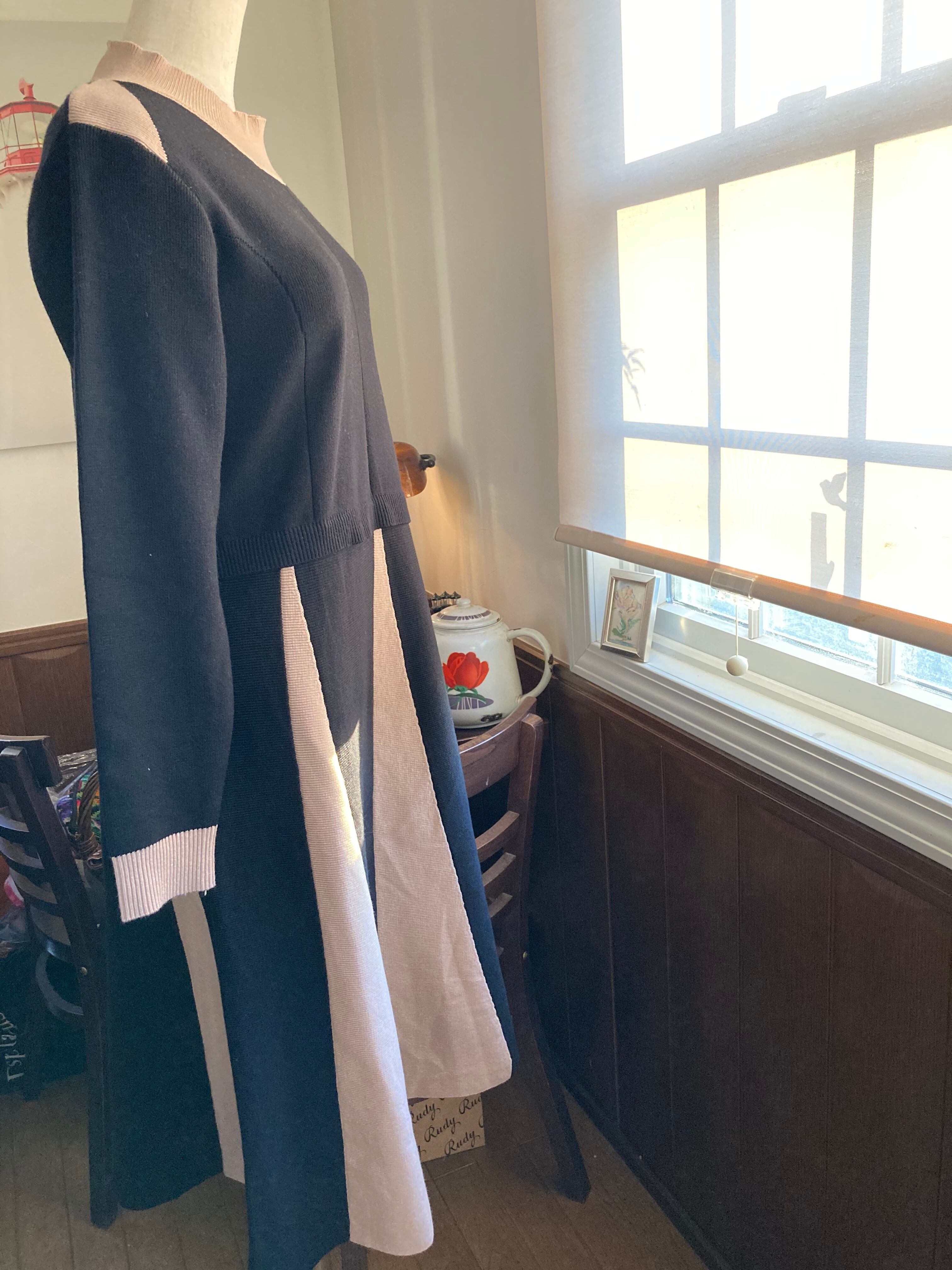 クラシカルで上品なニットワンピース。色のコントラストが視覚的にもメリハリを持たせ、ハイウエストの切替の脚長効果で、スタイルアップしてくれます。