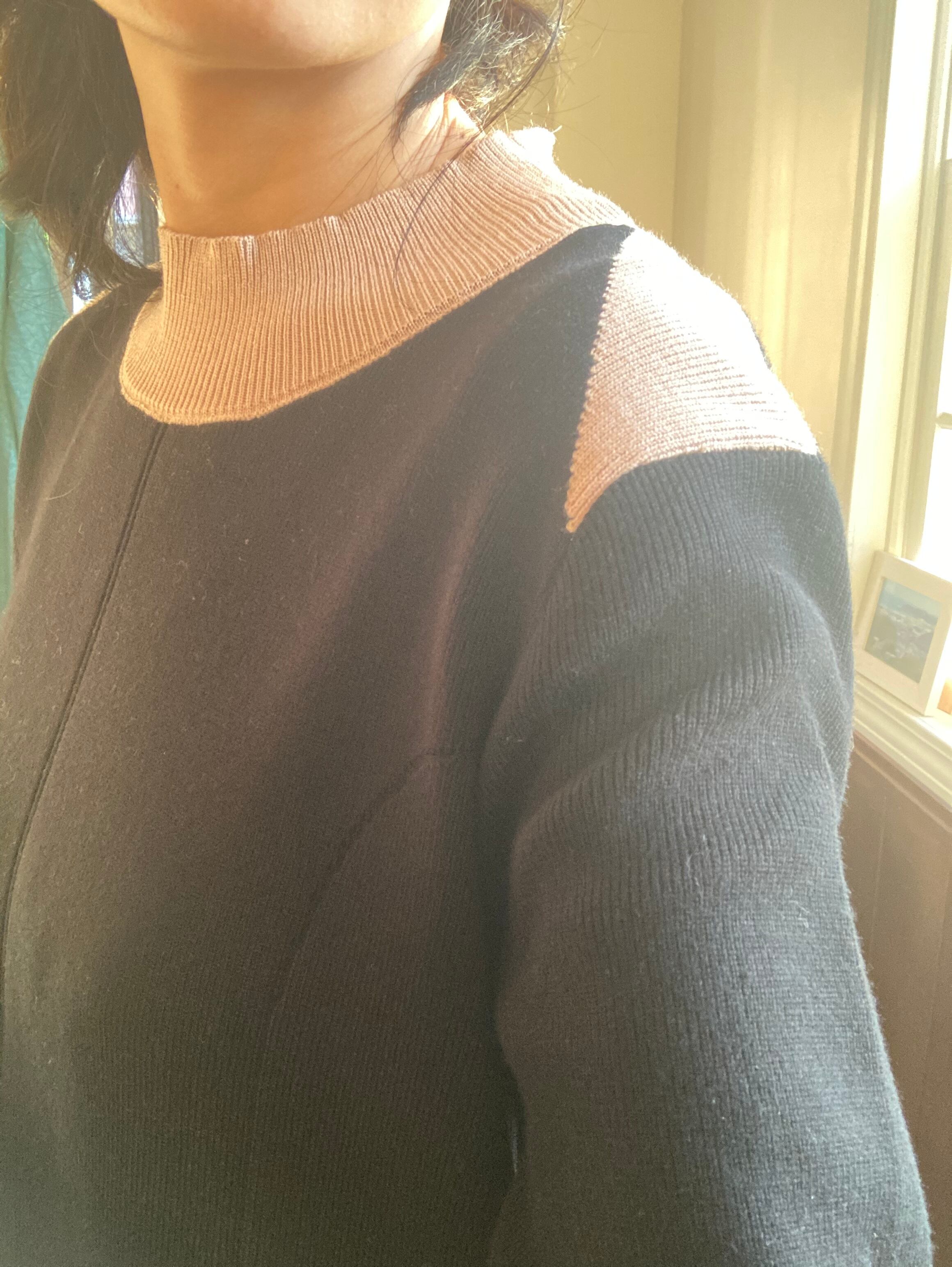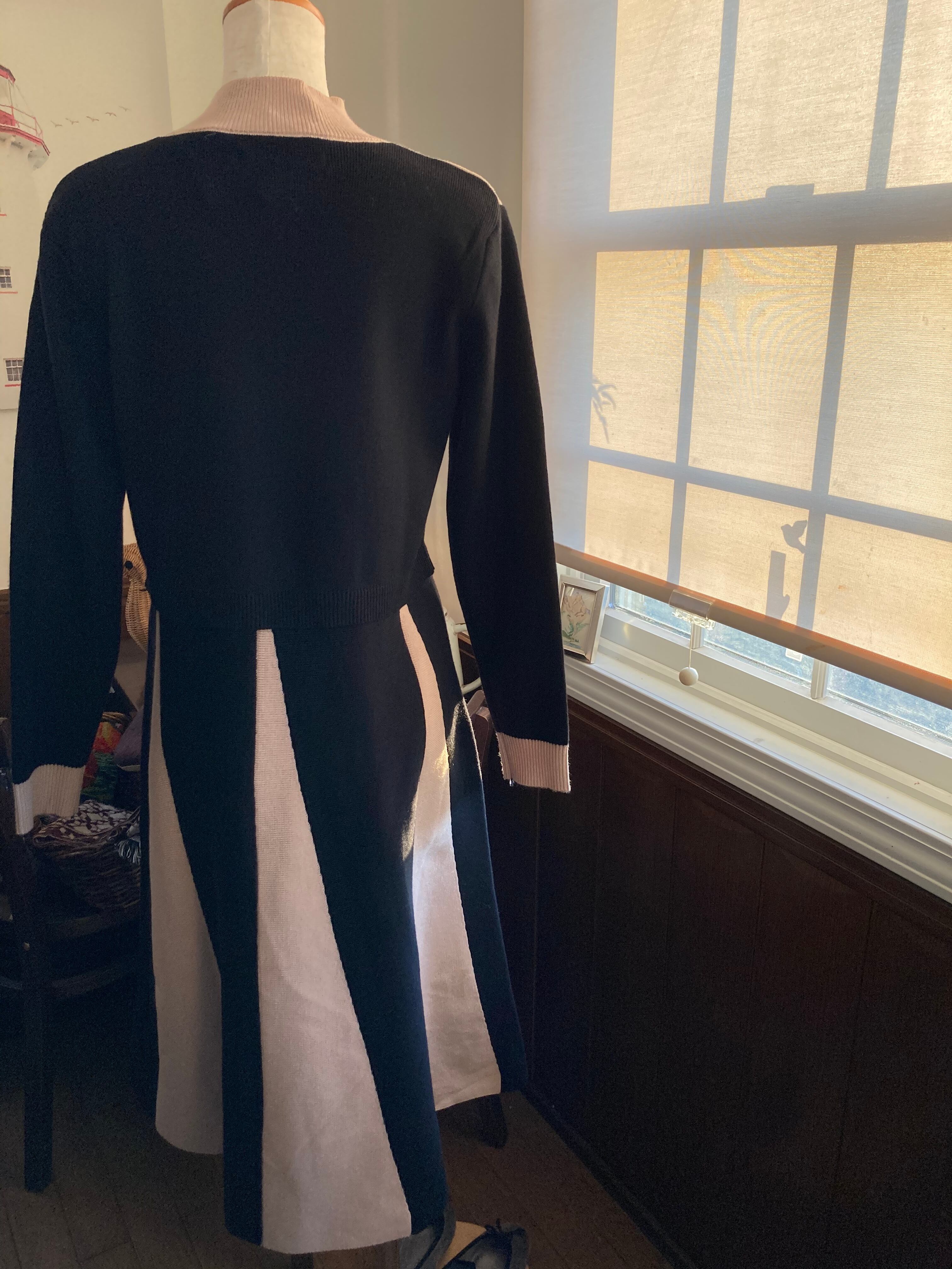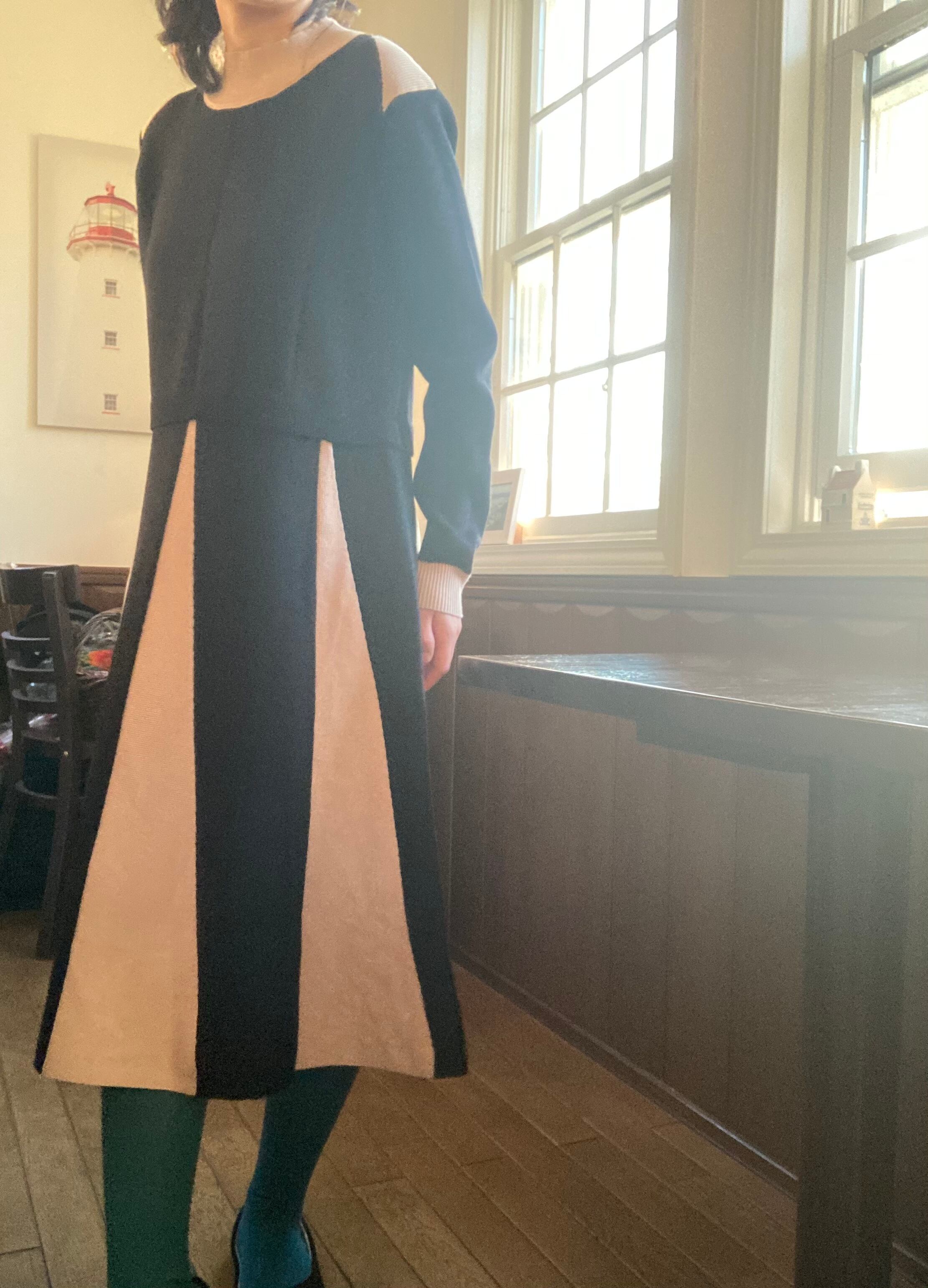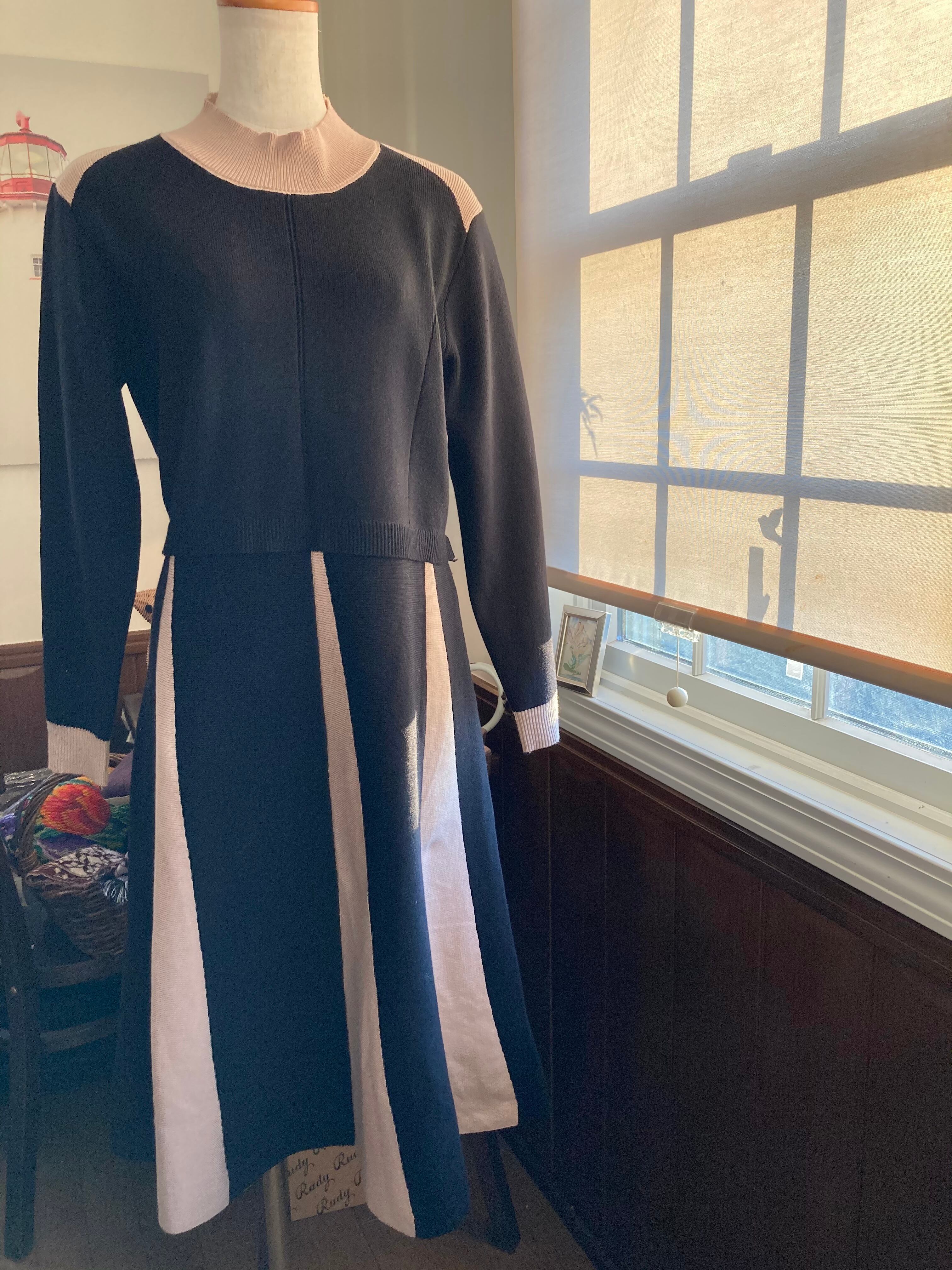 クラシカルで上品なニットワンピース。色のコントラストが視覚的にもメリハリを持たせ、ハイウエストの切替の脚長効果で、スタイルアップしてくれます。