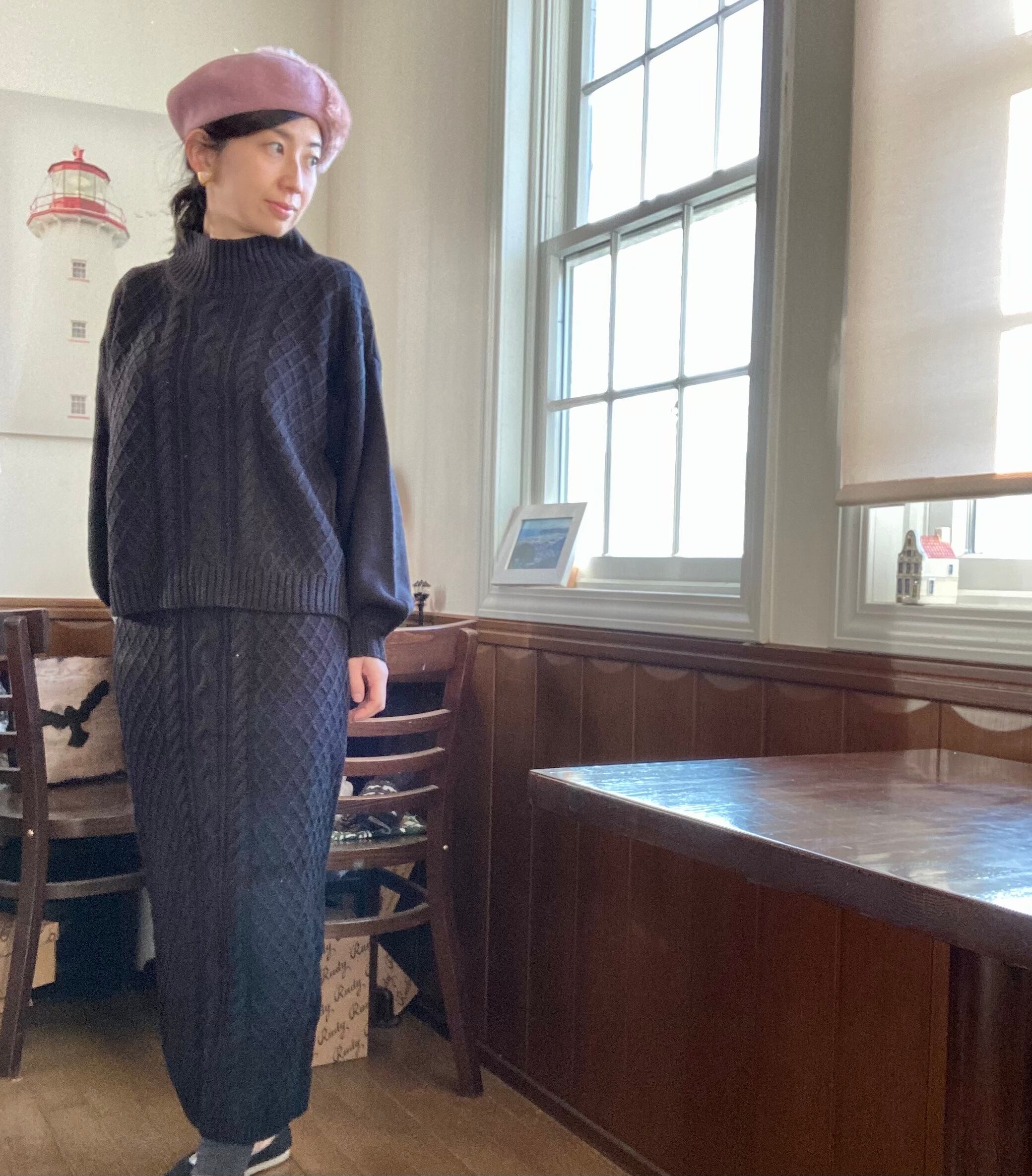ブラックはセットアップなら、ちょっとフォーマル感もありつつ、ニットなので楽ちんで、かしこまりすぎないのも良いところ。シンプルなので小物でアレンジすると、エレガントにもカジュアルにも自由自在。