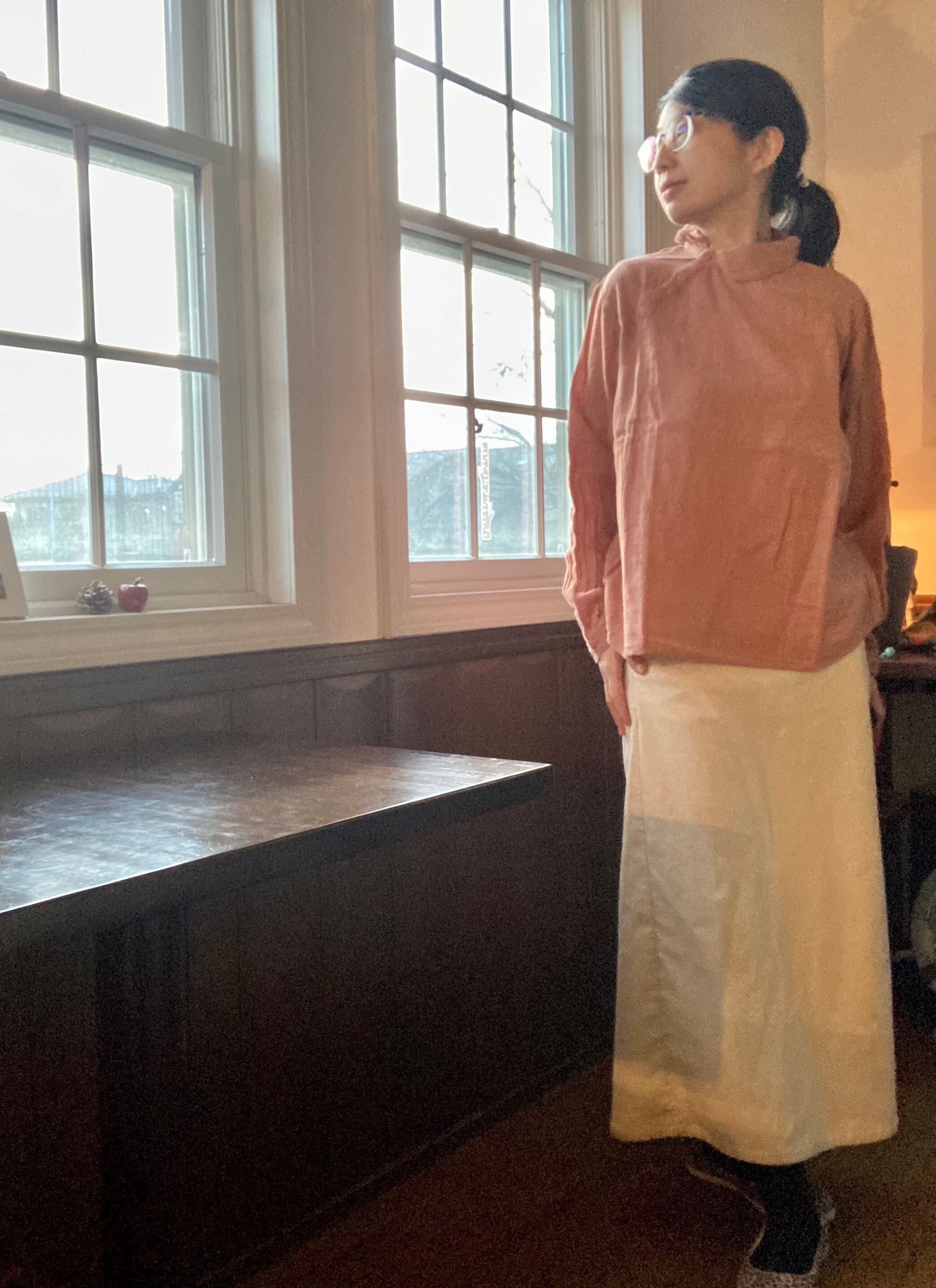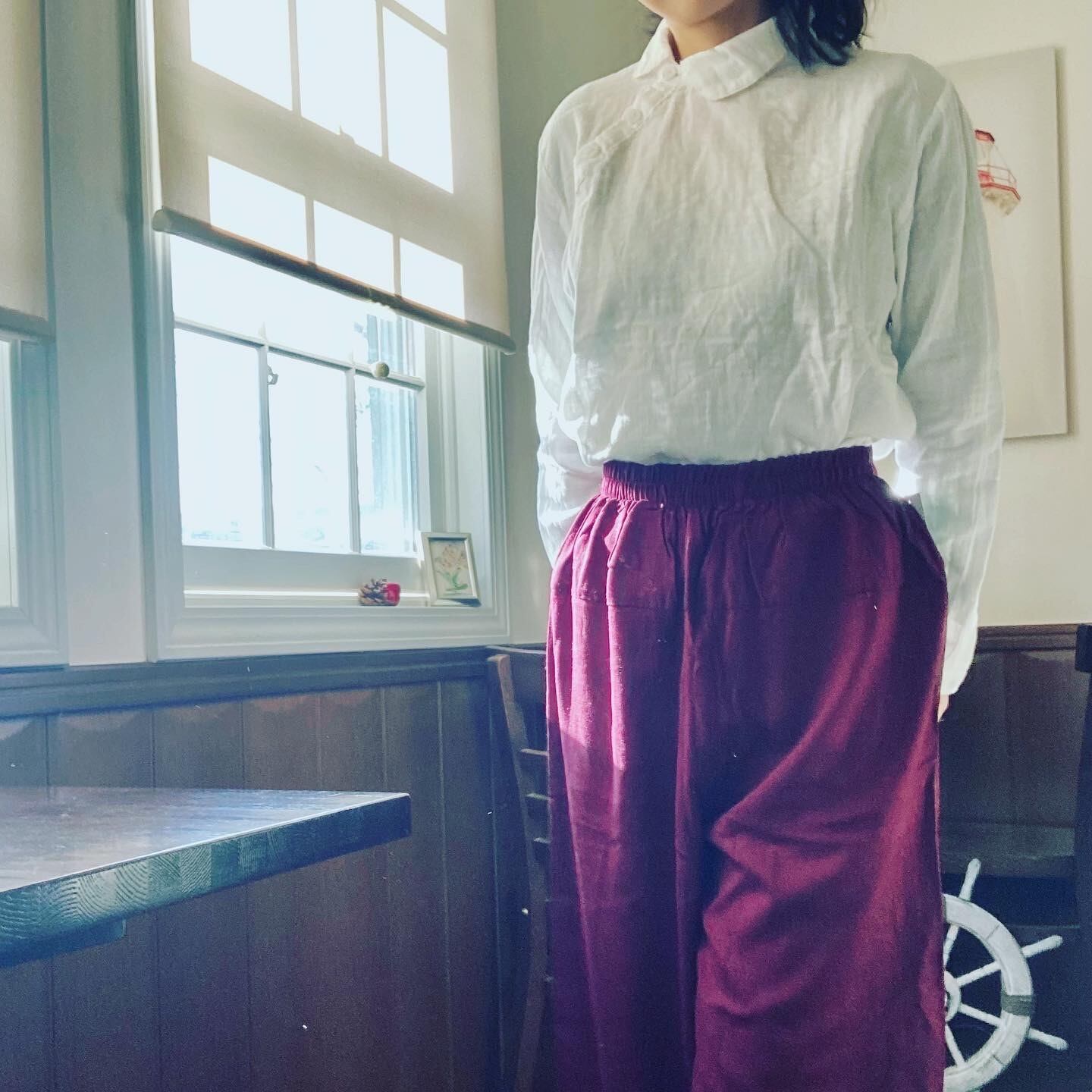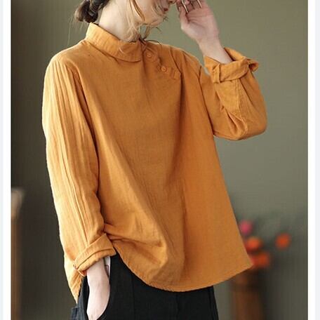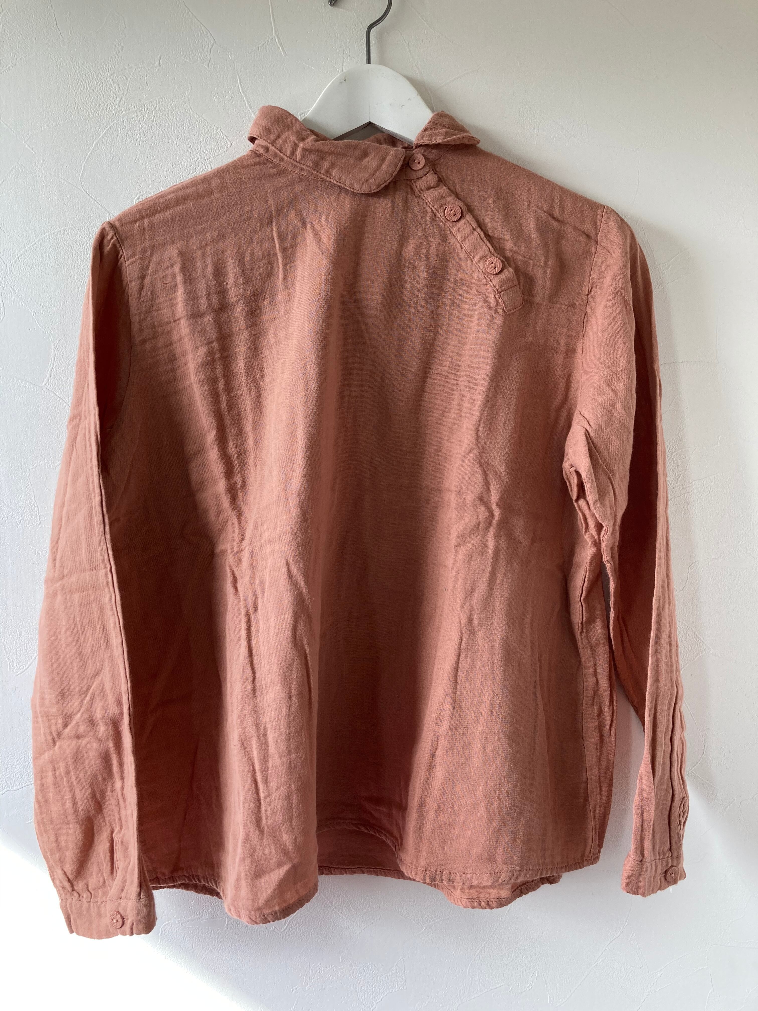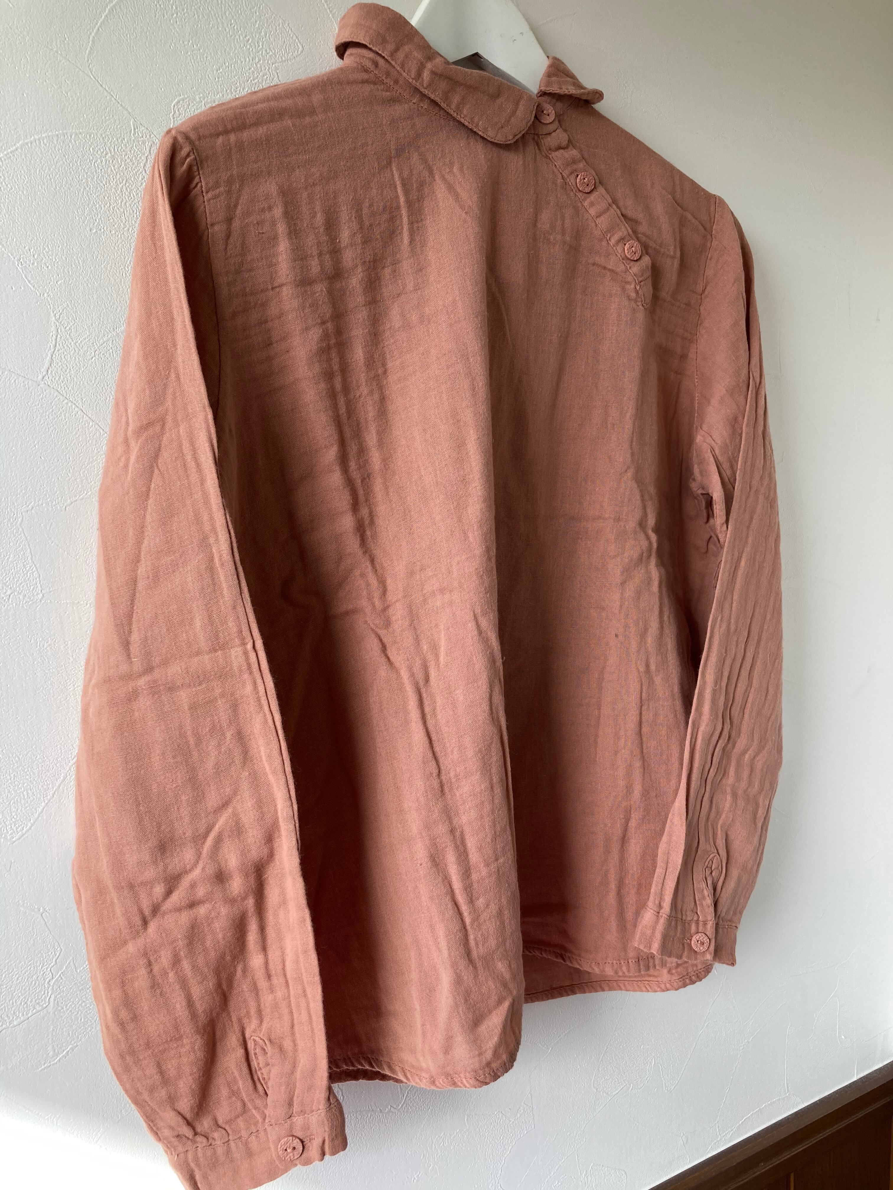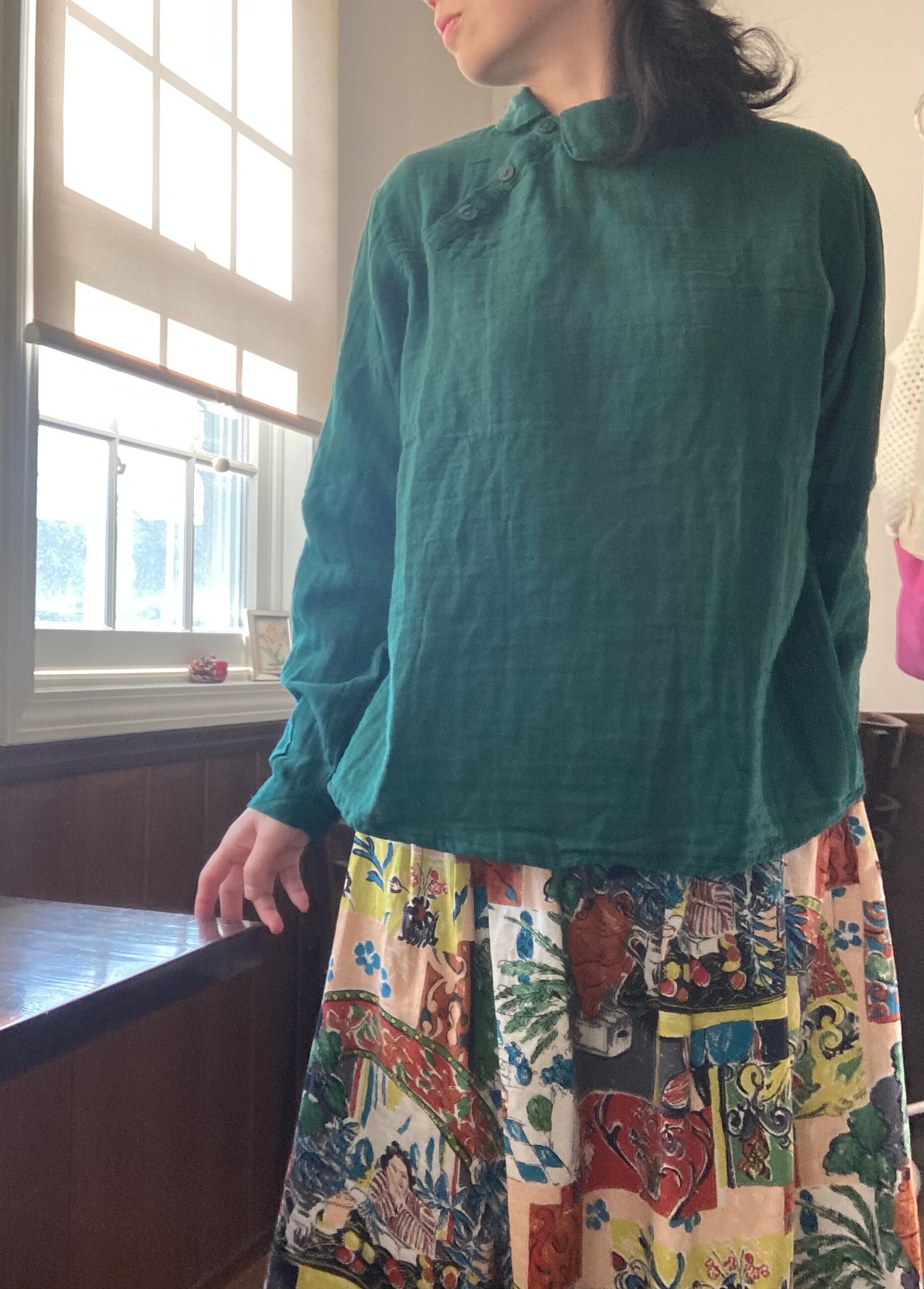 胸元の斜めボタンと小さめの丸襟がほんのりオリエンタルなブラウス。コットン100%ダブルガーゼがふんわりと着心地満点。シンプルでありながら、ひと工夫あるデザインがコーディネートを楽しくしてくれます。色によって雰囲気も変わるので、色違いで欲しくなります。