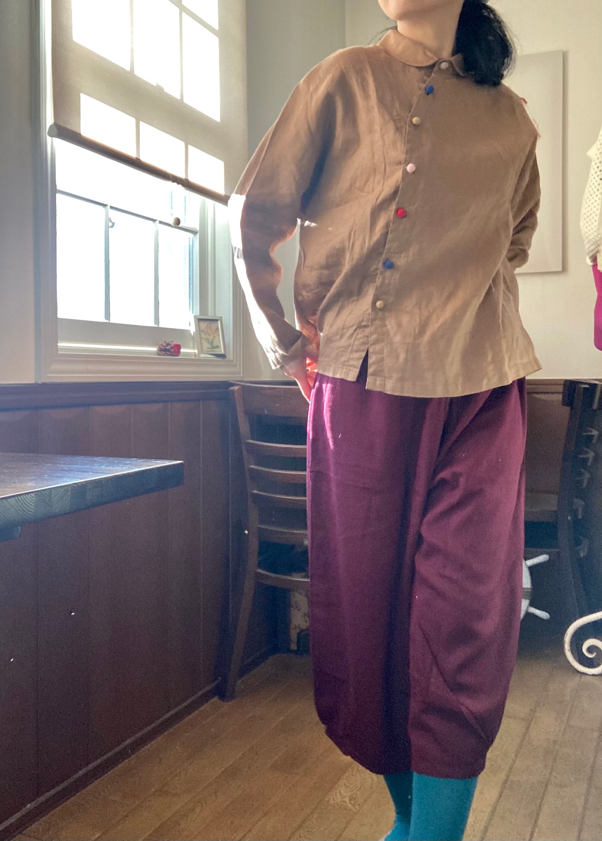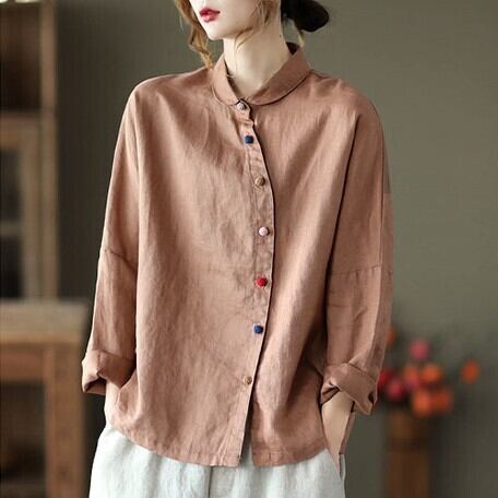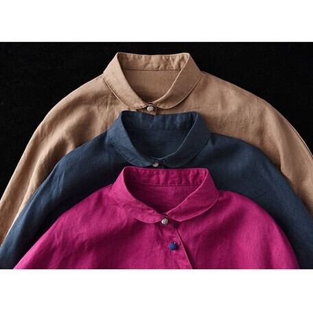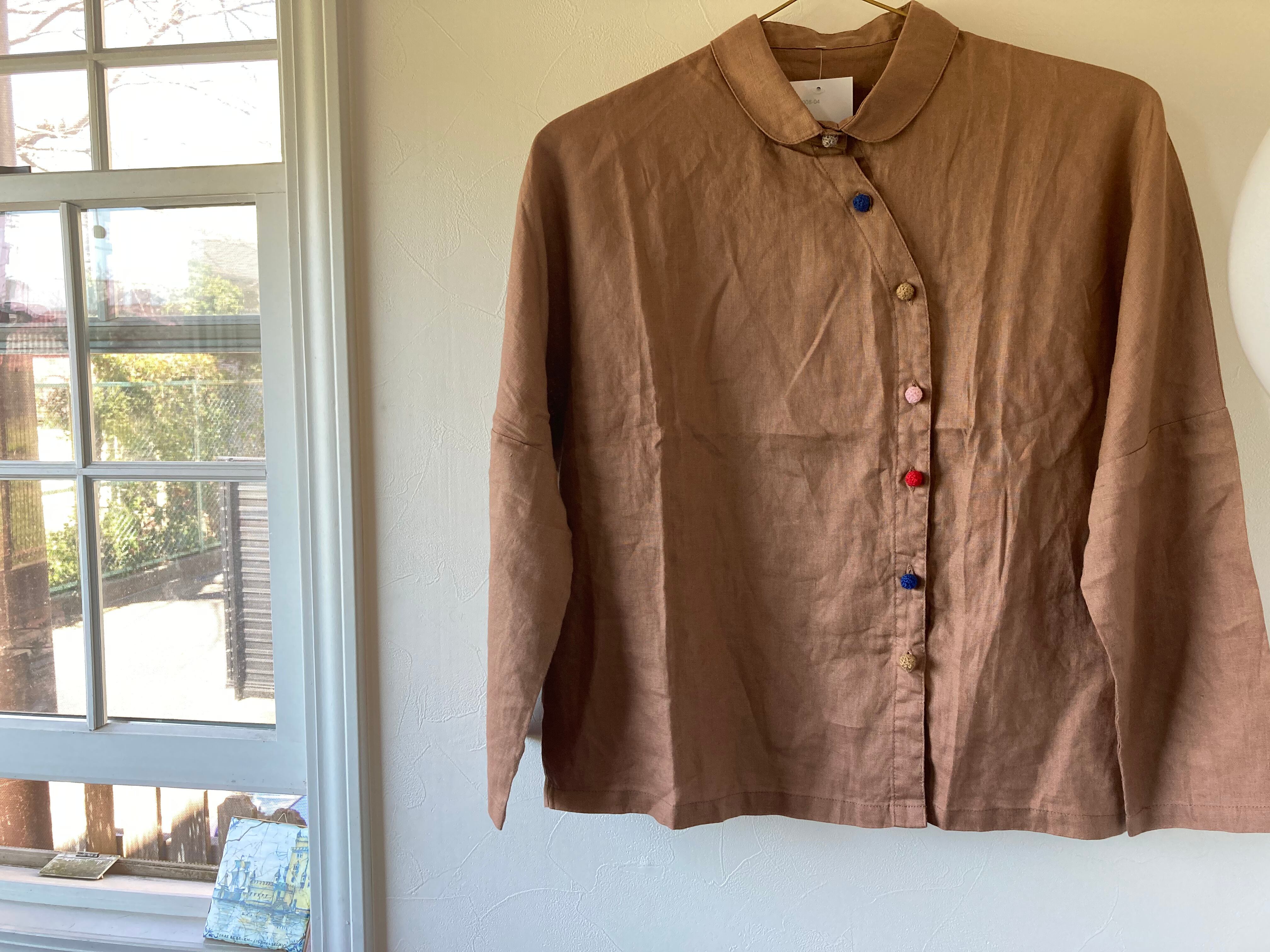 遊び心あふれるカラフルなボタンとカーブを描くラインが異国情緒を感じさせるリネンシャツ。小さい丸襟もキュートで凛とした雰囲気。一枚で主役になれるお気に入りになりそうなアイテム。さらっと羽織りにするのも◎