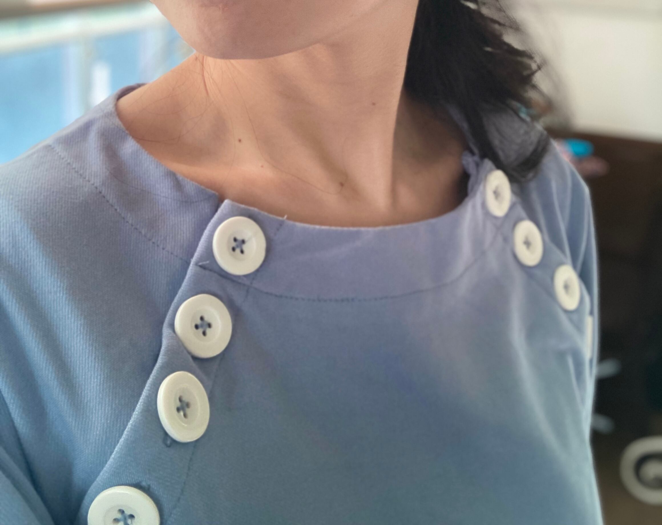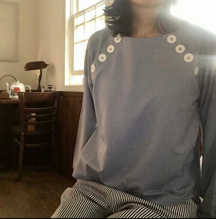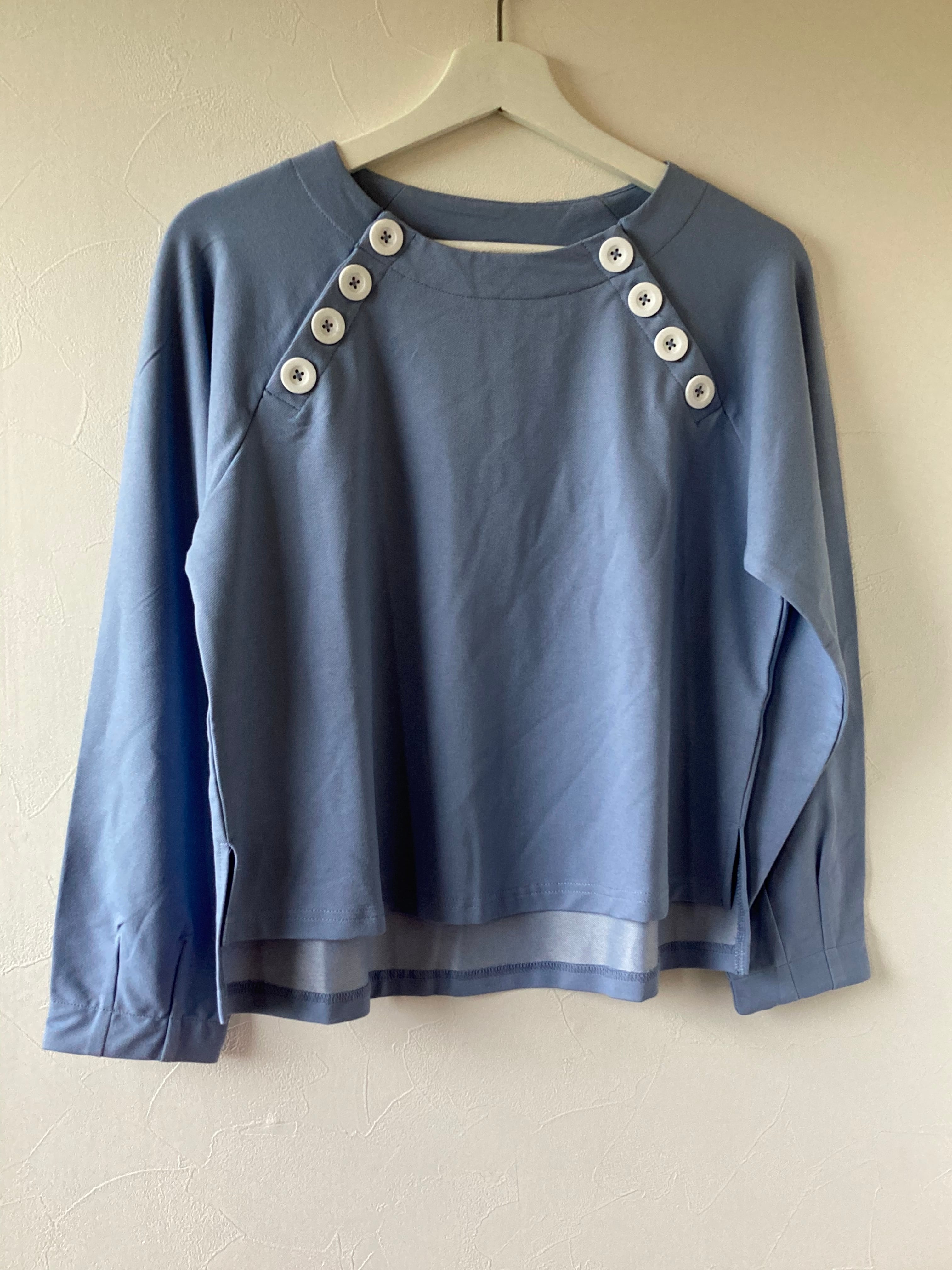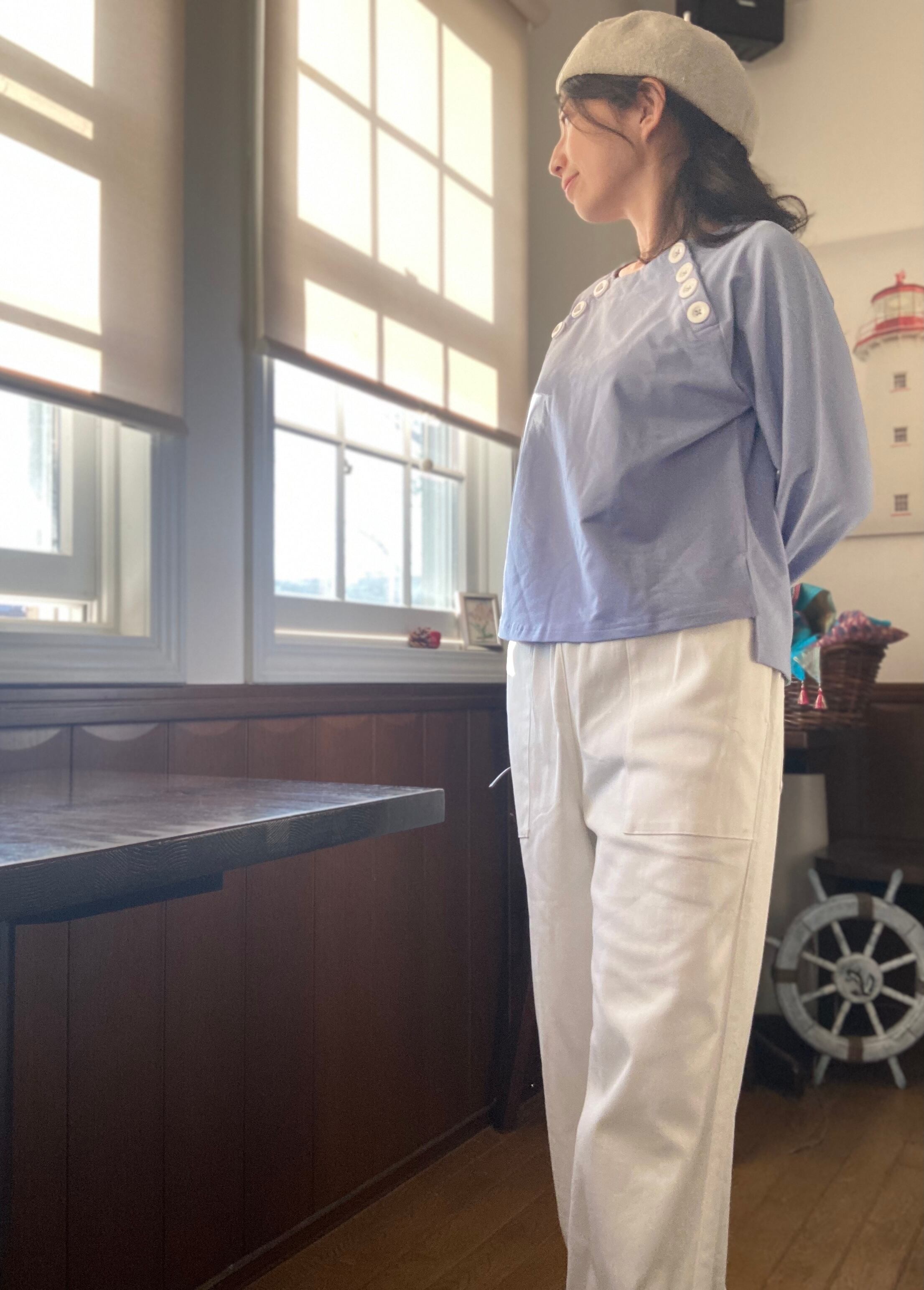 胸元の両サイドに配列されたボタンがアクセントのレトロマリンなトップス。