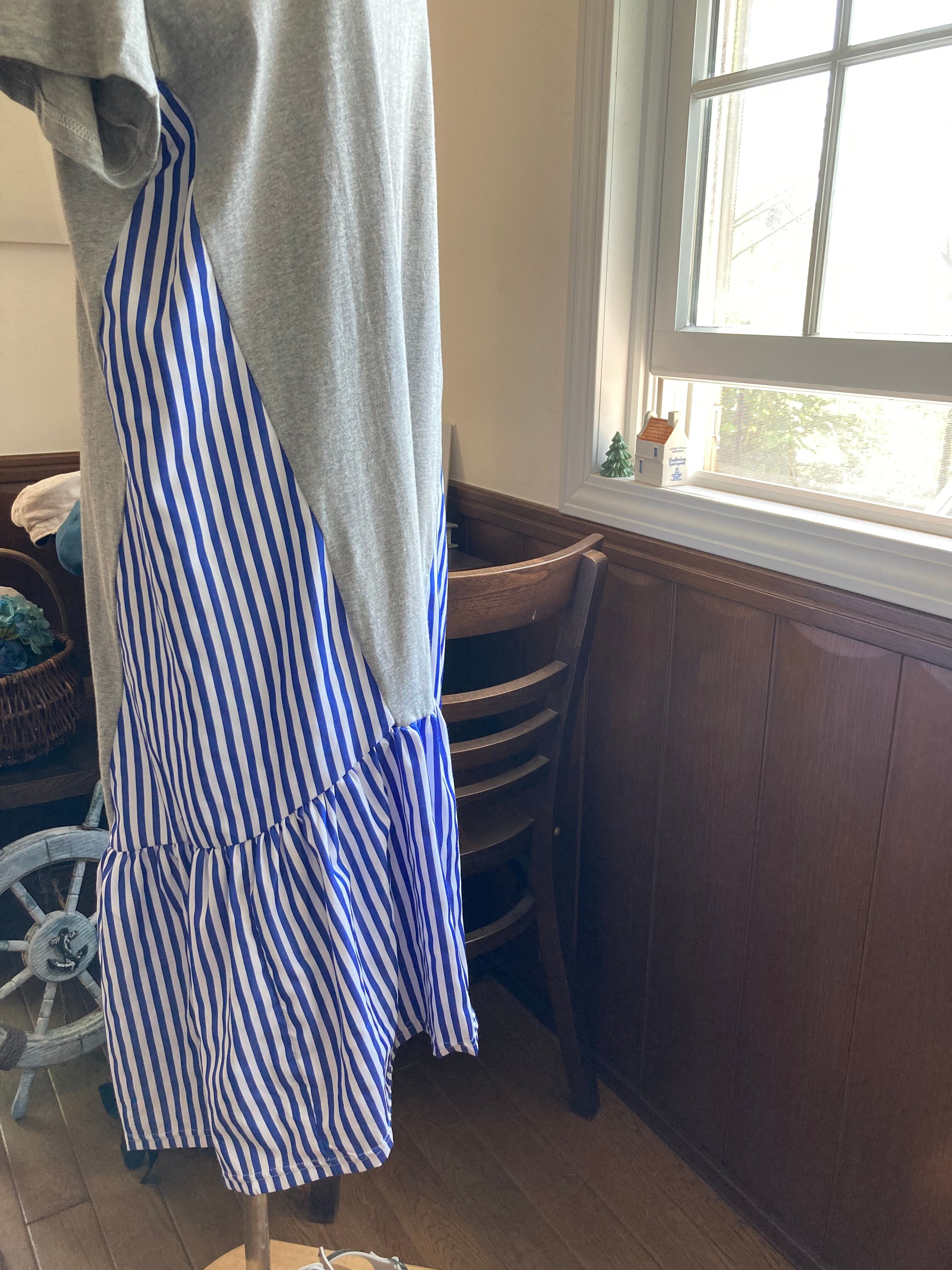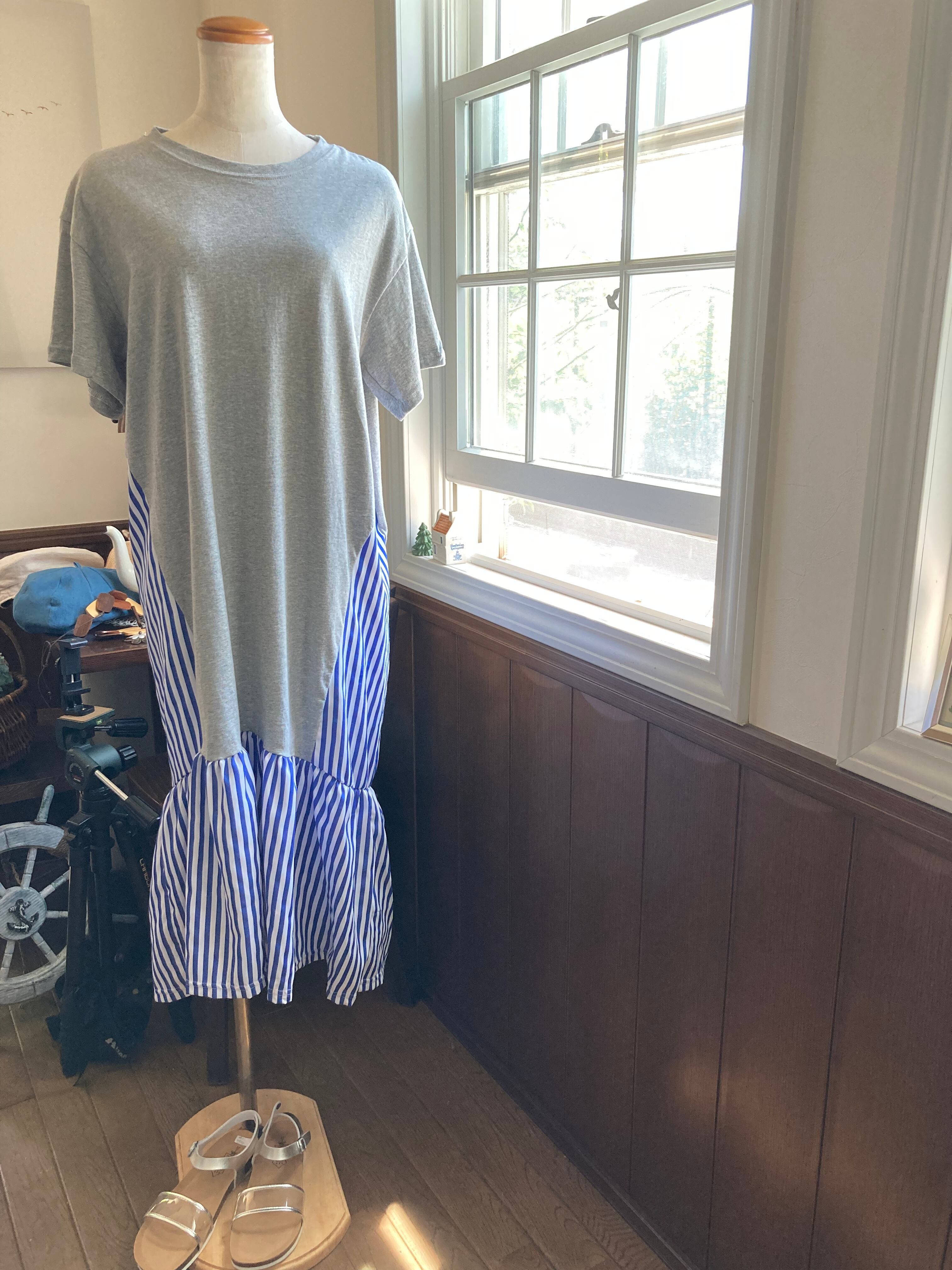 無地のTシャツ生地にサイドとマーメイドラインの裾の爽やかなストライプ柄がドッキングしたワンピース。遊び心あるデザインながら、すっきりとしたカッティングが全方向からきれいなラインを描いてくれます。カットソーのカジュアルな着心地のよさと、ほどよいハリのあるストライプのバランスも◎