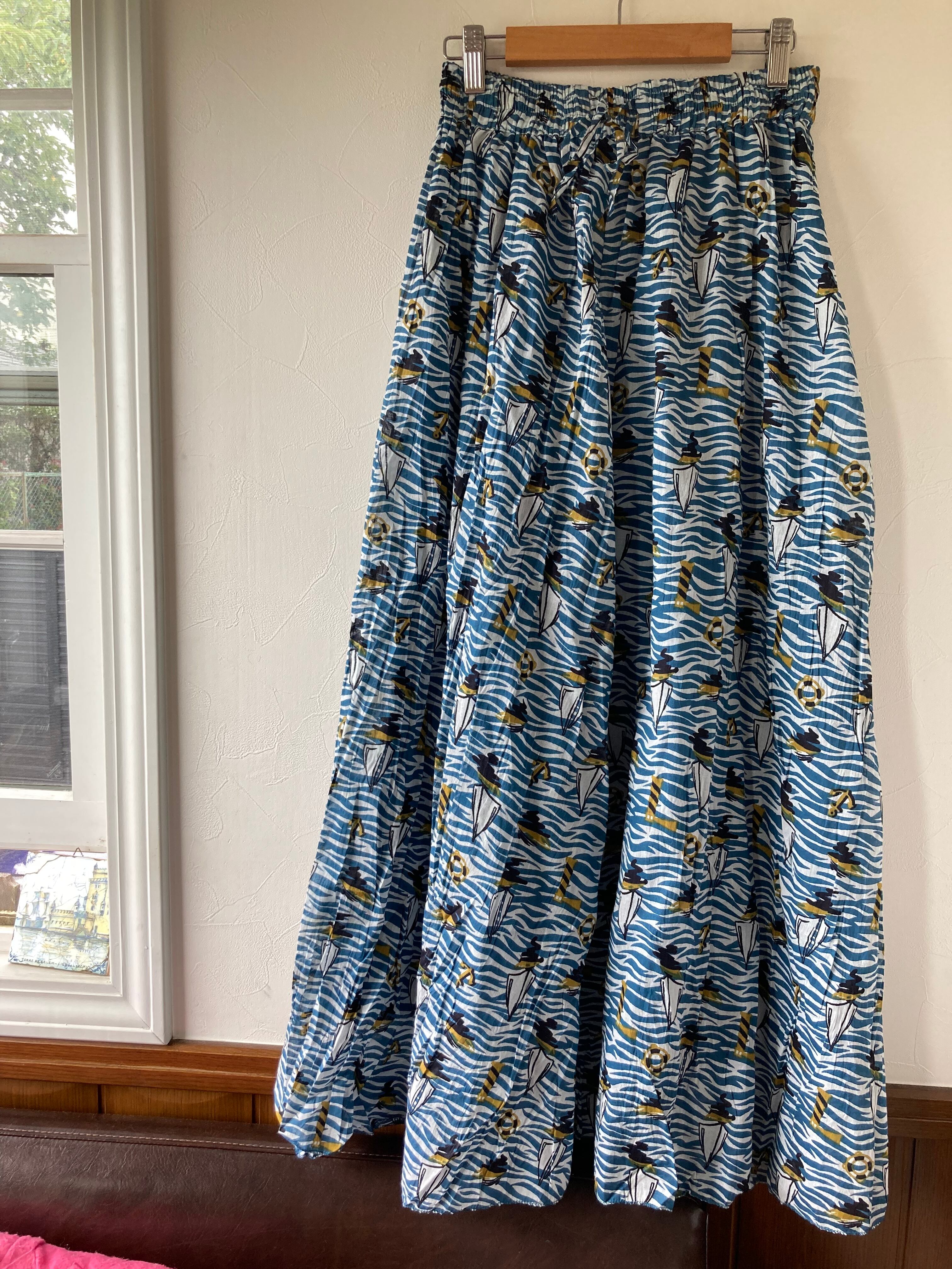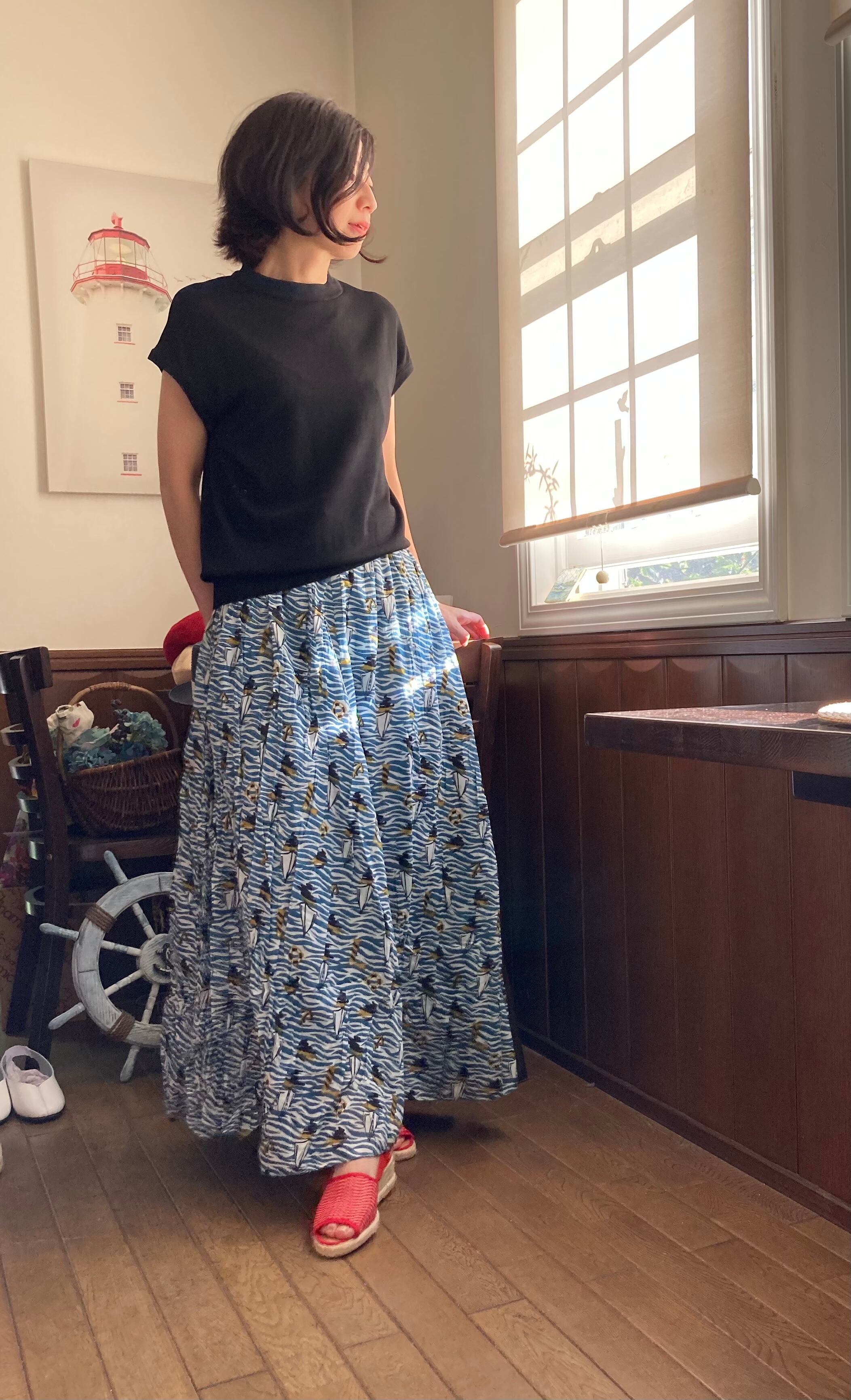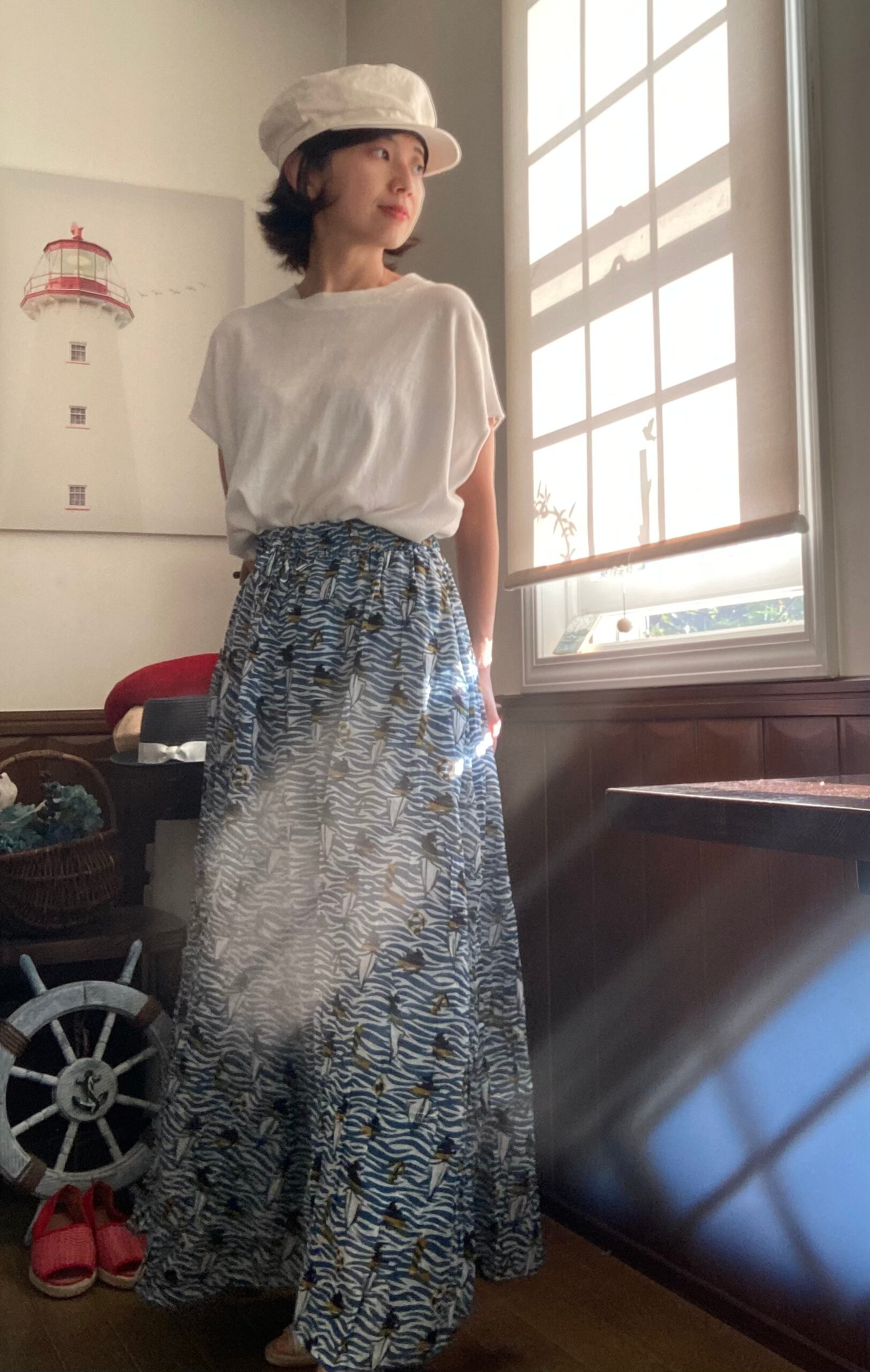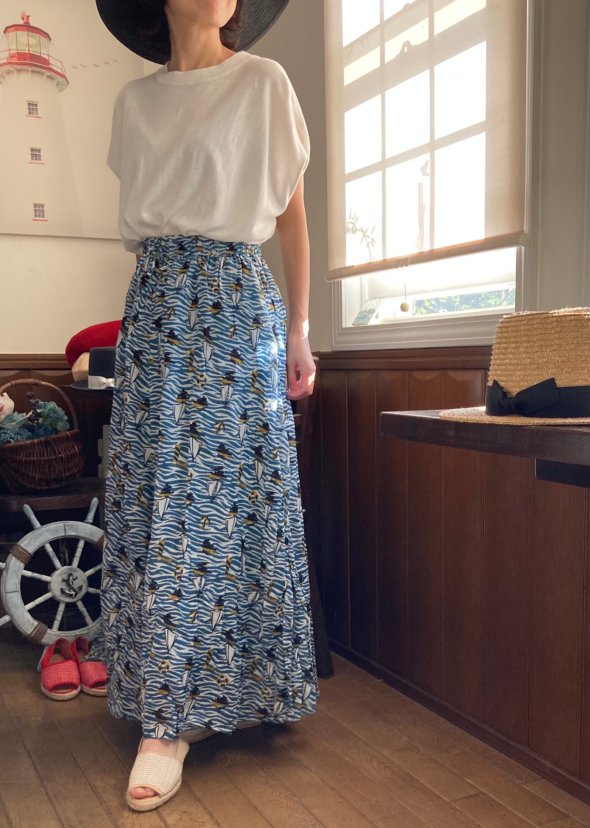 波を漂うヨットとともに描かれる、灯台、イカリ、浮き輪などマリンテイストたっぷりのコットンスカート。