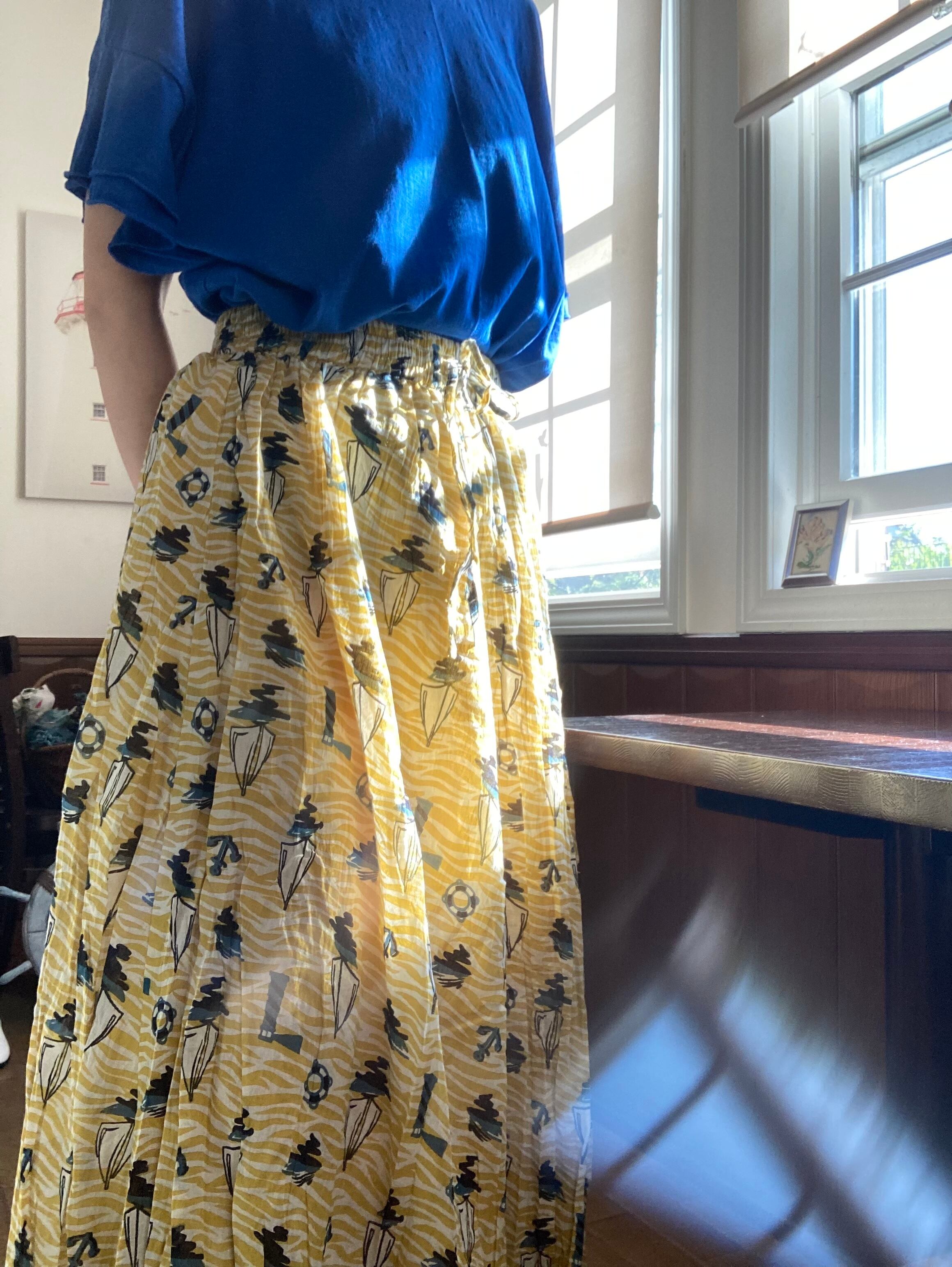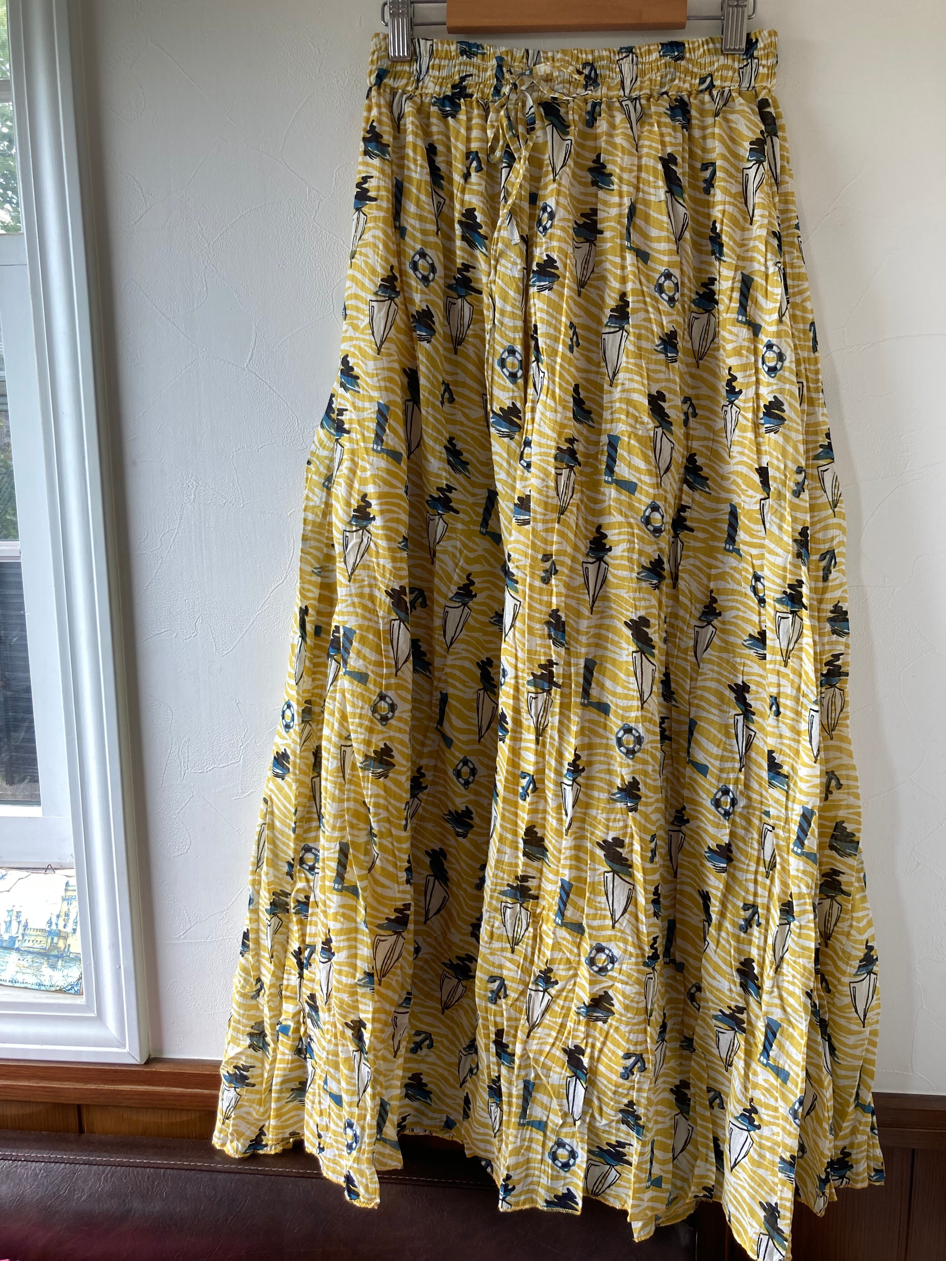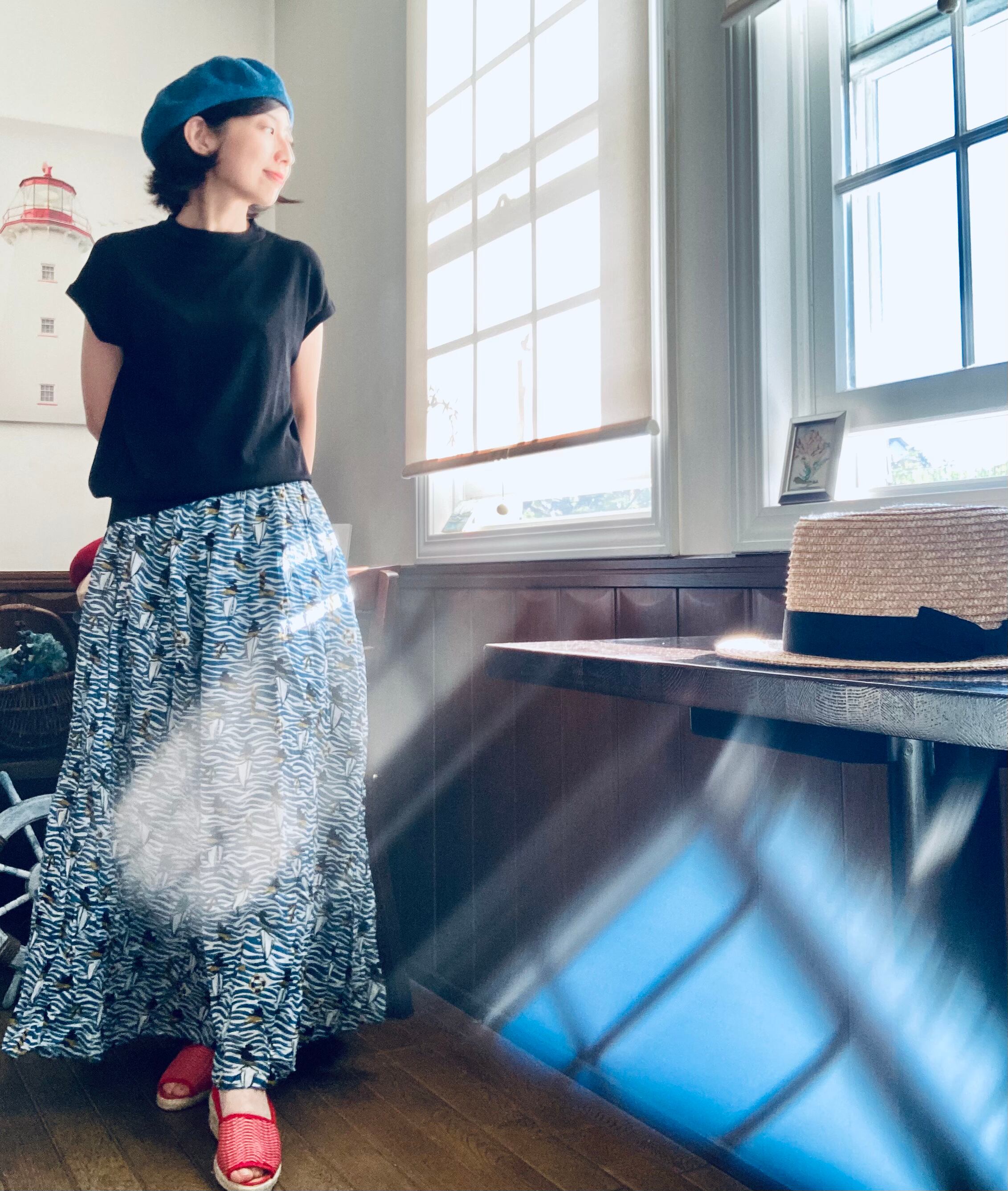 波を漂うヨットとともに描かれる、灯台、イカリ、浮き輪などマリンテイストたっぷりのコットンスカート。