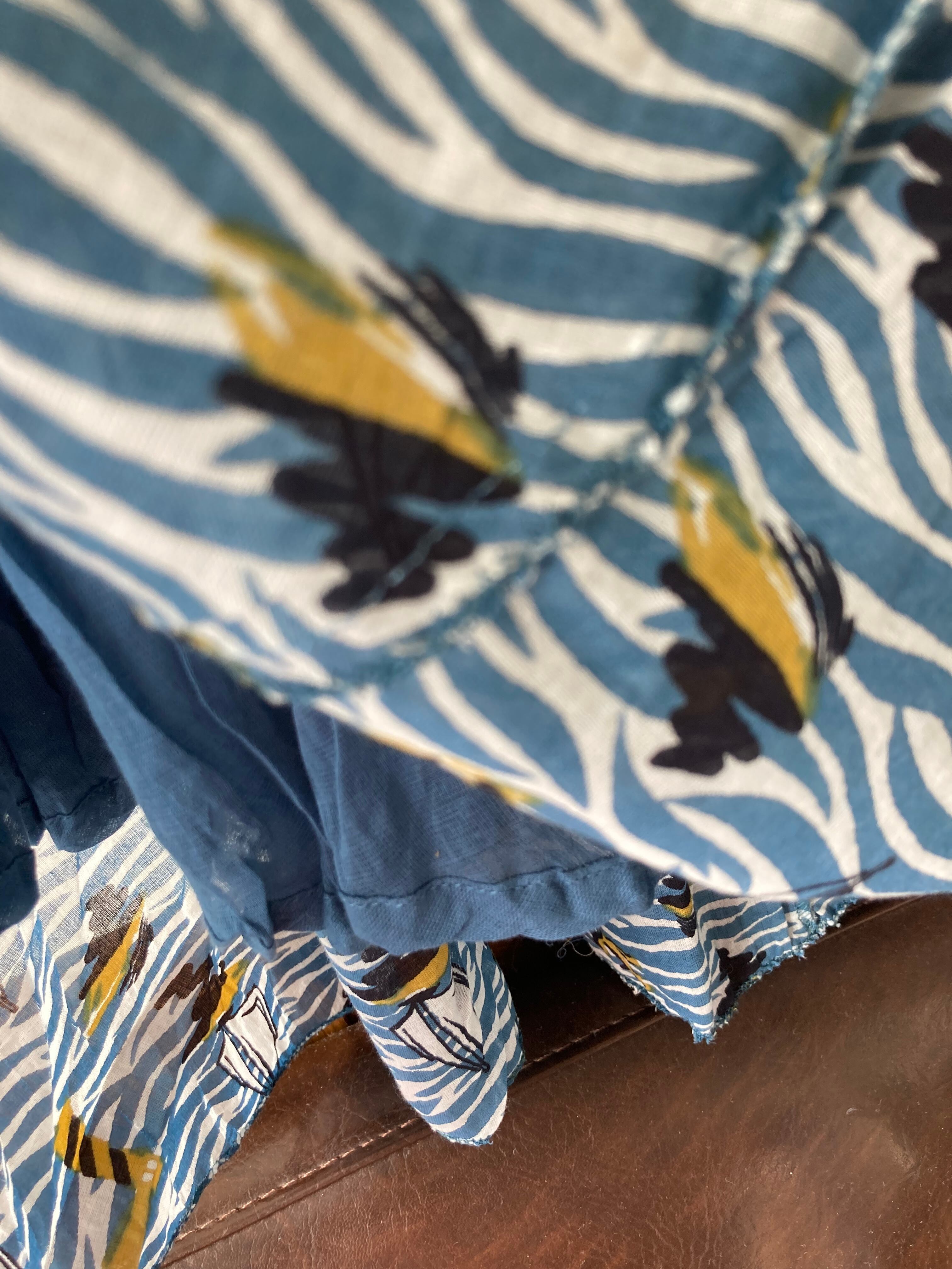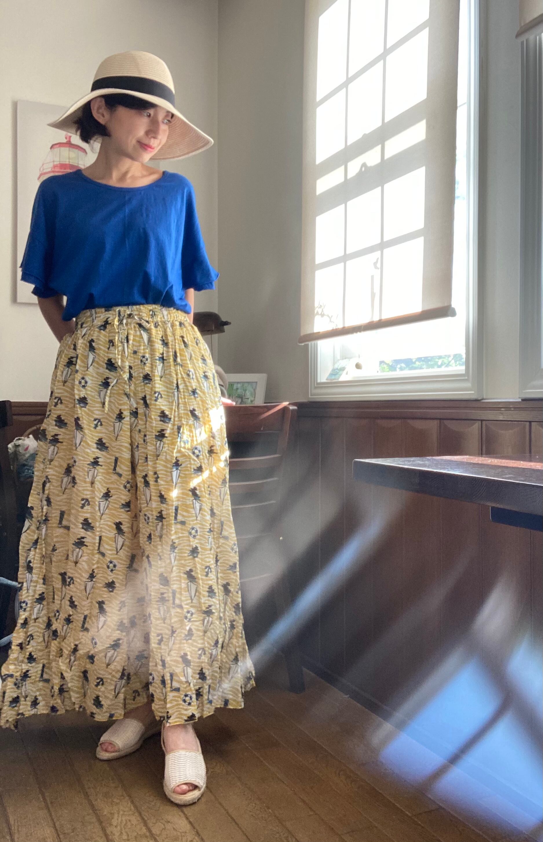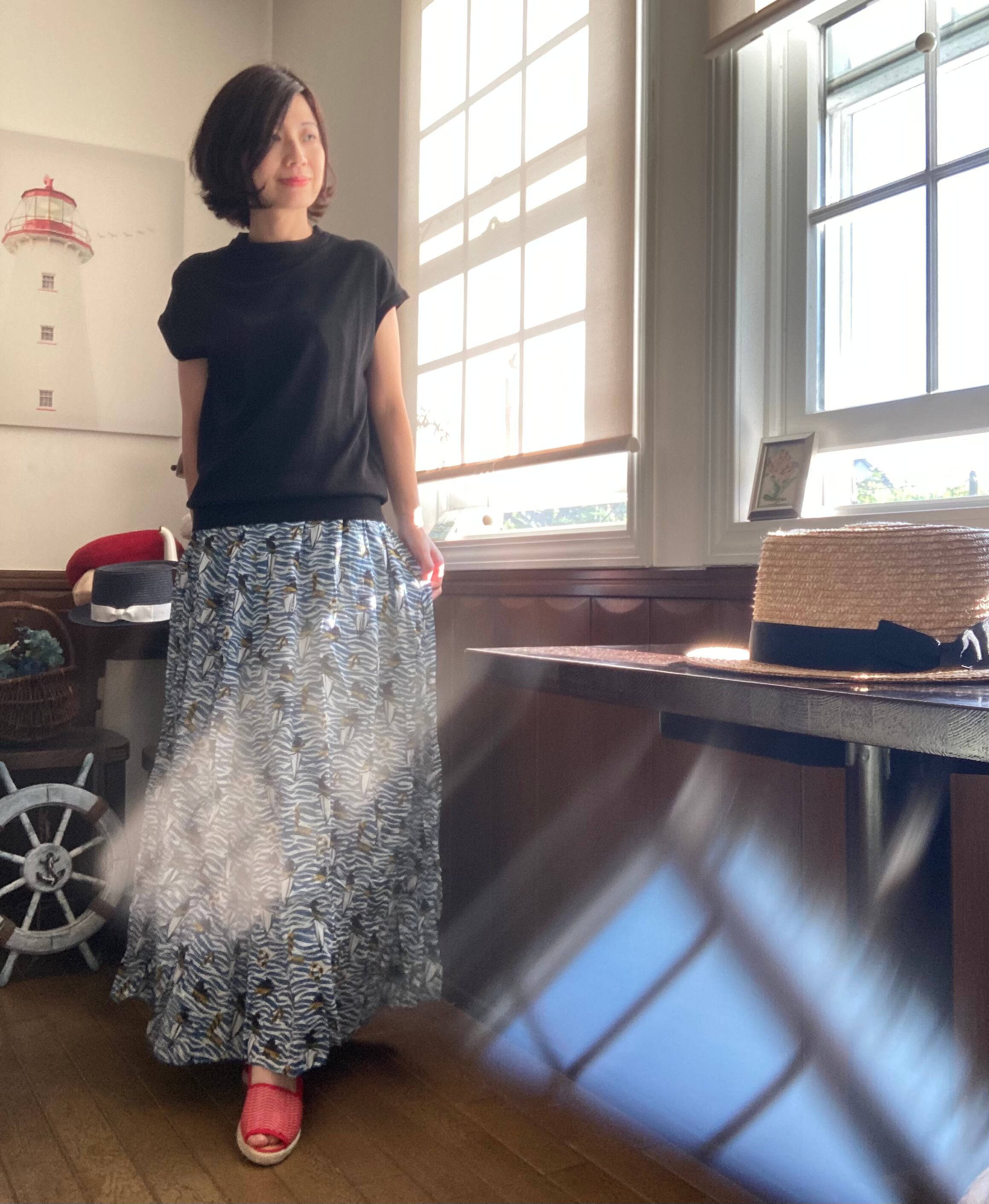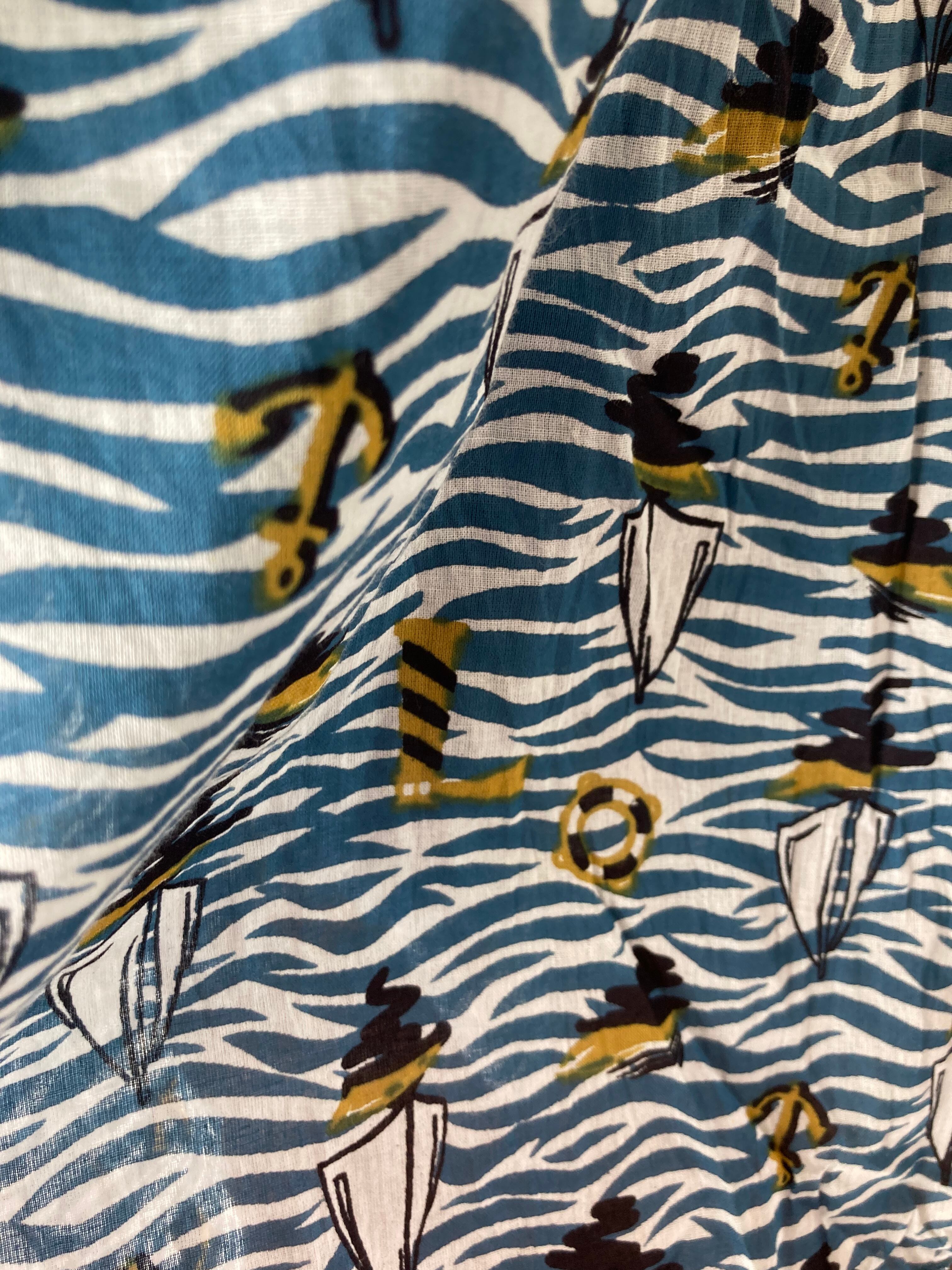 波を漂うヨットとともに描かれる、灯台、イカリ、浮き輪などマリンテイストたっぷりのコットンスカート。
