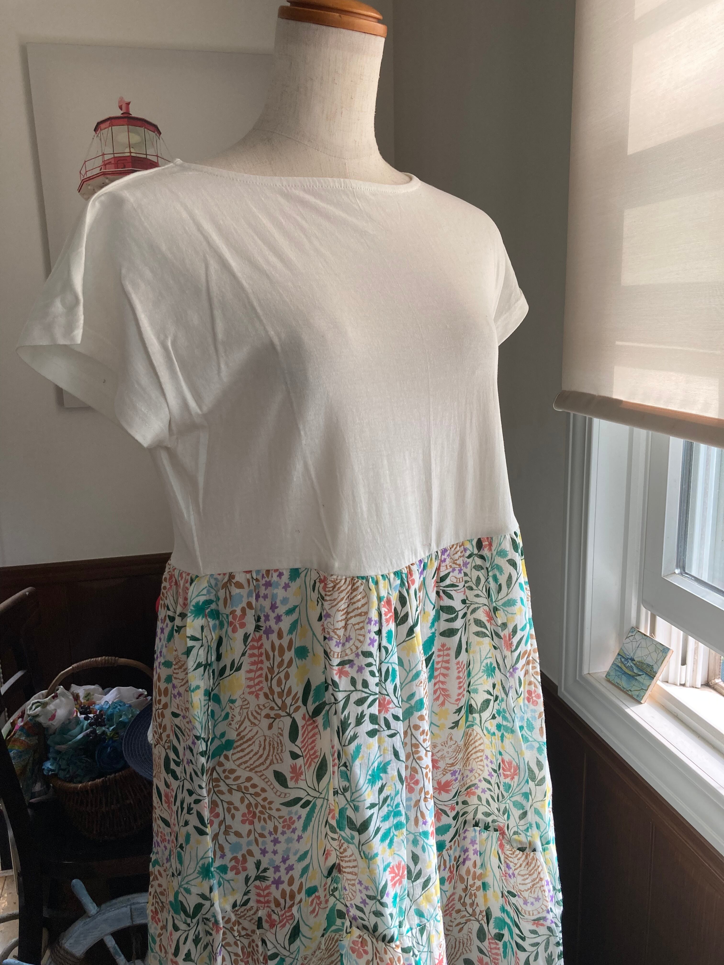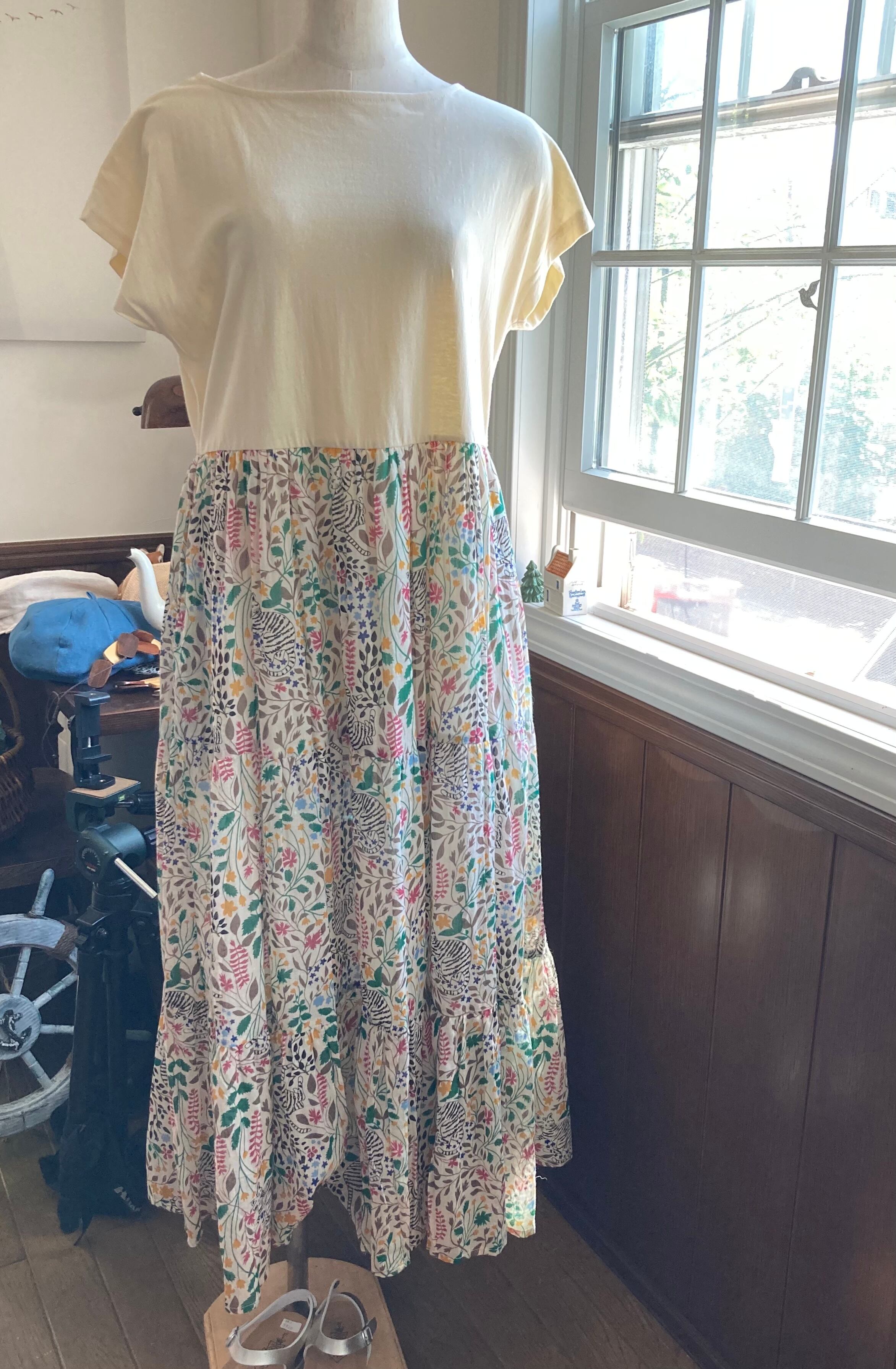 カットソー生地のトップス部分とコットンボイルのスカートが一体となったワンピース。