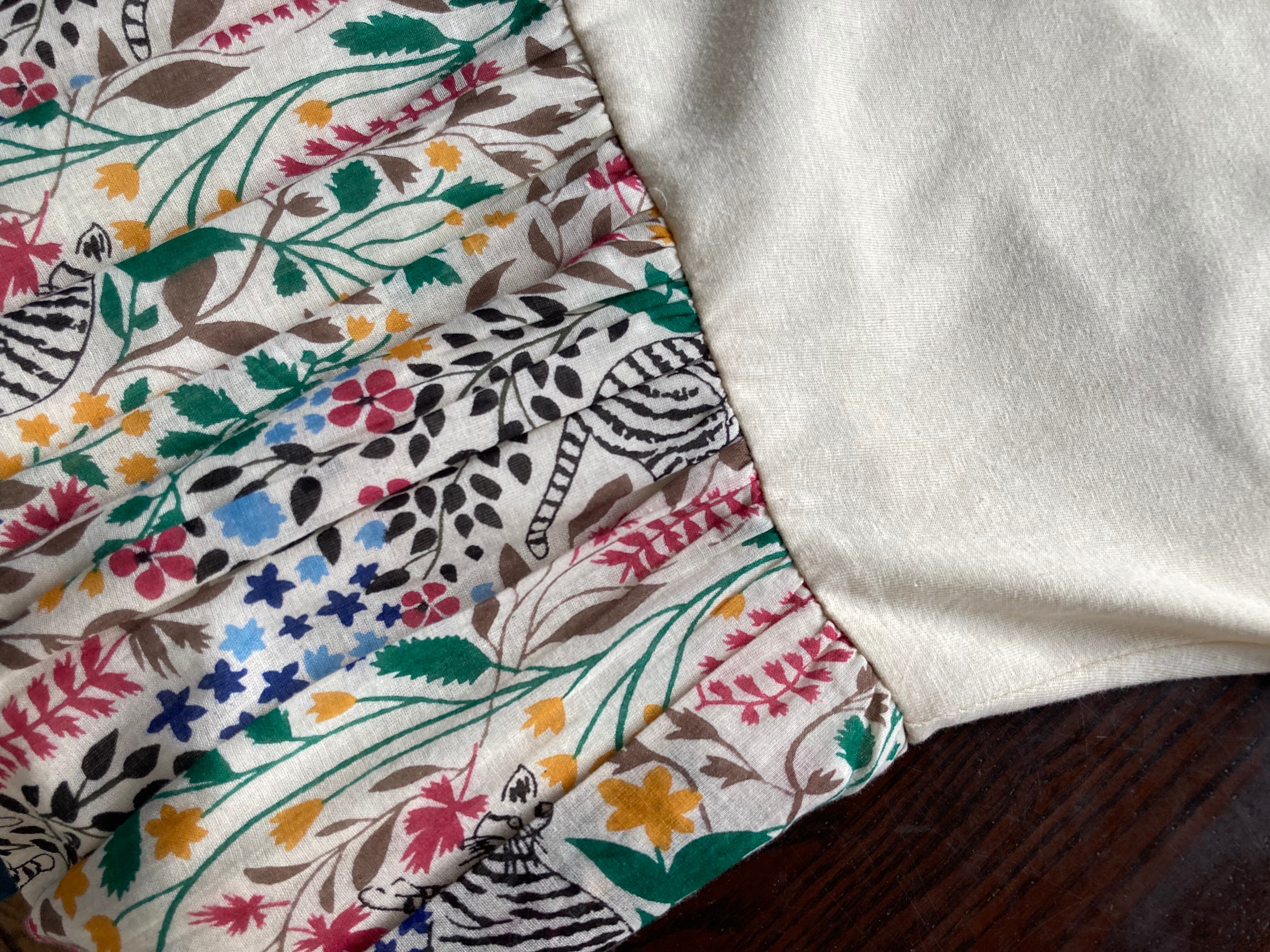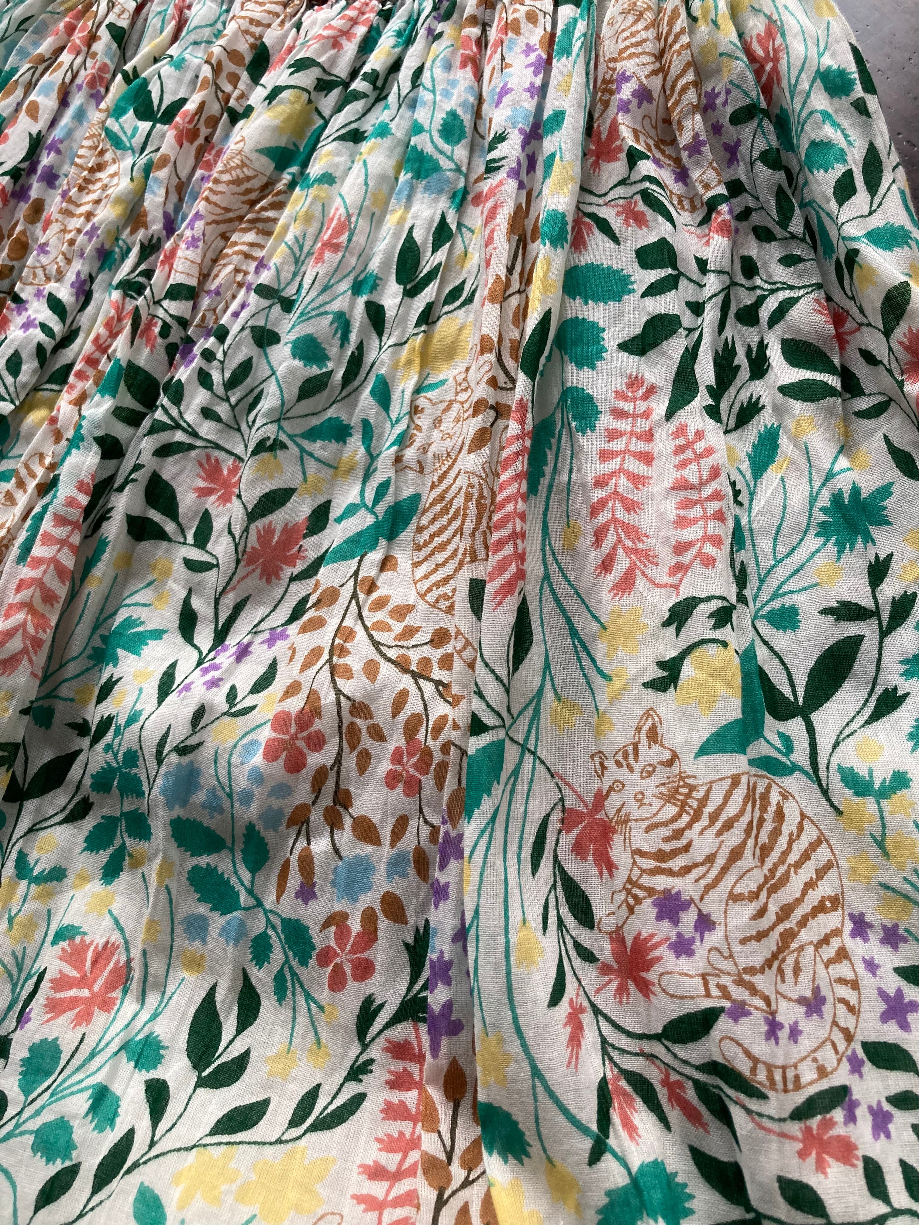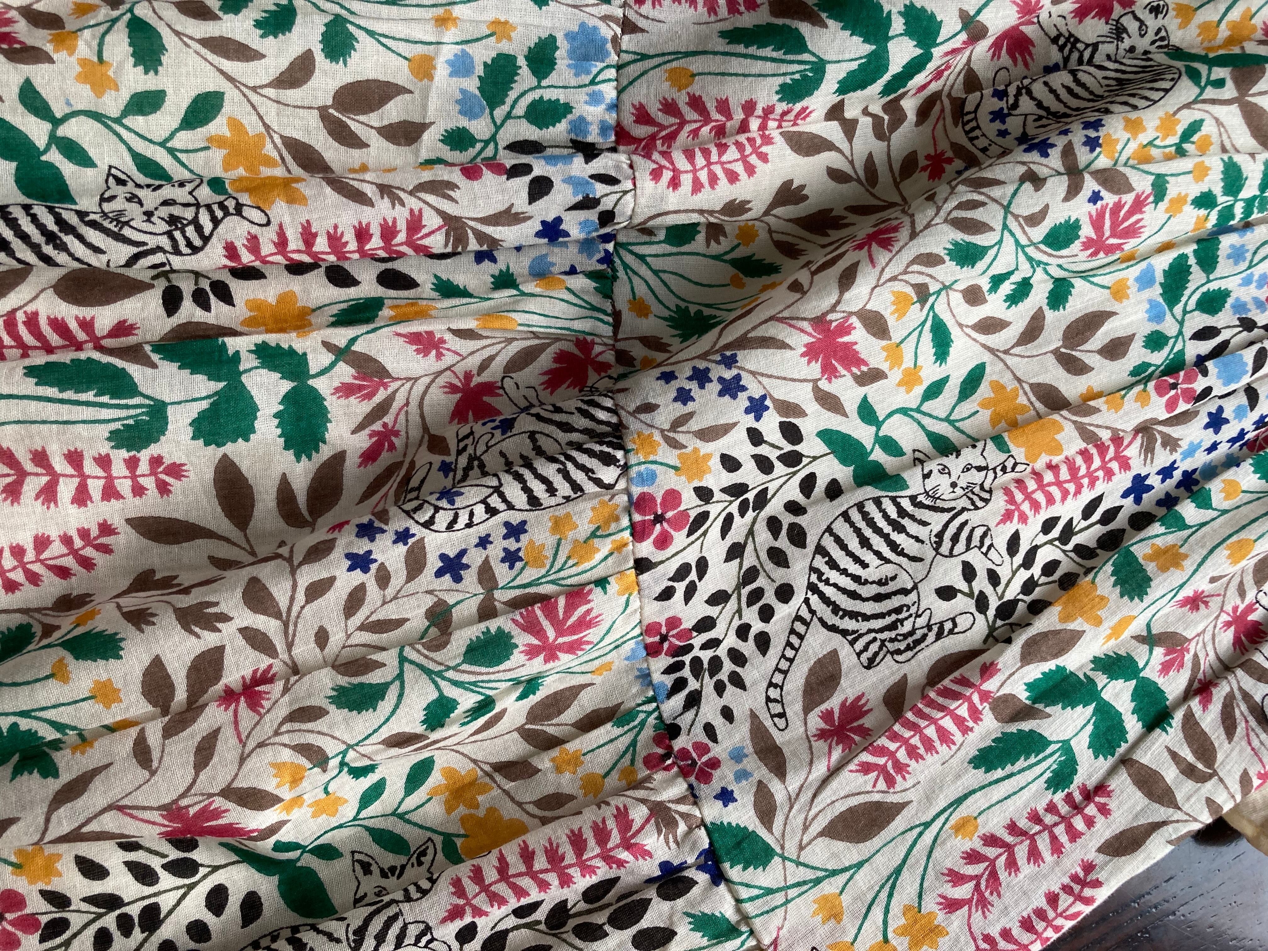 カラフルだけど優しい色合いのプリントには、草花の中にさりげなく猫ちゃんが隠れています。