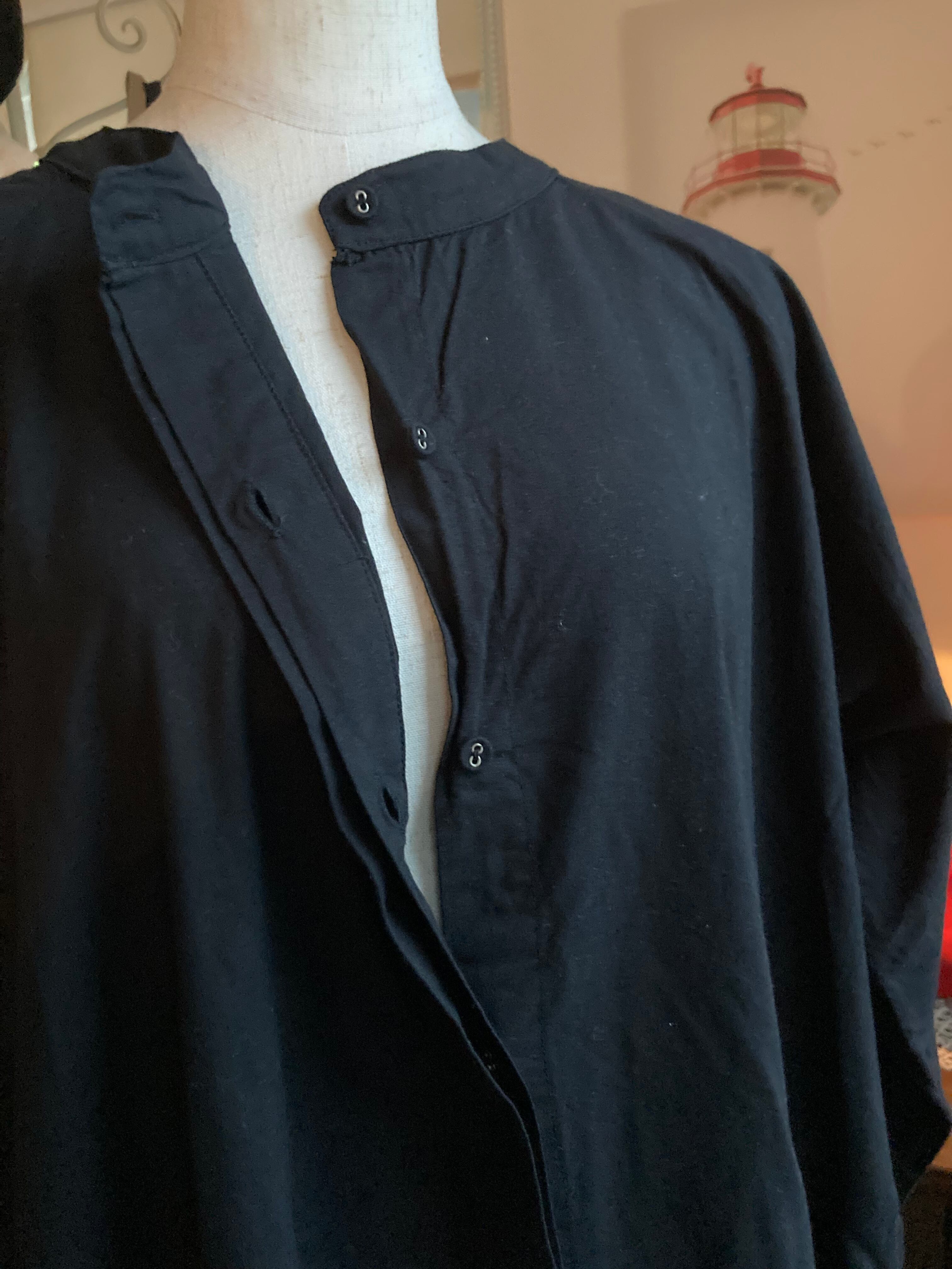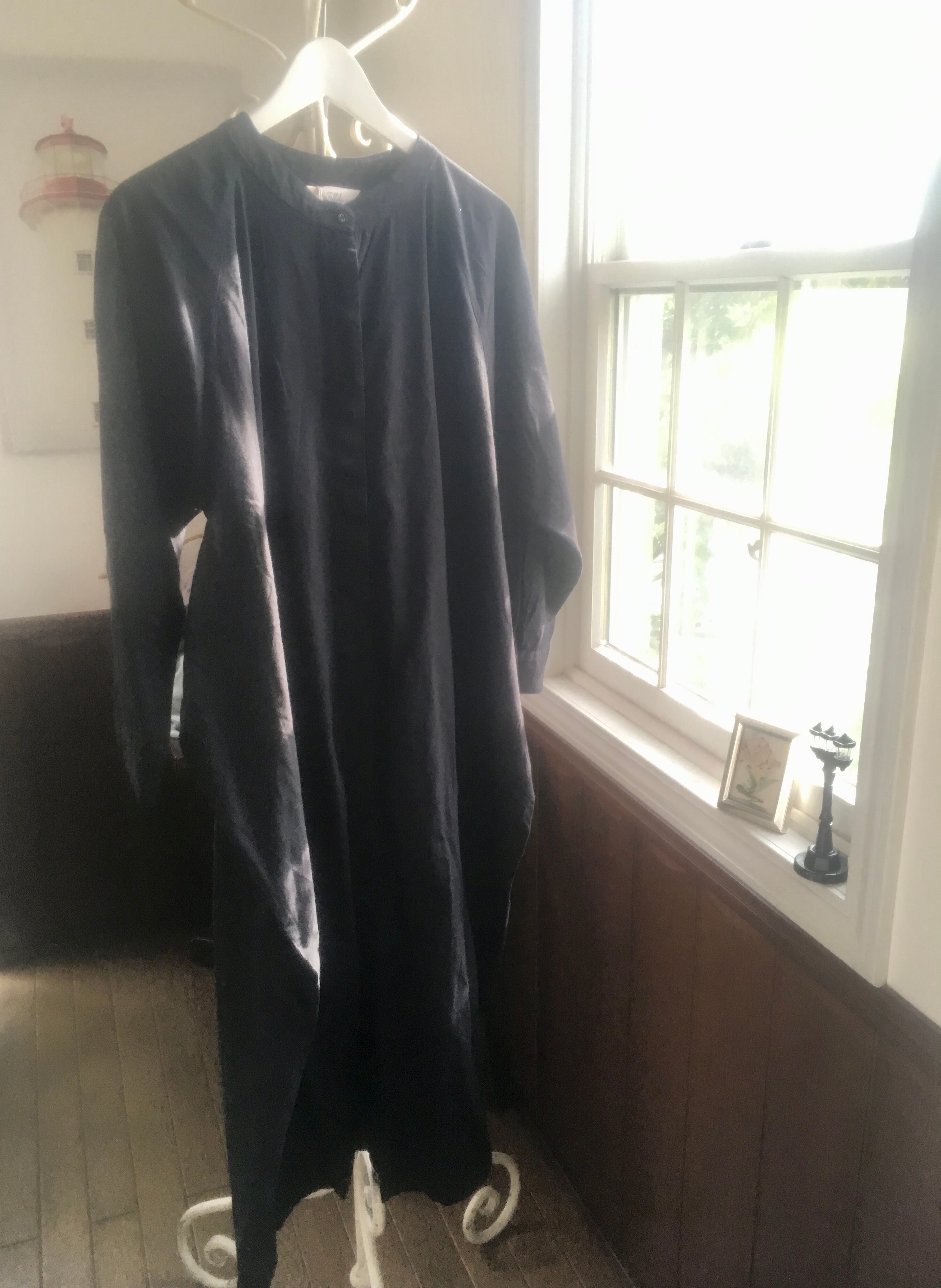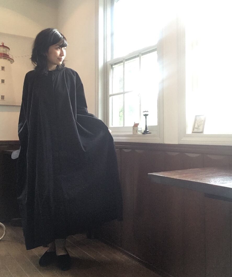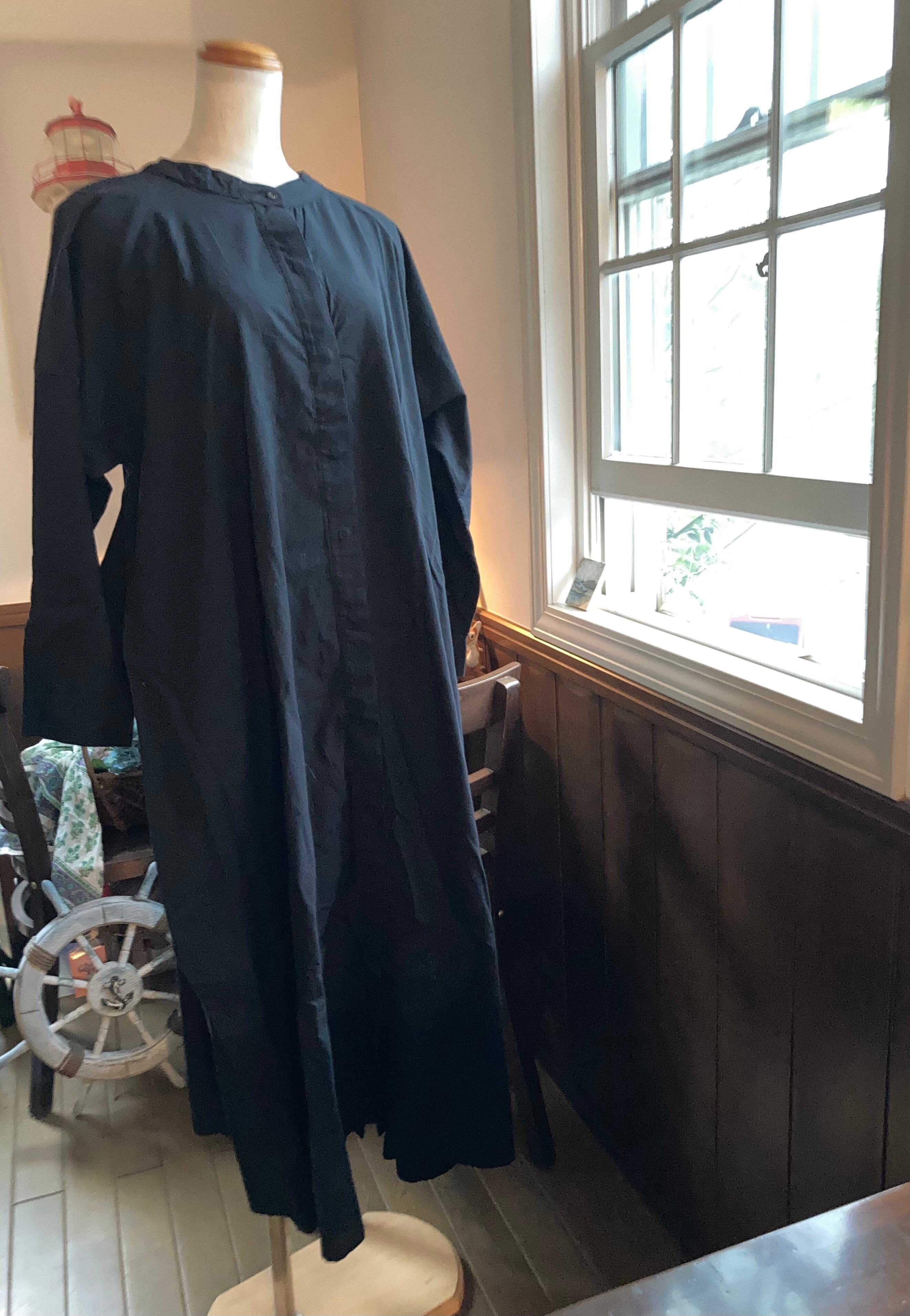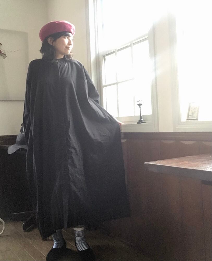 ゆったりとしたコットン100%のシャツワンピース。少女っぽくもあり、シンプルさと真っ黒の潔さが大人っぽくもあり、魔女の宅急便の主人公になった気分です。バンドカラーの襟元は襟付きが得意でない方にも似合いやすいデザインです。