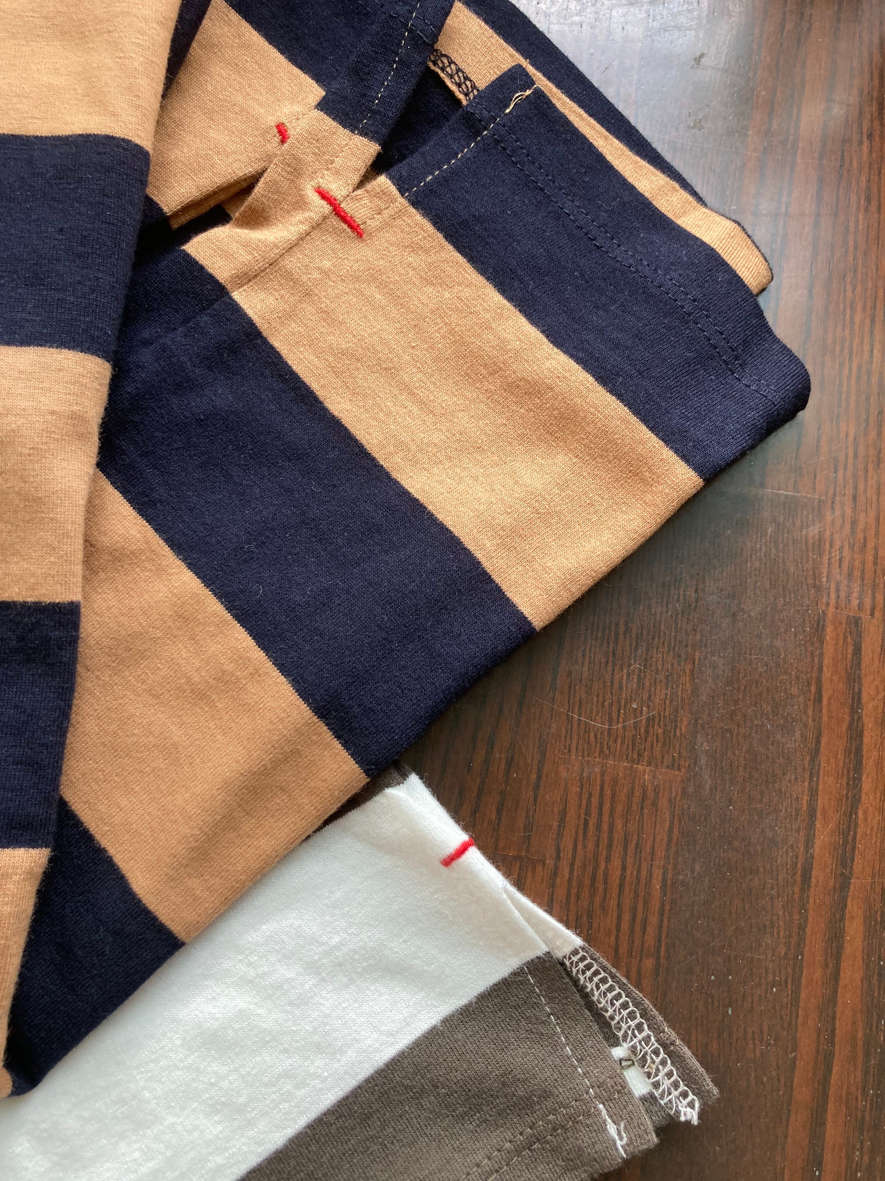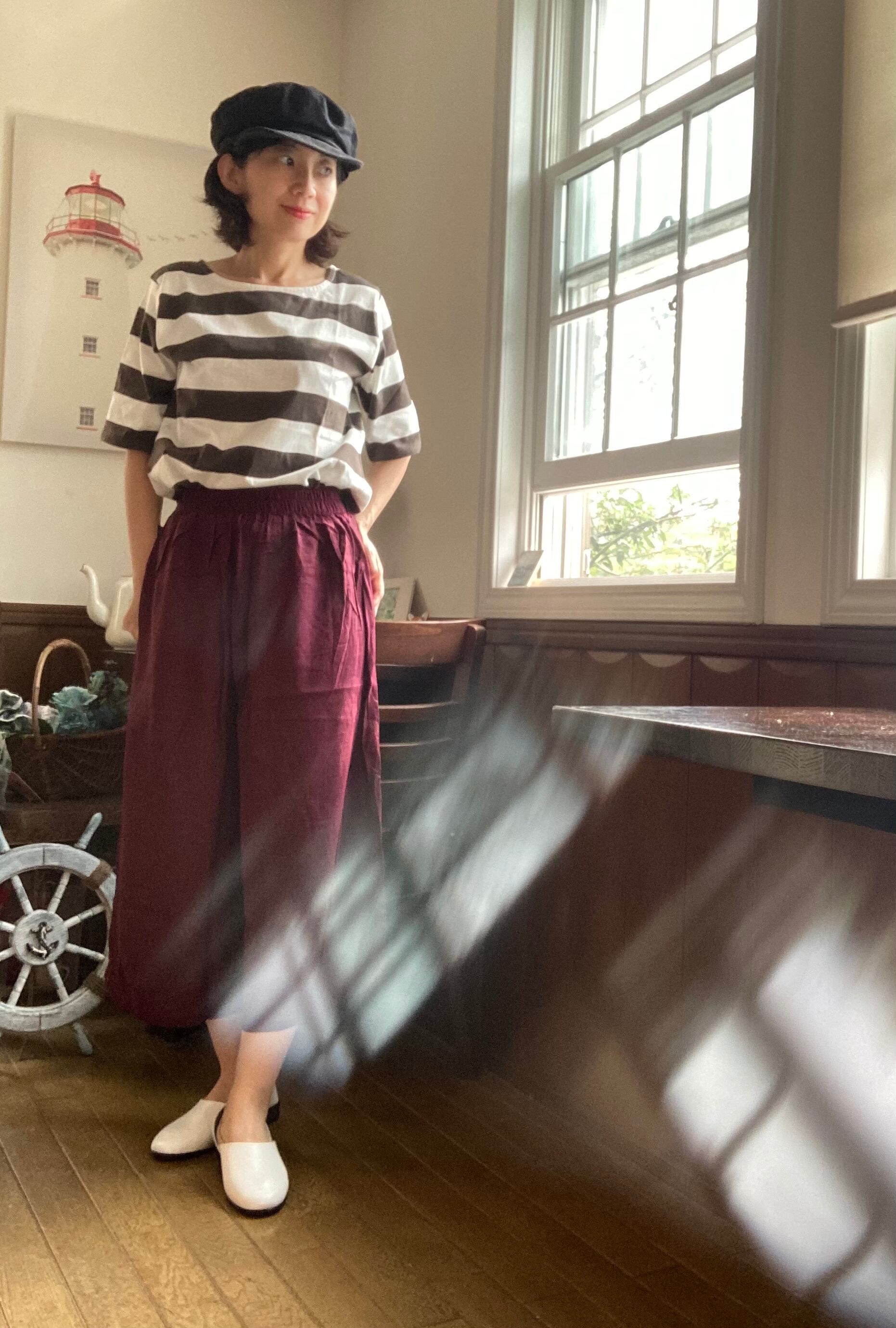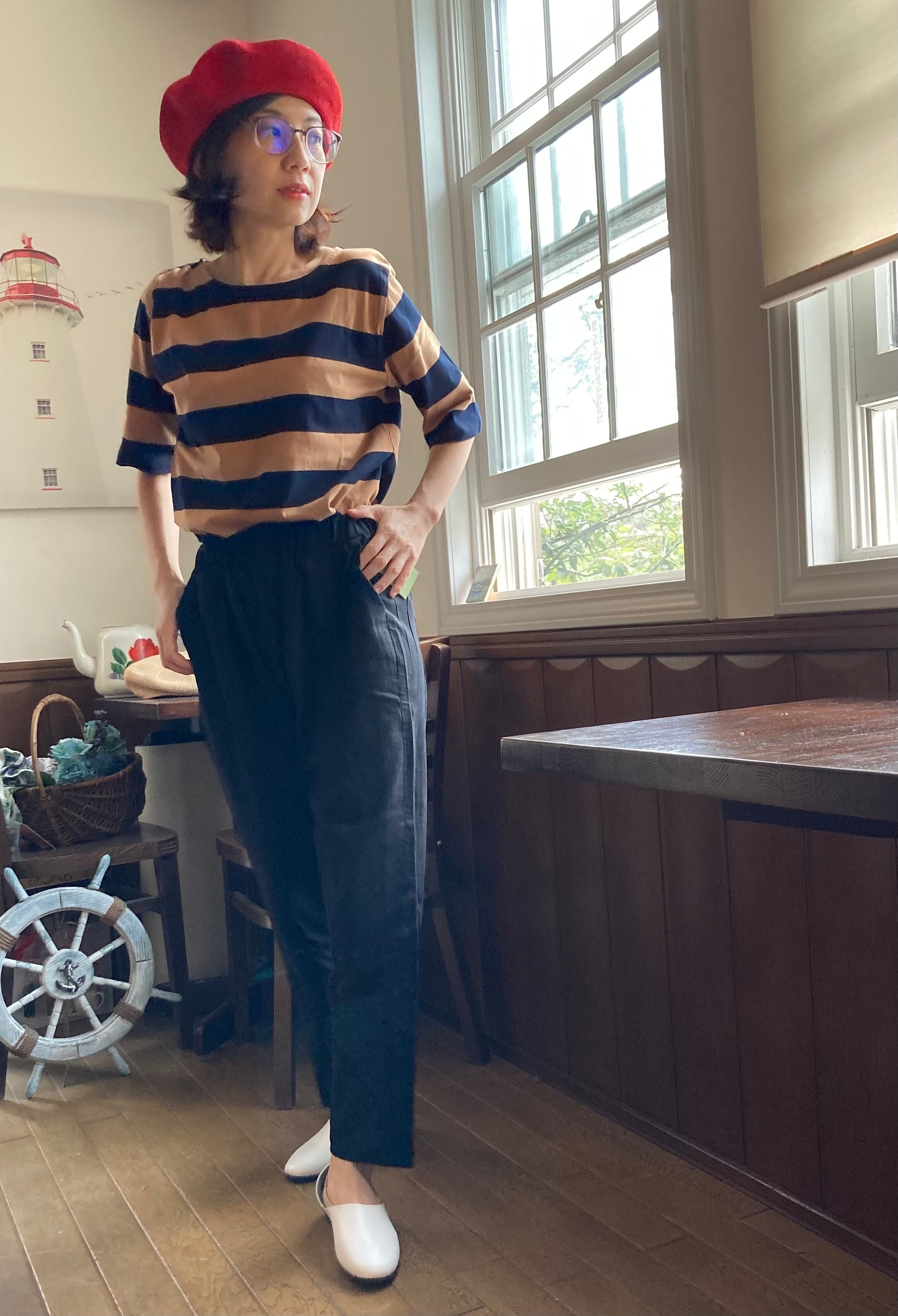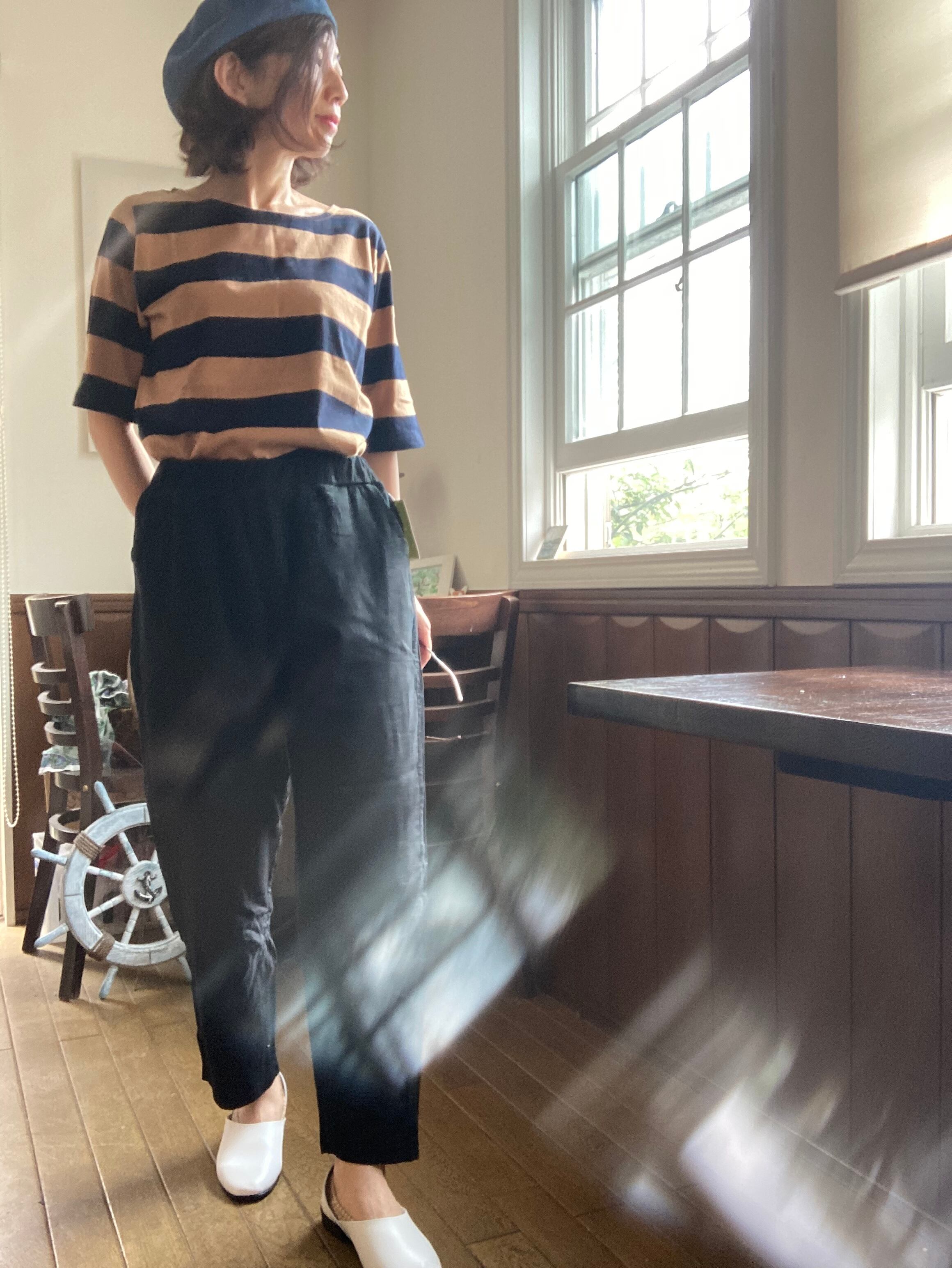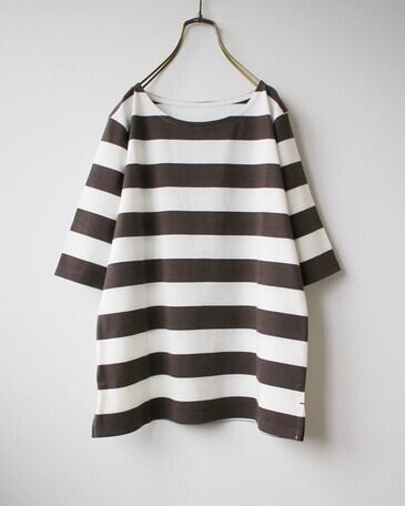 太めのボーダーがシャープで都会的な印象。カラーリングもシックで大人っぽい仕上がり。五分袖なので、二の腕もカバーしてくれます。ちょうどよい厚みの生地。首元も開きすぎず、詰まっていないきれいなラインなので、エレガントにもカジュアルにも着こなしていただけます。