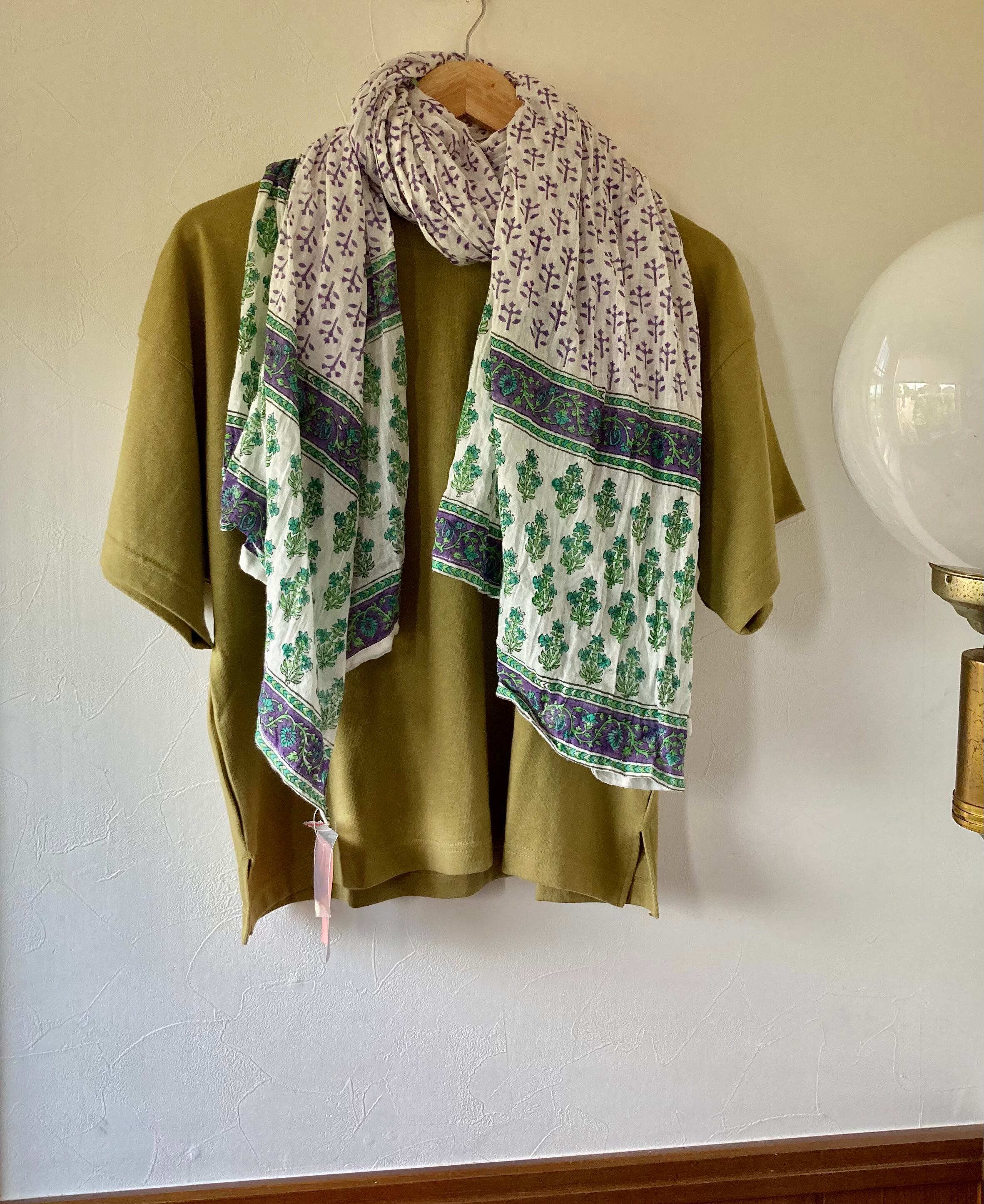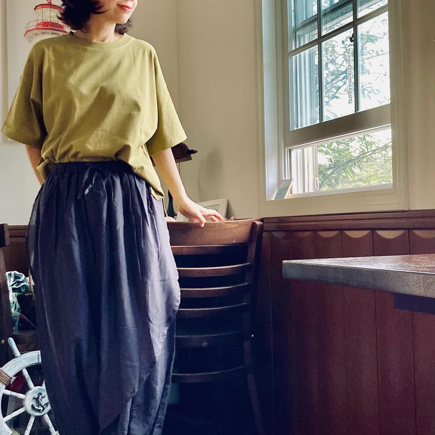 正方形に近い形、ドロップショルダー、ボディラインを拾いにくいオーバーサイズが今っぽいシルエットに仕上げています。