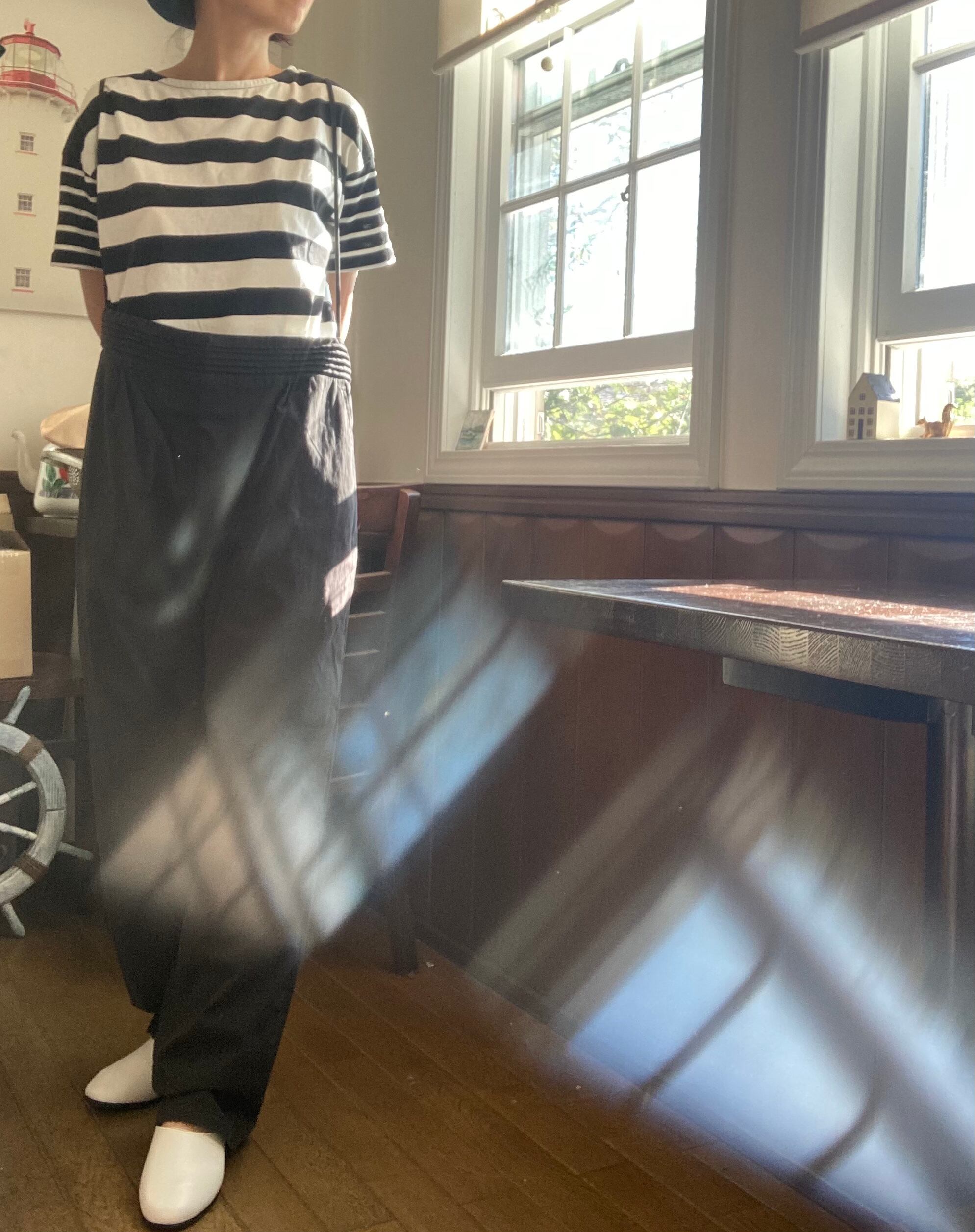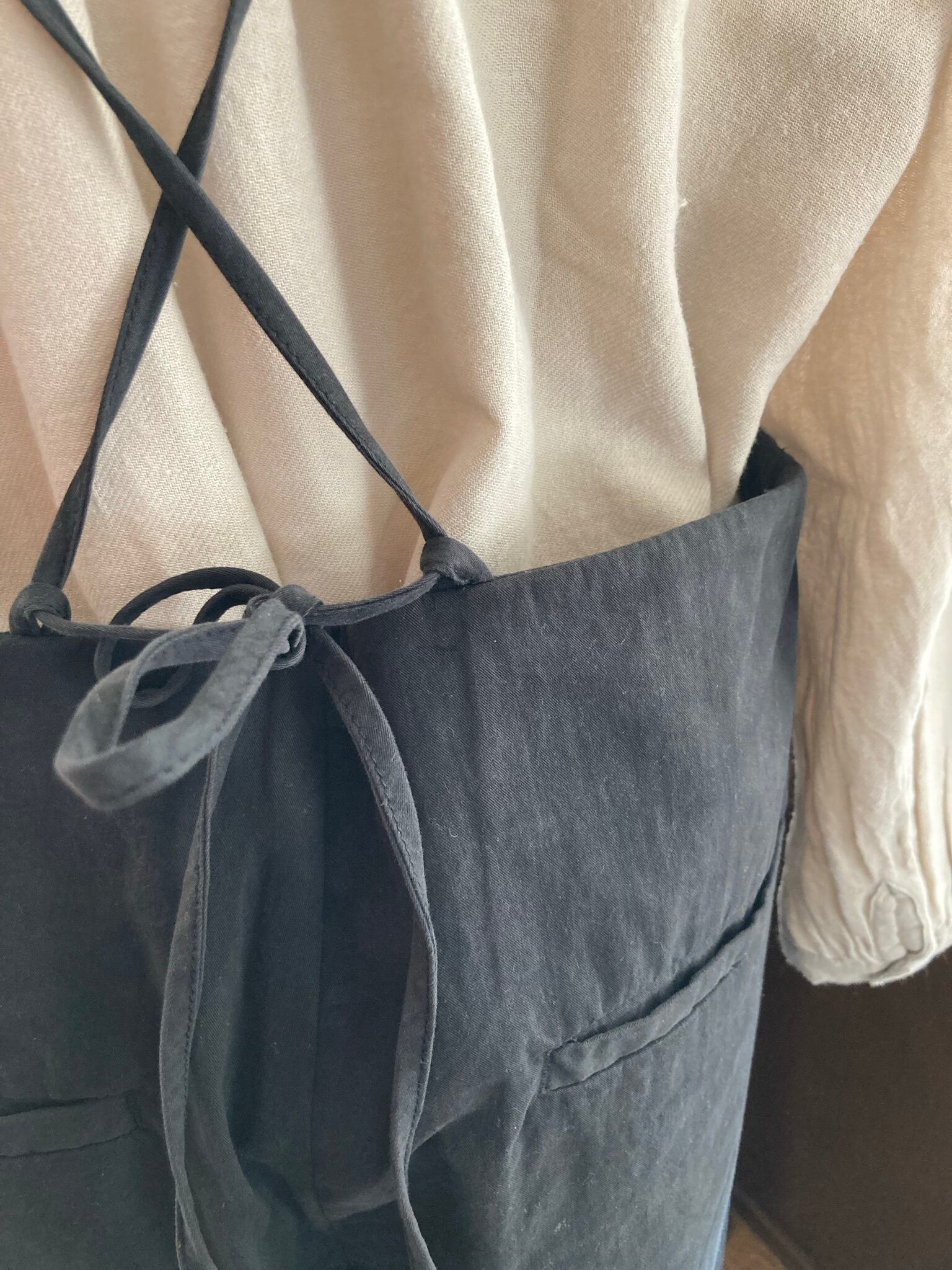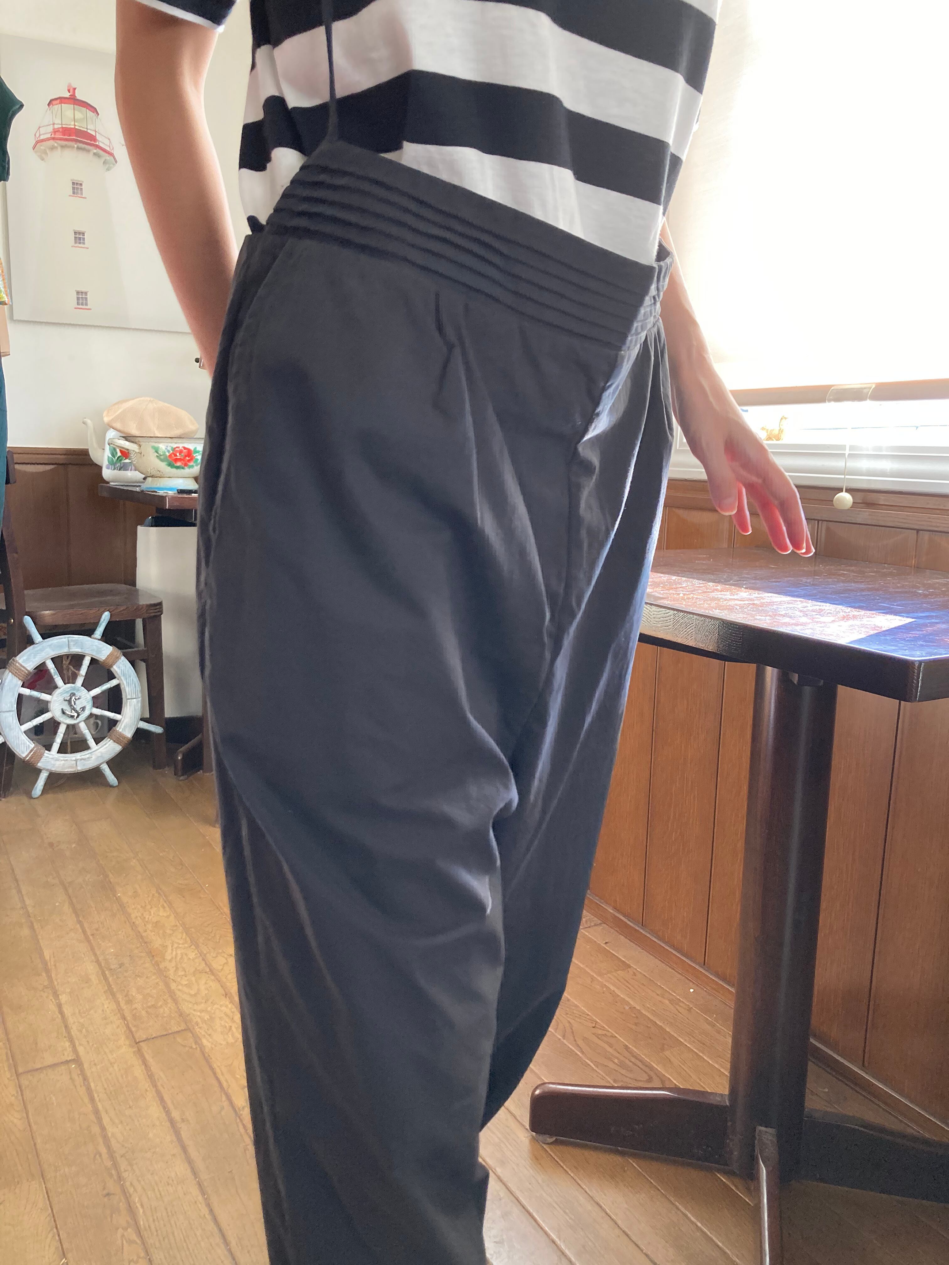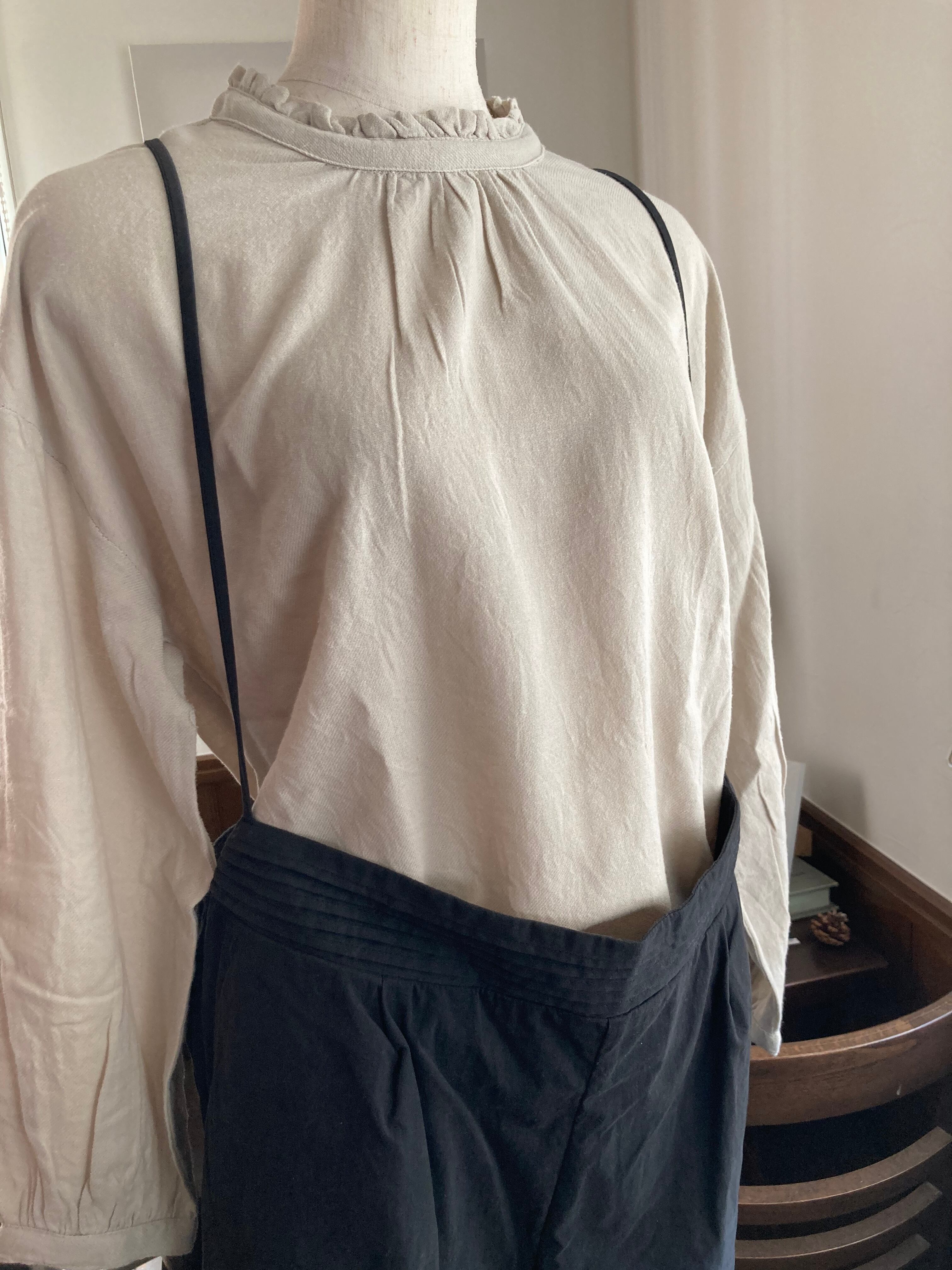 ウエストのタックもアクセント。ラインを拾わないシルエットでリラックス感のある雰囲気です。Tシャツやニット、ブラウスなどオールシーズン着回せるアイテム。肩ひもは後ろで調節できるので、お好みのサイズ感で着用していただけます。