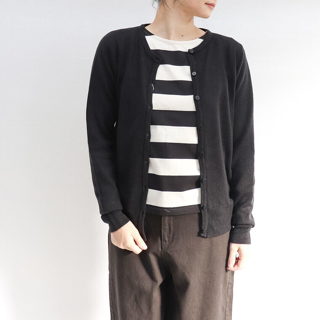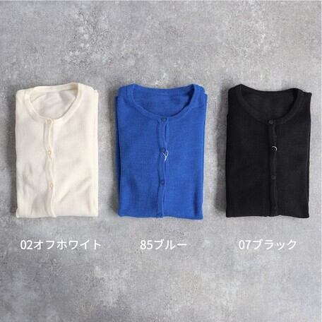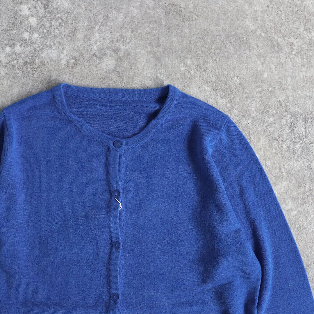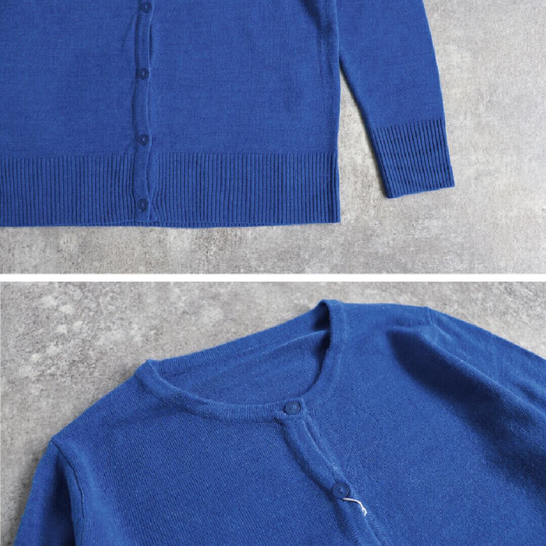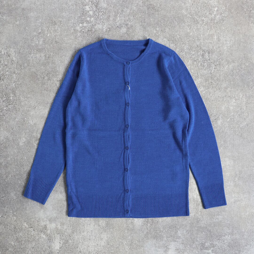 製品染め、アクリル100%のクルーネックニットカーディガン。柔らかなとろみがあり、ふんわりやさしい肌触りです。ベーシックな形で長い季節、重宝します。発色も綺麗です。