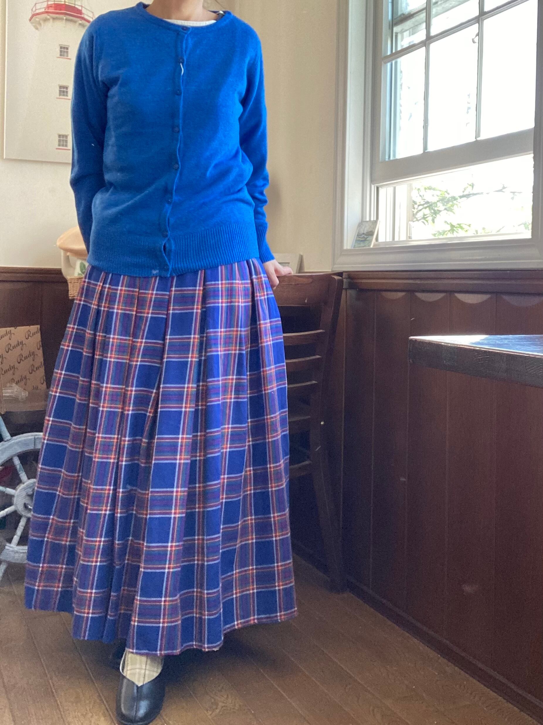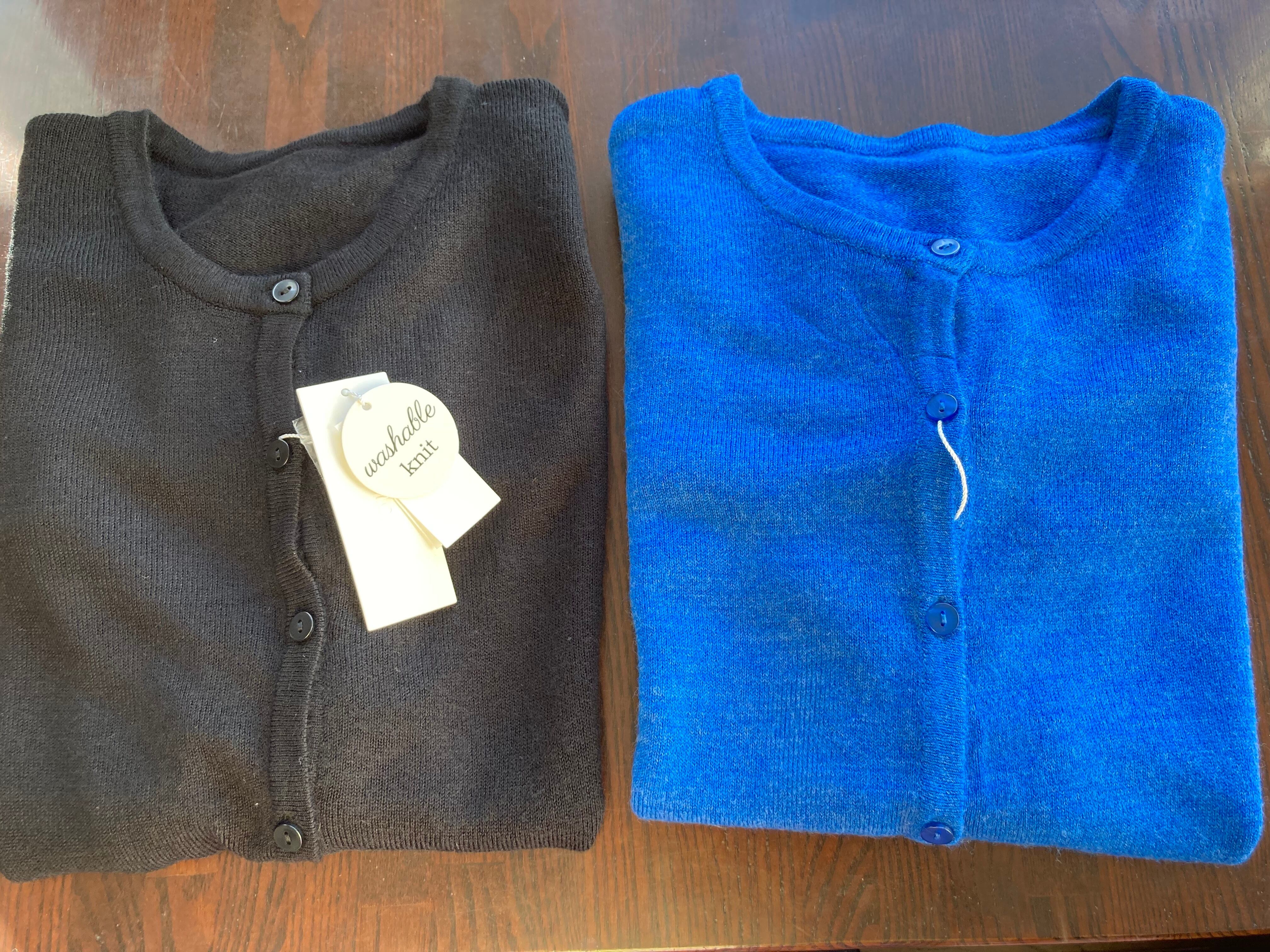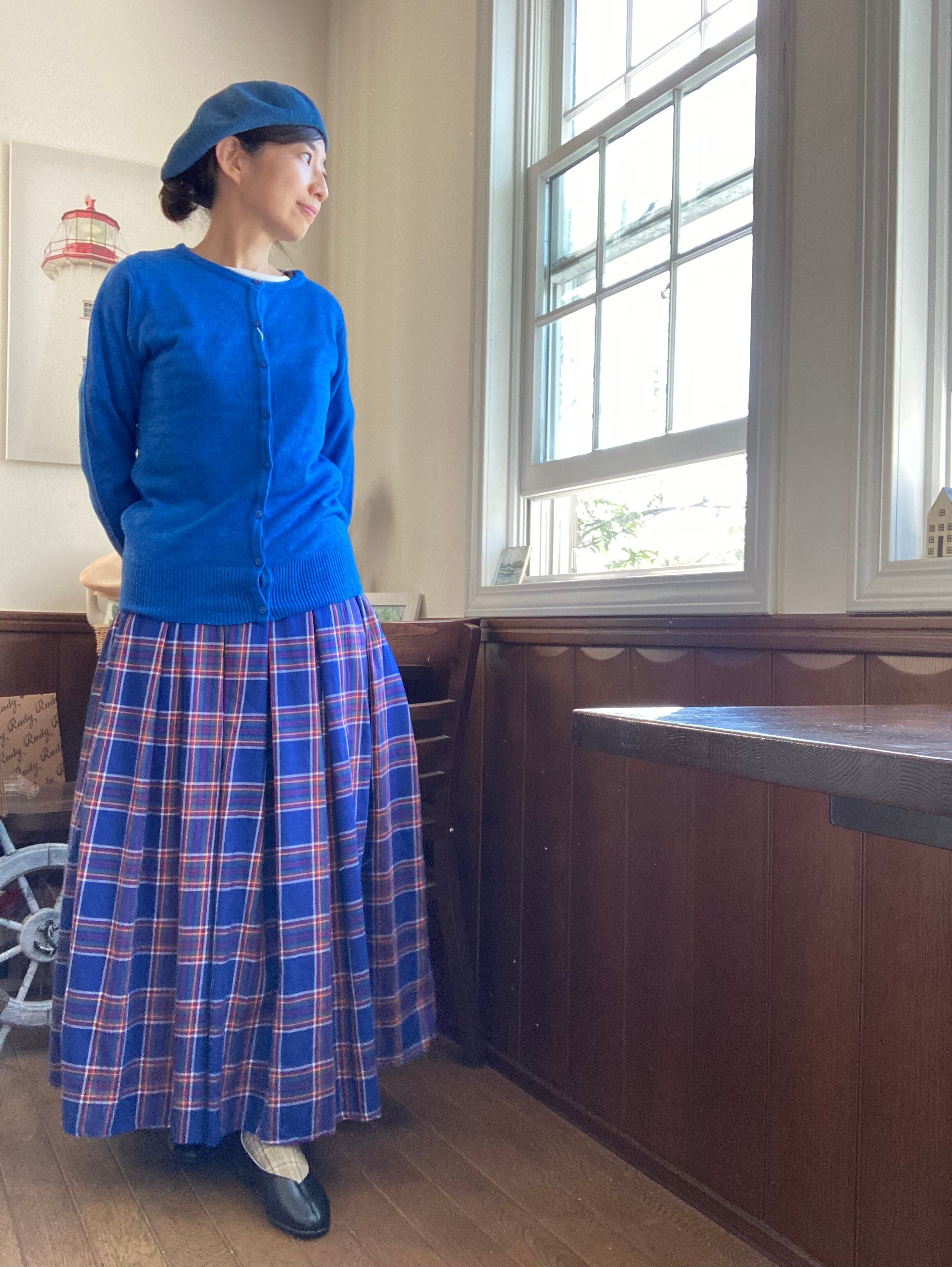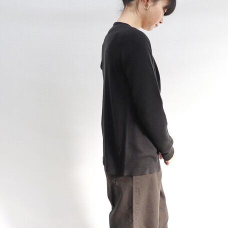製品染め、アクリル100%のクルーネックニットカーディガン。柔らかなとろみがあり、ふんわりやさしい肌触りです。ベーシックな形で長い季節、重宝します。発色も綺麗です。