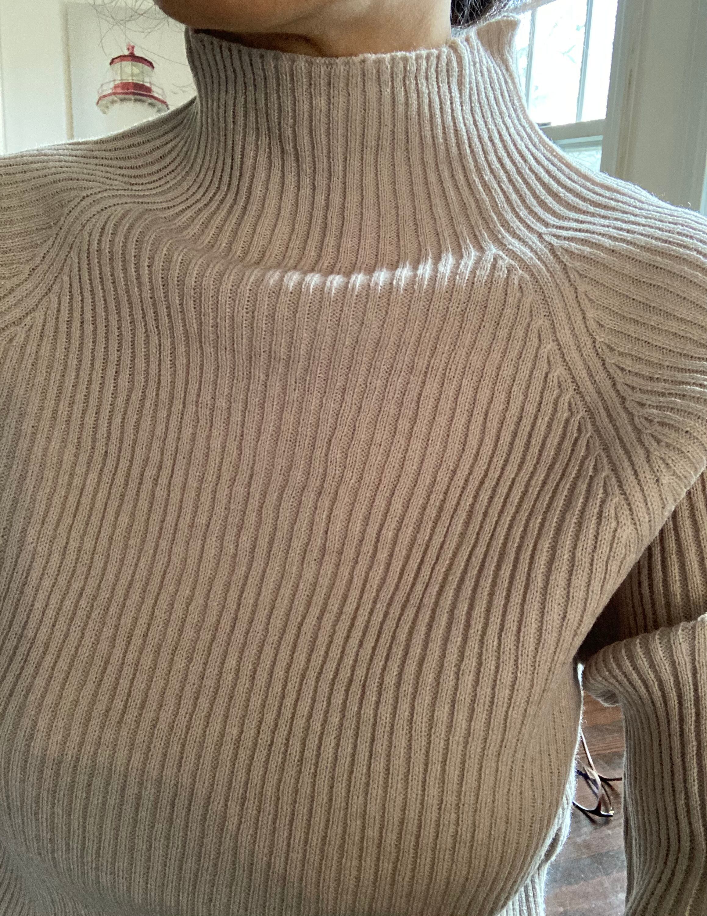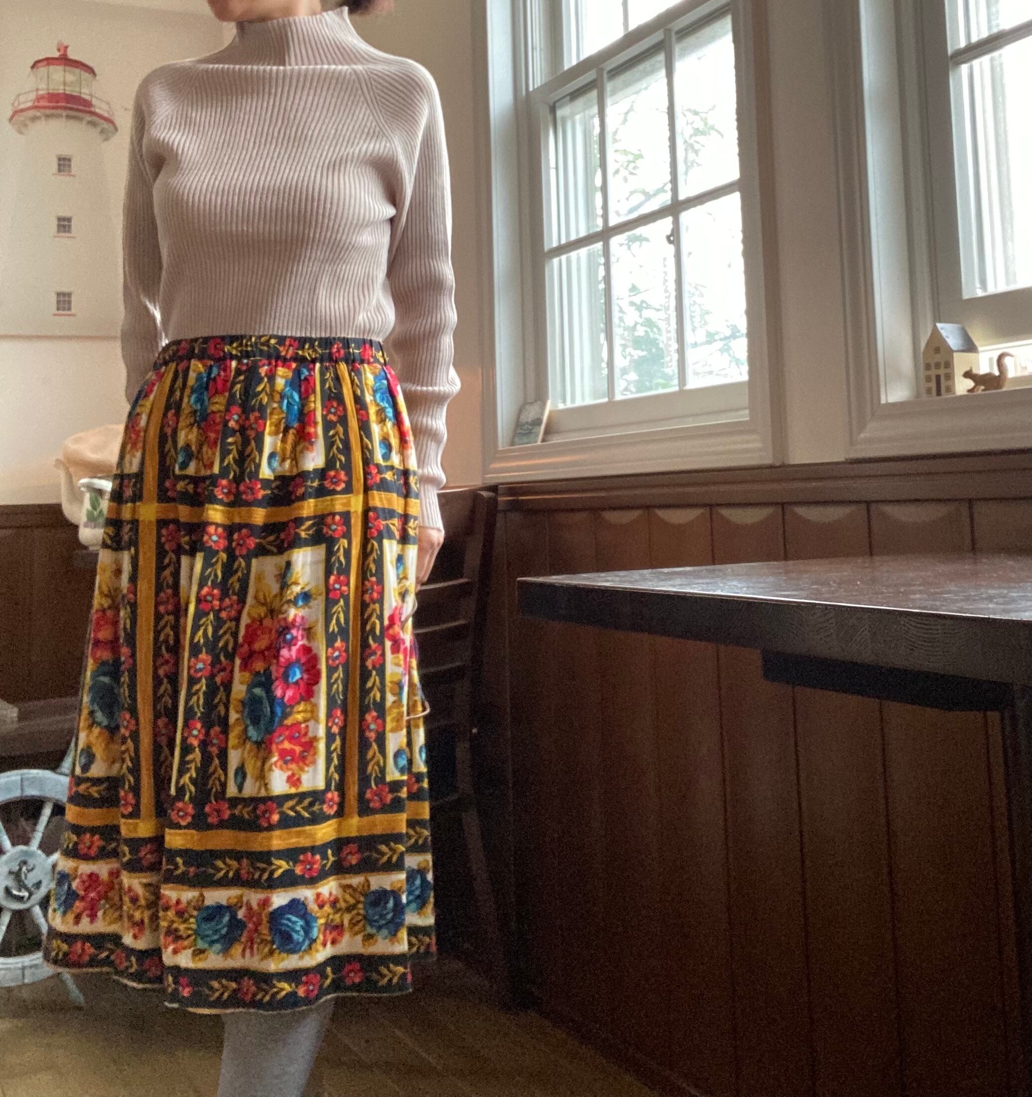 ボトルネックもまた首元を守り、上品な印象です。丈もわりと長めなので、ボトムインでもアウトでもどちらでも◎