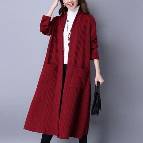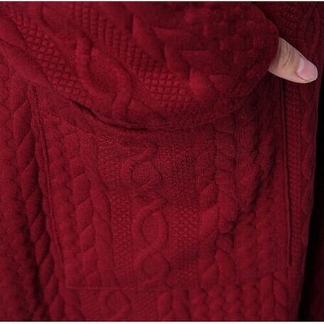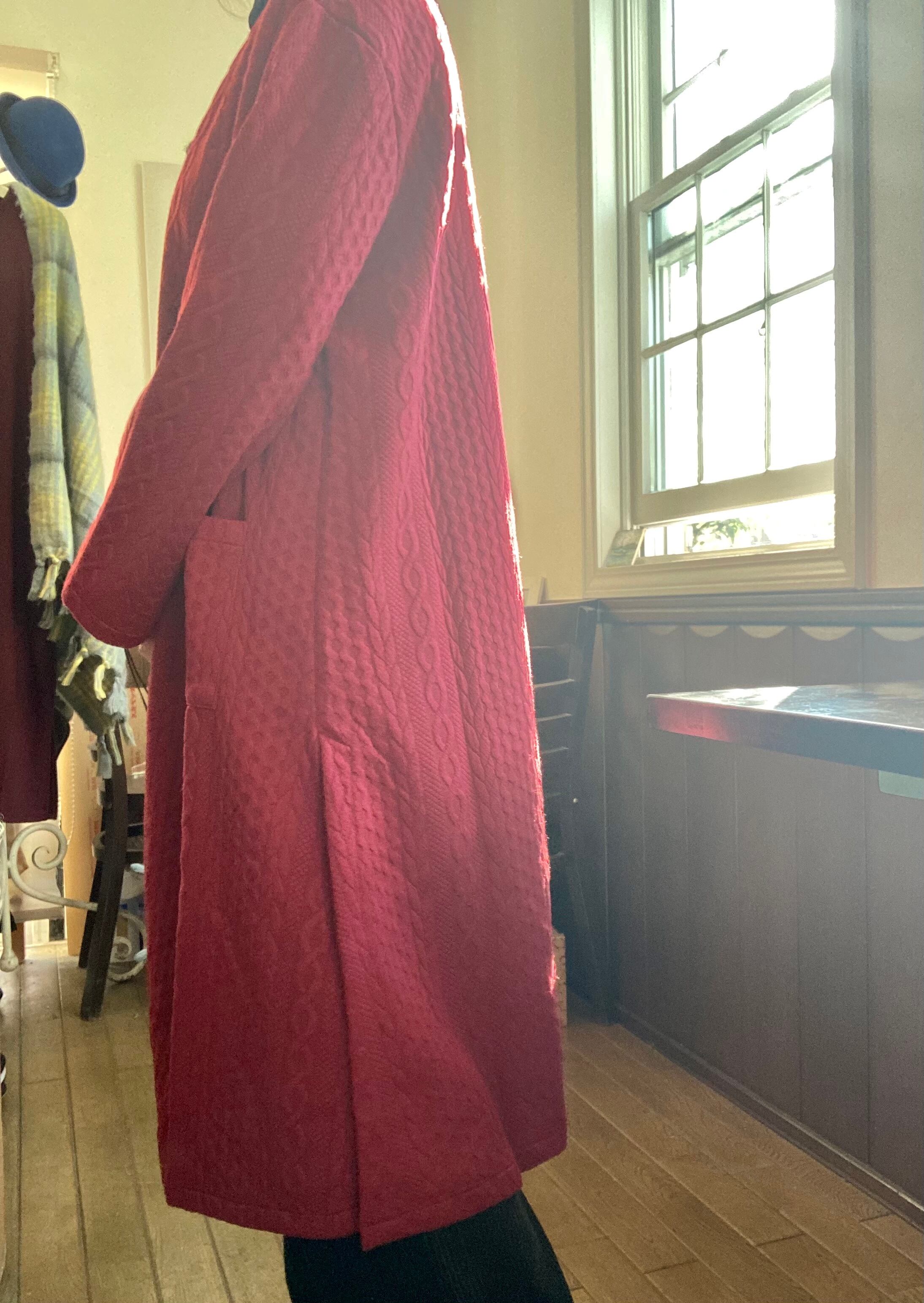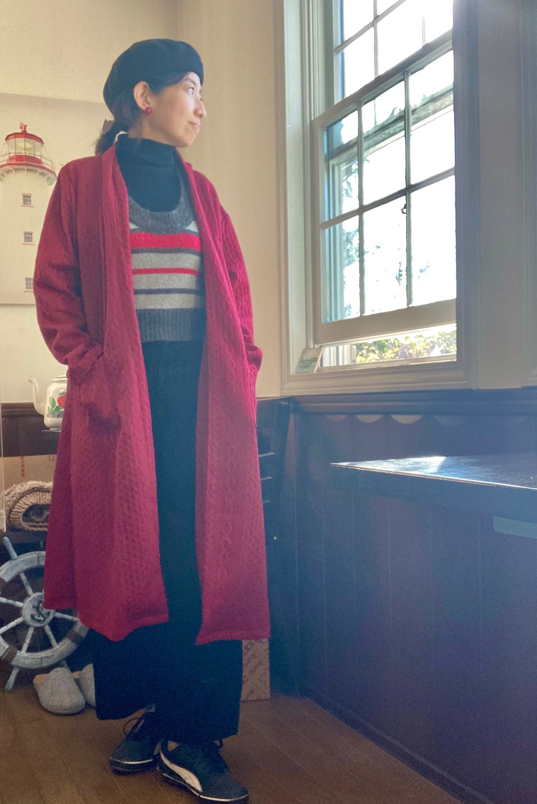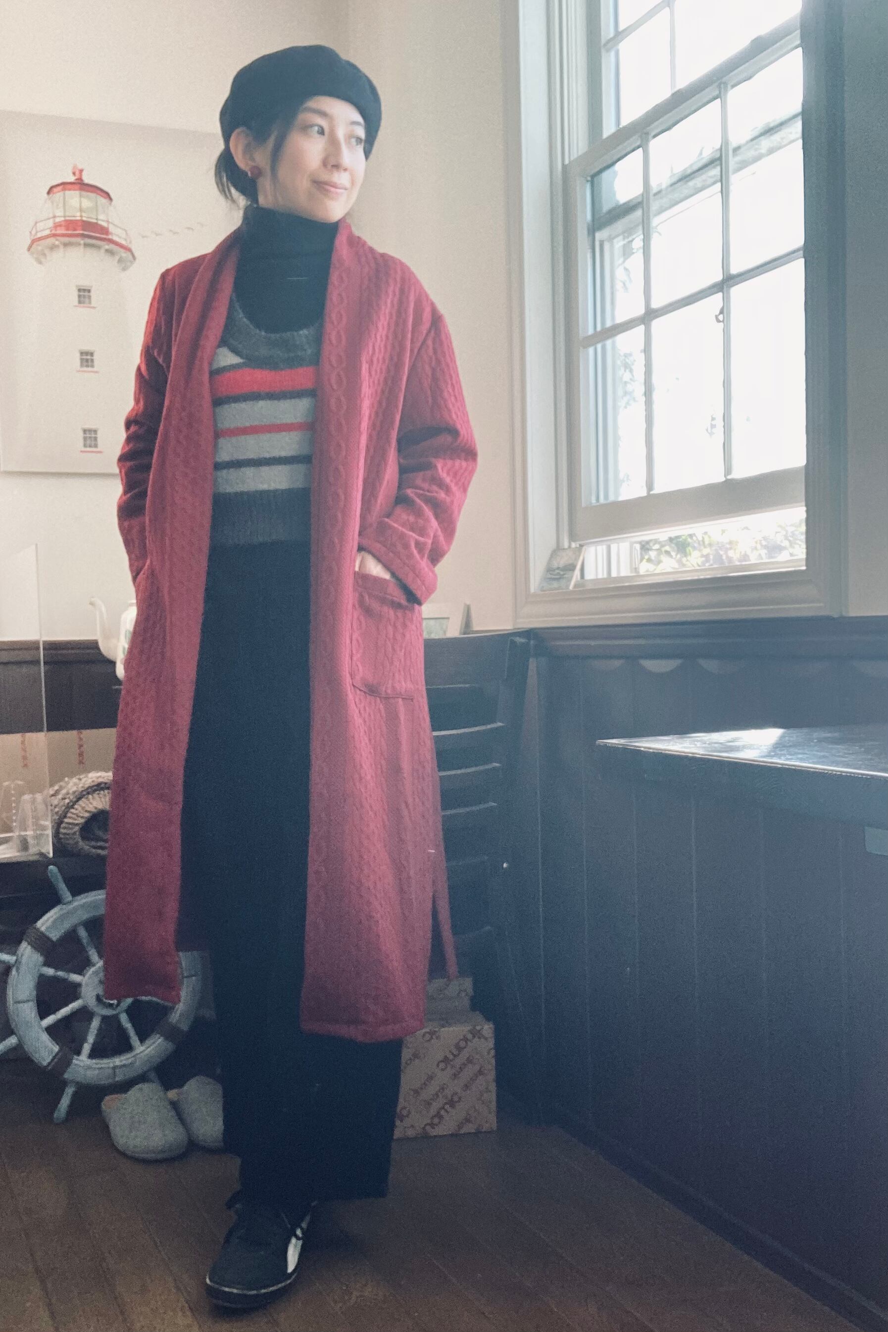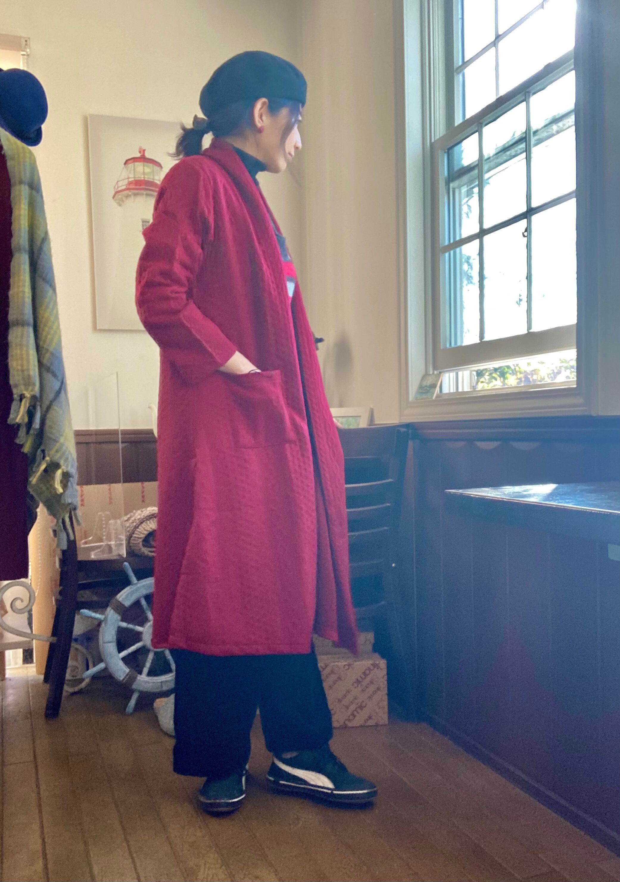 全面にケーブル模様が施され、ポコポコ浮かびあがり表情豊かで、柔らかな風合い。縦のラインがすっきり見せてくれる効果も。ロングながら柔らかく軽い着心地で、気軽に羽織れて包み込んでくれます。裾にスリットもあり、重ね着もしやすく、アクティブに動けます。深みのあるワインレッドも重くなく、派手でなく、しっとりと美しい色味です。