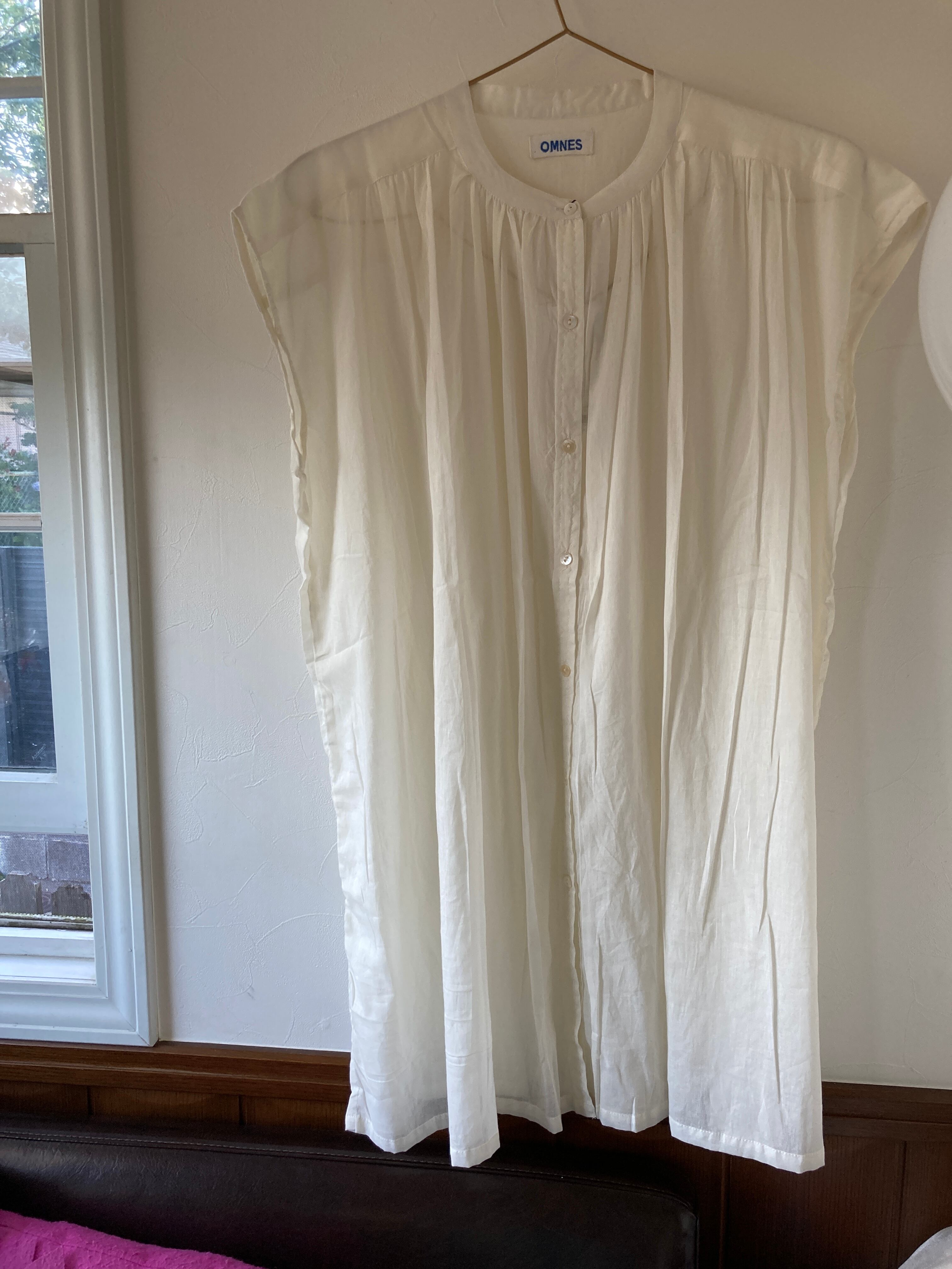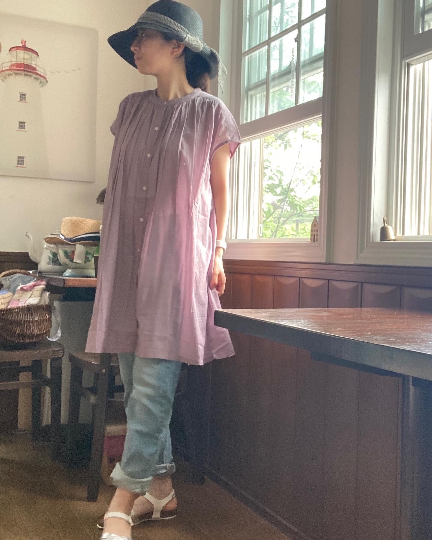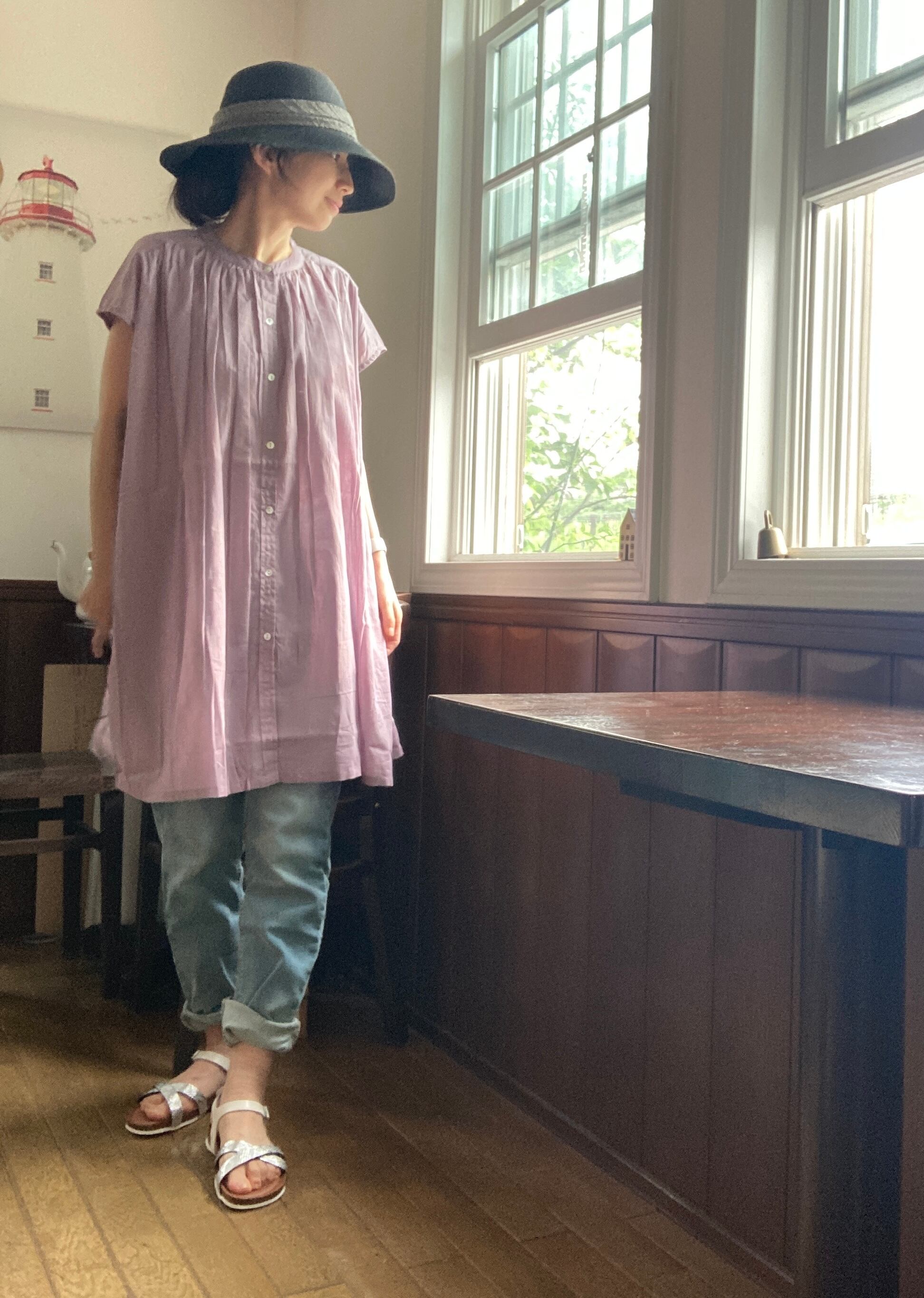 薄地で軽く透け感のありコットンボイル生地のギャザーチュニックブラウス。エアリーで見た目にも清涼感のある雰囲気なのでさまざまなシーンにもOK。