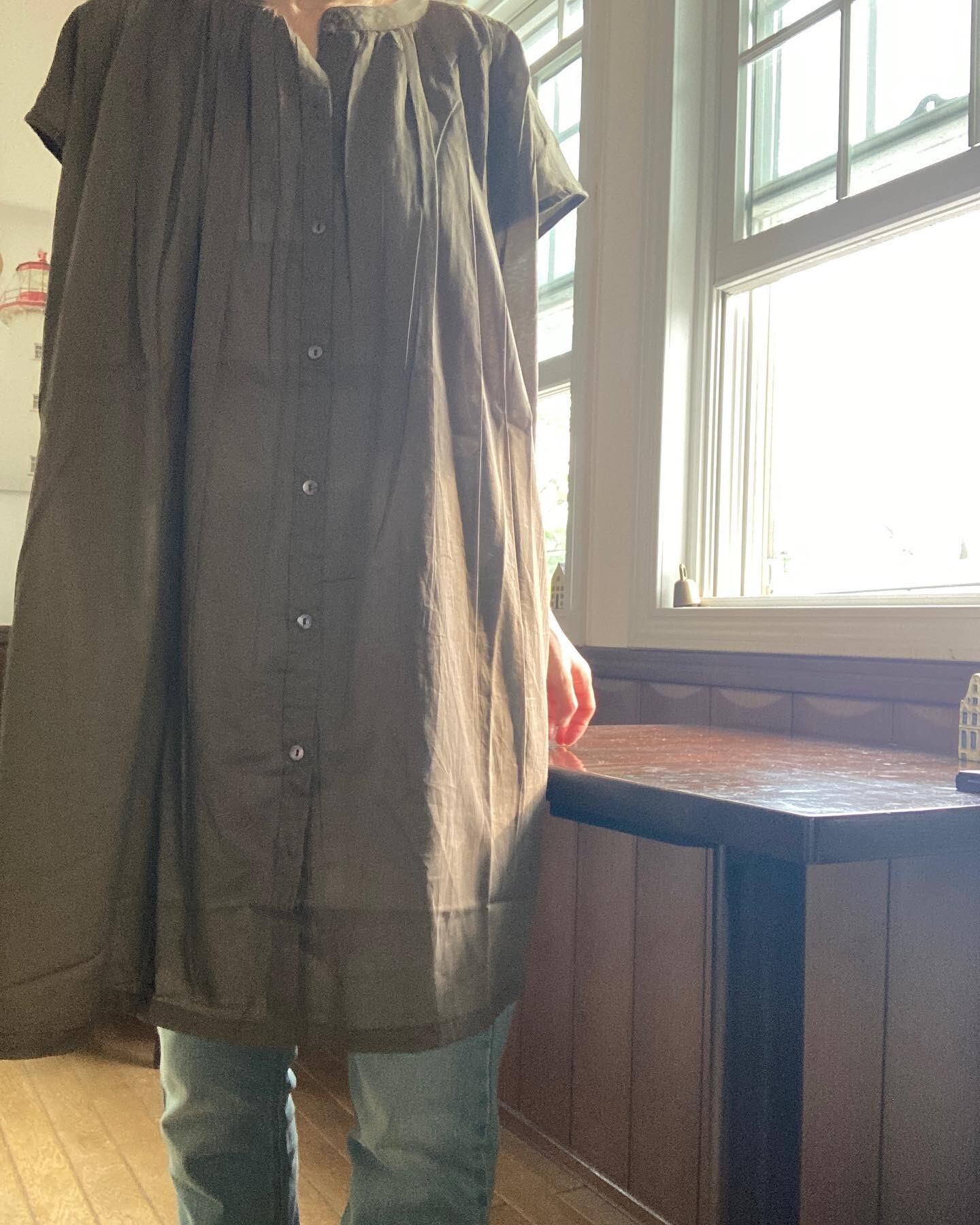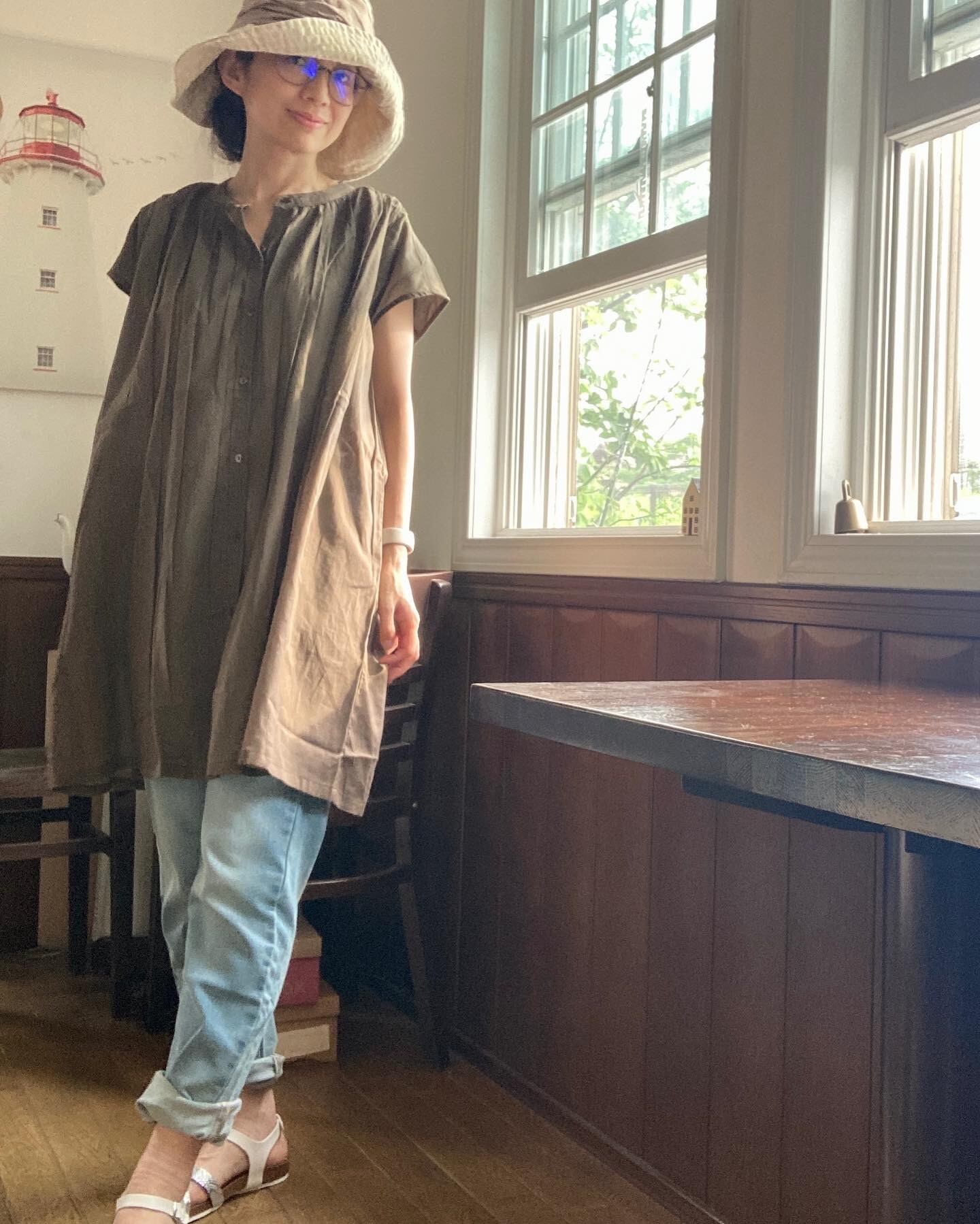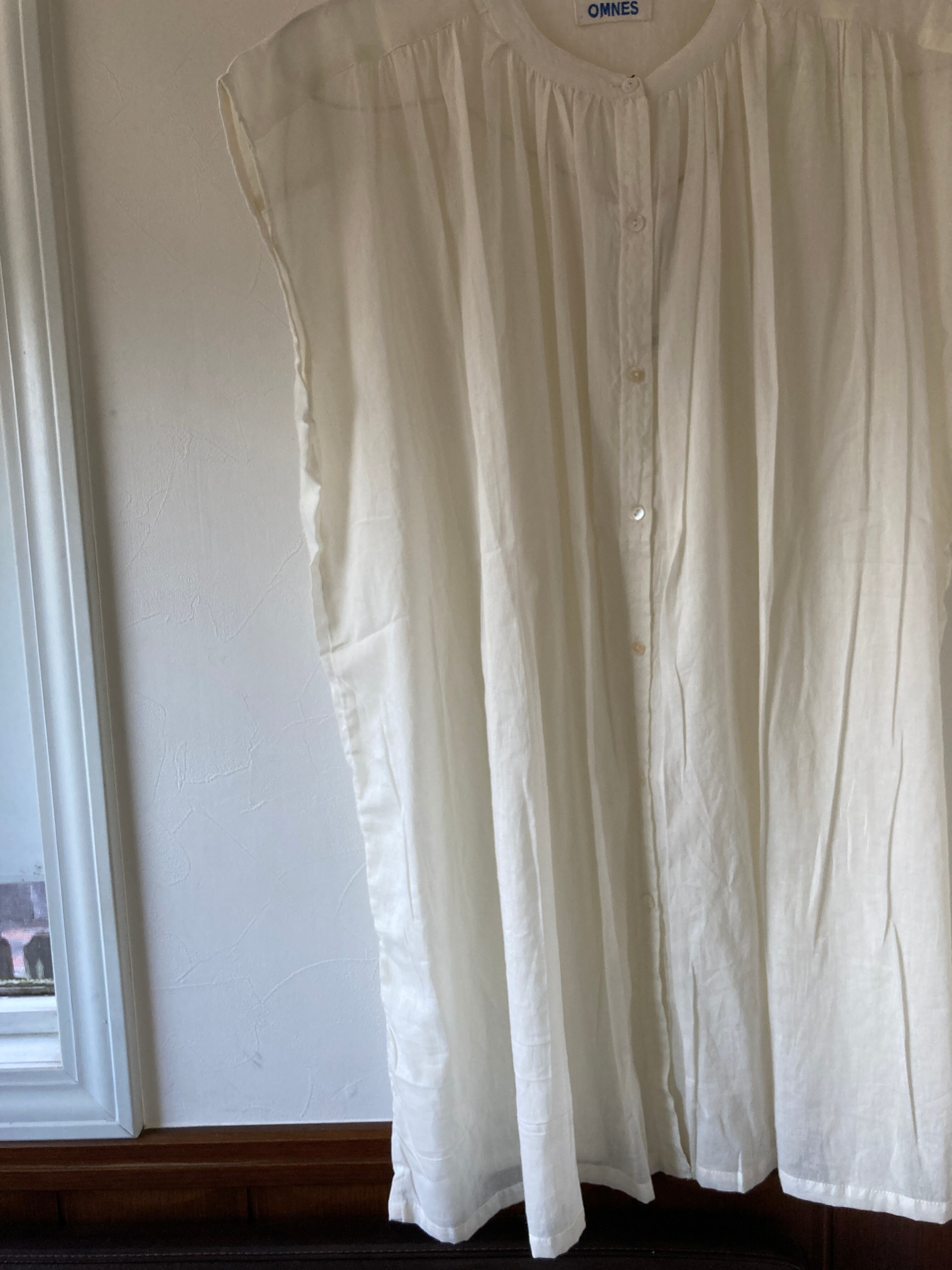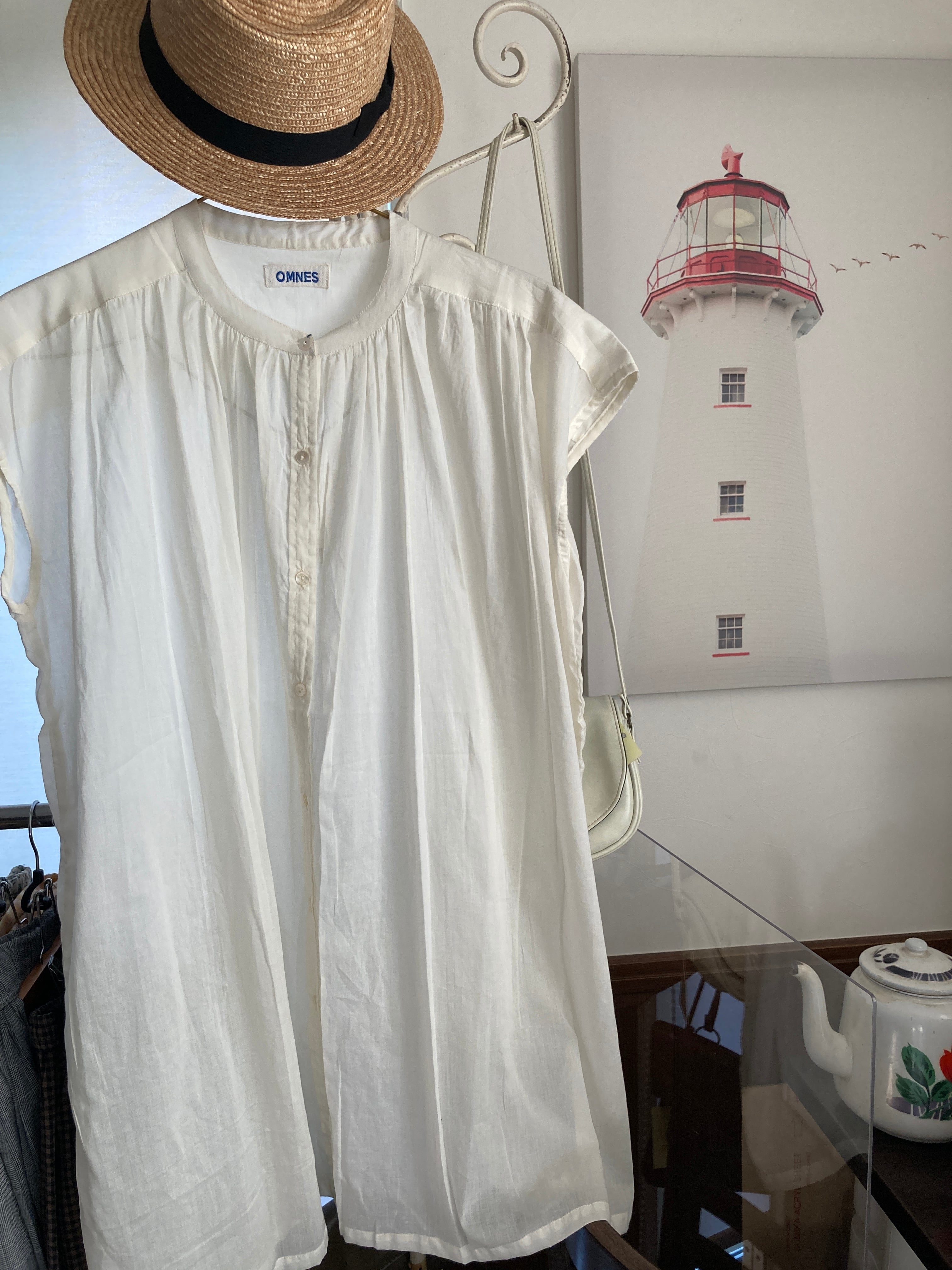 薄地で軽く透け感のありコットンボイル生地のギャザーチュニックブラウス。エアリーで見た目にも清涼感のある雰囲気なのでさまざまなシーンにもOK。