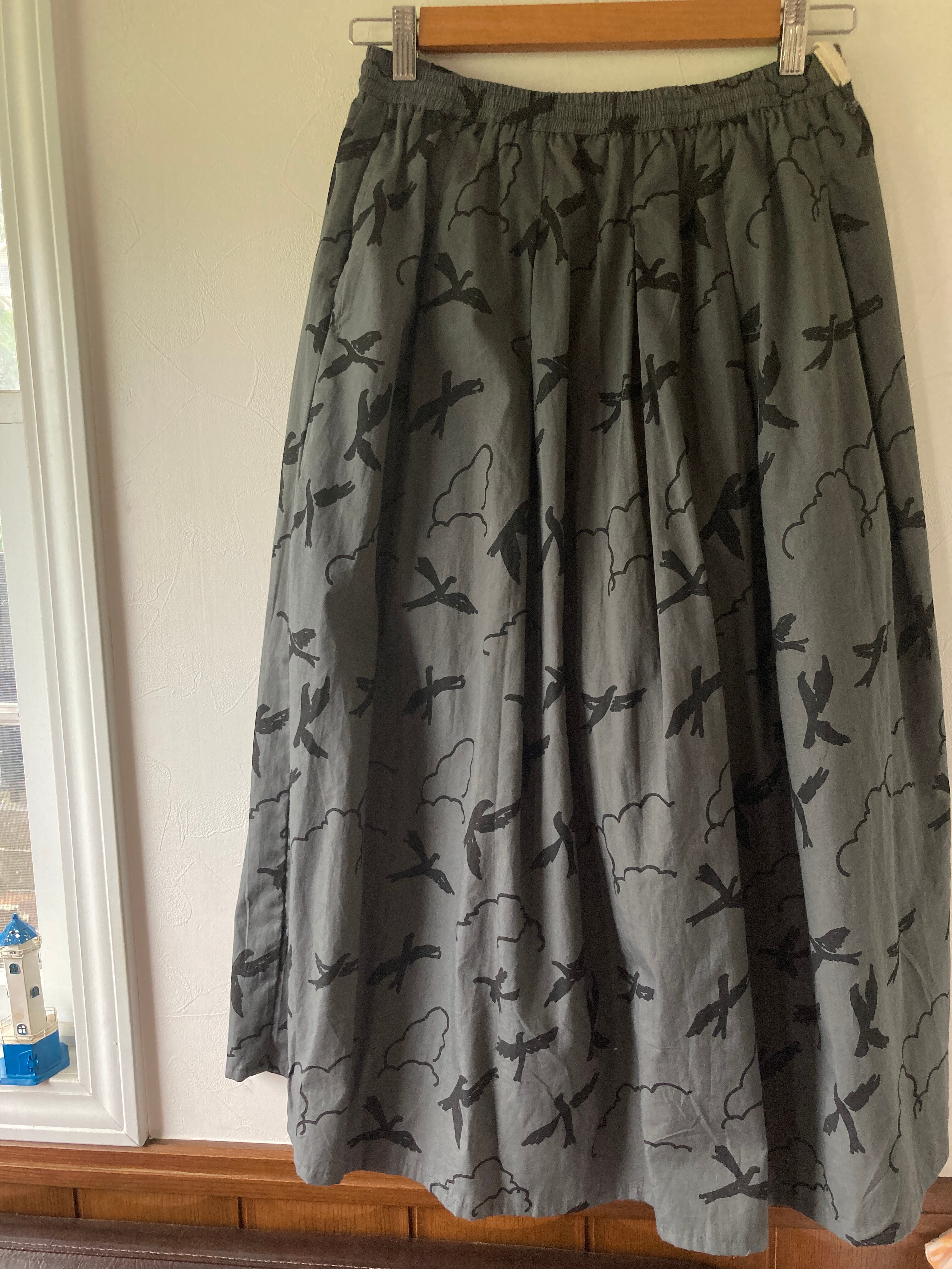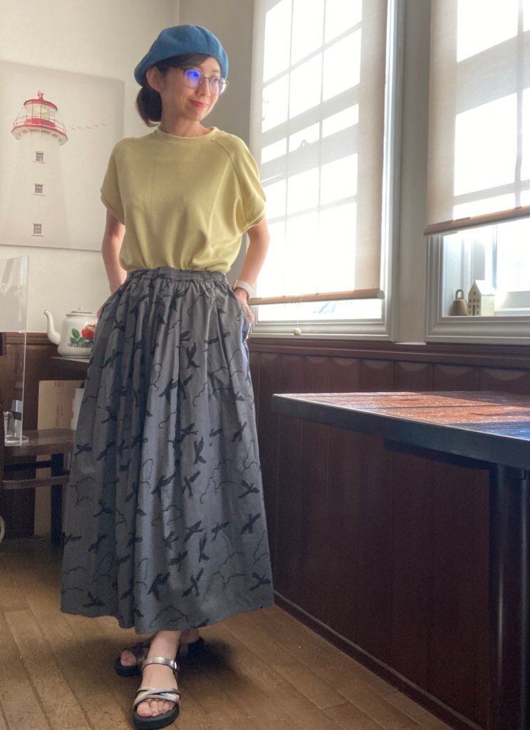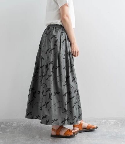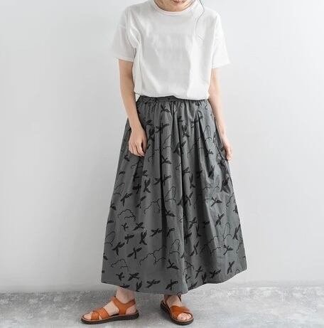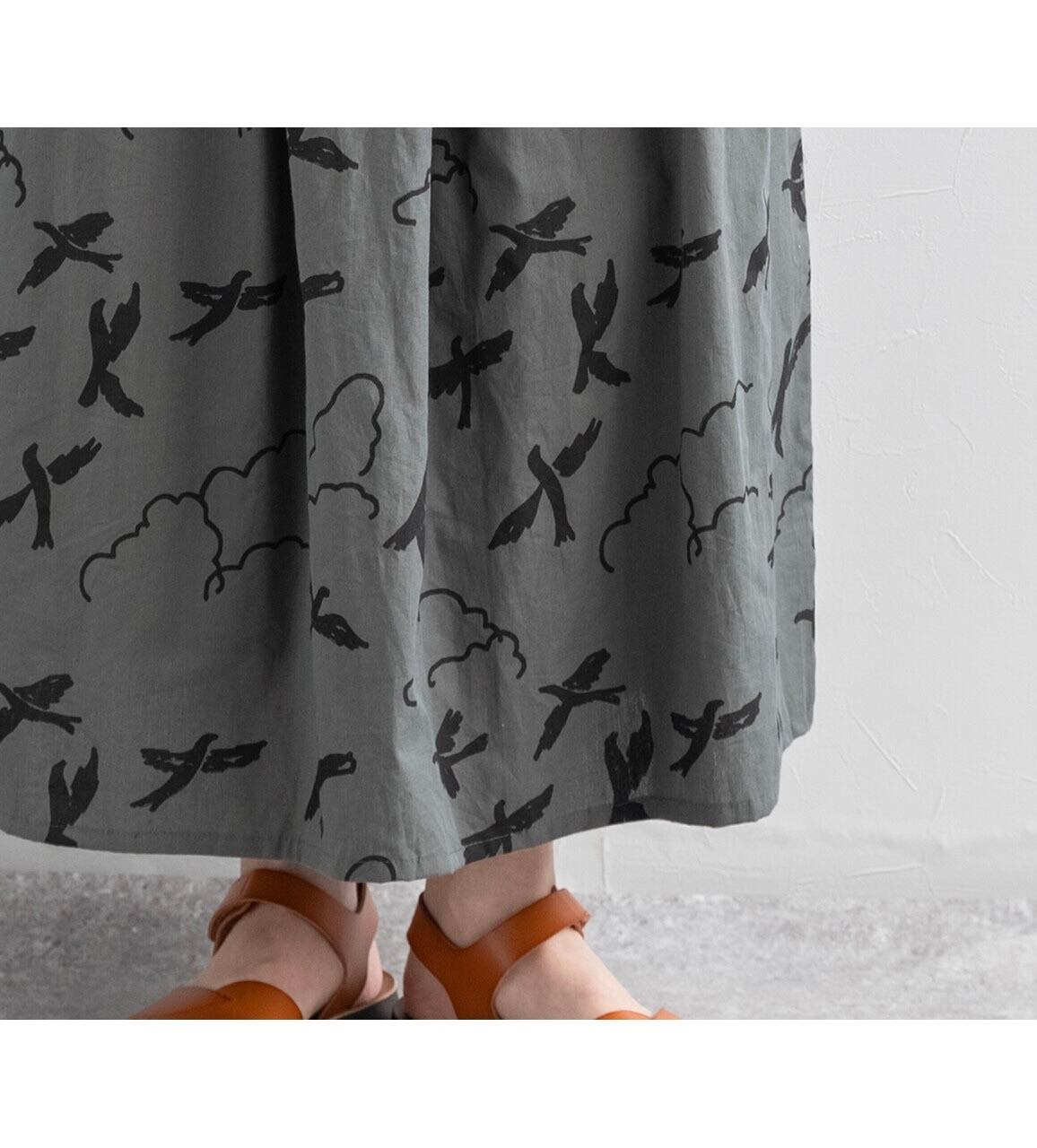 鳥モチーフをプリントしたギャザースカートは、ほどよくハリのあるコットン生地でちょうどいいボリューム感。内ヒモ入りでサイズ調整も可能。