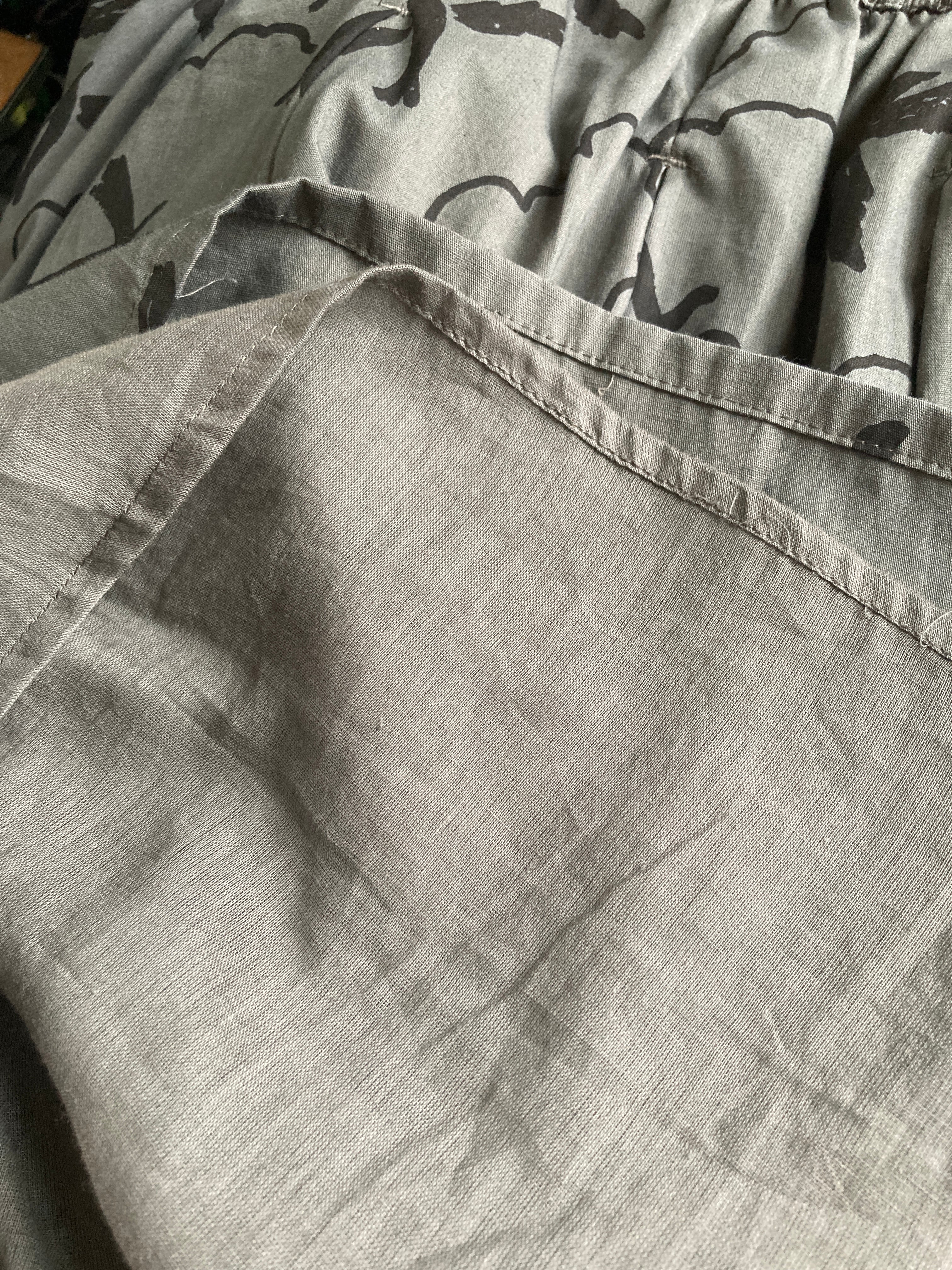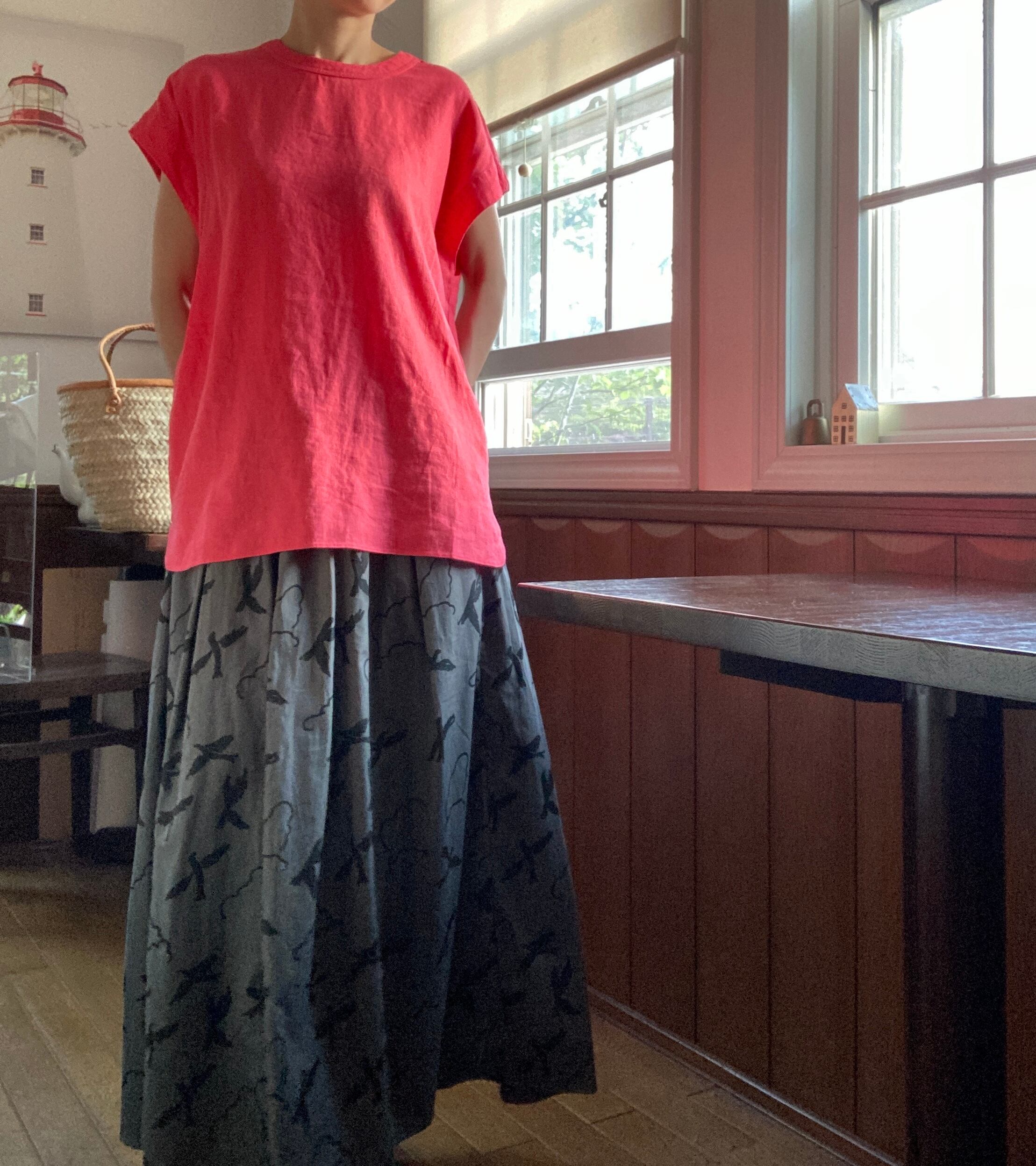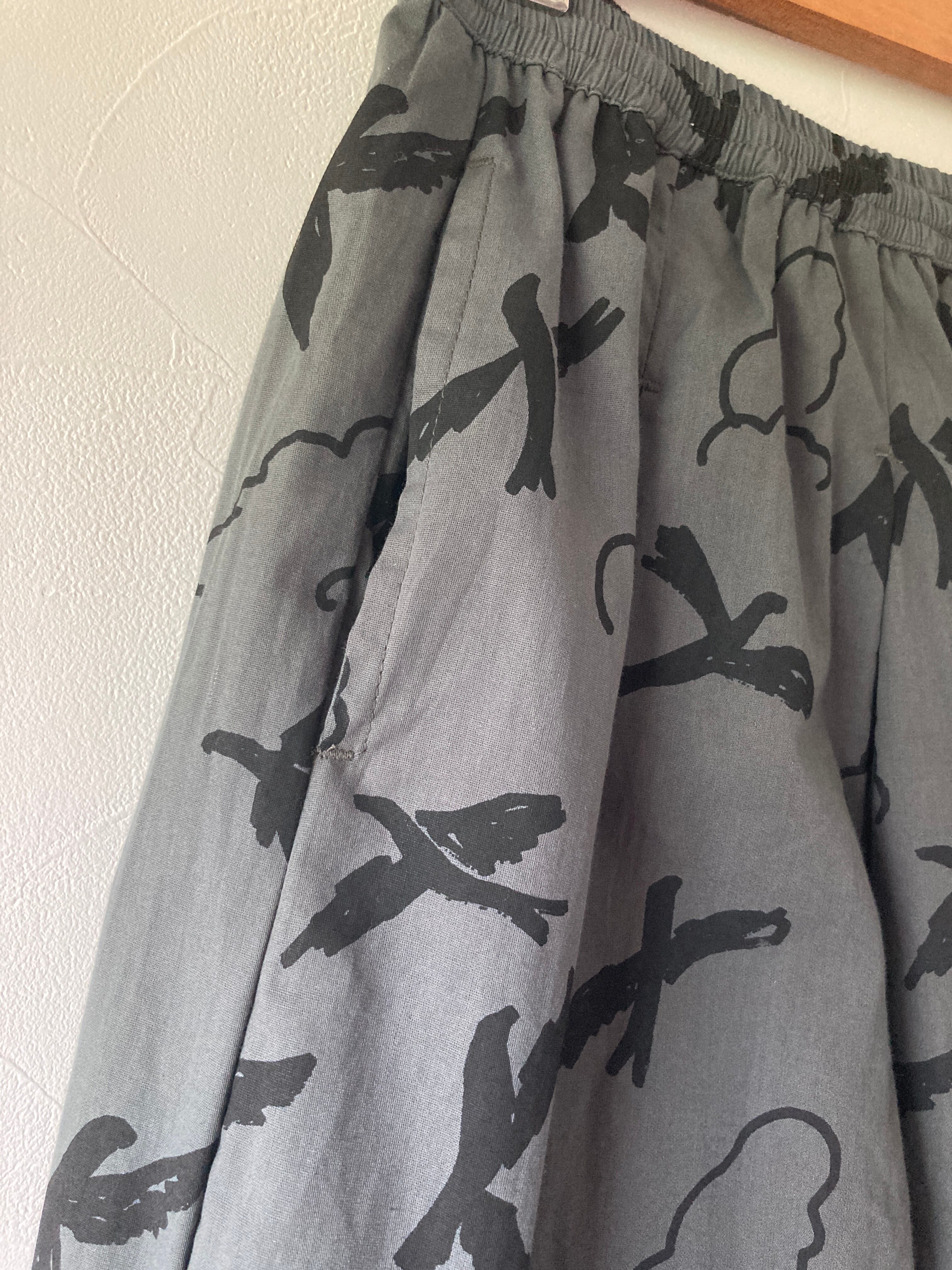 鳥モチーフをプリントしたギャザースカートは、ほどよくハリのあるコットン生地でちょうどいいボリューム感。内ヒモ入りでサイズ調整も可能。