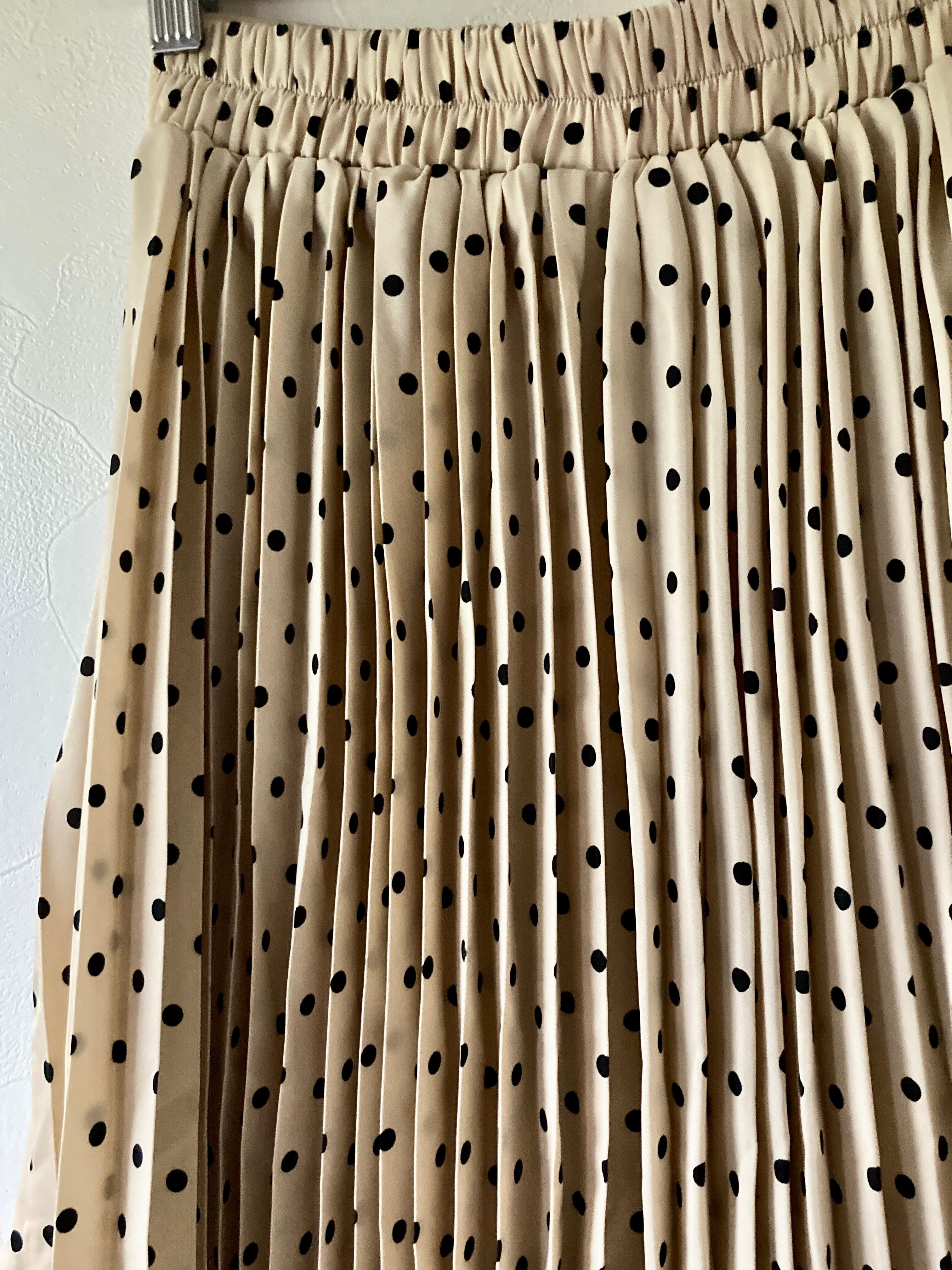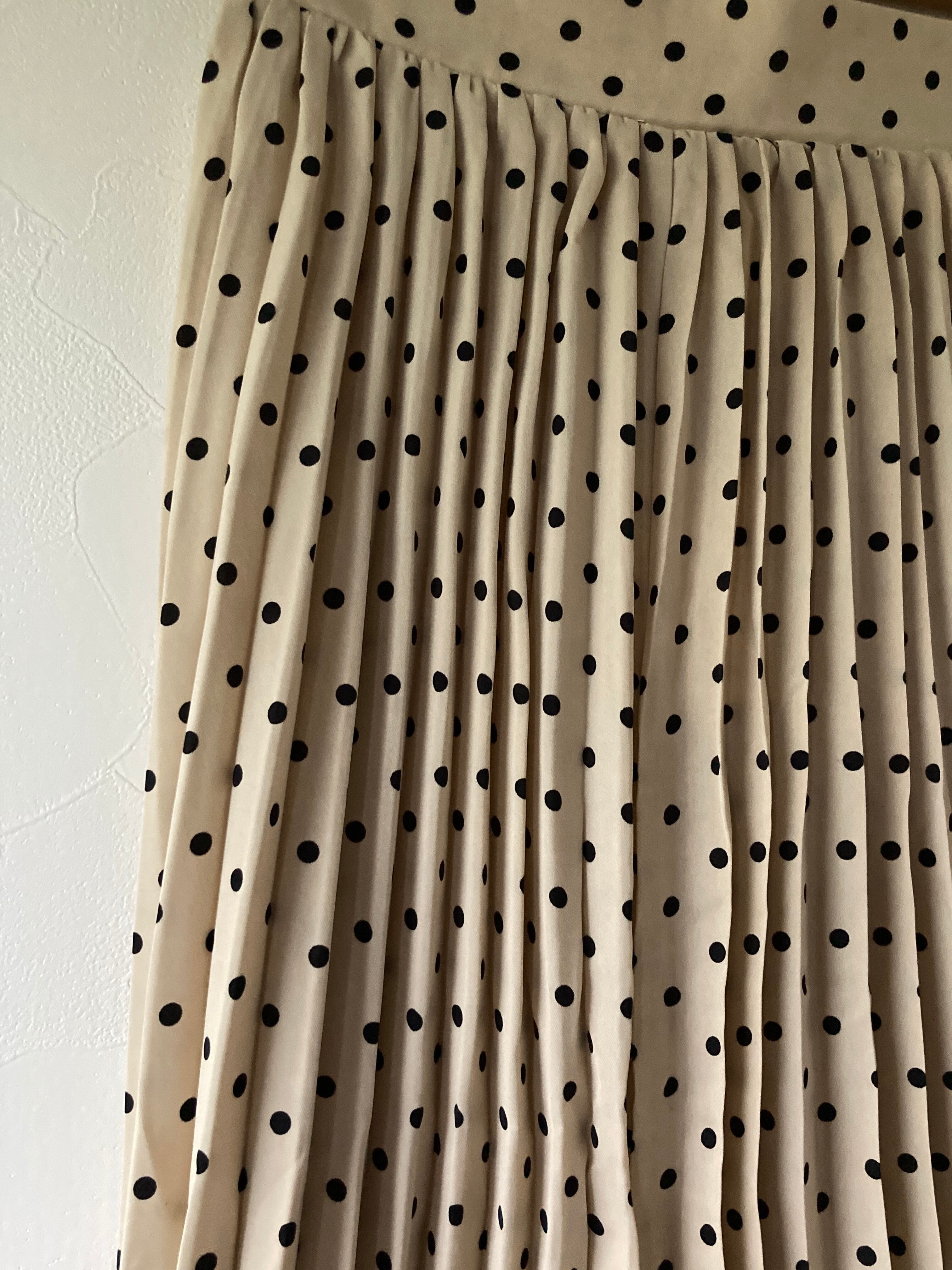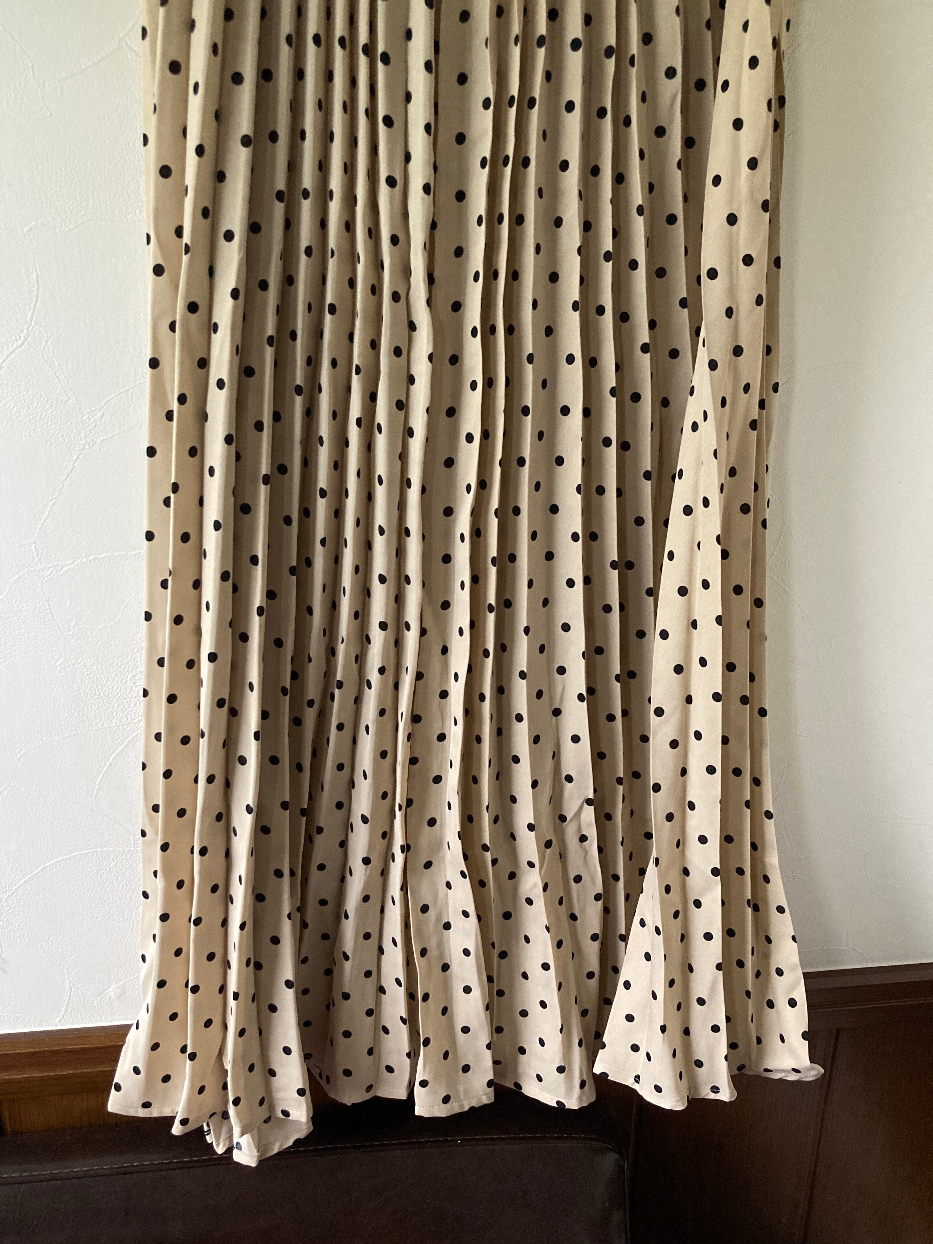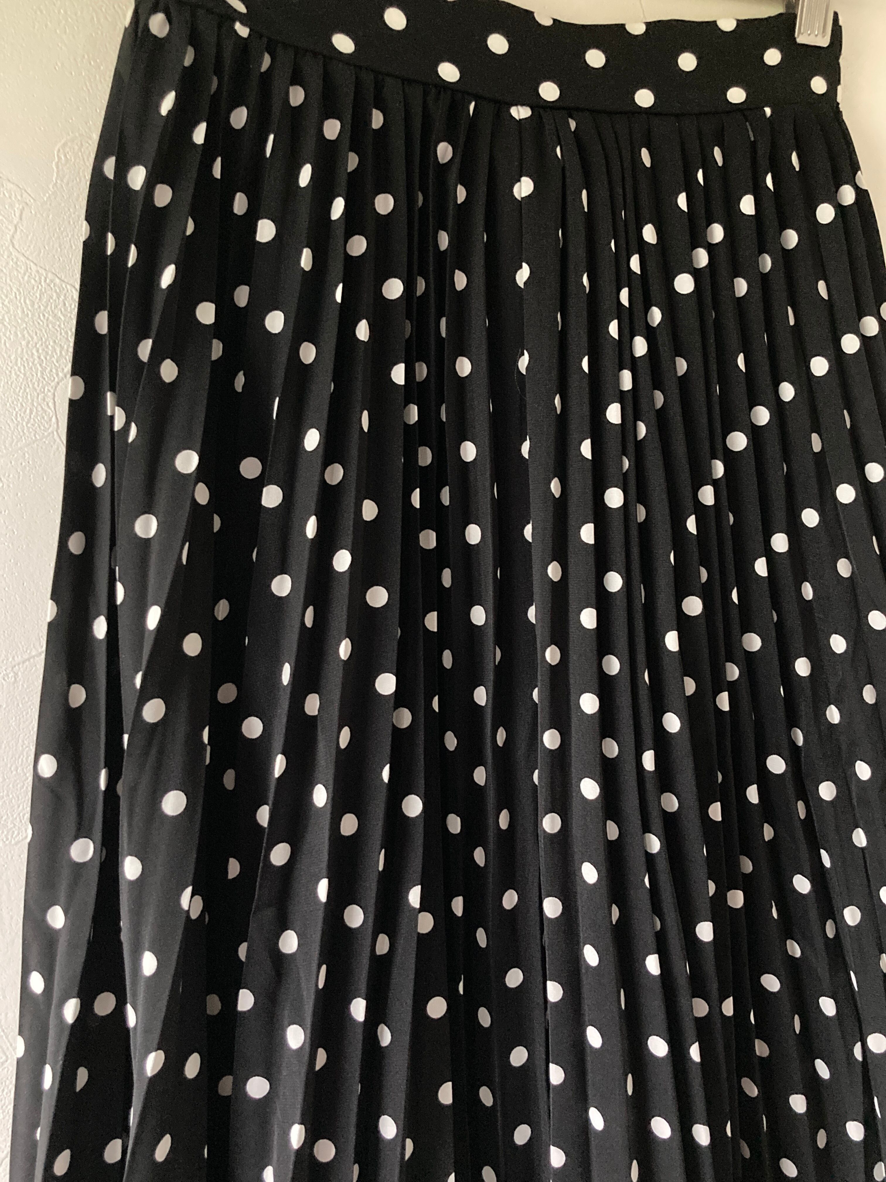モノトーンのドット模様とプリーツが、ノスタルジックな雰囲気たっぷりのロングスカート。てろんとした落ち感が綺麗でエレガントな印象に。合わせるトップス次第でオールシーズン活躍してくれるアイテムです。カジュアルにもフレンチテイストにも。